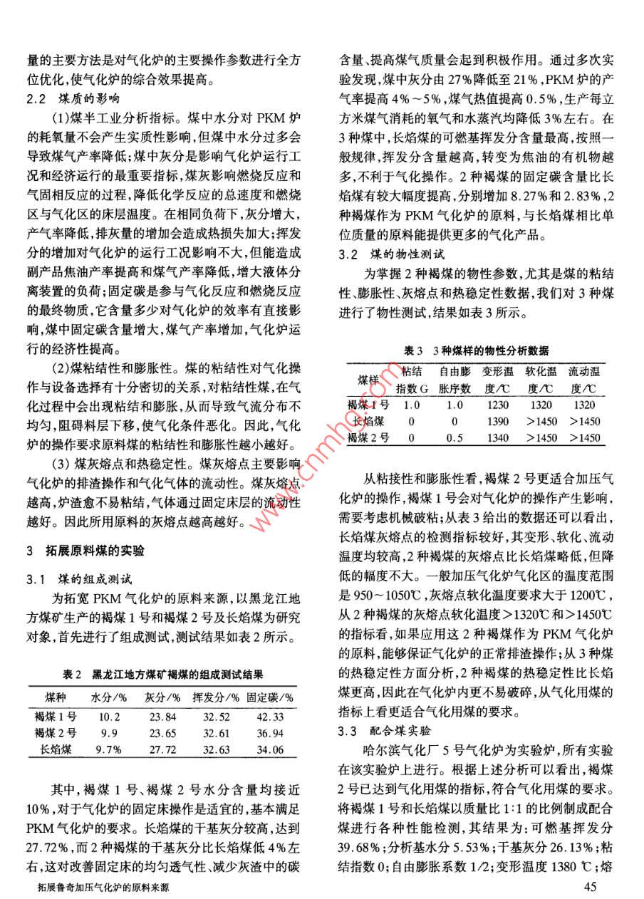★加工轉(zhuǎn)化★拓展魯奇加壓氣化爐的原料來源王海l)張麗華2)陳曉春3》(1.哈爾濱氣化廠,黑龍江省哈爾濱市道里區(qū),150076;2.哈爾濱燃?xì)夤こ淘O(shè)計(jì)研究院,黑龍江省哈爾濱市道里區(qū),150076;3.北京化工大學(xué)1號信箱,北京市朝陽區(qū),100029)摘要通過對長焰煤、褐煤1號、褐煤2號、長焰煤與褐煤1號配合煤的物化性能等測試,用多次實(shí)驗(yàn)的結(jié)果說明褐煤2號和配合煤可用做PKM氣化爐原料。認(rèn)為加壓氣化爐的原料拓展是可行的,對保證企業(yè)的正常生產(chǎn)、提高氣化效率、提高企業(yè)經(jīng)濟(jì)效益都有益處。關(guān)鍵詞PKM 氣化爐影響 因素物性測試實(shí)驗(yàn)研究原料拓展化廠的經(jīng)濟(jì)效益具有重要的現(xiàn)實(shí)意義。1哈爾濱氣化廠 的煤質(zhì)要求哈爾濱氣化廠PKM氣化爐原料煤質(zhì)量指標(biāo)如哈爾濱氣化廠1993 年引進(jìn)德國魯奇加壓氣化表1所示。該氣化爐設(shè)計(jì)日產(chǎn)煤氣160萬m3,年需裝置,其關(guān)鍵設(shè)備無粘破裝置的設(shè)計(jì)只適合長焰煤,6.3~ 50mm的長焰煤71.38萬t, 對煤質(zhì)的理想要用煤范圍很窄。裝置自投產(chǎn)以來,采用的原料來源求為水分<9% ,灰分<26% ,顆粒限下率<3%。投于依蘭煤礦無粘結(jié)性的長焰煤,雖然運(yùn)行效果穩(wěn)定,產(chǎn)以來,一直用依蘭無粘結(jié)性長焰煤,單- -的原料路但單-一的原料供應(yīng)路線難以適應(yīng)企業(yè)發(fā)展的要求。線和原料煤灰分指標(biāo)很難達(dá)到設(shè)計(jì)要求,嚴(yán)重影響隨著依蘭煤礦開采量和儲量的動態(tài)變化,低粘結(jié)長氣化效果和經(jīng)濟(jì)效益。焰煤的長期穩(wěn)定供應(yīng)難以保證,而哈爾濱地區(qū)煤礦2影響氣化效率的主要因素的褐煤儲量豐富。因此,哈爾濱氣化廠在對引進(jìn)設(shè)備進(jìn)行二次開發(fā)的同時,為使PKM氣化爐適應(yīng)國2.1操作 條件的影響內(nèi)煤礦資源結(jié)構(gòu)的需要,進(jìn)-步開發(fā)、拓展氣化裝置從化學(xué)工程角度分析,在- -定條件下,要用原料的新原料路線,采取調(diào)整氣化裝置的運(yùn)行策略,配套煤生產(chǎn)出滿足要求的合格煤氣,必須維持--定的氧改造煤氣的后處理工藝。本文主要以哈爾濱部分煤氣負(fù)荷。氧負(fù)荷過大,將導(dǎo)致原料煤轉(zhuǎn)化為CO2,從礦的褐煤為研究對象,探討PKM氣化爐應(yīng)用褐煤而增大煤的損失,所以必須維持合適的水蒸汽量,以為原料的可行性,對于更好地利用國外技術(shù),提高氣滿足煤氣化的要求。水蒸汽量減少,將導(dǎo)致煤的氣表1哈爾濱氣化廠 PKM氣化爐原料煤的質(zhì)指標(biāo)煤種粒度/mm水分/%灰分/%揮發(fā)分/%固定碳/%焦油含量/%非粘結(jié)性煤7~209.726.421.142.82.1弱粘結(jié)性煤6~305.022.031.042.0。10.5化效率降低;水蒸汽量增大,雖然碳的氣化效率得到子數(shù)減少的反應(yīng),增大壓力對生成甲烷有利,同時體保證,但大量的水蒸汽在系統(tǒng)內(nèi)循環(huán),加大了水處理系內(nèi)產(chǎn)生熱量增多,有利于節(jié)能和降低煤的氧化消的負(fù)荷,能量消耗進(jìn)-步增大;生成甲烷的反應(yīng)為分耗。因此,在原料煤相對穩(wěn)定的情況下,提高煤氣產(chǎn)44中國煤炭第29卷第8期2003年8月量的主要方法是對氣化爐的主要操作參數(shù)進(jìn)行全方含量、提高煤氣質(zhì)量會起到積極作用。通過多次實(shí)位優(yōu)化,使氣化爐的綜合效果提高。驗(yàn)發(fā)現(xiàn),煤中灰分由27%降低至21 % ,PKM爐的產(chǎn)2.2煤質(zhì) 的影響氣率提高4%~5% ,煤氣熱值提高0.5% ,生產(chǎn)每立(1)煤半工業(yè)分析指標(biāo)。煤中水分對PKM爐方米煤氣消耗的氧氣和水蒸汽均降低3%左右。在的耗氧量不會產(chǎn)生實(shí)質(zhì)性影響,但煤中水分過多會3種煤中,長焰煤的可燃基揮發(fā)分含量最高,按照一導(dǎo)致煤氣產(chǎn)率降低;煤中灰分是影響氣化爐運(yùn)行工般規(guī)律,揮發(fā)分含量越高,轉(zhuǎn)變?yōu)榻褂偷挠袡C(jī)物越?jīng)r和經(jīng)濟(jì)運(yùn)行的最重要指標(biāo),煤灰影響燃燒反應(yīng)和多,不利于氣化操作。2種褐煤的固定碳含量比長氣固相反應(yīng)的過程,降低化學(xué)反應(yīng)的總速度和燃燒焰煤有較大幅度提高,分別增加8.27%和2.83%,2區(qū)與氣化區(qū)的床層溫度。在相同負(fù)荷下,灰分增大,種褐煤作為PKM氣化爐的原料,與長焰煤相比單產(chǎn)氣率降低,排灰量的增加會造成熱損失加大;揮發(fā)位質(zhì)量的原料能提供更多的氣化產(chǎn)品。分的增加對氣化爐的運(yùn)行工況影響不大,但能造成3.2煤的 物性測試副產(chǎn)品焦油產(chǎn)率提高和煤氣產(chǎn)率降低,增大液體分為掌握2種褐煤的物性參數(shù),尤其是煤的粘結(jié)離裝置的負(fù)荷;固定碳是參與氣化反應(yīng)和燃燒反應(yīng)性、膨脹性、灰熔點(diǎn)和熱穩(wěn)定性數(shù)據(jù),我們對3種煤的最終物質(zhì),它含量多少對氣化爐的效率有直接影進(jìn)行了物性測試,結(jié)果如表3所示。響,煤中固定碳含量增大,煤氣產(chǎn)率增加,氣化爐運(yùn)行的經(jīng)濟(jì)性提高。表3 3種煤樣的物性分析數(shù)據(jù)(2)煤粘結(jié)性和膨脹性。煤的粘結(jié)性對氣化操煤樣粘結(jié)自由膨 變形溫軟化溫流動溫作與設(shè)備選擇有十分密切的關(guān)系,對粘結(jié)性煤,在氣指數(shù)G_脹序數(shù)度/C度/C 度/C化過