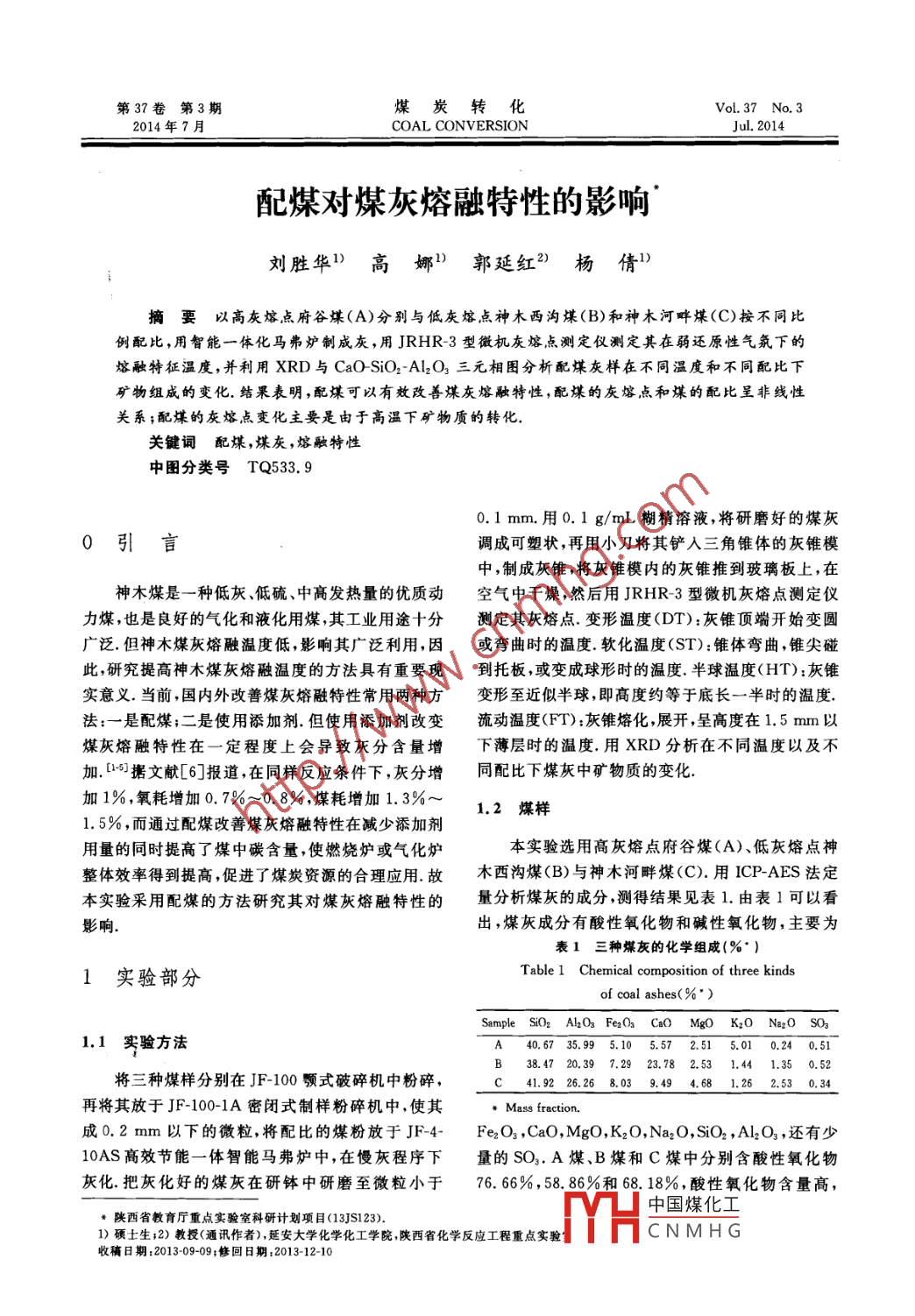 第37卷第3期某炭轉(zhuǎn)化Vol.37 No. 32014年7月.COAL CONVERSIONJul. 2014配煤對(duì)煤灰熔融特性的影響~劉勝華1)高娜)郭延紅3)楊倩l)摘要 以高灰熔點(diǎn)府谷煤(A)分別與低灰 熔點(diǎn)神木西溝煤(B)和神木河畔煤(C)按不同比例配比,用智能一體化馬弗爐制成灰,用JRHR-3型微機(jī)灰熔點(diǎn)測(cè)定儀測(cè)定其在弱還原性氣氛下的.熔融特征溫度,并利用XRD與CaO SiO2-Al2O3三元相圖分析配煤灰樣在不同溫度和不同配比下礦物組成的變化.結(jié)果表明,配煤可以有效改善煤灰熔融特性,配煤的灰熔點(diǎn)和煤的配比呈非線性關(guān)系;配煤的灰熔點(diǎn)變化主要是由于高溫下礦物質(zhì)的轉(zhuǎn)化.關(guān)鍵詞配煤,煤灰 ,熔融特性中圖分類號(hào)TQ533. 90.1 mm.用0.1 g/mL 糊精溶液,將研磨好的煤灰0引言調(diào)成可塑狀,再用小刀將其鏟人三角錐體的灰錐模中,制成灰錐,將灰錐模內(nèi)的灰錐推到玻璃板上,在神木煤是一種低灰、低硫、中高發(fā)熱量的優(yōu)質(zhì)動(dòng)空氣中干燥,然后用JRHR-3型微機(jī)灰熔點(diǎn)測(cè)定儀力煤,也是良好的氣化和液化用煤,其工業(yè)用途十分測(cè)定其灰熔點(diǎn).變形溫度(DT):灰錐頂端開(kāi)始變圓廣泛.但神木煤灰熔融溫度低,影響其廣泛利用,因或彎曲時(shí)的溫度.軟化溫度(ST):錐體彎曲,錐尖碰此,研究提高神木煤灰熔融溫度的方法具有重要現(xiàn)到托板,或變成球形時(shí)的溫度.半球溫度(HT):灰錐實(shí)意義.當(dāng)前,國(guó)內(nèi)外改善煤灰熔融特性常用兩種方變形至近似半球,即高度約等于底長(zhǎng)一半時(shí)的溫度.法:一.是配煤;二是使用添加劑.但使用添加劑改變流動(dòng)溫度(FT):灰錐熔化,展開(kāi),呈高度在1.5 mm以煤灰熔融特性在一定程度上會(huì)導(dǎo)致灰分含量增下薄層時(shí)的溫度.用XRD分析在不同溫度以及不加. [-5]據(jù)文獻(xiàn)[6]報(bào)道,在同樣反應(yīng)條件下,灰分增同配比下煤灰中礦物質(zhì)的變化..加1%,氧耗增加0. 7%~0.8%,煤耗增加1.3%~1.2煤樣1.5%,而通過(guò)配煤改善煤灰熔融特性在減少添加劑用量的同時(shí)提高了煤中碳含量,使燃燒爐或氣化爐本實(shí)驗(yàn)選用高灰熔點(diǎn)府谷煤(A)、低灰熔點(diǎn)神整體效率得到提高,促進(jìn)了煤炭資源的合理應(yīng)用.故木西溝煤(B)與神木河畔煤(C).用ICP-AES法定本實(shí)驗(yàn)采用配煤的方法研究其對(duì)煤灰熔融特性的量分析煤灰的成分,測(cè)得結(jié)果見(jiàn)表1.由表1可以看影響.出,煤灰成分有酸性氧化物和堿性氧化物,主要為表1三種煤灰的化學(xué)組成(%* )1實(shí)驗(yàn)部分Table 1 Chemical composition of three kindsof coal ashes(%")Sample SiOz Al2O3 Fe2O3 Ca0 MgO K:0 Naz2O SO31.1實(shí)驗(yàn)方法40.6735.995.105.57 2.51 5.01 0.24 0.51B 38.47 20.39 7.29 23.78 2.53 1.44 1.35 0.52將三種煤樣分別在JF-100顎式破碎機(jī)中粉碎,C 41.92 26.26 8.03 9.49 4.68 1.26 2.53 0.34再將其放于JF-100-1A密閉式制樣粉碎機(jī)中,使其* Mass fraction.成0.2 mm以下的微粒,將配比的煤粉放于JF-4-Fe2O3 ,CaO,MgO, K2O,Na2O, SiO2 ,Al2O3 ,還有少10AS高效節(jié)能一體智能馬弗爐中,在慢灰程序下量的SO3.A煤、B煤和C煤中分別含酸性氧化物灰化.把灰化好的煤灰在研缽中研磨至微粒小于76. 66%,58. 86%和68. 18%,酸性氧化物含量高,中國(guó)煤化工*陜西省教育廳重點(diǎn)實(shí)驗(yàn)室科研計(jì)劃項(xiàng)目(13JS123).1)碩士生;2)教授<通訊作者),延安大學(xué)化學(xué)化工學(xué)院,陜西省化學(xué)反應(yīng)工程重點(diǎn)實(shí)驗(yàn).MHCNM HG收稿日期:2013-09-09;修回日期:2013-12-10.第3期劉勝華等配煤對(duì)煤灰熔融特性的影響47熔點(diǎn)高;堿性氧化物含量高,熔點(diǎn)低. [2]14500-DT表2為煤灰熔融特性溫度和酸性氧化物與堿性1400 0-ST8口1350- A-HT氧化物含量比以及SiO2與Al2O3含量比.由表2可1 300-以看出,SiO2與Al2O3含量比為AC>B,即SiO2與Al2O,含量比越小,熔點(diǎn)越圖3為三種原煤煤灰在815 C下的XRD譜.由高.高含量的CaO(23. 78%)是B煤灰熔點(diǎn)低的原圖3可以看出,A煤煤灰主要含有方解石、赤鐵礦和因之一.雖然SiOr和Al2O3都有增高灰熔點(diǎn)的作Coal A用,但SiO2比Al2O3更能促使灰熔點(diǎn)降低,這主要是含硅的氧化礦物群和硅酸鹽礦物群與其他組分會(huì)CH AnH形成較鋁酸鹽共熔體灰熔點(diǎn)還要低的低熔點(diǎn)共熔Wwwwww物.[7]10203040506070802結(jié)果與討論Coal B2.1配煤對(duì) 灰熔點(diǎn)的影響A煤與B煤、A煤與C煤相配,各特性溫度與wwwww.配比之間的關(guān)系分別見(jiàn)圖1和圖2,隨著A煤的添δ102030405060708090加量增加,特性溫度曲線呈逐漸升高趨勢(shì).由圖1可01(° )以看出,不同配比下特性溫度變化幅度不盡相同,AHCoalC煤在煤灰中的含量處于30% ~ 70%之間時(shí)變化幅度最大,在50%~70%時(shí),ST的變化幅度最大,升幅達(dá)到102 C.由圖2也可看出,加入A煤后ST-直緩慢升高.圖1和圖2中DT,HT和FT的變化趨勢(shì)和ST的變化趨勢(shì)類似.由此可以看出,配煤可0102030405060708090以有效改善煤灰熔融特性,配煤的灰熔點(diǎn)和煤的配圖3三種原煤煤灰在815 C下的XRD譜比呈非線性關(guān)系.Fig.3 XRD spectrum of three kinds of coal ashes at 815 C1 450-C- Calcite;H- Hematite; An- Anorthite;Q- Quartz;0-5Ma- Magneite;M- Mllite;He- Hedenbergite鈣長(zhǎng)石;B煤煤灰主要含有石英、方解石、莫來(lái)石、磁E 1250-鐵礦、鈣長(zhǎng)石和赤鐵礦;C煤煤灰主要含有方解石、E 1200-1150-鈣長(zhǎng)石、赤鐵礦、莫來(l
