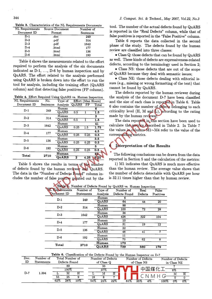 Lami G, Ferguson RW. An empirical study on the impact of automation on the requirements analysis process. JOURNAL OFCOMPUTER SCIENCE AND TECHNOLOGY 22(3): 338~347 May 2007An Empirical Study on the Impact of Automation on the RequirementsAnalysis ProcessGiuseppe Lamil and Robert W. Ferguson21 Istituto di Scienza e Tecnologie dllInformazione “Alessandro Faedo", 1-56124 Pisa, Italy2 Software Engineering Institute, Carnegie Mellon University, 15213 Pittsburgh, PA, U.S.A.E-mail: giuseppe.lami@isti.cnr.it; rwf@sei.cmu.eduReceived March 15, 2006; revised December 5, 2006.Abstract Requirements analysis is an important phase in a software project. The analysis is often performed in aninformal way by specialists who review documents looking for ambiguities, technical inconsistencies and incomplete parts.Automation is still far from being applied in requirements analyses, above all since natural languages are informal andthus dificult to treat automatically. There are only a few tools that can analyse texts. One of them, called QuARS, wasdeveloped by the Istituto di Scienza e Tecnologie dell'Informazione and can analyse texts in terms of ambiguity. This paperdescribes how QuARS was used in a formal empirical experiment to assess the impact in terms of effectiveness and eficacyof the automation in the requirements review process of a software company.Keywords requirements/specifcations analysis, requirements/specifcations tools, process metrics1 Introductionbased techniques can support the review process[4), themost common being checklists. A checklist can be usedNatural language (NL) is the most commonly used efectiveley for checking individual requirements, but ismeans of representation for expressing requirements for less useful for finding discourse ambiguities, if these 0C-computer-based systems in industry. Although natu- cur among requirements that are scattered over severalral language has the advantage of being universal andpages. Scenario-based review techniques5l are used inflexible, it is inherently ambiguous. Words can have dif- this second type of ambiguity. The overall idea is to pro-ferent meanings. The Oxford English Dictionary states vide an inspector with an operational scenario. To dothat the 500 most used words in English have on aver-that, the first step is to create an abstraction of a prod-age 23 meaningsl4l, and the same is probably true for uct, and then to answer questions based on analyzingother languages. Phrases and sentences may also have the abstraction with a particular emphasis or role fordifferent interpretations because different sequences ofthe inspector. For example, the inspectoir might createsyntax rules of the grammar may be used to generatetest cases for a requirements document and then answerthe same sentence. In some contexts ambiguity in NL the question,“Do you have all the infornation needed .is not necessarily a weakness but in the requirementsto develop a test case"? If the answer is“no”, then aspecification it definitely is.defect may have been detected|2].In [2] two types of ambiguity are identified: linguisticThere are also some tool-based techniques for per-and RE-specific ambiguity. Linguistic ambiguity entails forming requirements analysis. In [6] there is an exten-multiple interpretation of words and phrases and is con- sive survey of techniques and tools for textual require-text independent, whereas RE-specific is context depen- ments analysis. The techniques are classified into threedent and can only be observed by taking into account categories: restrictive (based on rules and constraintsthe context of particular requirements or the whole set that limit the level of freedom in writing requirementsof requirements in the specification.in NL); inductive (based on the indication of safe writ-There are several ways to reduce the negative impact ing styles for requirements without providing the meansof ambiguity3). In an NL requirement specification doc-to apply them); and analytic (based on linguistic tech-ument, one way is to perform joint or external reviewniques to identify and remove defects). Although thereor inspections因. Some organisations use professional are several techniques and tools for analysing naturalrequirements analysts to identify ambiguities (both lin- language requirements, there is ltte evidence in the lit-guistic and RE-specific). The costs for reviews are high erature that they have been empircally validated or as-both in terms of money and time. Moreover, consider- sessed for efectiveness.ing the volatility of requirements during a project life,Empirical studies are important to establish the rel-reviews may hold up the entire project. Knowledge of ative中國煤化工d of study that con-the specific application domain by the requirements an- tributOne of the rea-alysts is a key factor in the success of such a review.sonsYHC N M H Gessmnt in requireThere are several techniques for addressing the am- ments analysis is the dificulty in aggregating empri-biguity of NL in requirements specification. Inspection- cal resultsl7. In fact, these tools/ techniques are usu-Regular PaperGiuseppe Lami et al: An Empirical Study on the Impact of Automation339ally developed in a particular environment and the local●Quality indicators are specific descriptions of some-assumptions may preclude sound assessment or bench- thing that provide evidence either for or against themarking. Moreover, case studies with industrial part- existence of a specific quality characteristic or subners are important for showing that they are feasible, characteristic.as well as for confirming the value of case studies them-●Quality metrics provide numerical values by esti-selves.mating the quality of a work product or process by mea-In this paper we describe how an automatic linguisticsuring the degree to which it possesses a specific qualityanalysis tool, QuARS, has been used in a controlled and characteristic.rigorous empirical study. QuARS lexic
