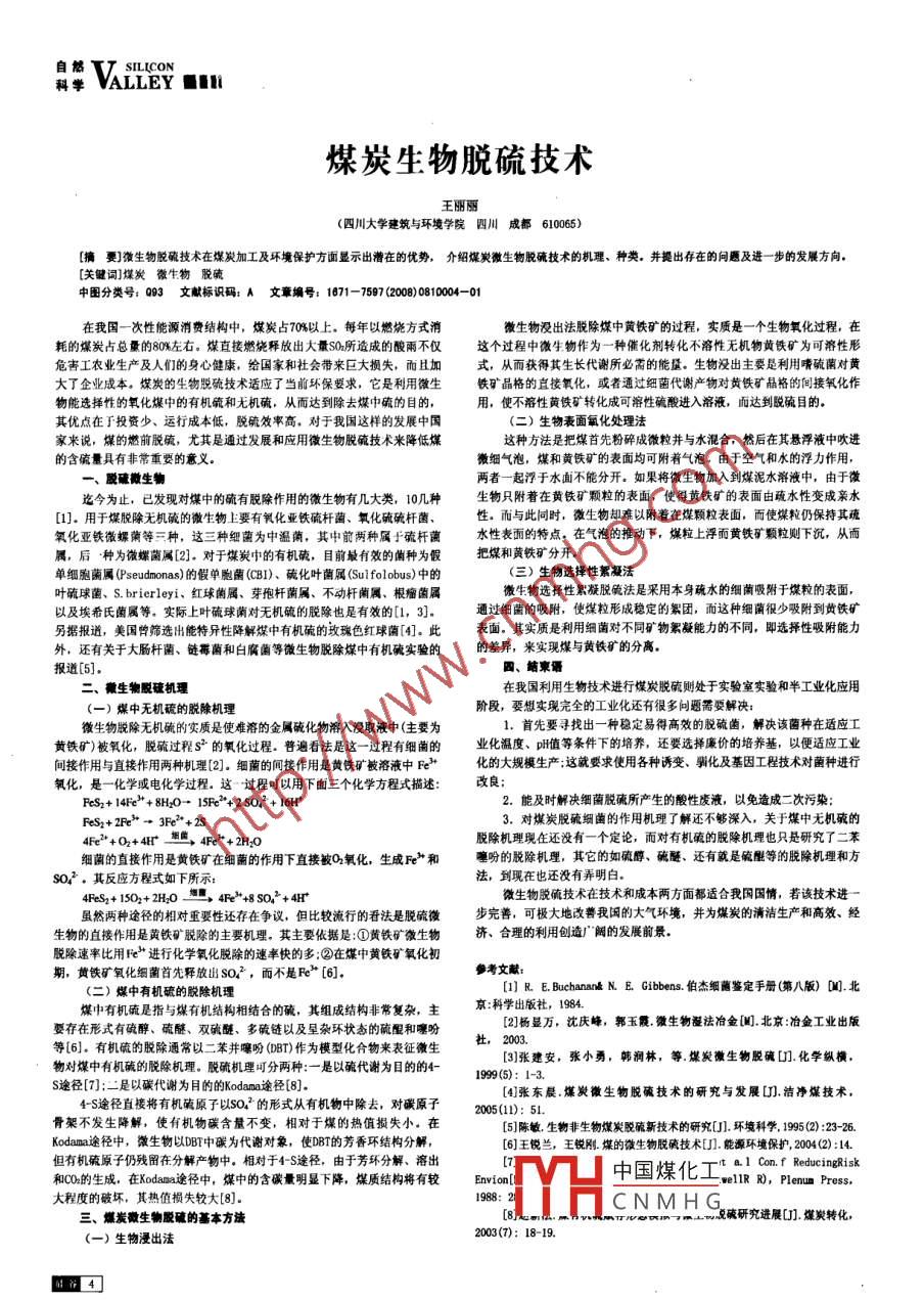 科學(xué)VAlley mm煤炭生物脫硫技術(shù)王麗麗(四川大學(xué)建筑與環(huán)境學(xué)院四川成都61006)[摘要]微生物脫硫技術(shù)在煤炭加工及環(huán)境保護(hù)方面顯示出潛在的優(yōu)勢(shì),介紹煤炭微生 物脫硫技術(shù)的機(jī)理、種類(lèi).并提出存在的問(wèn)題及進(jìn)一步的發(fā)展方向。[關(guān)鍵詞]煤炭微牛物脫硫中圖分類(lèi)號(hào): 093文獻(xiàn)標(biāo)識(shí)碼: A文章編號(hào): 1071- -7597 (00)0810004-010在我國(guó)一次性能源消費(fèi)結(jié)構(gòu)中,煤炭占70%以上。每年以燃燒方式消微生物沒(méi)出法脫除煤中黃鐵礦的過(guò)程,實(shí)質(zhì)是一一個(gè)生物氧化過(guò)程,在耗的煤炭占總量的80%左右。煤直接燃燒釋放出大量S0.所造成的酸雨不僅這個(gè)過(guò)程中微生物作為一種催化劑轉(zhuǎn)化不溶性無(wú)機(jī)物黃鐵礦為可溶性形危害工農(nóng)業(yè)生產(chǎn)及人們的身心健康,給國(guó)家和社會(huì)帶來(lái)巨大損失,而且加式,從而獲得其生長(zhǎng)代謝所必需的能量。生物浸出主要是利用晴硫菌對(duì)黃大了企業(yè)成本。煤炭的生物脫硫技術(shù)適應(yīng)了當(dāng)前環(huán)保要求,它是利用微生鐵礦晶格的直接氧化,或者通過(guò)細(xì)菌代謝產(chǎn)物對(duì)黃鐵礦晶格的間接氧化作物能選撣性的氧化煤中的有機(jī)硫和無(wú)機(jī)確,從而達(dá)到除去煤中硫的目的,用,使不落性黃鐵礦轉(zhuǎn)化成可溶性硫酸進(jìn)入溶液,而達(dá)到脫硫目的。其優(yōu)點(diǎn)在于投資少、運(yùn)行成本低,脫硫效率高。對(duì)于我國(guó)這樣的發(fā)展中國(guó)(=)生物表面氧化處理法家來(lái)說(shuō),煤的燃前脫硫,尤其是通過(guò)發(fā)展和應(yīng)用微生物脫硫技術(shù)來(lái)降低煤這種方法是把煤首先粉碎成微粒并與水混合,然后在其懸浮液中吹進(jìn)的含硫量具有非常重要的意義。微細(xì)氣泡,煤和黃鐵礦的表面均可附著氣泡。由于空氣和水的浮力作用,-脫硫擻生物兩者-起浮于水面不能分開(kāi)。如果將微生物加入到煤泥水游液中,由于微迄今為止,已發(fā)現(xiàn)對(duì)煤中的硫有脫除作用的微生物有幾大類(lèi),10幾種生物只附著在黃鐵礦顆粒的表面,使得黃鐵礦的表面由疏水性變成親水[1].用于煤脫除無(wú)機(jī)硫的微生物上要有氧化亞鐵硫桿菌、氧化硫硫桿菌、性。而與此同時(shí),微生物卻難以附著在煤顆粒表面,而使煤粒仍保持其疏氧化亞鐵微螺蘭等三種,這三種細(xì)菌為中溫蔭,其中前兩種屬f硫桿菌水性表面的特點(diǎn)。在氣泡的推動(dòng)下,煤粒上浮而黃鐵礦顆粒則下沉,從而屬,后.種為微螺蘭屬[2].對(duì)于煤炭中的有機(jī)確,目前最有效的菌種為假把煤和黃鐵礦分開(kāi)。單細(xì)胞菌屬(Pseudmonas)的假單胞菌(CBI).硫化葉菌屬(Sul folobus)中的(三)生物選擇性絮凝法葉硫球菌、s. brierleyi.紅球菌屬、芽孢桿蘭屬、不動(dòng)桿菌屬、根瘤菌屬微生物選擇性絮凝脫碗法是采用本身疏水的細(xì)菌吸附于煤粒的表面,以及埃希氏菌屬等。實(shí)際上葉硫球蘭對(duì)無(wú)機(jī)硫的脫除也是有效的[1, 3]。通過(guò)細(xì)菌的吸附,使煤粒形成穩(wěn)定的繁團(tuán),而這種細(xì)菌很少吸附到黃鐵礦另?yè)?jù)報(bào)道,美國(guó)曾篩選出能特異性降解煤中有機(jī)硫的玫瑰色紅球菌[4].此表面。其實(shí)質(zhì)是利用細(xì)菌對(duì)不同礦物絮凝能力的不同,即選擇性吸附能力外,還有關(guān)于大腸桿菌、鏈霉菌和白腐菌等微生物脫除煤中有機(jī)硫?qū)嶒?yàn)的的差異,來(lái)實(shí)現(xiàn)煤與黃鐵礦的分離。報(bào)道[5]。四、結(jié)柬語(yǔ)=、撒生物脫硫機(jī)理在我國(guó)利用生物技術(shù)進(jìn)行煤炭脫硫則處于實(shí)驗(yàn)室實(shí)驗(yàn)和半工業(yè)化應(yīng)用(一)煤中無(wú)機(jī)硫的脫除機(jī)理階段,要想實(shí)現(xiàn)完全的工業(yè)化還有很多問(wèn)題需要解決:微生物脫除無(wú)機(jī)硫的實(shí)質(zhì)是使難溶的金屬硫化物溶入沒(méi)取液中(主要為1.首先要尋找出一種穩(wěn)定易得高效的脫硫菌,解決該菌種在適應(yīng)工黃鐵礦)被氧化,脫硫過(guò)程S4的氧化過(guò)程。普遍看法是這一 -過(guò)程有細(xì) 菌的業(yè)化溫度、pH值等條件下的培養(yǎng),還要選擇廉價(jià)的培養(yǎng)基,以便適應(yīng)工業(yè)間接作用與直接作用兩種機(jī)理[2]。細(xì)菌的間接作用是黃鐵礦被溶液中Fet+化的大規(guī)模生產(chǎn):這就要求使用各種誘變、駟化及基因工程技術(shù)對(duì)菌種進(jìn)行氧化,是一化學(xué)或電化學(xué)過(guò)程。這-過(guò)程叮以用下面三個(gè)化學(xué)方程式描述:改良;Pes2+ 14Fe2+ 8H2O→15Pe*+2SO42 + 16H*2.能及時(shí)解決細(xì)菌脫硫所產(chǎn)生的酸性廢液,以免造成二次污染:FeS2+2FRe*- 3Ee*+2S3.對(duì)煤炭脫硫細(xì)菌的作用機(jī)理了解還不夠深入,關(guān)于煤中無(wú)機(jī)硫的4Fe* +O2+4H*細(xì),4Fe* +2H2O脫除機(jī)理現(xiàn)在還沒(méi)有一個(gè)定 論,而對(duì)有機(jī)殖的脫除機(jī)理也只是研究了二苯細(xì)菌的直接作用是黃鐵礦在細(xì)菌的作用下直接被0氧化,生成Fe"* 和噻吩的脫除機(jī)理,其它的如硫脖、硫醚、還有就是硫能等的脫除機(jī)理和方so.* .其反應(yīng)方程式如下所示:法,到現(xiàn)在也還沒(méi)有弄明白。4FeSs+ 1502+ 2H2O地惠, 4Fe*+8 so2+4H*微生物脫硫