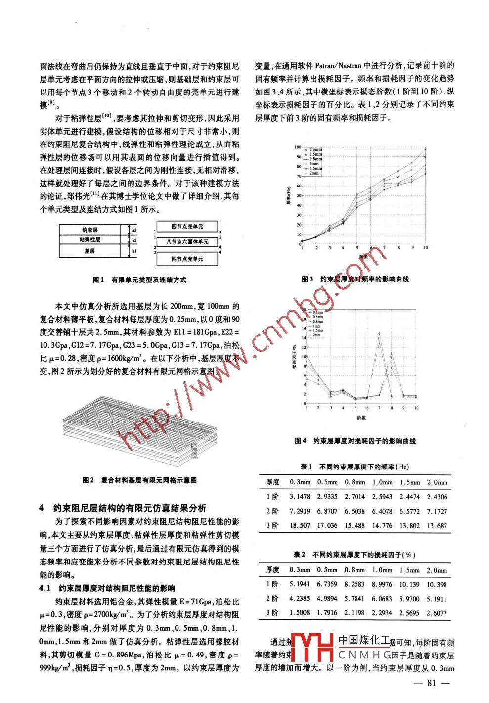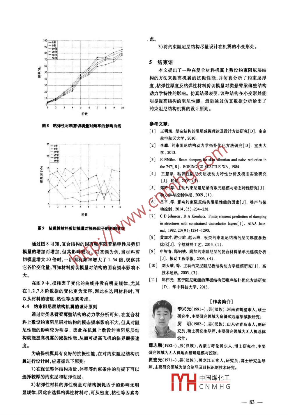 第32卷第l1期計(jì)算機(jī)仿真2015年11月文章編號(hào):1006-9348(2015)11-0079-05飛機(jī)機(jī)翼結(jié)構(gòu)動(dòng)力學(xué)特性研究李興光12,厲明,薛志鵬,賈宏光(1.中國(guó)科學(xué)院長(zhǎng)春光學(xué)精密機(jī)械與物理研究所,吉林長(zhǎng)春1300332中國(guó)科學(xué)院大學(xué),北京10009)摘要:由于飛機(jī)在高速飛行時(shí)會(huì)引起機(jī)翼發(fā)散振動(dòng),引起飛機(jī)結(jié)構(gòu)損壞,傳統(tǒng)提高剛度的方法會(huì)大幅增加飛機(jī)重量。為解決上述問(wèn)題提出在機(jī)翼表面敷設(shè)約束阻尼層結(jié)構(gòu)提高機(jī)翼動(dòng)力學(xué)特性的方法。建立復(fù)合材料為基層的約束阻尼層結(jié)構(gòu)的模型,并通過(guò)Paan/ Nastran仿真分析粘彈性層厚度、約束層厚度和粘彈性層剪切模量對(duì)結(jié)構(gòu)阻尼性能的影響。仿真結(jié)果表明粘彈性層厚度和約束層厚度對(duì)復(fù)合結(jié)構(gòu)模態(tài)頻率和損耗因子具有相同的影響規(guī)律,而粘彈性層剪切模量不宜作為選擇材料的依據(jù)。通過(guò)分析不同參數(shù)對(duì)類(lèi)懸臂梁薄壁結(jié)構(gòu)阻尼性能的影響,為高阻尼性能的機(jī)翼優(yōu)化設(shè)計(jì)提供了參考關(guān)鍵詞:復(fù)合材料;約束阻尼層;有限元;機(jī)翼;結(jié)構(gòu)損耗因子中圖分類(lèi)號(hào):V254.2文獻(xiàn)標(biāo)識(shí)碼:BResearch on Dynamic Characteristics of Aircraft Wing StructureLI Xing-guang.,LI Ming, XUE Zhi-peng, JIA Hong-guang(1. Changchun Institute of Optics, Fine Mechanics and Physics, Chinese Academy of SciencesChangchun Jilin 130033, China; 2. University of Chinese Academy of Sciences, Beijing 10039, China)ABSTRACT: Aiming at the characteristics of plane wing divergence vibration in high speed flight and to avoid thedisadvantages of traditional method of increasing stiffness which will substantially increase the airplane weight, weproposed a method to improve the dynamic characteristics of the wing by laying constrained damping layer structure onthe surface of wing. Establishing the finite element modal of constrained damping layer which uses the composite ma-erial as the basic layer, the effects of viscoelastic layer thickness, constrained layer thickness and shear modulus ofviscoelastic layer on structural damping properties were analyzed by Patran/ Nastran simulation software. The simulation results show that the effects of viscoelastic layer thickness and constrained layer thickness on composite structuremodal frequencies and loss factors have the same pattern, and the viscoelastic material shear modulus is not suitablefor the basis to choice the material. The analyses for the effects of different parameters on the cantilever beam of thinwalled structure on damping performance can provide some reference for the design of high damping properties of theKEYWORDS: Composite material; Constrained damping layer; Finite element; Wing; Structure loss factor1引言性,能在相當(dāng)寬的頻帶內(nèi)起到抑制振動(dòng)和噪聲的作用,是目飛機(jī)在高速飛行時(shí),當(dāng)速度超過(guò)顫振臨界速度,將會(huì)引前應(yīng)用最廣泛的一種阻尼材料。粘彈性材料由于模量過(guò)低起機(jī)翼的發(fā)散振動(dòng)從而破壞飛機(jī)結(jié)構(gòu)。統(tǒng)計(jì)信息表明",一般不能成為工程中的結(jié)構(gòu)材料,而是將它粘附在需要作減在飛行器發(fā)生的各類(lèi)事故中接近一半與振動(dòng)相關(guān)。隨著我振降噪處理的機(jī)械結(jié)構(gòu)或工程結(jié)構(gòu)構(gòu)件上,這種處理方法稱(chēng)國(guó)工業(yè)的跨越發(fā)展,控制振動(dòng)危害對(duì)國(guó)防建設(shè),航天技術(shù)研為附加阻尼結(jié)構(gòu)。究,以及工業(yè)生產(chǎn)的發(fā)展都有十分重大的意義。如何盡量減1991年, Parin等人在美國(guó)軍用F-15噴氣戰(zhàn)斗機(jī)上,通少結(jié)構(gòu)的振動(dòng)幅度,提高結(jié)構(gòu)的抗振性能,一個(gè)主要方法就過(guò)粘貼阻尼材料來(lái)吸收結(jié)構(gòu)振動(dòng)能量,延長(zhǎng)了飛機(jī)的使用壽是提高結(jié)構(gòu)的阻尼,通過(guò)增加結(jié)構(gòu)的動(dòng)能損耗,來(lái)增強(qiáng)結(jié)構(gòu)命。僅在基層表面粘貼一層阻尼材料的結(jié)構(gòu)稱(chēng)為自由阻尼動(dòng)態(tài)環(huán)境下的抗振能力21。粘彈性材料因其具有高阻尼特層。在自由阻尼層的外表面再粘貼一層金屬層,這種結(jié)構(gòu)下,粘彈性材料在結(jié)構(gòu)振動(dòng)時(shí)主要發(fā)生剪切應(yīng)變,而剪切應(yīng)基金項(xiàng)目:中國(guó)科學(xué)院知識(shí)創(chuàng)新工程國(guó)防科技創(chuàng)新重要項(xiàng)目(YY變產(chǎn)生的耗中國(guó)煤化工為約束阻尼結(jié)構(gòu)。這種結(jié)構(gòu)CNMHG下有效降低振動(dòng)峰收稿日期:2015-01-17修回日期:2015-02-11值。約束阻尼層結(jié)構(gòu)已經(jīng)被廣泛應(yīng)用于汽車(chē)艦船、航天航空和電子設(shè)備等薄板機(jī)構(gòu)中解決振動(dòng)和噪聲問(wèn)題。1984年Mils首次將約束阻尼層技術(shù)應(yīng)用到 Boeing-747客機(jī)艙室的減震降噪。有多位學(xué)者45研究了以金屬材料作為基層(10)的約束阻尼層結(jié)構(gòu)的動(dòng)力學(xué)性能包括厚度、溫度頻率6等因素對(duì)模態(tài)頻率和損耗因子的影響,但該種結(jié)構(gòu)應(yīng)用于復(fù)合如果矩陣K是由有限元分析得到的那么它可以分為K材料機(jī)翼上時(shí),約束層厚度、粘彈性厚度及粘彈性層剪