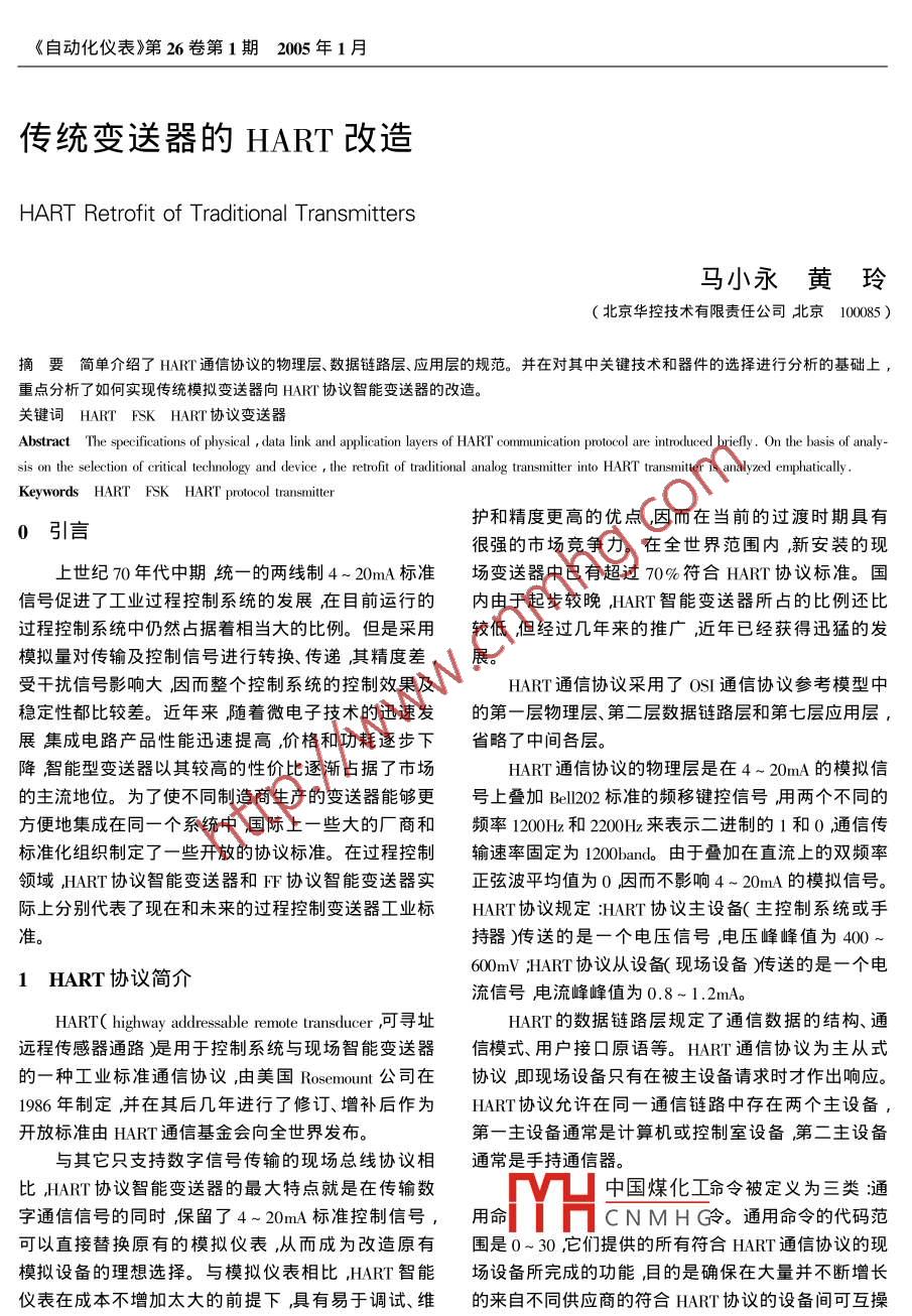 《自動化儀表》第26卷第1期2005年1月傳統(tǒng)變送器的HART改造HART Retrofit of Traditional Transmitters馬小永黃玲北京華控技術(shù)有限責(zé)任公司北京100085)摘要簡單介紹了HART通信協(xié)議的物理層、數(shù)據(jù)鏈路層、應(yīng)用層的規(guī)范。并在對其中關(guān)鍵技術(shù)和器件的選擇進(jìn)行分析的基礎(chǔ)上重點分析了如何實現(xiàn)傳統(tǒng)模擬變送器向HART協(xié)議智能變送器的改造。關(guān)鍵詞 HART FSK HART協(xié)議變送器Abstract The specifications of physical data link and applayers of HART communication protocol are introduced briefly. On the basis of analysis on the selection of critical technology and device the retrofit of traditional analog transmitter into HART transmitter is analyzed emphaticallyKeywords HART FSK HART protocol transmitter引言護(hù)和精度更高的優(yōu)點因而在當(dāng)前的過渡時期具有很強(qiáng)的市場競爭力。在全世界范圍內(nèi)新安裝的現(xiàn)上世紀(jì)70年代中期統(tǒng)一的兩線制4~20mA標(biāo)準(zhǔn)場變送器中已有超過70%符合HART協(xié)議標(biāo)準(zhǔn)。國信號促進(jìn)了工業(yè)過程控制系統(tǒng)的發(fā)展在目前運行的內(nèi)由于起步較晚HART智能變送器所占的比例還比過程控制系統(tǒng)中仍然占據(jù)著相當(dāng)大的比例。但是采用較低但經(jīng)過幾年來的推廣近年巳經(jīng)獲得迅猛的發(fā)模擬量對傳輸及控制信號進(jìn)行轉(zhuǎn)換、傳遞其精度差,展。受干擾信號影響大因而整個控制系統(tǒng)的控制效果及HART通信協(xié)議采用了OSI通信協(xié)議參考模型中穩(wěn)定性都比較差。近年來隨著微電子技術(shù)的迅速發(fā)的第一層物理層、第二層數(shù)據(jù)鏈路層和第七層應(yīng)用層,展集成電路產(chǎn)品性能迅速提高,價格和功耗逐步下省略了中間各層降智能型變送器以其較高的性價比逐漸占據(jù)了市場HART通信協(xié)議的物理層是在4~20mA的模擬信的主流地位。為了使不同制造商生產(chǎn)的變送器能夠更號上疊加Bl202標(biāo)準(zhǔn)的頻移鍵控信號用兩個不同的方便地集成在同一個系統(tǒng)中國際上一些大的廠商和頻率1200Hz和2200Hz來表示二進(jìn)制的1和0通信傳標(biāo)準(zhǔn)化組織制定了一些開放的協(xié)議標(biāo)準(zhǔn)。在過程控制輸速率固定為1200band。由于疊加在直流上的雙頻率領(lǐng)域HART協(xié)議智能變送器和F協(xié)議智能變送器實正弦波平均值為0因而不影響4~20mA的模擬信號。際上分別代表了現(xiàn)在和未來的過程控制變送器工業(yè)標(biāo)HART協(xié)議規(guī)定HAHT協(xié)議主設(shè)備(主控制系統(tǒng)或手準(zhǔn)持器)傳送的是一個電壓信號電壓峰峰值為400~1HART協(xié)議簡介600 my HART協(xié)議從設(shè)備現(xiàn)場設(shè)備)傳送的是一個電流信號電流峰峰值為0.8~1.2mA。HART( highway addressable remote transducer可尋址HART的數(shù)據(jù)鏈路層規(guī)定了通信數(shù)據(jù)的結(jié)構(gòu)、通遠(yuǎn)程傳感器通路湜用于控制系統(tǒng)與現(xiàn)場智能變送器信模式、用戶接口原語等。HAT通信協(xié)議為主從式的一種工業(yè)標(biāo)準(zhǔn)通信協(xié)議由美國 Rosemount公司在協(xié)議即現(xiàn)場設(shè)備只有在被主設(shè)備請求時才作出響應(yīng)。1986年制定并在其后幾年進(jìn)行了修訂、增補(bǔ)后作為HART協(xié)議允許在同一通信鏈路中存在兩個主設(shè)備開放標(biāo)準(zhǔn)由HART通信基金會向全世界發(fā)布第一主設(shè)備通常是計算機(jī)或控制室設(shè)備第二主設(shè)備與其它只支持?jǐn)?shù)字信號傳輸?shù)默F(xiàn)場總線協(xié)議相通常是手持通信器。比HART協(xié)議智能變送器的最大特點就是在傳輸數(shù)凵中國煤化工令被定義為三類通字通信信號的同時保留了4~20mA標(biāo)準(zhǔn)控制信號,用命CNMH令令。通用命令的代碼范可以直接替換原有的模擬儀表,從而成為改造原有圍是0~30它們提供的所有符合HART通信協(xié)議的現(xiàn)模擬設(shè)備的理想選擇。與模擬儀表相比,HART智能場設(shè)備所完成的功能目的是確保在大量并不斷增長儀表在成本不增加太大的前提下具有易于調(diào)試、維的來自不同供應(yīng)商的符合HART協(xié)議的設(shè)備間可互操22PROCESS AUTOMATION INSTRUMENTATION Vol 26, No I January 2005傳統(tǒng)變送器的HART改造馬小永等作并在日常工廠操作中訪問數(shù)據(jù)。常用命令的代碼電阻。范圍是32~126,它們提供大部分符合HART通信協(xié)議③電纜分布電容在實際運行中曾有過模擬輸〔但不是全部舶的現(xiàn)場設(shè)備完成的功能。設(shè)備專用命令出信號正常但不能通信的現(xiàn)象。經(jīng)分析是由于電纜的代碼范圍是128~253,它們提供由基本上唯一的特太長、分布電容太大致使網(wǎng)絡(luò)時間常數(shù)過大、通信波殊現(xiàn)場設(shè)備所完成的功能。形嚴(yán)重失真而無法通信此時可以通過更換合適的電在一個大的系統(tǒng)中往往集成了多個廠商的變纜來解決送器。從用戶角度出發(fā),希望用一個手持器就可以對所有的變送器進(jìn)行一些常用的操作,這就涉及到3傳統(tǒng)變送器的HART改造了互操作性。為了保證HAR協(xié)議產(chǎn)品符合互操作典型HART智能儀表的電路組成一般包括電源模性要求,HART基金會要求其協(xié)議產(chǎn)品必須經(jīng)過塊、傳感器接口電路、AD轉(zhuǎn)