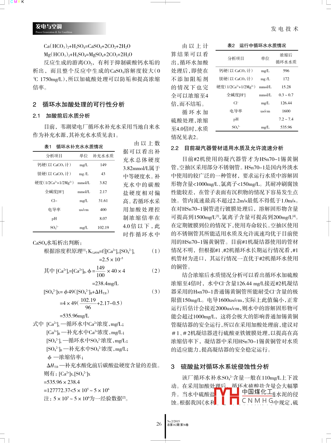 發(fā)電技術(shù)發(fā)電與空調(diào)葦湖梁電廠循環(huán)水加酸叮行性分析張莉新疆華電煤業(yè)有限公司,新疆烏魯木齊830017)摘要:通過對葦湖梁電廠循環(huán)水質(zhì)及循環(huán)水枃筑物水泥耐受硫酸鹽分析,詳細(xì)闡述由于水質(zhì)和循環(huán)水構(gòu)筑物耐受硫酸鹽問題,導(dǎo)致循環(huán)水加酸工藝無法在該廠開展實(shí)施的具體原因。關(guān)鍵詞:循環(huán)水;加酸;阻垢劑;硫酸鹽;侵蝕DO|:10.3969 J. ISSN.2095-3429.2015.02.007中圖分類號:TM621文獻(xiàn)標(biāo)識碼:B文章編號:2095-3429(2015)020025-03Analysis on the Weihuliang Power Plant Circulating Water and Acid feasibilityZHANG I(Xinjiang Huadian Coal Industry Co, Ltd, Urumqi 830017, China)Abstract: Through the weihuliang power plant circulating water and circulating water structures of sulfate cementlerance analysis, in detail because of water quality and water circulation structures tolerance sulfate problems, the causesof circulating water by adding acid process can not be carried out in the factory implementationKey words: circulating water; adding acid; inhibitor; sulfate; erosion0引言處理方式,使目前的循環(huán)水濃縮倍率進(jìn)一步提高至≤葦湖梁電廠目前循環(huán)水采用加入阻垢劑+緩蝕劑40倍運(yùn)行,以滿足循環(huán)水在夏季嚴(yán)重缺水條件下的安的處理方式,控制濃縮倍率≤30倍運(yùn)行。在冬、秋、春全穩(wěn)定運(yùn)行。季,因環(huán)境溫度低,水塔日蒸發(fā)量相對夏季少一些。按目前的運(yùn)行方式,能夠較好的滿足冬、秋、春季的運(yùn)行1加酸處理原理要求,但在夏季時,因環(huán)境溫度高,冷卻塔蒸發(fā)量非常循環(huán)水加酸處理是將水中碳酸鹽硬度轉(zhuǎn)化為溶解大,導(dǎo)致水塔補(bǔ)水量也很大;再加上在夏季時,上游蓄度較大的非碳酸鹽硬度,以防止生成碳酸鹽水垢的水池時常出現(xiàn)水位低的情況,導(dǎo)致水塔無法正常換水,種處理方法。通常采用加入硫酸,若加入鹽酸會帶入進(jìn)而影響到整個循環(huán)水系統(tǒng)的運(yùn)行水質(zhì),加大了凝結(jié)CⅠ-,增加循環(huán)水中的總的C含量,容易造成耐C-性器內(nèi)銅管結(jié)垢腐蝕的可能性。為了避免岀現(xiàn)凝結(jié)器嚴(yán)較差的銅管的腐蝕,故一般不采用;加硝酸會帶入重結(jié)垢影響杋組正常運(yùn)行。在夏季時提髙循環(huán)水濃縮NO3ˉ,導(dǎo)致硝化細(xì)菌繁殖,且成本較加硫酸貴,也很」倍率,是解決夏季用水緊張的有效途徑采用;硫酸在儲存和運(yùn)輸也較鹽酸和硝酸安全方便,故根據(jù)安評專家建議及査閱相關(guān)資料以及結(jié)合目前在循環(huán)水的加酸處理運(yùn)行過程中,硫酸得到了廣泛的國內(nèi)電廠循環(huán)水處理方式,擬采用阻垢劑+硫酸的聯(lián)合應(yīng)用。硫酸與水中重碳酸鹽硬度的反應(yīng)如下中國煤化工CNMHG作者簡介:張莉(1977-),女,河北人,大專,技師。2015總第162期第環(huán)卷25發(fā)電與空調(diào)發(fā)電技術(shù)Ca(HCo,)2+H S02=CaSO4+2C02+2H,0由以上計表2運(yùn)行中循環(huán)水水質(zhì)情況Mg(Hco3)2+H2S04=MgS04+2C02+2H,0算結(jié)果可以看分析項(xiàng)目單位反應(yīng)生成的游離CO2,有利于抑制碳酸鈣水垢的出,循環(huán)水加酸循環(huán)水水質(zhì)析出,而且整個反應(yīng)中生成的CasO4溶解度較大(0處理后,即使在鈣硬(以CaCO3計)℃1750mgL),所以加硫酸處理可以防垢和提高濃縮不添加阻垢劑鎂硬以CaCO計)172倍率的情況下也完硬度(1/2Cm2+2Mg2) mmol/L1528全可以濃縮至4全堿度[Hmmo/L0.3~0.72循環(huán)水加酸處理的可行性分析倍,而不結(jié)垢。126.44電導(dǎo)率us/em21加酸前后水質(zhì)分析循環(huán)水加硫酸處理,濃縮7.2~74目前,葦湖梁電廠循環(huán)水補(bǔ)充水采用當(dāng)?shù)刈詠硭?0倍時,水質(zhì)SO4作為補(bǔ)充水源,其補(bǔ)充水水質(zhì)見表1。情況見表2表1循環(huán)水補(bǔ)充水水質(zhì)情況由以上數(shù)據(jù)可以看出補(bǔ)22目前凝汽器管材適用水質(zhì)及允許流速分析分析項(xiàng)目單位補(bǔ)充水水質(zhì)充水總體硬度目前#機(jī)使用的凝汽器管才為HSn70-1錫黃銅鈣硬(以CaCO3計)mg/L3.82mmⅥ屬于管,空抽區(qū)采用部分不銹鋼管。HSn70-1是國內(nèi)外淡水鎂硬(以CaCO3計)mgL中等硬度水。補(bǔ)中使用的較廣泛的一種管材,要求運(yùn)行水質(zhì)中溶解固硬度(1/2Ca2+1/2Mg2)mmol/L3.82充水中的碳酸形物含量<1000mg/L、氯離子<150mgL。其耐沖刷腐蝕全堿度[Hmmol/L 2.1鹽硬度相對偏性能較差,在管子表面有沉積物的情況下容易發(fā)生點(diǎn)ngL3161高。若循環(huán)水采蝕。管內(nèi)流速最高不超過22m/s最低不得低于10m/s電導(dǎo)率用加酸處理控在對HSn70-1銅管進(jìn)行鍍膜處理后,溶解固形物含量制濃縮倍率在可提高到1500mg/,氯離子含量可提高到200mg/H。SOa0140倍以下,此在定期鍍膜到位的情況下,使用壽命較長空抽區(qū)使用CaSO水垢析出判斷:用的HSn70-1錫黃銅管。目前#機(jī)凝結(jié)器使用的管材根據(jù)溶度積原理:Ks= f[Ca"]-[SO2(1)情況不明,但根據(jù)#1、#2機(jī)循環(huán)水長期運(yùn)行情況看,#1機(jī)管材為進(jìn)口,其運(yùn)行情況一直優(yōu)于#機(jī)循環(huán)水使用其中[Ca21=Ca2lb=的銅管。100×40×4結(jié)合濃縮后水質(zhì)情況分析可以看出循環(huán)水加硫酸2384mg/I濃縮至4倍時,水中Cl含量126.44mg接近#機(jī)凝結(jié)SO4]x=<49([S02-1B+AHTB(3)器采用的Hsn70-1普通錫黃銅管所能耐受Cl含量的極102.19+2.17-0.5)限值150m