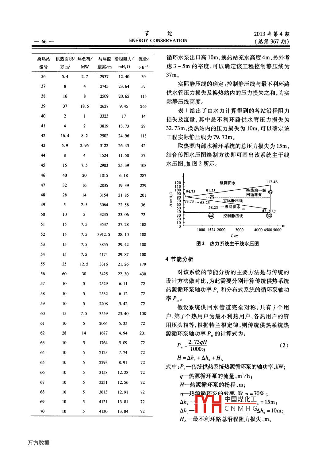 節(jié)能2013年第4期二64-ENERGY CONSERVATION(總第367期)分布式循環(huán)水泵供熱系統(tǒng)的設(shè)計實例孫志勇,鞠松洋(沈陽市熱力工程設(shè)計研究院,遼寧沈陽110014)摘要:介紹分布式循環(huán)水泵供熱系統(tǒng)的基本構(gòu)造和設(shè)計方法,主要包括循環(huán)水泵的設(shè)計、系統(tǒng)水壓圖的繪制及節(jié)能分析。給出分布式循環(huán)水泵供熱系統(tǒng)的節(jié)能率計算公式和方法,結(jié)合工程實例,對分布式循環(huán)水泵供熱系統(tǒng)的節(jié)能效率進(jìn)行分析。關(guān)鍵詞:分布式循環(huán)水泵;供熱系統(tǒng);節(jié)能中圖分類號:TU833*.1文獻(xiàn)標(biāo)識碼:B 文章編號 :1004 - 7948(2013)04 -0064 -04doi: 103969/j. issn. 1004 - 7948. 2013.04. 016引言s_ -圾網(wǎng)在傳統(tǒng)供熱系統(tǒng)設(shè)計中,通常僅在熱源處設(shè)置白網(wǎng)循環(huán)泵循環(huán)水泵,其揚程根據(jù)最不利環(huán)路的阻力確定,各用戶通過調(diào)節(jié)閥門消耗多余的資用壓頭來進(jìn)行流定壓旁通L子樸水水箱量分配,這樣會在運行時存在過多的無效電能。熱源循環(huán)泵卜水泵為解決這一問題,采用分布式循環(huán)水泵的設(shè)圖1 分布式循環(huán)系統(tǒng)構(gòu)造圉計,取消了獨立的熱網(wǎng)循環(huán)泵,熱源處設(shè)置循環(huán)泵的功能是承擔(dān)熱源內(nèi)部的水循環(huán),而換熱站內(nèi)循環(huán)系統(tǒng)與傳統(tǒng)供熱系統(tǒng)的最大不同之處在于增泵既有承擔(dān)熱網(wǎng)循環(huán)泵的熱媒輸送功能,又有在熱加了均壓管和換熱站一級網(wǎng)循環(huán)泵。均壓管的作用戶建立必要的資用壓頭的功能,并能通過變頻裝用是使其管內(nèi)的壓降接近為0,即均壓管內(nèi)為同-壓力值,從而起到穩(wěn)壓的作用,借以減少管路間水置實現(xiàn)變流量調(diào)節(jié)。該設(shè)計基本消除了無效電耗,且不用安裝電動力工況的相互干擾。在熱源循環(huán)泵的出口處至均調(diào)節(jié)閥。該系統(tǒng)不但降低了能耗,而且有利于熱網(wǎng)壓管之間,安裝定壓旁通管(管徑為D、25 ~ D、40, .視母管管經(jīng)而定) ,其上裝設(shè)壓力傳感器和手動平水力平衡,給熱用戶提供了非常好的保障。衡閥,壓力傳感器反映均壓管的壓力,手動平衡閥1工程概況可調(diào)整均壓管(即壓力傳感器)的壓力值。該工程為沈陽市長白新城區(qū)域集中供熱工程,安裝定壓旁通管的指導(dǎo)思想是將均壓管的壓.規(guī)劃總供熱面積1136.25萬m2,綜合熱指標(biāo)為力值調(diào)節(jié)控制為系統(tǒng)恒壓點壓力值,其目的- -是為50W/m2,最終建設(shè)70座換熱站,供、回水設(shè)計溫了讓均壓管更好地發(fā)揮解耦作用,提高系統(tǒng)的工況度為130C/70C ,設(shè)計壓力1. 6MPa。熱源建設(shè)與穩(wěn)定性;二是使均壓管按相鄰管段同直徑設(shè)計,不熱負(fù)荷相對應(yīng),最終規(guī)模為4臺70MW熱水鍋爐再增大管徑,有利于系統(tǒng)的施工安裝。和4臺90MW熱水鍋爐,供熱能力為640MW。2. 2熱源循環(huán)泵設(shè)計熱源循環(huán)泵的選擇,重點是確定設(shè)計揚程,即2系統(tǒng)設(shè)計熱源內(nèi)部水中國煤化工-般取12~2.1分布式循環(huán)系統(tǒng)15m。而設(shè)MHCNMHG方法相同,即分布式循環(huán)系統(tǒng)的構(gòu)造如圖1所示。為供熱系統(tǒng)的總設(shè)計流量,其值取決于供熱系統(tǒng)總2013年第4期節(jié)能(總第367期)ENERGY CONSERVATION65.熱負(fù)荷和供、回水設(shè)計溫度。循環(huán)水泵揚程、流量表1熱力系統(tǒng)水力計算表一般不需要 增加余量系數(shù)。換熱站供熱面積/ 熱負(fù)荷/與熱源 沿程阻力/流量/2.3換熱站一級網(wǎng)循環(huán)泵設(shè)計編號萬m2MW距離/mmH20 t.h-換熱站內(nèi)的一-級網(wǎng)變頻循環(huán)泵設(shè)置在回水管2110.5386928.3915上,這樣可以不需要采用高溫水泵,減少投資。選11s. 5300225. 707S擇2臺循環(huán)泵同時使用(不設(shè)備用) ,均為變頻,單42216314.93301臺泵的流量按設(shè)計流量的60%考慮,揚程按設(shè)計50300620. 09358揚程100%選型,設(shè)計揚程為從熱源至該換熱站的339523. 88108供、回水沿程阻力損失與站內(nèi)損失之和,應(yīng)根據(jù)水7.5221118. 18251力計算確定。運行初期和末期只啟動一臺泵,最冷13.6.8157912.529月時同時啟動2臺并保證同頻運行,若此時1臺泵.31.159801.2216發(fā)生事故,根據(jù)水泵特性曲線,另一臺泵的流量和1.80.91471.1413揚程仍可滿足事故狀態(tài)下的供熱量保證率。00.5426129. 88現(xiàn)以最不利用戶編號為4*的換熱站為例,供2329425. 432940000 x50303114. 3610熱面積4000m0 ,則采暖熱負(fù)荷Q= 1000001937619.05MW。65350026.42 24設(shè)置2臺循環(huán)水泵,均為變頻,單臺泵流量為.582711.7112設(shè)計流量的60%,揚程為設(shè)計揚程的100%。15.59123. 2222860 x2單臺一級網(wǎng)循環(huán)泵設(shè)計流量G=130-0 >1718375. 9560% =17. 2th。824. 312. 15275519.06- -級網(wǎng)循環(huán)泵揚程為:13. 56.75307521. 0497H=Hw +Hy(1)2033. 816.9 2420 17. 7624式中:H- - -級網(wǎng)循環(huán)泵的揚程,m;13. 46.7260818. 679H。一網(wǎng)絡(luò)主干線供、回水管的壓力損失;14289020. 23H,-換熱站站內(nèi)阻力損失,取Hy = 10m。.4 19575. 92根據(jù)水力計算得Hw =32. 73 x2 =65.46m,則6232614. 8486H=65.46 + 10 =75.46m。則單臺一級網(wǎng)循環(huán)泵選2526207913. 7818型參數(shù)為:流量18th,揚程76m,滿足設(shè)計要求。296919. 86273251915. 533系統(t