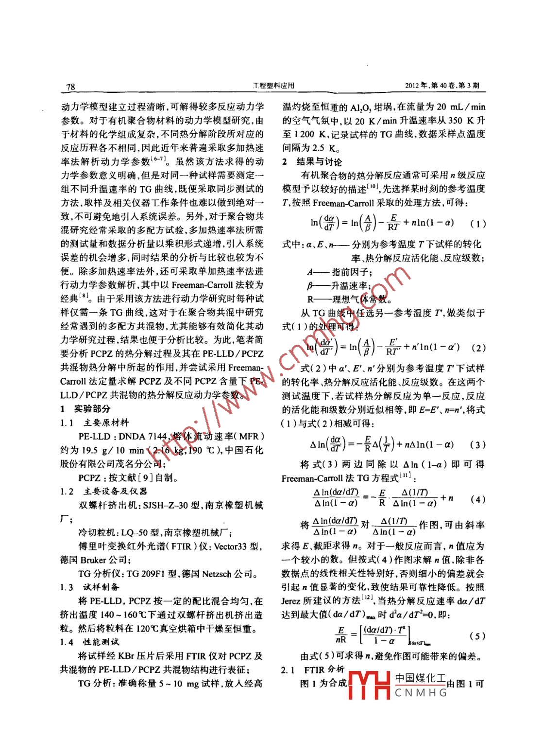 第40卷,第3期T程塑料應(yīng)用VoL 40. No. 32012年5力ENGINEERING PLASTICS APPLICATION201277doi:10.3969/jsn1001-35392012.03.019苯氧基環(huán)三磷腈及其PE-LLD共混物熱分解反應(yīng)的熱重分析孔祥建',張之鶴2,陳紅3(1成都理大學(xué)材料化學(xué)化工學(xué)院成都61009;2.樂(lè)山師范學(xué)院數(shù)學(xué)與信息科學(xué)學(xué)院樂(lè)山614004;3.四川省科學(xué)技術(shù)信息研究所.成都610016)摘要:將線型低密度聚乙烯(PE-LLD)與苯氧基環(huán)三磷腈(PCPZ)熔融共混,采用熱重(TG)法及 FreemanCarroll法分析了PCPZ及 PE-LLD/PCPZ共混物的熱分解行為。結(jié)果表明,PCPZ對(duì) PE-LLD的熱分解具有催化作用。在PCPZ質(zhì)量分?jǐn)?shù)為0~10%內(nèi),隨PCPZ含量的增加, PE-LLD/PCPZ共混物熱分解反應(yīng)的活化能(E)起始失重溫度(T)、轉(zhuǎn)化率(α)由0增至50%的溫度(T如)熱失重終止溫度(T)α由0增至100%的升溫幅度(ΔT。)、最大熱分解反應(yīng)速率[d/aT)灬]、最大熱分解反應(yīng)速率溫度(r灬)最大熱分解反應(yīng)速率時(shí)的轉(zhuǎn)化率(αn)均下降。同時(shí)分別求解了PCPZ及不同PCPZ含量下PE-LLD/PCPZ共混物的熱分解反應(yīng)動(dòng)力學(xué)參數(shù)(E、反應(yīng)級(jí)數(shù)n、指前因子A)得到了PCPZ阻燃 PE-LLD的機(jī)理。關(guān)鍵詞: Freeman-carroll法;熱重分析;動(dòng)力學(xué)參教;線型低密度聚乙烯;萃氧基環(huán)三磷腈中圖分類(lèi)號(hào):TQ320.2文獻(xiàn)標(biāo)識(shí)碼:A文章編號(hào):1001-3539(2012)03007706Thermogravimetric Analysis on Thermal Decomposition of Phenoxy Cyclotriphosphazene andIts’ PE-LLD BlendKong Xiangjian. Zhang Zhihe, Chen Hong(1. College of Materials, Chemistry and Chemical Engineering. Chengdu University of Technology, Chengdu 610059. China; 2. College ofMathematics and Information Science, Leshan Normal University, Leshan 614000, China: 3. Sichuan Science and Technology InforResearch Institute, Chengdu 610016, ChinaAbstract: Linear low-density polyethylene( PE-LLD )was melt blended with phenoxy cyclotriphosphazene( PCPZ ).Thethermal decomposition behaviors of PCPZ and PE-LLD/PCPZ blends were investigated by thermogravimetric and Freeman-Carrollmethod. The results showed that PCPZ had a catalytic effect on the thermal decomposition of PE-LLD. with the increase of PCpZcontent within 0 to 10% of mass fraction, the thermal decomposition activation energy(E), the onset decomposition temperatureTo), the temperature of the conversion rate( a)reaching 50%( Tso, ) the final decomposition temperature(tr ) the temperaturerange of a raised from 0 to 100%( A T u), the maximum thermal decomposition rate[( da/dT)ma the temperature of themaximum thermal decomposition rate( Tmax), the a of maximum decomposition rate(ama )of PE-LLD/ PCPZ blends decreasedpectively. The thermal decomposition kinetic parameters[E, the reaction order(n)and the pre-exponential factor (A )]of PCPZand PE-LLD/ PCPZ blends were determined respectively and the flame retardant mechanism of PCPZ in PE-LLd was gainedKeywords: Freeman and Carroll method thermogravimetric analysis kinetic parameter; linear low-density polyethylenephenoxy cyclotriphosphazene苯氧基環(huán)三磷腈(PCPZ)是環(huán)狀三聚磷腈的六理具有重要意義。苯氧基取代衍生物,具有獨(dú)特而緊湊的磷、氮交替排熱分解反應(yīng)動(dòng)力學(xué)研究的手段很多2,其中熱列的分子結(jié)構(gòu)。磷腈衍生物由于含有磷、氮等元素,重(TG)分析因其測(cè)試靈敏可靠,成為常見(jiàn)的研究具有類(lèi)似于常見(jiàn)的膨脹阻燃體系所要求的磷氮復(fù)配手段。根據(jù)數(shù)據(jù)處理方式的不同,可將反應(yīng)動(dòng)力學(xué)結(jié)構(gòu),是一類(lèi)頗具發(fā)展前途的無(wú)鹵阻燃劑。但以研究的方法分為模型研究和非模型研究?jī)纱箢?lèi)33往的研究側(cè)重于PCPZ的合成及其對(duì)聚合物力學(xué)性模型研究是根據(jù)預(yù)先設(shè)定的動(dòng)力學(xué)模型,由實(shí)驗(yàn)結(jié)能阻燃性能的影響等方面,鮮有關(guān)于PCPz自身及果擬合出其中的動(dòng)力學(xué)參數(shù)。其特點(diǎn)為直觀、反應(yīng)其線型低密度粲乙烯(PE-LLD)共混物熱分解反應(yīng)聯(lián)系人:孔祥逑,博士講帥,主要從事高分子化學(xué)與物理方面的動(dòng)力學(xué)研究方面的報(bào)道,而這些方聞的研究對(duì)于定研究。中國(guó)煤化工量描述PCPZ及其共混物熱分解行為、探討相關(guān)機(jī)收稿目期:20112HCNMHGT程塑料應(yīng)用2012年,第40卷,第3期動(dòng)力學(xué)模型建立過(guò)程清晰,可解得較多反應(yīng)動(dòng)力學(xué)溫灼燒至恒重的Al2O3坩堝在流量為20mL/min參數(shù)。對(duì)于有機(jī)聚合物材料的動(dòng)力學(xué)模型研究,由的空氣氣氛中,以20K/min升溫速率從350K升于材料的化學(xué)組成復(fù)雜,不同熱分解階段所對(duì)應(yīng)的至1200K,記錄試樣的TG曲線數(shù)據(jù)采樣點(diǎn)溫度反應(yīng)歷程各不相同,因此近年來(lái)普遍采取多加熱速問(wèn)隔為25K率法解析動(dòng)力學(xué)參數(shù)67。雖然該方法求得的動(dòng)2結(jié)果與討論力學(xué)參數(shù)意義明確,但是對(duì)同一種試樣需要測(cè)定有機(jī)聚合物的熱分解反應(yīng)通常可采用n級(jí)反應(yīng)組不同升溫速率的TG曲線既便采取同步測(cè)試的模型予以較好的描述10,先選擇某時(shí)刻的參考溫度方法,取樣及相關(guān)儀器工作條件也難以做到絕對(duì)一T按照 Freeman-Carroll.取的處理方法,可得:致,不可避免地引入系統(tǒng)誤差。另外,對(duì)于聚合物共混