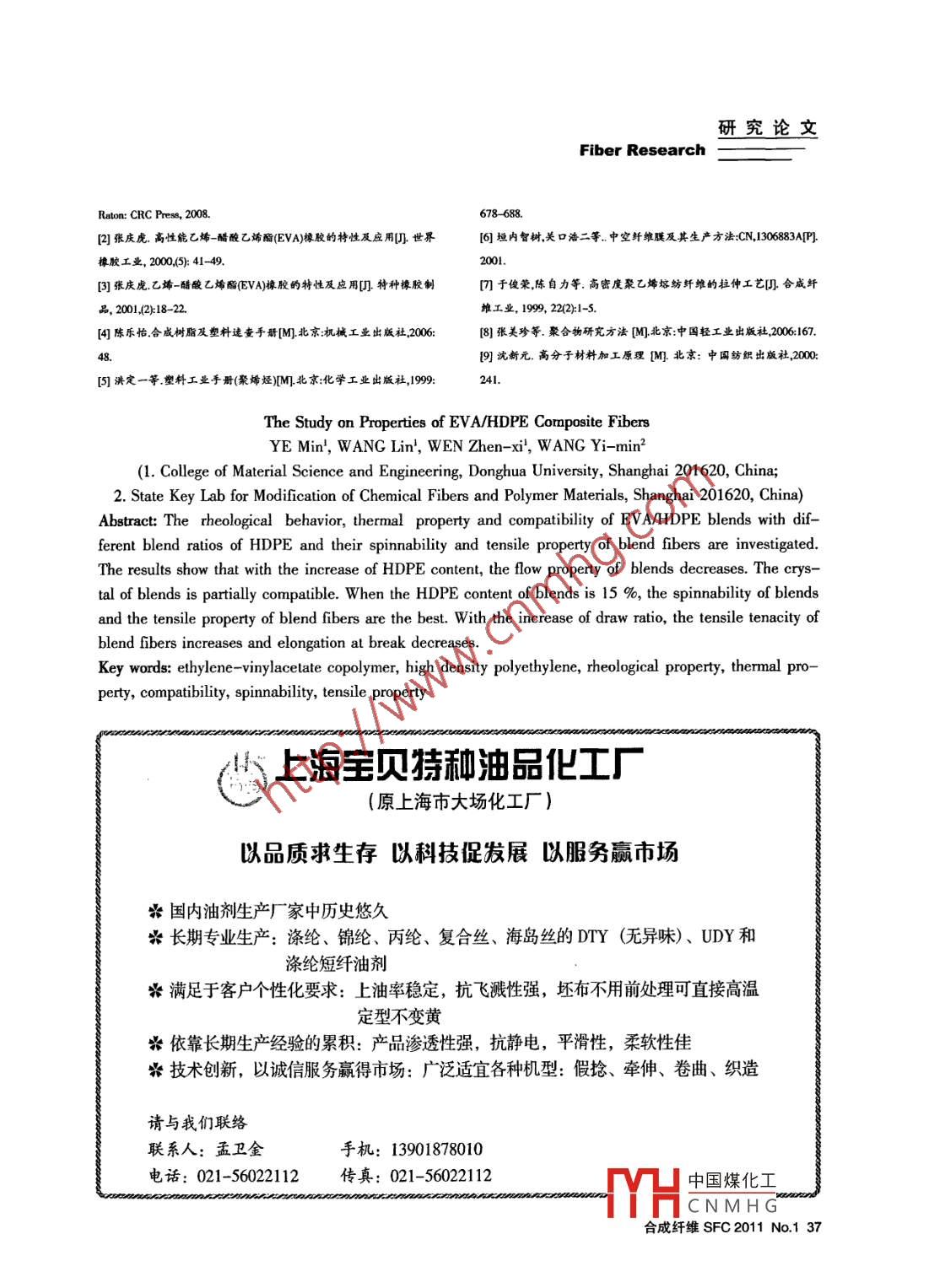 研究論文Fiber Research乙烯~-醋酸乙烯酯共聚物高密度聚乙烯的性能研究葉敏',王琳',文珍稀',王依民2(1.東華大學(xué)材料科學(xué)與工程學(xué)院,上海201620;2.纖維材料改性國家重點(diǎn)實(shí)驗(yàn)室,上海201620)摘要:討論了不同高密度聚乙烯(HDPE) 含量的乙烯-醋酸乙烯酯共聚物(EVA) /HDPE 共混物的流變性能、熱性能、相容性,以及共混纖維的可紡性、力學(xué)性能。實(shí)驗(yàn)結(jié)果表明:隨著HDPE含量的增加,共混物的流動(dòng)性變差;共混物的晶區(qū)是部分相容的。當(dāng)共混物中HDPE的百分含量為15 %時(shí),共混物的可紡性及共混纖維的力學(xué)性能最佳;隨著拉伸倍數(shù)的增加,共混纖維斷裂強(qiáng)度增大、斷裂伸長率降低。.關(guān)鍵詞:乙烯醋酸乙烯酯共聚物;高密度聚乙烯;流變性能;熱性能;相容性;可紡性;力學(xué)性能中圖分類號(hào): TQ342.61文獻(xiàn)標(biāo)識(shí)碼: A文章編號(hào): 1001-7054 (2011) 01-0033-05乙烯-醋酸乙烯酯共聚物(Ethylene -vinylac-俊榮等刃采用螺桿擠出熔融紡高密度聚乙烯,然etate copolymer,簡稱EVA)是由乙烯和醋酸乙烯后進(jìn)行高倍熱拉伸紡制中強(qiáng)聚乙烯纖維,隨著拉伸酯單體無規(guī)嵌段共聚而成,根據(jù)醋酸乙烯酯(VA)倍數(shù)的提高,纖維的斷裂強(qiáng)度提高,最高強(qiáng)度可達(dá)含量不同,聚合方法也不同。當(dāng)VA質(zhì)量含量低于8~10 cN/dtex,而纖維的斷裂伸長則隨拉伸倍數(shù)的40 %時(shí),采用高壓本體聚合;當(dāng)VA含量大于提高呈下降趨勢(shì)。40%小于80%時(shí),多采用中壓溶液聚合;當(dāng)VA本實(shí)驗(yàn)采用EVA/HDPE共混造粒及熔融紡絲,含量高于80 %時(shí),一般采用中壓乳液聚合(3。選擇HDPE主要是因?yàn)榭梢栽谔岣吖不炖w維的強(qiáng)度EVA具有優(yōu)良的柔韌性、彈性、透明性、黏著性、的同時(shí)兼顧到EVA的低熔點(diǎn)。EVA的熔點(diǎn)為70 C耐候性、耐化學(xué)藥品性、與填料和色母粒的相容左右,熔融紡絲溫度比- -般的高聚物要低得多,如性,可以通過注塑、擠塑、吹塑、涂覆、熱封等成果共混其它高聚物如PET、PP,則要求紡絲溫度遠(yuǎn)形加工,廣泛應(yīng)用于制鞋、農(nóng)膜、共混改性、汽車遠(yuǎn)高于EVA的紡絲溫度,這樣共混物的熔融紡絲工業(yè)和造紙等方面145。 但是EVA用于紡制纖維產(chǎn)的加工可行性低。品仍然很少,因?yàn)镋VA的纖維強(qiáng)度等指標(biāo)很低,本研究的目的是利用EVA低熔點(diǎn)及EVA對(duì)- -目前基本只有利用EVA聚合物制成的中空纖維膜些油性芳香物質(zhì)(如柏樹精油)基本可完全吸收,已廣泛用于醫(yī)療目的的各種分離膜,其在生物相容可進(jìn)一步研制其它智能溫控型、芳香型等功能纖性和化學(xué)穩(wěn)定性上極佳,并且洗脫物質(zhì)非常少,代維。如紡制智能溫控皮芯復(fù)合結(jié)構(gòu)纖維,其芯層為表性用途有血液透析過濾膜!@。低溫相變材料,由于低溫相變材料通常熔點(diǎn)和分解高密度聚乙烯(HDPE) 加工性能好,具有良點(diǎn)都較低,皮層材料的熔融紡絲溫度也要較低才能好的化學(xué)穩(wěn)定性,耐酸、堿、鹽等的腐蝕,質(zhì)量與之匹配,以防止在紡絲過程中芯層相變材料因溫輕,強(qiáng)度、模量高,已經(jīng)被應(yīng)用于紡織領(lǐng)域。于度過高而分解。有關(guān)研究將另作報(bào)道。收稿日期: 2010-10-121實(shí)驗(yàn)作者簡介:葉敏(1983-), 女,漢族,碩士研究生,研究方向?yàn)楹嘧儾牧系钠ば緩?fù)合結(jié)構(gòu)纖雛。中國煤化工MHCNMHG合成纖維SFC2011 No.1 33研究論文Fiber Research1.1 主要原材料乙烯-醋酸乙烯酯共聚樹脂(EVA 樹脂): VA2結(jié)果與討論含量28 %,熔融指數(shù)150 g/10 min,密度095 gcm',2.1不同HDPE含量對(duì)EVA/HDPE共混物流變性上?;ぱ芯吭?高密度聚乙烯(HDPE) 樹脂:能的影響密度0.941~0.960 g/cm',牌號(hào)2911FS,中國石油撫聚合物材料熔融態(tài)時(shí)的流變性能直接影響其順石化分公司;抗氧劑1010:工業(yè)級(jí),上海中山加工性能。高分子液體與小分子液體相比,最明顯化工市場(chǎng)。的區(qū)別是高分子具有黏彈性。高分子非牛頓黏彈性1.2共混物、共混纖維的制備產(chǎn)生于其分子鏈松弛動(dòng)力學(xué)滯后性。正是因?yàn)楦叻?1)真空干燥EVA, 30°C1h, 35C1h, 40C .子的本體黏彈性和本構(gòu)性質(zhì)直接支配聚合物的加工1h, 45°C1h, 52 C2.5h, 58C 11 h;真空干燥行為,所以高聚物加工的-個(gè)中心任務(wù)就是要對(duì)高HDPE,102.5C 16h。分子的流變行為取得根本的認(rèn)識(shí)和了解。(2)雙螺桿共混擠出機(jī)(TSE -18A,南京瑞亞高聚物的流變行為由黏度來表征。牛頓流體聚合物公司),I 區(qū)加熱溫度75 C,I區(qū)加熱溫度的黏度只與溫度有關(guān),高聚物大多數(shù)不是牛頓流100 C,I區(qū)加熱溫度130 C, IV 區(qū)加熱溫度150體,其黏度不僅與溫度有關(guān),還依賴于剪切速率。C,V區(qū)加熱溫度150 C,機(jī)頭加熱溫度135 C。圖1和圖2是不同HDPE含量的EVA/HDPE共混將按比例共混好的EVA、HDPE 和抗氧劑共混擠物熔體的應(yīng)力~剪切速率及表觀黏度~剪切速率流出,然后經(jīng)造粒機(jī)造粒。變曲線。(3)將(2)制備的共混粒料加入到雙螺桿熔融紡絲機(jī)(自制) 中進(jìn)行熔觸紡絲。HDPE含量:紡絲機(jī)各部位紡絲條件的設(shè)定:螺桿溫度I0 :巍薯區(qū)123C,I區(qū)145C,川區(qū)147C,IV區(qū)147品44C,V區(qū)145 C,計(jì)量泵溫度147 C,螺桿頻率42-