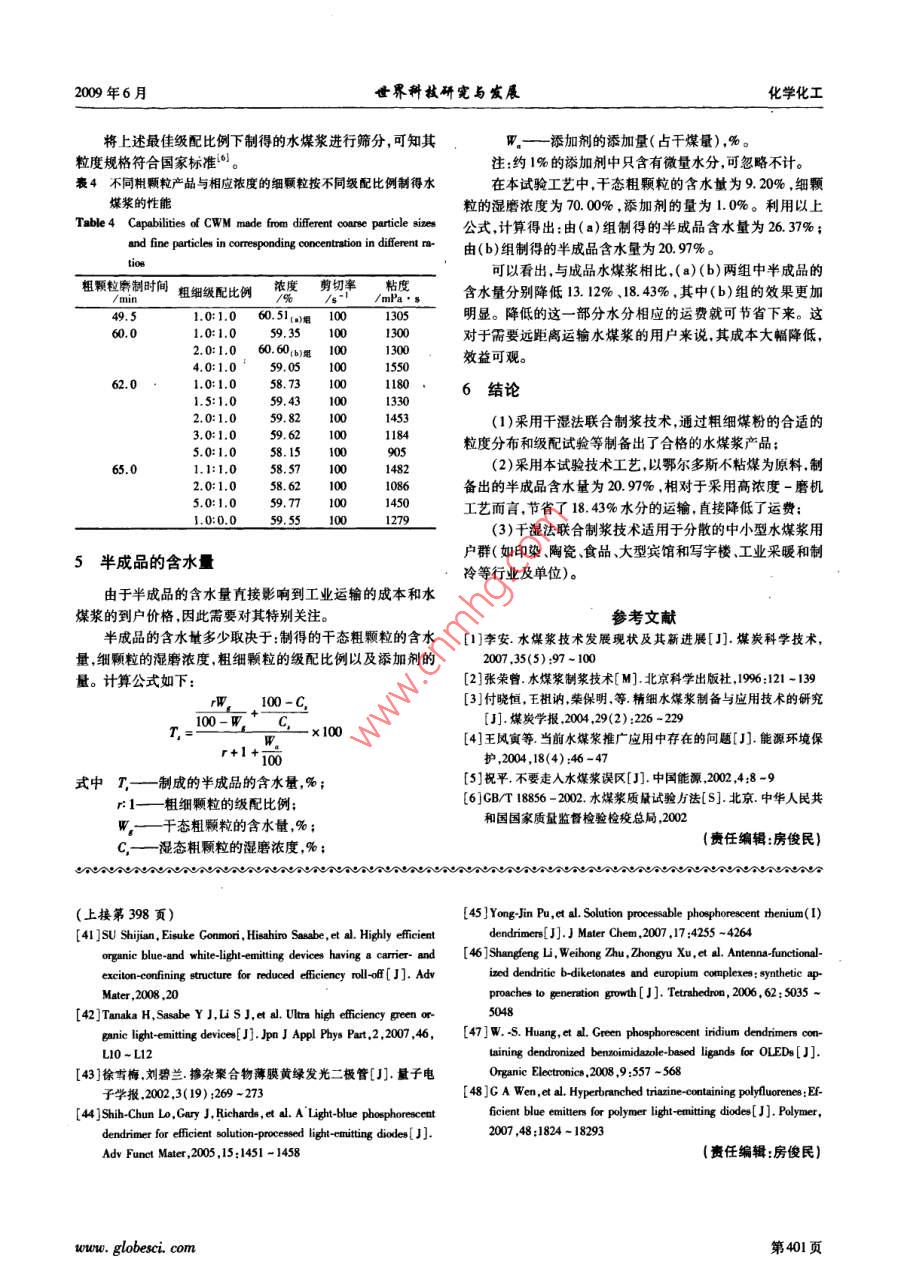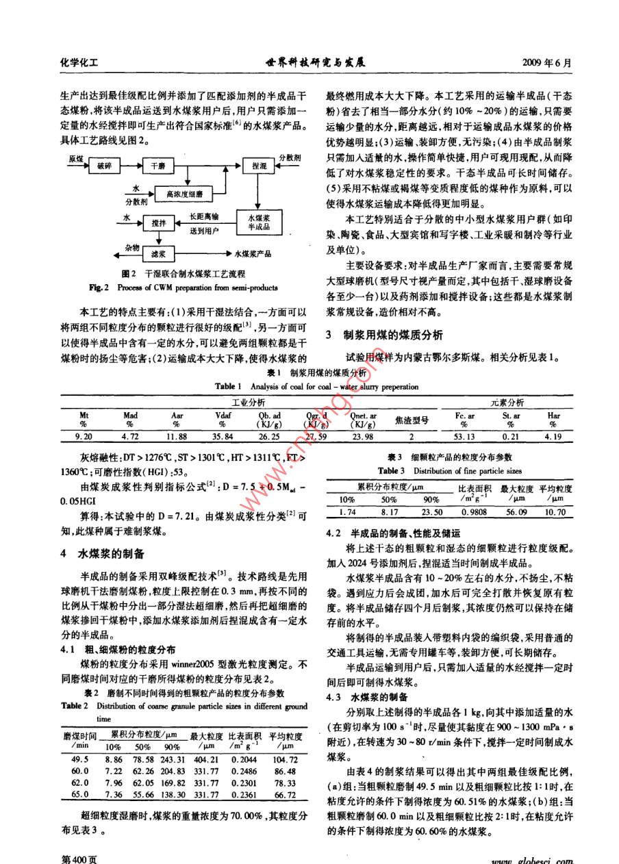 第31第3期世界科技研完與發(fā)展Vol, 31 No. 32000年6月399-401頁(yè)WORLD SCI-TECH R&DJumn.2009p.399401干濕法聯(lián)合制備水煤漿技術(shù)的研究田達(dá)理付曉恒丁亞文王福順(中國(guó)礦業(yè)大學(xué)(北京)化學(xué)與環(huán)境廠程學(xué)院,北京100083)摘要:針對(duì)國(guó)內(nèi)當(dāng)前水煤漿生產(chǎn)和銷(xiāo)售實(shí)際情況,為給遠(yuǎn)離水煤漿廠且自身不具備建廠能力的眾多中小型水煤漿用戶群和原煤產(chǎn)地間提供一條切實(shí)可行的工藝途徑,提出將干濕法聯(lián)合制漿工藝應(yīng)用到工業(yè)生產(chǎn)的可行性。本文以內(nèi)蒙古鄂爾多斯煤(不粘煤)為原料,在此工藝方法下確立了合適于制漿用煤的級(jí)配比例和相應(yīng)的藥劑用量,大幅度降低了水媒漿的遠(yuǎn)輸成本,并得到了最佳煤粉級(jí)配比例。關(guān)鍵詞:千濕法聯(lián)合制備;水煤漿;中小型用戶中圖分類(lèi)號(hào):TQ536文獻(xiàn)標(biāo)識(shí)碼:AStudy of Technology of Coal-water Slurry Preparation from Wet and Dry PowdersTIAN DaH FU Xiaoheng DING Yawen WANG Fushun( School of Chemical and Environment Engineering, China University of Mining and Technology Beijing), Beijing 100083)Abstract: In view of the current coal-water slurry production and marketing of the actual situation, and in order to supply a feasible approachfor numerous small and middie-gized consumers, which are far away from coal-water slurry factories and have no enough ability to constructnew factories, it is feasible to apply wet and dry powders mixing process into industrial production. Using Erdos coal( BN) in Inner Mongoliaas raw materials in the process, a suitable ratio with different particle distribution and reasonable additives are established. By this methodsport costs of the coal-water slurry could be reduced obviously and the best ratio of coal powders would appearKey words: wet and dry powders mixing process; coal-water slurry; small and middle-sized consumers引言專(zhuān)用罐車(chē)運(yùn)輸,且一般是單向運(yùn)輸(返回的是空車(chē));(2)添加劑費(fèi)用增加。成品水煤漿一般要長(zhǎng)距離運(yùn)輸,加上在制漿水煤漿是70年代石油危機(jī)中發(fā)展起來(lái)的一種新型煤基廠和終端用戶處都要采用儲(chǔ)罐較長(zhǎng)時(shí)間地儲(chǔ)存,所以對(duì)水煤流體潔凈燃料。它是由60-70%的煤粉、30~40%的水和少漿的穩(wěn)定性要求很高故必須添加穩(wěn)定劑;(3)在水煤漿儲(chǔ)罐量化學(xué)添加劑組成的混合體,約2t或2.5t普通水煤漿代替中一般都要設(shè)置攪拌機(jī)構(gòu)避免發(fā)生沉淀;(4)在嚴(yán)冬季節(jié),1t重油。因水煤漿具有良好的流動(dòng)性和穩(wěn)定性,可以象油水煤漿儲(chǔ)罐要設(shè)置防凍設(shè)施避免儲(chǔ)罐和管道中的水煤漿凍一樣實(shí)現(xiàn)全密封儲(chǔ)運(yùn)和高效率的霧化燃燒。我國(guó)的實(shí)踐已結(jié):(5)成品水煤漿在儲(chǔ)運(yùn)過(guò)程中很容易由于密封不嚴(yán)與空經(jīng)表明燃用水煤漿與燃煤相比,可提高燃燒效率,減少對(duì)環(huán)氣接觸,造成水煤漿的千燥結(jié)塊現(xiàn)象,堵塞過(guò)濾裝置甚至堵境的污染;與燃油相比,可取得顯著的經(jīng)濟(jì)效益1塞噴槍。水煤漿制漿工藝主要有濕法制漿、干法制漿以及干濕法現(xiàn)有的水煤漿工業(yè)制備技術(shù)存在以上不足,限制了此項(xiàng)聯(lián)合制漿等工藝。另外還有我國(guó)獨(dú)創(chuàng)的利用浮選精煤制漿技術(shù)的推廣和使用尤其是限制了其在中、小型用戶群中的或煤泥制漿等。目前國(guó)內(nèi)水煤漿廠的制漿工藝除北京制漿使用。廠和充日制漿廠外幾乎全部釆用濕式球磨制漿工藝?;?干濕聯(lián)合制水煤漿工藝本路線如圖1所示。2.1研究背景水添加劑由于水煤漿不宜大量長(zhǎng)距離運(yùn)輸(大于150km時(shí)價(jià)格高濃度磨礦不合算),一些確實(shí)需用水煤漿的單位在試燒成功后均會(huì)考慮就地制漿5。但是,相對(duì)于遠(yuǎn)離水煤漿廠且沒(méi)有自建水穩(wěn)定劑一煤漿廠能力的眾多星散中小型用戶而言,還沒(méi)有成本低、生產(chǎn)便利的技術(shù)滿足這一市場(chǎng)的大量需求。以我國(guó)現(xiàn)有的情濾漿→雜物況來(lái)看,這些單位多在南方或者沿海的一些大中城市為了達(dá)到環(huán)保要求城市嚴(yán)格限制燃煤,加上現(xiàn)有的設(shè)備和資金水煤漿產(chǎn)品條件等因素,這些用戶只能燃用水煤漿。但我國(guó)的煤炭產(chǎn)地圖1高濃度-磨機(jī)制漿工藝流程2大部分是在北方這使得這些用戶離水煤漿廠距離很遠(yuǎn),大Fig. 1 Process of CWM preparation by one wet ball mill in high con型水煤漿廠建廠時(shí)沒(méi)有考慮這些星散用戶的需求,遠(yuǎn)距離產(chǎn)centration (2生的高運(yùn)輸成本(往往占到到戶價(jià)格的一半甚至還多)使這目前廠家大都是將成品水煤漿先用泵送入儲(chǔ)罐再用專(zhuān)部分用戶的燃用成本大大提高。用罐車(chē)或輪船盛裝送往用戶,到達(dá)用戶處再卸入儲(chǔ)罐中儲(chǔ)存2.2本試驗(yàn)工藝的路線、主要特點(diǎn)及適用范圍待用。其不足之處在于:(1)運(yùn)費(fèi)高。一方面水煤漿產(chǎn)品含本試驗(yàn)基于以上現(xiàn)狀而提出。此法以干濕法聯(lián)合制漿有30~40%左右的水分,運(yùn)輸重量增加;另一方面必須采用工藝為基礎(chǔ)以鄂爾多斯不粘煤為原料,先在原煤所在地www.globesci第399頁(yè)化學(xué)化工世界科技研完與發(fā)