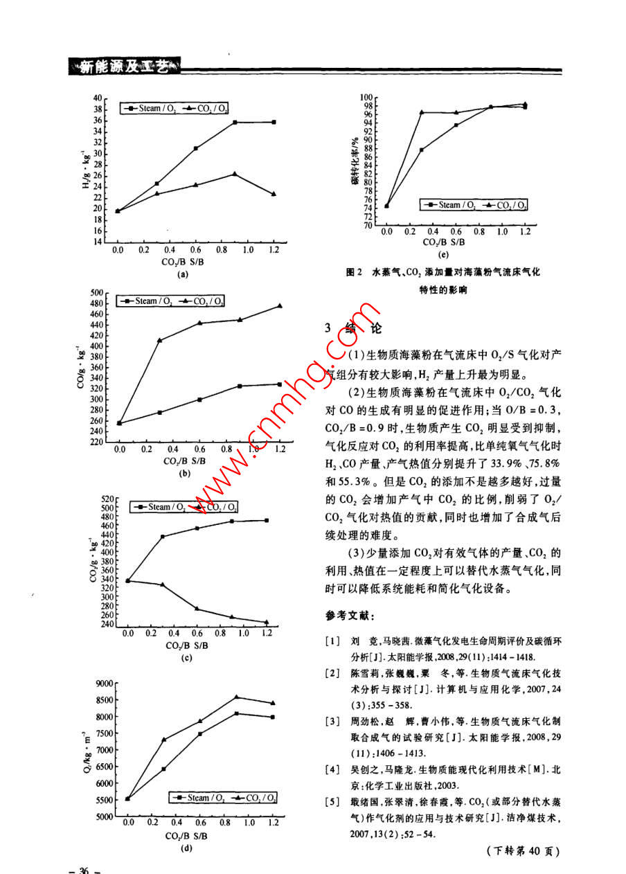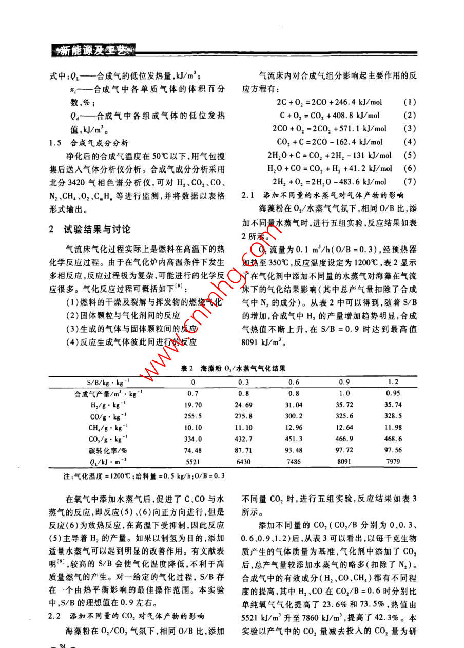 新能源及王藝不同氣化劑下海藻粉在氣流床下氣氣化特性試驗(yàn)研究梅勤峰,周勁松,陳青,劉炳俊 ,駱仲泱(浙江大學(xué)能源清潔利用國(guó)家重點(diǎn)實(shí)驗(yàn)室,浙江杭州310027)摘要:為考察02/水蒸氣和02/CO2作為氣化劑對(duì)海藻粉氣化特性的影響,在自制的小型生物質(zhì)氣流床氣化爐上開(kāi)展海藻粉在氣流床下氣化特性試驗(yàn)研究。當(dāng)氧氣/生物質(zhì)比(0/B)為 0.3、氣化溫度為1200C時(shí)。不同水蒸氣/生物質(zhì)比(S/B=0~1.2)對(duì)合成氣組成有較大影響,其中H,產(chǎn)量的上升趨勢(shì)最為明顯,S/B=1.2時(shí)比單純氧氣氣化提高了81.4%。而在0,/C0,氣化條件下,由生物質(zhì)產(chǎn)生的CO,隨二氧化碳/生物質(zhì)比(CO2/B)的增加而下降,當(dāng)CO/B=0.9時(shí),H2、CO的產(chǎn)量分別比單純氧氣氣化提高了33.9%和75.8% ,熱值由5521 kJ/m'上升至8576 kUJ/m’。結(jié)果表明,如果以提高熱值為制取合成氣的目標(biāo)時(shí),添加CO,在一定范圍內(nèi)可以達(dá)到水蒸氣的效果,同時(shí)降低了系統(tǒng)能耗及簡(jiǎn)化了氣化設(shè)備。關(guān)鍵詞:生物質(zhì);氣流床氣化;CO2中圖分類號(hào):TK6文獻(xiàn)標(biāo)識(shí)碼:A .文章編號(hào):1004 - 3950( 2010)03 - 0032 -05Experimental study on the effect of different gasification agents onseaweed powder gasification in an entrained flow gasifierMEI Qin-feng, ZHOU Jin-ong, CHEN Qing, et al(State Key Laboratory of Clean Energy Utilization , Zhejiang University, Hangzhou 310027,China)Abstract: The influences of 02/CO2 and 02/Steam as diferent gasification agents on the characteristics of seaweedpowder gaifcation in a bench-scale entrained flow gasifier were studied. Different ratios of steam/ biomass had eeeteson the gas composition: H, content increased obviously, which were improved by 81.4% with S/B= 1.2. The contentof CO2 produced from biomass was reduced with the increasing of the ratio of co2/biomass. Compared with oxygen gas-ification, H, and CO contents were improved by 33. 9% and 75. 8% respectively. The heating value inereased from5521 kJ/m' to 8576 kJ/m' . The resultse indieated that the addition of CO2 can achieve the efeet of steam to some ex-tent aimed at the heating value of syngas, while reducing the energy consumption and Bimplifying the gasification equip-ments.Key words: biomass; entrained-flow gasification; CO2氣化爐,其氣化溫度均小于1000C,致使氣化爐0引言產(chǎn)出的粗煤氣中或多或少含有焦油。焦油的存在藻類與其他生物質(zhì)(如木質(zhì)纖維素材料)相對(duì)于熱解氣化過(guò)程以及相關(guān)的設(shè)備都有較大的危比,具有光合作用效率高、環(huán)境適應(yīng)能力強(qiáng)、生長(zhǎng)害]。而氣流床具有原料適應(yīng)性強(qiáng)、反應(yīng)溫度周期短、生物產(chǎn)量高的特點(diǎn),同時(shí)藻類在水中生高、氣化強(qiáng)度大、合成氣中有效成分高且不含焦油長(zhǎng),不占用農(nóng)業(yè)用地,因此微藻引起了很多研究者等特點(diǎn),已在煤氣化中得到工業(yè)化應(yīng)用,而生物質(zhì)的注意",本實(shí)驗(yàn)選擇海藻作為氣化原料。氣流床氣化國(guó)內(nèi)外尚處在研究階段鬥。在氣化生物質(zhì)氣化的主體是生物質(zhì)氣化爐,目前主劑的選擇上,有空氣氣化、水蒸氣氣化、O2/水蒸要應(yīng)用的生物質(zhì)氣化爐包括固定床氣化爐和流化氣氣化及富氧氣化”,各有特點(diǎn)。床氣化爐兩種類型。但無(wú)論是流化床還是固定床氣化劑中用CO2取代水蒸氣作氣化劑,或者收稿日期:2009-12-23基金項(xiàng)目:國(guó)家重點(diǎn)基礎(chǔ)研究發(fā)展(973)計(jì)劃資助項(xiàng)目(2007CB210208);國(guó)家自然科學(xué)基金資助項(xiàng)目(90610035)作者簡(jiǎn)介:梅勤峰(1981-).男,浙江嘉興人,碩士研究生.從事生物質(zhì)氣化研究。新能源及玉藝加入CO,替代部分水蒸氣作氣化劑,生產(chǎn)出的高料方式,即生物質(zhì)在載氣(N2)輸送下,由爐頂螺純Co或者具有不同組成的合成氣,可滿足不同旋給料機(jī),定量送人原料噴嘴,與經(jīng)氣化劑預(yù)熱器合成氣用途的需要。在這個(gè)技術(shù)領(lǐng)域的應(yīng)用與研的氣化劑(02、02 +水蒸氣或O2 +CO2)混合,在究中,國(guó)外報(bào)道的資料較少,國(guó)內(nèi)近幾年研究的進(jìn)爐膛內(nèi)進(jìn)行氣化反應(yīng)。氣化產(chǎn)生的合成氣經(jīng)爐膛展較快']。底部激冷室冷卻后,經(jīng)旋風(fēng)分離器和水洗過(guò)濾器目前生物質(zhì)CO2氣化的大部分研究主要關(guān)等裝置,灰渣由爐膛底部的排渣室和除塵器底部于對(duì)熱解產(chǎn)物的氣化6] ,張德厚”等以焦炭為原收集裝置收集。料,02和CO2為氣化劑,在固定床氣化爐內(nèi)高溫1.2 實(shí)驗(yàn)原料連續(xù)氣化,制取含CO約70%的粗CO氣。而直實(shí)驗(yàn)原料為海藻粉,粒度為80~100目,其工接利用CO2作為氣化劑在氣化爐內(nèi)對(duì)生物質(zhì)進(jìn)業(yè)分析和元素分析如表1所示。行熱解氣化制備可燃?xì)獾难芯可刑幤鸩诫A段。本文介紹在自制的實(shí)驗(yàn)室規(guī)模(0.5 kg/h)的沉降式氣化裝置上,研究在特定工況下(氧氣生物質(zhì)比為0.3、氣化溫度為1200C),對(duì)O2/水蒸氣和02/CO2作為氣化劑在氣流床內(nèi)對(duì)海藻粉進(jìn)行氣化,研究氣流床條件下添加CO2氣化的可行性。1實(shí)驗(yàn)1.1 實(shí)驗(yàn)裝置自制的常壓下生物質(zhì)氣流床氣化實(shí)驗(yàn)臺(tái)主要由給料系統(tǒng)、氣化劑預(yù)熱器、沉降式氣化爐,