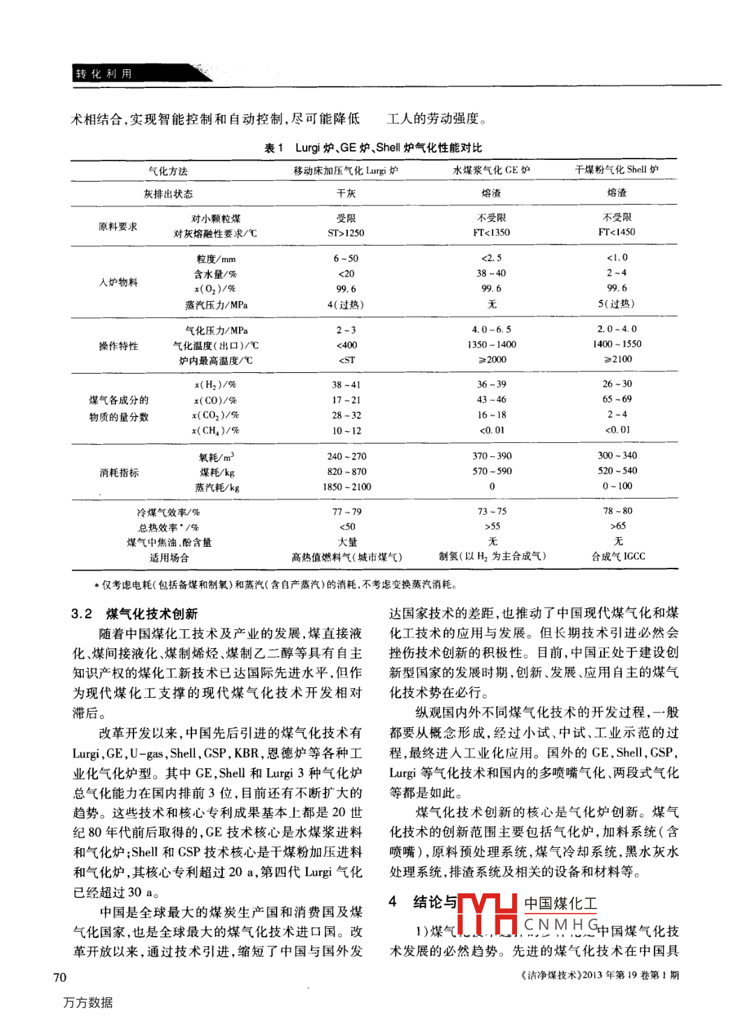 轉(zhuǎn)化利用中國(guó)科技核心期刊礦業(yè)類核心期刊煤氣化技術(shù)的應(yīng)用與發(fā)服高聚忠(中國(guó)神華煤制油化工有限公司,北京100011)摘要:介紹了國(guó)內(nèi)外煤氣化技術(shù)的發(fā)展概況和發(fā)展趨勢(shì),重點(diǎn)對(duì)幾種典型煤氣化技術(shù)的應(yīng)用與發(fā)展進(jìn)行了研究,并對(duì)Iugi爐、BCL爐、GE氣化爐、多噴嘴爐、清華爐、Shel爐、GSP爐、兩段爐、航天爐等典型煤氣化爐的結(jié)構(gòu)、性能進(jìn)行了對(duì)比分析。從8個(gè)方面分析了煤氣化技術(shù)的選擇需要注意的問題。提岀了煤氣化技術(shù)創(chuàng)新建議,指岀未來煤炭的淸潔高效轉(zhuǎn)化利用將以大型、先進(jìn)的煤氣化技術(shù)為核心,以電、化、熱等多聯(lián)產(chǎn)為方向進(jìn)行技術(shù)集成。關(guān)鍵詞:煤氣化;氣化爐;工藝過程;技術(shù)選擇;發(fā)展趨勢(shì)中圖分類號(hào):TQ546文獻(xiàn)標(biāo)識(shí)碼:A文章編號(hào):1006-6772(2013)01-0065-07Application and development of coal gasification technologiesGAO Ju-zhongChina Shenhua Coal to Liquid and Chemical Co., Lad., Beijing 100011, China)Abstract: Emphasize some typical coal gasification technologies at home and abroad. Compare the structure, characteristics of Lurgi gasifier, BGL gasifier, GE gasification fumace, multi-nozzle gasifier, Tsinghua gasifier, Shellgasifier, GSP gasifier, two-stage gasifier and dry coal pressurized gasifier. Give some innovative suggestions for thechoice of coal gasification technologies. In the future, the core of the clean and efficient coal conversion is largescale and advanced technologies, which must integrate the electrical, chemical and thermal technologiesKey words: coal gasification; gasifier; technological process; technologies choice; development tendency2011年,中國(guó)原煤產(chǎn)量35.2億t,商品煤消費(fèi)補(bǔ)中國(guó)硫資源短缺現(xiàn)狀,同時(shí)利于實(shí)施CO2捕集量36.8億t,分別占一次能源生產(chǎn)和消費(fèi)總量的利用、貯存等78%和70%。實(shí)現(xiàn)煤炭的清潔高效轉(zhuǎn)化越來越受到關(guān)注。國(guó)家的有關(guān)能源政策傾向于支持使煤炭1煤氣化技術(shù)發(fā)展趨勢(shì)得到清潔利用的技術(shù),煤氣化是煤炭潔凈利用的重1.1國(guó)外煤氣化技術(shù)發(fā)展要方面。國(guó)外煤氣化技術(shù)的發(fā)展最早可追溯到1780年2中國(guó)煤的氣化轉(zhuǎn)化利用率較低,2010年氣化煤早期的煤氣化技術(shù)主要是以生產(chǎn)燃料氣為主。移用量約1.1億t,約占全國(guó)煤炭消費(fèi)總量的3.5%,動(dòng)床氣化是最早發(fā)展的煤氣化技術(shù),以塊煤為原主要用于合成氨、合成甲醇和新型煤化工生產(chǎn)。煤料,以空氣、水蒸氣為氣化劑,固態(tài)排渣,生產(chǎn)發(fā)生氣化過程中SO2,NO,和總懸浮顆粒物等的排放均爐煤氣。1880年德國(guó)設(shè)計(jì)了世界上第一臺(tái)常壓移在煤炭燃燒利用排放量的5%以下,并可回收硫,彌動(dòng)床空氣間歇?dú)饣癄t,1913年被美國(guó)氣體公司改革中國(guó)煤化工收稿日期:2012-10-26責(zé)任編輯:宮在芹CNMHG作者簡(jiǎn)介高聚忠(1964-)男河北高邑人高級(jí)工程師長(zhǎng)期從事煤氣化及煤化工技術(shù)廾友時(shí)⊥作。引用格式:高聚忠煤氣化技術(shù)的應(yīng)用與發(fā)展[刀潔凈煤技術(shù),2013,19(1):65-71高聚忠:煤氣化技術(shù)的應(yīng)用與發(fā)展成UGI爐。UGI爐是以焦炭為原料,用間歇?dú)饣普苟鄧娮焖簼{加壓氣化和二段式干煤粉加壓技水煤氣或半水煤氣。第一次世界大戰(zhàn)后,隨著甲術(shù)攻關(guān),目前,這幾項(xiàng)氣化技術(shù)均已進(jìn)入工業(yè)化應(yīng)醇、合成氨、F-T合成等為代表的合成化學(xué)工業(yè)的發(fā)用階段展,為了滿足合成原料氣的需要,1926年第一代流目前,移動(dòng)床常壓氣化UGI氣化爐在中國(guó)仍是化床 Winkler氣化爐實(shí)現(xiàn)工業(yè)化應(yīng)用。隨著工業(yè)制主力爐型,用于生產(chǎn)合成氣或燃料氣。移動(dòng)床加壓氧技術(shù)的成功,又發(fā)展了新的用氧氣氣化的技術(shù)。氣化 Lurgi爐在劣質(zhì)煤氣化方面占有一定市場(chǎng)。隨1939年移動(dòng)床加壓氣化Lugi爐實(shí)現(xiàn)工業(yè)化應(yīng)用。著中國(guó)現(xiàn)代煤化工的發(fā)展,水煤漿加壓氣化(CE1952年第一代氣流床氣化K-T爐實(shí)現(xiàn)工業(yè)化應(yīng)用。爐、多噴嘴爐)和干煤粉加壓氣化(Shel!爐、GSP、二20世紀(jì)30—50年代,國(guó)外煤氣化技術(shù)取得了很大段爐、航天爐)已成為主要選擇。的成就。20世紀(jì)50年代以后,隨著石油和天然氣1.3現(xiàn)代煤氣化技術(shù)發(fā)展方向工業(yè)的發(fā)展,常壓固定床氣化爐在國(guó)外逐漸被淘1)加壓氣化:提高壓力有利于提高氣化爐的生汰,其它煤氣化技術(shù)的發(fā)展也基本處于停滯產(chǎn)能力,同時(shí)大大減少氣體凈化的投資,并降低壓狀態(tài)??s耗能。現(xiàn)代煤氣化技術(shù)的發(fā)展得益于石油危機(jī)。第2)高溫氣化:使煤中的揮發(fā)分和可燃組分充分次石油危機(jī)時(shí),發(fā)達(dá)國(guó)家出于對(duì)石油、天然氣供轉(zhuǎn)化,其它組分也在高溫下得到鈍化,得到的產(chǎn)品應(yīng)前景的預(yù)測(cè),把發(fā)展煤氣化技術(shù)作為替代石油天煤氣較純凈,三廢問題少。然氣的重要手段,加快了現(xiàn)代煤氣化的開發(fā)。20世3)粉煤氣化:通過增大煤的比表面積提高氣
