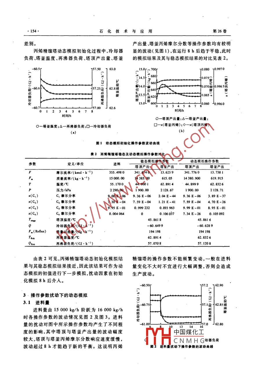 第26卷第2期石化技術(shù)與應(yīng)用2008年3月Petrochemical Technology& Application工業(yè)技術(shù)(153~157)丙烯精餾塔動(dòng)態(tài)模擬孫衛(wèi)國(guó),伏妍,李潔,高陽光,蘭其盈(中國(guó)石油蘭州化工研究中心,甘肅蘭州730060)摘要:利用 Aspen Dynamics軟件對(duì)丙烯精餾塔的操作進(jìn)行了動(dòng)態(tài)模擬。結(jié)果表明,無論是進(jìn)料量進(jìn)料組成還是回流量擾動(dòng)均對(duì)操作產(chǎn)生較大影響,主要體現(xiàn)在塔釜溫度、冷卻器負(fù)荷、再沸器負(fù)荷、塔頂及塔釜丙烯摩爾分?jǐn)?shù)和產(chǎn)出量的波動(dòng)上,尤其是塔頂及塔釜產(chǎn)出量不僅波動(dòng)大,而且響應(yīng)迅速,塔頂及塔釜丙烯摩爾分?jǐn)?shù)的響應(yīng)速度緩慢,波動(dòng)持續(xù)時(shí)間超過8h;儀表調(diào)節(jié)規(guī)律對(duì)動(dòng)態(tài)特性具有重要的影響。關(guān)鍵詞:丙烯精餾塔; Aspen Dynamics軟件;動(dòng)態(tài)模擬;進(jìn)料量;塔釜溫度;回流量;積分調(diào)節(jié)中圖分類號(hào):TQ221.212;TQ01.81文獻(xiàn)標(biāo)識(shí)碼:B文章編號(hào):00-0045(2006)02-0153-05中國(guó)石油蘭州石化分公司烯烴裝置所用裂擬的基礎(chǔ)上直接轉(zhuǎn)換,不需要專門為動(dòng)態(tài)流程模解原料有十幾種之多,不同原料間切換頻繁,造擬進(jìn)行大量的設(shè)置。動(dòng)態(tài)模擬以原料進(jìn)料量為成丙烯裝置進(jìn)料組成波動(dòng)較大,另外裂解爐的15000kg/h,其所含丙烷摩爾分?jǐn)?shù)為3.4456%清焦處理也造成丙烯進(jìn)料量的波動(dòng),這些波動(dòng)時(shí)的丙烯精餾塔穩(wěn)態(tài)模擬結(jié)果為基礎(chǔ)進(jìn)行轉(zhuǎn)換,均增大了丙烯精餾裝置的操作難度。為保證丙建立動(dòng)態(tài)模擬流程。動(dòng)態(tài)模擬中儀表的調(diào)節(jié)均烯精餾塔塔頂產(chǎn)品質(zhì)量合格,塔釜丙烯經(jīng)常出采用比例調(diào)節(jié),比例度設(shè)為100%。丙烯精餾塔現(xiàn)損失過大的情況。另外,丙烯精餾塔循環(huán)水回流罐及再沸器尺寸見表l?!阌昧空枷N裝置循環(huán)水總用量的60%(質(zhì)量分豪1回流及再沸番尺寸參數(shù)數(shù)),能耗較高。筆者利用 Aspen Dynamics模擬項(xiàng)目回流罐再沸器1再沸器2再沸器3軟件對(duì)丙烯精餾塔進(jìn)行了動(dòng)態(tài)模擬,研究了該直徑/m2.0001.836L.800塔進(jìn)料量、進(jìn)料組成、回流量等操作因素?cái)_動(dòng)下長(zhǎng)度/m4.90010.1597.5007.240的動(dòng)態(tài)特性,用于指導(dǎo)裝置的運(yùn)行,節(jié)約了能源,并為裝置今后的改造和實(shí)現(xiàn)先進(jìn)控制提供了基礎(chǔ)數(shù)據(jù)。2動(dòng)態(tài)模擬初始化目前,國(guó)內(nèi)對(duì)于精餾過程動(dòng)態(tài)模擬的應(yīng)用報(bào)在 Aspen Plus穩(wěn)態(tài)模擬中,對(duì)物料特性、塔道"較少,有專家曾利用HSYS模擬軟件對(duì)的氣液平衡,換熱器管程及殼程溫度分布均采用丙烯分離過程進(jìn)行了動(dòng)態(tài)模擬研究,取得了較好嚴(yán)格模型計(jì)算。但在 Aspen Dynamics動(dòng)態(tài)模擬中若使用嚴(yán)格模型計(jì)算,則模擬計(jì)算量過大,難的效果,但尚未見到利用 Aspen Dynamics模擬軟以實(shí)現(xiàn)動(dòng)態(tài)模擬要求。因此,動(dòng)態(tài)模擬中在求取件對(duì)丙烯精餾塔進(jìn)行動(dòng)態(tài)模擬研究的相關(guān)報(bào)道。上述重要參數(shù)時(shí),均要對(duì)穩(wěn)態(tài)模擬結(jié)果進(jìn)行分段線性化處理,并使用線性化處理后的參數(shù)對(duì)穩(wěn)態(tài)1動(dòng)態(tài)模擬流程丙烯精餾塔流程見文獻(xiàn)[9]。筆者曾利用結(jié)果進(jìn)行初始化,從而得到動(dòng)態(tài)模擬的初值,故Aspen Plus軟件對(duì)丙烯精餾塔進(jìn)行穩(wěn)態(tài)模擬,所而動(dòng)態(tài)模擬的初值與穩(wěn)態(tài)模擬結(jié)果有細(xì)微的得結(jié)果與實(shí)際操作數(shù)據(jù)吻合較好,解決了部分操中國(guó)煤化工作參數(shù)的優(yōu)化問題。利用 Aspen Dynamics軟CNMHG-09-20上國(guó)(y/-),男,百氏勳人,工程碩士,工程件實(shí)現(xiàn)動(dòng)態(tài)過程模擬比較方便,可在穩(wěn)態(tài)流程模。從事化學(xué)工程研究工作。已發(fā)表論文5篇。154石化技術(shù)與應(yīng)用第26卷差別。產(chǎn)出量、塔釜丙烯摩爾分?jǐn)?shù)等操作參數(shù)均有較明丙烯精餾塔動(dòng)態(tài)模擬初始化過程中,冷卻器顯的波動(dòng)(見圖1),在運(yùn)行8h后趨于平穩(wěn),此時(shí)負(fù)荷、塔釜溫度、再沸器負(fù)荷、塔頂產(chǎn)出量、塔釜的模擬結(jié)果及其與穩(wěn)態(tài)模擬結(jié)果的對(duì)比見表2008010.99700.0758000090570062.6時(shí)間/h時(shí)間h一塔頂產(chǎn)出量;△一塔釜產(chǎn)出量一塔釜溫度;Δ一再沸器負(fù)荷;口一冷卻器負(fù)荷口-x(塔釜丙烯);◇一x(塔頂丙烯)圖1動(dòng)態(tài)模擬初始化操作參數(shù)波動(dòng)曲線褒2丙烯精餾塔穩(wěn)態(tài)及動(dòng)態(tài)模擬操作參數(shù)對(duì)比定義/單位穩(wěn)態(tài)模擬操作參數(shù)動(dòng)態(tài)模擬操作參數(shù)塔頂產(chǎn)出塔釜產(chǎn)出塔頂產(chǎn)出塔釜產(chǎn)出摩爾流率/(kmol·h1)355.498013.7381質(zhì)量流率/(kg·h1)15000.0014385.00615.05619.915溫度℃55.170044.900162.89144.899962.8326壓力/kPa2290.001900.002128,67900.002128.71x(C1)C1摩爾分率900E-069.36E-062.04E-449.36E-063.89E-37x(C2)C2摩爾分率7.30E-047.59E-041.21E-417.59E-044.70E-26C3摩