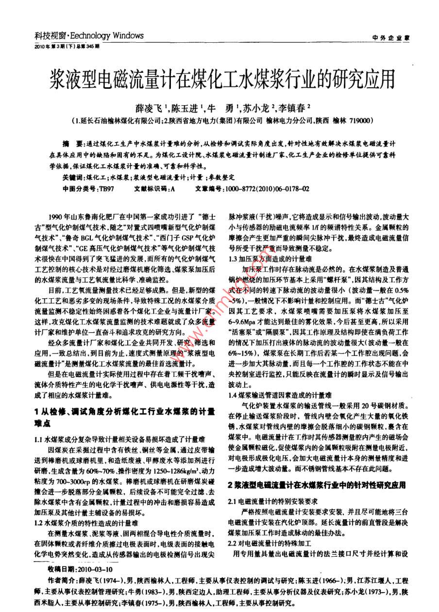 科技視窗· Eechnology windows中外企業(yè)家2010年第3期(下】總第345期漿液型電磁流量計在煤化工水煤漿行業(yè)的研究應(yīng)用薛凌飛,陳玉進,牛勇,蘇小龍2,李鎮(zhèn)春2(1延長石油榆林煤化有限公司;2陜西省地方電力(集團)有限公司榆林電力分公司陜西榆林71900)擴要:通過煤化工生產(chǎn)中水煤漿計量難的分析,從檢修和調(diào)試實際角度出發(fā),針對性地有效解決水煤漿電磁流量計在具休應(yīng)用中的缺陷和固有的不足。為煤化工設(shè)計院、水煤漿電磁流量計制造廠家、化工生產(chǎn)企業(yè)的檢修單位提供可靠科學(xué)依據(jù),保證煤化工水煤漿計量的準(zhǔn)確、可靠和科學(xué)性。關(guān)鍵詞:煤化工;水煤漿;漿液型電磁流量計;計量;參數(shù)整定中圖分類號:TB97文獻標(biāo)識碼:A文章編號:1000-8772(2010)060178-021990年山東魯南化肥廠在中國第一家成功引進了“德士脈沖漿液(于擾)噪聲,它將造成顯示和信號輸出波動波動量大古”型氣化爐制煤氣技術(shù)隨之“對置式四噴嘴新型氣化爐制煤小與傳感器的勵磁電流頻率的頻譜特性關(guān)系。金屬顆粒的氣技術(shù)”、“魯奇BCL氣化爐制煤氣技術(shù)”、“西門子GSP氣化爐摩擦?xí)a(chǎn)生更加嚴(yán)重的瞬間尖脈沖干擾,最終造成電磁流量信制煤氣技術(shù)”、“GE高壓氣化爐制煤氣技術(shù)”等氣化爐制煤氣技號所受千擾嚴(yán)重而導(dǎo)致測量不穩(wěn)定。術(shù)很快在中國得到了突飛猛進的發(fā)展,而所有的氣化爐制煤氣1.3加壓泵方面造成的計量難工藝控制的核心技術(shù)是對經(jīng)過磨煤機磨化篩選煤漿泵加壓后加壓泵工作時存在脈動流是必然的。在水煤漿制造及普通的水煤漿流量與工藝氧流量比科學(xué)準(zhǔn)確監(jiān)控。鍋爐燃燒的加壓環(huán)節(jié)基本上采用“螺桿泵”,因其結(jié)構(gòu)及工作方目前,工藝氧流量測量技術(shù)已經(jīng)足夠成熟。但是新型的煤式在不同的轉(zhuǎn)速下脈動流的波動量很小(波動量一般在0化工工藝和惡劣多變的現(xiàn)場條件,導(dǎo)致特殊工況的水煤漿介質(zhì)5%),一般情況下不影響計量和控制應(yīng)用。而“德士古”氣化爐流量監(jiān)測不穩(wěn)定性始終困惑著各個煤化工企業(yè)與流量計廠家。因其工藝要求,水煤漿噴嘴需要加壓泵將水煤漿加壓至這樣攻克煤化工水煤漿流量監(jiān)測的技術(shù)難題就成了眾多流量696Mpa才能達到最佳的霧化效果,今后甚至更高所以采用計廠家和維護單位一直奮斗和追求攻克的研究方向?;钊谩被颉案裟け谩?因其工作原理及結(jié)構(gòu)即使在滿負(fù)荷工作經(jīng)眾多流量計廠家和煤化工企業(yè)共同開發(fā)研究篩選和的情況下加壓打出液體的脈動流的波動量很大(波動量一般在應(yīng)用,一致總結(jié)出,到目前為止,速度式測量原理的“漿液型電6%-15%),煤漿泵在長期工作后若某一個工作腔出現(xiàn)問題,會磁流量計”是測量煤化工水煤漿流量的最佳首選流量計。進一步加大其脈動量,而且每一個工作腔的工作狀態(tài)不能在中但是在電磁流量計實際使用過程中存在著工頻干擾聲、央控制室進行監(jiān)控,只能反映在流量計的瞬時顯示及信號輸出流體介質(zhì)特性產(chǎn)生的電化學(xué)干擾嘈聲、供電電源性等干擾造波動上。成了相應(yīng)的水煤漿計量難14煤漿輸送管道因素造成的計量難氣化爐裝置水煤漿的輸送管線一般采用20號碳鋼材質(zhì)。1從檢修、調(diào)試角度分析煤化工行業(yè)水漿的計量在停止輸送煤漿階段時,管線內(nèi)壁會氧化產(chǎn)生大量的氧化鐵難點銹,水煤漿對管線內(nèi)壁的摩擦?xí)撀浼?xì)小的碳鋼顆粒,裹含在11水煤漿成分復(fù)雜導(dǎo)致計量相關(guān)設(shè)備易損壞造成了計量難媒漿中。電磁流量計在T作時其傳感器測量腔內(nèi)產(chǎn)生的磁場會因煤炭在采掘過程中含有鐵絲銅絲等金屬,通過皮帶輸使金屬顆粒磁化促使煤漿內(nèi)的金屬顆粒吸附在測量電極附近,送到棒磨機或球磨機里,和造紙廢液、甲醇廢水等添加劑進行對電極形成極化電壓,會加大電磁流量計本身的測量精度和進研磨生成含量為60%-70%操作密度為1250-286kg、動力步造成增大波動量。而不銹鋼管線基本不存在此問題粘度為70300的水煤漿。棒磨機或球磨機在研磨爆炭碰2漿液型電碰流量計在水媒漿行業(yè)中的針對性研究應(yīng)用除水煤漿中含有金屬顆粒計量過程中的沖擊和磨損容易造成21電磁流量計的特別安裝要求加壓泵及其他計量主輔設(shè)備的易損壞。嚴(yán)格按照電磁流量計安裝要求安裝,并且盡可能地將三臺12水煤漿介質(zhì)的特性造成的計量難電磁流量計安裝在汽化爐頂部。延長流量計的前直管段是解決在測量水煤漿泥漿等液、固兩相混合導(dǎo)電性介質(zhì)流量時,煤漿加壓泵工作時造成脈動的最佳辦法在固體顆?;蛘呃w維介質(zhì)擦過電極表面時,電級表面的接觸電22對電磁流量計的特殊加工化學(xué)電勢突然變化,造成從傳感器輸出的電極檢測信號出現(xiàn)尖專用量具量出電磁流量計的法蘭接口尺寸并經(jīng)計算和設(shè)收稿日期:201003-10作者簡介:薛凌飛(1974)男陜西榆林人,工程師主要從事儀表控制的調(diào)試與研究;陳玉進(1966-)男江蘇江堰人,工程師主要從事儀表控制管理研究;牛勇(1983-),男陜西定邊人助理工程師,主要從事分析儀器及儀表