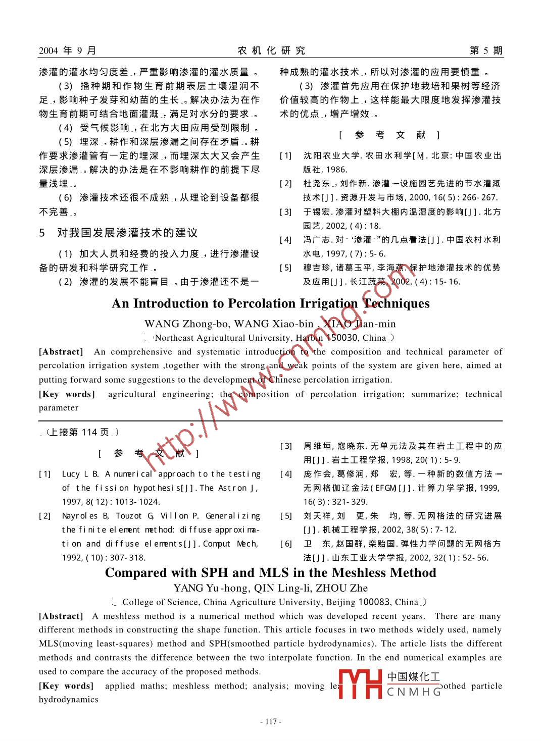 2004年9月農(nóng)機化研究第5期滲灌技術(shù)研究王忠波,王曉斌,肖建民(東北農(nóng)業(yè)大學(xué),黑龍江哈爾濱150030)[摘要] 我國是一個貧水國家,水資源的困乏致使農(nóng)田干旱缺水_,是制約農(nóng)業(yè)可持續(xù)發(fā)展的一個主要因素。目前,大面積推廣節(jié)水灌溉技術(shù)已提到日程。為此,全面系統(tǒng)地介紹了滲灌系統(tǒng)的組成、技術(shù)參數(shù)以及滲灌的優(yōu)缺點,并對我國的滲灌發(fā)展提出建議.。[關(guān)鍵詞]農(nóng)業(yè)工程 ;滲灌系統(tǒng);綜述; 技術(shù)參數(shù)[中圖分類號]S275. 9[文獻(xiàn)標(biāo)識碼] A [文章 編號]1003- 188X( 2004)05- 0115- 03滲灌是一種地下微灌形式,目前關(guān)于滲灌還沒(3)施肥裝置.。滲灌的一個突出的優(yōu)點是可以有一個統(tǒng)一的.、獲得共識的定義,一般認(rèn)為一‘地下結(jié)合灌水進行施肥施藥,所以首部樞紐需加設(shè)施肥暗管灌溉”:‘地下浸潤灌溉系統(tǒng)”‘地下灌溉-”等器,目前使用較多的是壓差式施肥器。施肥器必須名詞是滲灌的同意語.。關(guān)于滲灌的定義,有關(guān)文獻(xiàn)安裝在過濾器之前,避免未溶化的肥料和藥劑進入中表述很多,,但筆者比較認(rèn)同的是:‘滲灌是一種地滲灌系統(tǒng)。下微灌形式,它通過埋入地下的透水管道滲灌管)(4) 進排氣裝置.。為避免輸水時管道中形成氣使水滲入土層,借助土壤毛細(xì)管的滲吸作用慢慢地阻噎滯供水和停水時管道中發(fā)生負(fù)壓破壞管道,在將水分?jǐn)U散到管道周圍的土壤中,供作物吸收利首部樞紐的尾部需安裝進、排氣閥。用-”。(5)測量裝置.。為了掌握和控制滲灌系統(tǒng)的流量和壓力,在首部樞紐還需設(shè)置壓力表、 流量表以1滲灌系統(tǒng)的組成及控制閥門。整個滲灌系統(tǒng)自上而下由水源、首部樞紐、輸1.3 輸配水管網(wǎng)配水管網(wǎng)、滲灌管組成,其中以首部樞紐和滲灌管輸配水管網(wǎng)是滲灌系統(tǒng)的輸配水部分,包括干最為關(guān)鍵。管、支管和各種配件.。干管和支管的管材多為硬質(zhì)1.1水源塑料管.。干管管徑為80~~120mm,支管管徑為30滲灌屬于微灌所以滲灌應(yīng)用的水源比較廣泛,60mm。常用的配件有三通、彎頭、堵頭等。渠道水、水池水、水箱水.、地表水、地下水等只要1.4 滲灌管水質(zhì)滿足要求,皆可作為灌溉水源.。滲灌管的種類很多,從材質(zhì)上看有瓦管、陶土.2 首部樞紐管、竹管、塑料管和橡膠管等,目前使用最多的是滲灌首部樞紐包括加壓裝置水泵).過濾裝置塑料管和橡膠管。其大致有以下幾種類型:過濾器入施肥施藥裝置、施肥器入進排氣裝置(1) 以意大利為代表的、內(nèi)徑為10-~20mm的、進、排氣閥_)測量儀表_壓力表、流量表)以及在管壁上開有5-~10mm縱縫的塑料管作為滲灌管_。控制閥門。(2)以法國為代表的.、利用塑料加發(fā)泡劑和成(1) 加壓裝置.。 當(dāng)自然水頭不能滿足滲灌系統(tǒng)型劑混合擠出成型的塑料滲水管。對壓力的要求時,滲灌的首部樞紐需加設(shè)小型潛水(3)以美國為代表的利用廢舊輪胎.、塑料樹脂泵,進行加壓.。和-些特殊的添加劑,經(jīng)過科學(xué)的配方和特殊的加(2)過濾裝置.。滲灌對水源的水質(zhì)要求較高,工工藝制成的橡膠滲水管。所以滲灌首部樞紐一定要設(shè)置過濾器,以防止?jié)B灌(4) 以山西運城為代表的聚乙烯打孔滲灌管。管堵塞。滲灌過濾器有篩網(wǎng)式、砂石式、疊片式和2滲灌 技術(shù)參數(shù)離心式幾類。目前,我國主要使用的是篩網(wǎng)式過濾滲灌技術(shù)中國煤化工參灌管的間距.、[收稿日期] 2003- 12-01MHCNM HG[作者簡介]王忠波(1971-),男,講師,在讀博士,研究方向為水土保持和灌溉排水.2004年9月農(nóng)機化研究第5期灌水壓力、滲灌管的長度與坡度、滲灌管的出流量0. 009-~0. 010mi/h為宜;中、輕壤土每延長米滲灌等。進行滲灌規(guī)劃設(shè)計時,主要是確定以上技術(shù)參管的出流量以0. 012-~0.016m/h為宜;砂壤土每延數(shù),因其決定著滲灌的灌水質(zhì)量.。長米滲灌管的出流量以0. 016-~0. 020mi/h為宜.。2.1滲灌管的埋深滲灌管的埋設(shè)深度主要決定于土壤性質(zhì)、 耕作3滲灌的優(yōu)點情況_、 作物種類及凍深_北方.).適宜的埋設(shè)深度應(yīng)3.1節(jié)水能使灌溉水借毛細(xì)管作用充分濕潤計劃濕潤層,特由于滲灌是一種地下灌溉方式,灌水后土壤表別是在表層也能達(dá)到一定的濕潤程度,而深層滲漏層保持干燥,株間蒸發(fā)減少;同時通過控制灌水量,最小。一般粘質(zhì)土埋深大,砂質(zhì)土埋深小。埋設(shè)深也可以有效減少深層滲漏.。所以,滲灌較其它灌水度要深于耕作深度,且不會被農(nóng)機具行走而壓斷,方式節(jié)水。滲灌比溝灌節(jié)水50%~70%,比滴灌節(jié)水北方地區(qū)還要考慮最大凍深的影響。-般淺根作物10%.。.如蔬菜、小麥、棉花等,滲灌管埋深為0.1-~0. 3m;3.2節(jié)能果樹等深根類作物為0.3-~0.4m,并應(yīng)在不影響耕滲灌屬于低壓灌溉,灌水壓力-般為5. 88-~作的前提下盡量淺埋.。這樣有利于減少滲灌管上部29.42kPa. ,所以滲灌較噴灌.微噴等灌水方式節(jié)能。土體末濕潤干土層和防止或減少深層滲漏.。3.3降濕2.2滲灌管的間距.當(dāng)用于棚室灌溉時,由于滲灌只濕潤作物根滲灌管的間距主要決定于土壤的性質(zhì)和供水管部_,表土干燥,從而減少了地表土