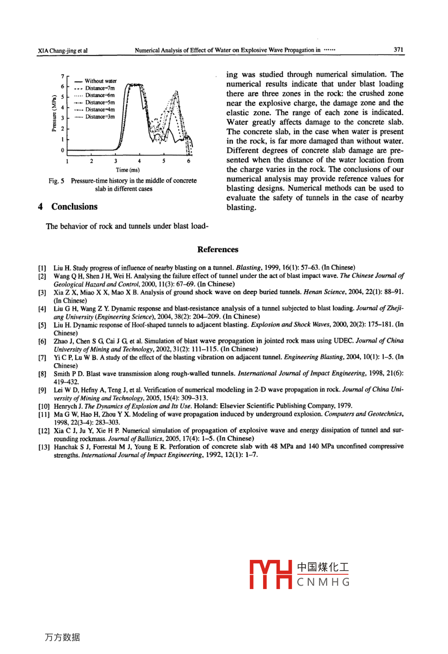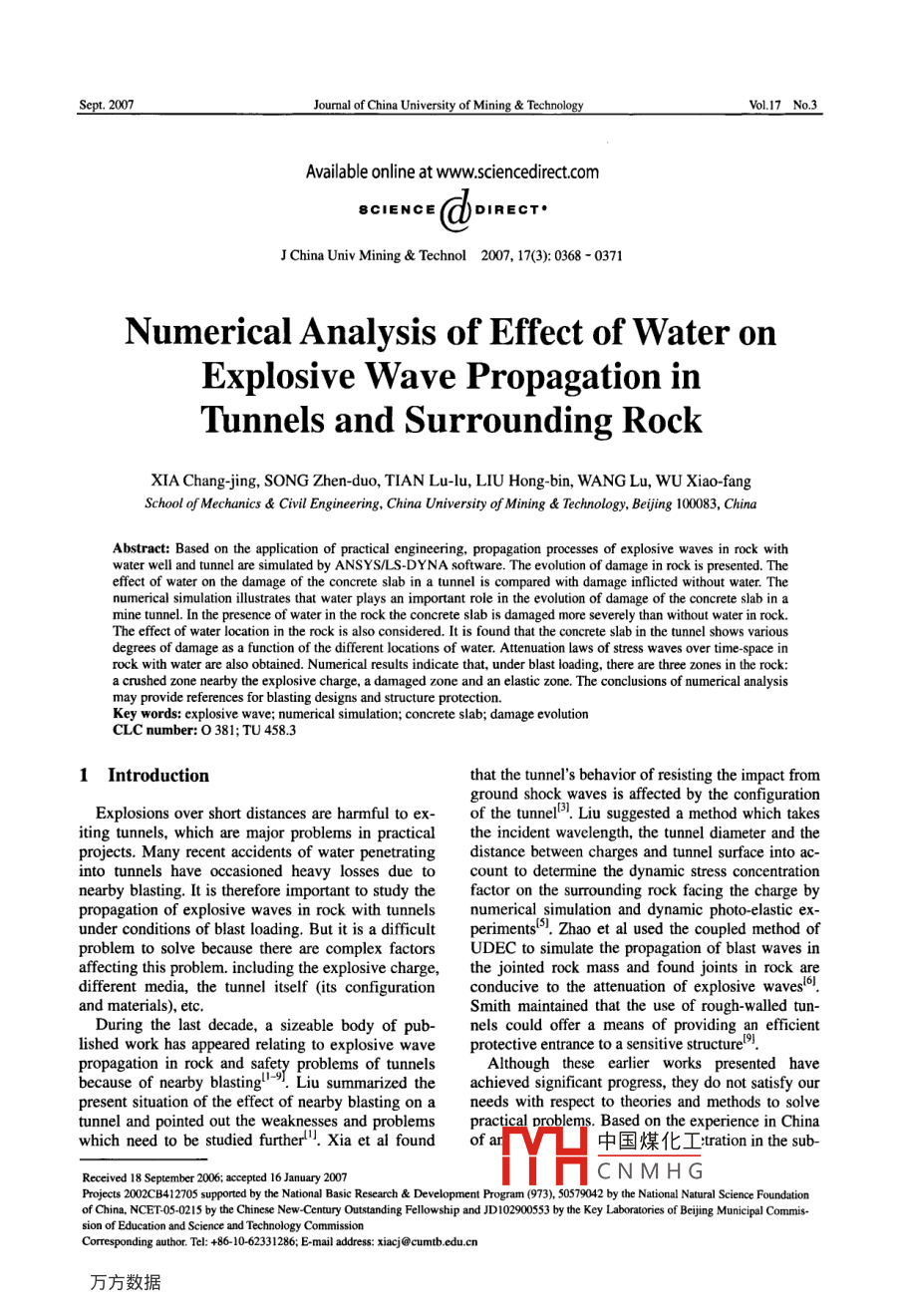 Sept. 2007Jourmal of China University of Mining & TechnologyVol.17_ No.3Available online at www.sciencedirect.comSCIENCE@)DIRECT.J China Univ Mining & Technol 2007, 17(3): 0368 -0371Numerical Analysis of Effect of Water onExplosive Wave Propagation inTunnels and Surrounding RockXIA Chang-jing, SONG Zhen-duo, TIAN Lu-lu, LIU Hong-bin, WANG Lu, WU Xiao-fangSchool of Mechanics & Civil Engineering, China University of Mining & Technology, Beijing 100083, ChinaAbstract: Based on the application of practical engineering, propagation processes of explosive waves in rock withwater well and tunnel are simulated by ANSYS/LS-DYNA software. The evolution of damage in rock is presented. Theeffect of water on the damage of the concrete slab in a tunnel is compared with damage inflicted without water. Thenumerical simulation ilustrates that water plays an important role in the evolution of damage of the concrete slab in amine tunnel. In the presence of water in the rock the concrete slab is damaged more severely than without water in rock.The effect of water location in the rock is also considered. It is found that the concrete slab in the tunnel shows variousdegrees of damage as a function of the different locations of water. Attenuation laws of stress waves over time-space inrock with water are also obtained. Numerical results indicate that, under blast loading, there are three zones in the rock:a crushed zone neatby the explosive charge, a damaged zone and an elastic zone. The conclusions of numerical analysismay provide references for blasting designs and structure protection.Key words: explosive wave; numerical simulation; concrete slab; damage evolutionCLC number: 0381; TU 458.31 Introductionthat the tunnel's behavior of resisting the impact fromground shock waves is affected by the configurationExplosions over short distances are harmful to ex-of the tunnell. Liu suggested a method which takesiting tunnels, which are major problems in practicalthe incident wavelength, the tunnel diameter and theprojects. Many recent accidents of water penetratingdistance between charges and tunnel surface into ac-nto tunnels have occasioned heavy losses due tocount to determine the dynamic stress concentrationnearby blasting. It is therefore important to study thefactor on the surrounding rock facing the charge bypropagation of explosive waves in rock with tunnelsnumerical simulation and dynamic photo-elastic ex-under conditions of blast loading. But it is a difficultperiments'. Zhao et al used the coupled method ofproblem to solve because there are complex factorsUDEC to simulate the propagation of blast waves inaffecting this problem. including the explosive charge,the jointed rock mass and found joints in rock aredifferent media, the tunnel itself (its configurationconducive to the attenuation of explosive waveso.and materials), etc.Smith maintained that the use of rough-walled tun-During the last decade, a sizeable body of pub-nels could offer a means of providing an efficientlished work has appeared relating to explosive waveprotective entrance to a sensitive structurel9!.propagation in rock and safety problems of tunnelsAlthough these earlier works presented havebecause of nearby blasting'Liu summarized theachieved significant progress, they do not satisfy ourpresent situation of the effect of nearby blasting on aneeds with respect to theories and methods to solvetunnel and pointed out the weaknesses and problemspractical Droblems. Based on the experience in Chinawhich need to be studied furtherl'. Xia et al foundof ar中國煤化工:ration in the sub-Received 18 Sepiember 2006; acepted 16 January 2007fHCNMHGProjects 2002CB412705 supported by the National Basic Research & Development Program (973), 50579042 by the National Natural Science Foundationof China, NCET-05-0215 by the Chinese New-Century OUutstanding Fellowship and JD102900553 by the Key Laboratories of Beijing Municipal Commis-sion of Education and Science and Technology CommissionCorresponding author. Tel: +86- 10-62331286; E-mail adress: xiacj@cumtb.edu.cnXIA Chang-ing etalNumerical Analysis of Effect of Water on Explosive Wave Propagation in ...._369floor of a mine tunnel caused by nearby blasting, weThe JHC model is employed to facilitate a full simu-simulated the process of explosive wave propagationlation of stress wave propagation in rockt .in rock with water and a tunnel using ANSYS/LS-The JHC model is described asDYNA software.σ° =[A(1-D)+ BP"~][1+CIn(e ")],2 Numerical Simulationwhere D is the damage (0≤D≤1), p'=PIf'the normalized pressure (where P is the actual pres-2.1 Numerical modelure, f' the quasi-static uni-axial compressiveWe simplified the problem as a two-dimensionalstrength) ande° =e1ε。the dimensionless strain rate(where ε is the actual strain rate and E = 1.0s-plane strain model.Fig. 1 shows the overall configuration and the sizethe reference strain rate). A, B, C and N are the mate-rial constants.of the numerical model.The radius of the explosive charge is 175 mm. TheParameters of the materials used in the calculationdistance from the explosive charge to the concreteare listed in Tables 1-3.slab is 9500 mm. The water well is 8500 mm longTable 1 JWL equation of state parameters ofTNT usedand 600 mm wide and the distance between the waterPwell and the charge is 6000 mm. Because of the com-(gcm) (m/s)(GPa) (GP2) (GPa) Ri Rz_“(GPa)plex distribution of the multi-hole strip explosive1.566700 22.25 650.0 9.25 4.2 1.1 3.4 8.5charge, it was simplified as a single-hole explosivecharge as suggested by Henrych in 197910.Table 2 Parameters of rock materialf'(g/em)Smxs (GPa)DIDrHc μ (GPa) (GPa)2.680.160 7.0 14.86 0.04 1.0 0.001 0.10 0.0160.80RI75Table 3 Parameters of concrete material800000: 5000p(g/em)E(GPa)o,(MPa)e9500 .600035.70.2014.00.003Fig. 1 Sketch of the explosive charge and tunnel construction3 Analysis of Numerical Results1. Water well; 2. Concrete slab; 3. Rock;4. Tunnel; 5. Explosive charge (Unit: mm)3.1 Stress