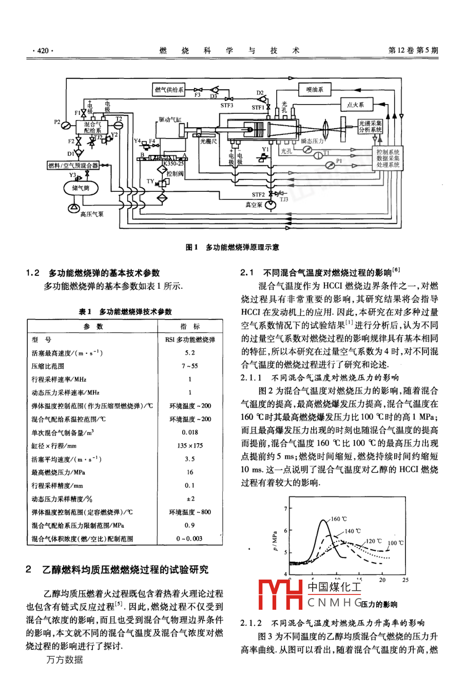 第12卷第5期燃燒科學(xué)與技術(shù)Vol 12 No 52006年10月Journal of Combustion Science and Technologyoct,2006乙醇燃料均質(zhì)壓燃的試驗研究張紀(jì)鵬,董光宇,虞瀏,常國峰,夏元東(吉林大學(xué)汽車學(xué)院,長春130025)摘要:利用多功能燃燒彈對乙醇進(jìn)行均質(zhì)壓燃性能的研究,具有邊界條件可控的獨特優(yōu)點在多功能燃燒模擬系統(tǒng)(多功能燃燒彈)中進(jìn)行了不同混合氣溫度對燃燒過程及不同空燃比對燃燒過程影響規(guī)律的試驗研究混合氣溫度的升高將促使燃燒最高壓力、最大壓力升高率和放熱率增加,而且其峰值提前;隨空燃比的加大,燃燒壓力、壓力升高率和燃燒放熱率下降,且出現(xiàn)峰值的時刻推遲關(guān)鍵詞:燃燒彈;均質(zhì)壓燃;邊界條件中圖分類號:TK431文獻(xiàn)標(biāo)志碼:A文章編號:1006-8740(2006)05-041904Experimental Study on Alcohol HCCI CombustionZHANG Ji-peng, DONG Guang-yu, YU Liu, CHANG Guo-feng, XIA Yuan-dongCollege of Auto Engineering, Jilin University, Changchun 130025, China)Abstract: Study on alcohol HCCI combustion characteristics was conducted on a multi-functional combustion bomb so thatthe boundary conditions can be controlled easily. The effects of different intake air fuel mixture temperatures and different-fuel ratios on the combustion process were studied in the multi-functional combustion simulation system. It is found thatthe combustion with higher intake air fuel mixture temperature and lower air-fuel ratio makes a higher peak cylinder presure increasing ratio and a higher heat release ratios, and the peak heat release ratio will be advancedKeywords: combustion bomb; homogeneous charge compression ignition; boundary conditions為對醇類燃料燃燒邊界條件進(jìn)行系統(tǒng)的研究,筆燃燒彈利用壓縮活塞行程的控制使其幾何壓縮比者開發(fā)了具有適應(yīng)多種燃料、多種著火方式的多功能在7~55內(nèi)可調(diào)燃燒彈的前部可根據(jù)試驗項目和數(shù)燃燒彈口在此基礎(chǔ)上,利用多功能燃燒彈對乙醇燃據(jù)釆集方式的不同更換缸蓋缸蓋上設(shè)置有光學(xué)玻璃料均質(zhì)壓燃的相關(guān)燃燒特性進(jìn)行了試驗本試驗主要窗、缸內(nèi)動態(tài)壓力傳感器溫度傳感器靜態(tài)壓力傳圍繞直接影響著火過程的混合氣濃度及混合氣溫度邊感器、火花塞、燃料噴射器、氣體供給閥、排氣閥等;燃界條件進(jìn)行2燒彈可根據(jù)需要進(jìn)行彈體加熱和保溫,其調(diào)溫范圍從環(huán)境溫度至200℃1多功能燃燒彈均質(zhì)混合氣的制備由空氣/燃料混合器和混合氣制備容器完成,需經(jīng)過兩個過程:首先利用文丘里1.1多功能燃燒彈的工作原理管原理將燃料與空氣進(jìn)行初步混合,并輸入到混合氣多功能燃燒彈的工作原理如圖1所示,動力驅(qū)動制備容器中;在容器中經(jīng)過進(jìn)一步的加溫調(diào)制使燃料部分與燃燒彈的壓縮活塞相連接,由壓縮空氣驅(qū)動對與空氣混合,形成均質(zhì)狀態(tài)燃燒彈內(nèi)的均質(zhì)混合氣進(jìn)行壓縮著火中國煤化工CNMHG收稿日期:2005-11-08基金項目:國家重點基礎(chǔ)研究發(fā)展規(guī)劃(973)資助項目(2001CB209206)雋鮫紀(jì)鵬(1956-),男,教授,pjhy@sna4燃燒科學(xué)與技術(shù)第12卷第5期燃?xì)夤┙o系噴油系STF3點火系驅(qū)動氣光譜采集燃料/空氣預(yù)混合器處理系統(tǒng)儲氣筒STF2真空泵高壓氣泵圖1多功能燃燒彈原理示意1.2多功能燃燒彈的基本技術(shù)參數(shù)2.1不同混合氣溫度對燃燒過程的影響多功能燃燒彈的基本參數(shù)如表1所示混合氣溫度作為HCCI燃燒邊界條件之一,對燃燒過程具有非常重要的影響,其研究結(jié)果將會指導(dǎo)表1多功能燃燒彈技術(shù)參數(shù)HCCI在發(fā)動機(jī)上的應(yīng)用因此,本研究在對多種過量空氣系數(shù)情況下的試驗結(jié)果進(jìn)行分析后,認(rèn)為不同Rs多功能燃燒彈的過量空氣系數(shù)對燃燒過程的影響規(guī)律具有基本相同活塞最高速度/(m·s-1)的特征,所以本研究在過量空氣系數(shù)為4時,對不同混比范圍合氣溫度的燃燒過程進(jìn)行了研究和論述行程采樣速率/MHz2.1.1不同混合氣溫度對燃燒壓力的影響動態(tài)壓力采樣速率/MHz圖2為混合氣溫度對燃燒壓力的影響,隨著混合彈體溫度控制范圍(作為壓縮型燃燒彈)℃環(huán)境溫度-200氣溫度的提高,最高燃燒爆發(fā)壓力提高,混合氣溫度在混合氣配給系溫控范圍/℃環(huán)境溫度~200160℃時其最高燃燒爆發(fā)壓力比100℃時的高lMPa;單次混合氣制備量/m0.018而且最高爆發(fā)壓力出現(xiàn)的時刻也隨混合氣溫度的提高缸徑x行程/mm35x175而提前,混合氣溫度160℃比100℃的最高壓力出現(xiàn)活塞平均速度/(m·s-1)點提前約5ms;燃燒時間縮短,燃燒持續(xù)時間約縮短最高燃燒壓力/MPa10ms.這一點說明了混合氣溫度對乙醇的HCCI燃燒行程采樣精度/mm過程有著較大的影響動態(tài)壓力采樣精度%彈體溫度控制范圍(定容燃燒彈)℃環(huán)境溫度~800混合氣配給系壓力限制范圍/MPa140℃混合氣體積濃度(燃/空比)配制范圍0-0.0032乙醇燃料均質(zhì)壓燃燃燒過程的試驗研究乙醇均質(zhì)壓燃著火過程既包含著熱著火理論過程中國煤化工也包含有鏈?zhǔn)椒磻?yīng)過程.因此,燃燒過程不僅受到CNMHG壓力的影響混合氣濃度的影響而且也受到混合氣物理邊界條件2.1.2不同混合氣溫度對燃燒壓力升高率的影響的影響,本文就不同的混合氣溫度及混合氣濃度對燃圖3為不同溫度的