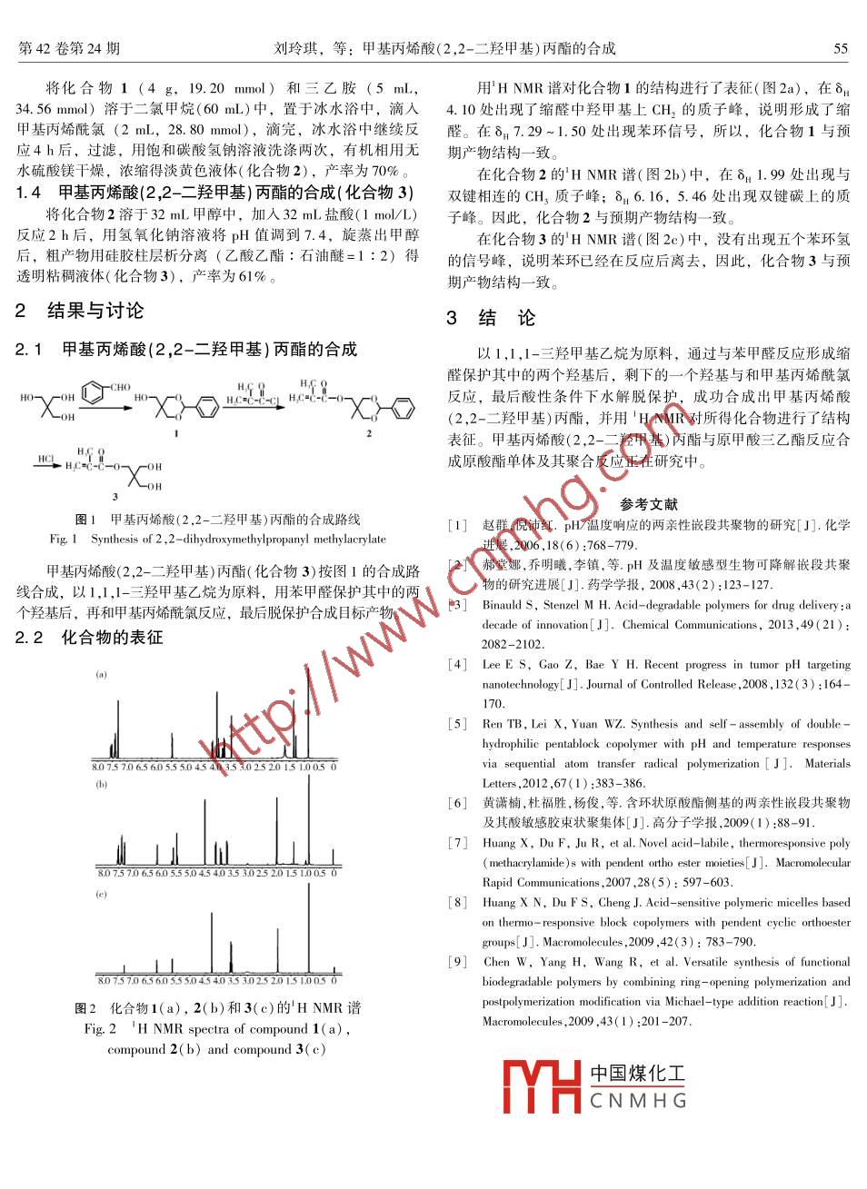 第42卷第24期廣州化工Vol 42 No 242014年12月Guangzhou Chemical IndustryDec. 2014甲基丙烯酸(2,2-二羥甲基)丙酯的合成劉玲琪,王德強,何福喜,閔曉燕,畢韻梅南師范大學(xué)化學(xué)化工學(xué)院,云南昆明650500)摘要:以對甲苯磺酸為催化劑,用1,1,1-三羥甲基乙烷(THME)與苯甲醛在四氫呋喃中反應(yīng),合成出2,2-二羥甲基縮苯甲醛丙醇;再以三乙胺作縛酸劑,用2,2-二羥甲基縮苯甲醛丙醇與甲基丙烯酰氯反應(yīng)合成出甲基丙烯酸(2,2-二羥甲基)丙酯的縮苯甲醛衍生物,再與鹽酸反應(yīng)得到甲基丙烯酸(2,2-二羥甲基)丙酯。用核磁共振氫譜(HNMR)證明了所合成化合物的結(jié)構(gòu)。關(guān)鍵詞:1,1,1-三羥甲基乙烷(THME);苯甲醛;2,2-二羥甲基縮苯甲醛丙醇;甲基丙烯酸(2,2-二羥甲基)丙酯中圖分類號:063文獻標志碼:A文章編號:1001-96772014)024-0054-02Synthesis of 2, 2-Dihydroxymethylpropanyl methylacrylateLIU Ling-qi, WANG De-giang, HE Fu-xi, MIN Xiao-yan, B/ Yun-metCollege of Chemistry and Chemical Engineering, Yunnan NorUniversity, Yunnan Kunming 650500, China)Abstract: The 2, 2-dihydroxymethyl propanol was first synthesized by the reaction of 1, 1, I-tris( hydroxymethyl)ethane THME) with benzaldehyde in the presence of catalytic amount of TsOH. The methacrylation of 2, 2dihydroxymethyl propanol with methacryloyl chloride afforded the benzylidene acetal derivative of 2, 2dihydroxymethylpropanyl methylacrylate. The resulting product was ensued by acid hydrolysis of benzylidene acetal to give2, 2-dihydroxymethylpropanyl methylacrylate. The structures of the products were verified by H NMR spectraKey words: 1, 1, I-three hydroxymethyl ethane (THME); benzaldehyde; 2, 2-dihydroxy- methyl propanol; 2, 2dihydroxymethylpropanyl methylacrylate刺激響應(yīng)性高分子是指由于外界環(huán)境的微小變化而引起較物單體的重要前體化合物,本文以1,1,1-三羥甲基乙烷為原大的物理變化或化學(xué)變化的一類高分子材料。外界環(huán)境的刺激料,經(jīng)三步反應(yīng)合成了丙烯酸(2,2-二羥甲基)丙酯,為后續(xù)合可分為物理刺激和化學(xué)刺激。物理刺激主要指溫度、電場、成含有環(huán)狀原酸酯側(cè)基的新型pH響應(yīng)性高分子材料打好基礎(chǔ)子鏈之間的相互作用和各種能量的改變?;瘜W(xué)刺激主要包括介1實驗部分質(zhì)的pH值、離子濃度及種類、溶劑、化學(xué)反應(yīng)物等條件的變化,它們會在分子水平上改變聚合物鏈之間以及聚合物與溶劑1.1儀器與試劑之間的相互作用2。聚合物對這些外界刺激的響應(yīng)最終將導(dǎo)Bπ ker drⅹ-50核磁共振儀( Bruker,瑞土),TMS做內(nèi)致其物理性質(zhì)或化學(xué)性質(zhì)發(fā)生相應(yīng)的突變,其中,pH響應(yīng)性標。高分子在腫瘤、細胞內(nèi)或胃腸道給藥方面最具應(yīng)用前景3-41,1,1-三羥甲基乙烷(THME,99%),對甲苯磺酸水合物原酸酯是一類在堿性或中性條件下穩(wěn)定,在酸性條件下易(TOH,>9%),四氫呋喃(AR),苯甲醛(>9%),三乙胺水解的有機官能團,聚原酸酯具有良好的生物相容性,作為生(9%),甲基丙烯酰氯,均為國產(chǎn)試劑。四氫呋喃和三乙胺在物醫(yī)用材料已用于二期臨床試驗3。近年來,原酸酯作為酸裂使用前均做除水處理解型連接基團被用于制備H響應(yīng)性的脂類化合物,相應(yīng)的p1.22,2-二羥甲基縮苯甲醛丙醇的合成(化合物1)響應(yīng)性脂質(zhì)體在藥物控制釋放、基因輸送等方面具有潛在的應(yīng)將1,1,1-三羥甲基乙烷(3g,0.025mol)和對甲苯磺其疏水核的極性因原酸酯的水解而增加,該類叫響應(yīng)性膠束用價值6。黃瀟楠等”合成了含環(huán)狀原酸酯側(cè)基的兩親性嵌水合物(0.15g,0.79mol)溶于47mL四氫呋喃中,滴加苯段共聚物,這些嵌段共聚物在水溶液中能自組裝成球形膠束狀甲醛(3mL,26.25mmo),攪拌過夜,減壓濃縮后,用二氯甲聚集體,這些聚集體在中性水溶液中較穩(wěn)定,在酸性水溶液中烷稀e_La中國煤化工次,有機相用無水硫酸鎂CNMH物1),產(chǎn)率為94%。狀聚集體有望用于腫瘤、細胞內(nèi)給藥等藥物傳輸體系。1.3A,基)丙酯的縮苯甲醛衍丙烯酸(2,2-二羥甲基)丙酯為合成含環(huán)狀原酸酯側(cè)基聚合生物的合成(化合物2)基金項目:國家自然科學(xué)基金(20864003,21264017)資助項目作者簡介:劉玲琪(1989-),女,碩士研究生,主要研究方向為有機高分子。通訊作者:畢韻梅,教授,主要從事生物醫(yī)用高分子材料研究。第42卷第24期劉玲琪,等:甲基丙烯酸(2,2-二羥甲基)丙酯的合成將化合物1(4g,19.20mmol)和三乙胺(5mL,用HNMR譜對化合物1的結(jié)構(gòu)進行了表征(圖2a),在δ134.56mml)溶于二氯甲烷(60mL)中,置于冰水浴中,滴入4.10處出現(xiàn)了縮醛中羥甲基上CH2的質(zhì)子峰,說明形成了縮甲基丙烯酰氯(2mL,28.80mmol),滴完,冰水浴中繼續(xù)反醛。在δn7.29-1.50處出現(xiàn)苯環(huán)信號,所以,化合物1與預(yù)應(yīng)4h后,過濾,用飽和碳酸氫鈉溶液洗滌兩次,有機相用無期產(chǎn)物結(jié)構(gòu)一致。水硫酸鎂干燥,濃縮得淡黃色液體(化合物2),產(chǎn)率為70%在化合物2的HNMR譜(圖2b)中,在δ11.99處出現(xiàn)與14甲基丙烯酸(22-二羥甲基)丙酯的合成(化合物3)雙鍵相連的CH1質(zhì)子峰;616.16,5.46處出現(xiàn)雙鍵碳上的質(zhì)將化合物2溶于32mL甲醇中,加人32mL鹽酸(1mo/L)子峰。因此,化合物2與預(yù)期產(chǎn)物結(jié)構(gòu)一致反應(yīng)2h后,用氫氧化鈉溶液將pH值調(diào)到7.4,旋蒸出甲醇在化合物3的HNMR譜(圖2c)中,沒有出現(xiàn)五個苯環(huán)氫后,粗產(chǎn)物