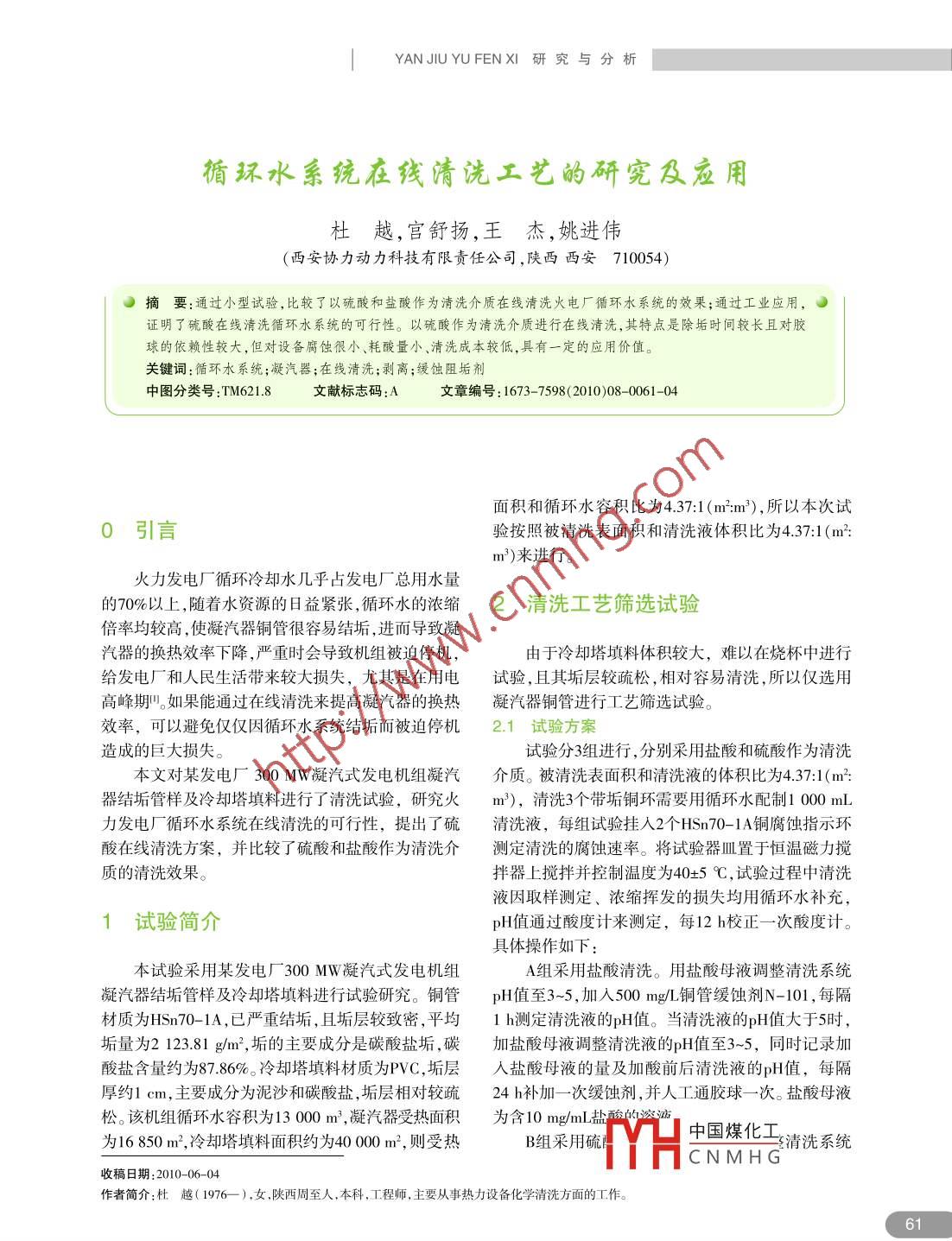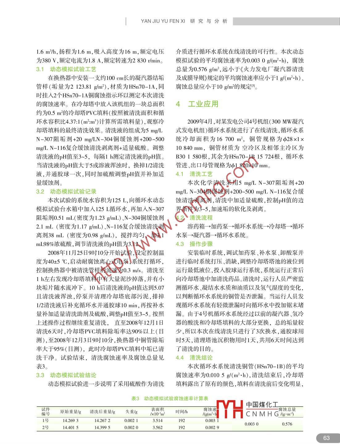 |YANJIUYUFENXI 研究與分析循環(huán)水系統(tǒng)在線清洗工藝的研究及應用杜越,宮舒揚,王杰,姚進偉(西安協(xié)力動力科技有限責任公司,陜西西安710054))摘要:通過小型試驗,比較了以硫酸和鹽酸作為清洗介質(zhì)在線清洗火電廠循環(huán)水系統(tǒng)的效果;通過工業(yè)應用,。證明了硫酸在線清洗循環(huán)水系統(tǒng)的可行性。以碗酸作為清洗介質(zhì)進行在線清洗,其特點是除垢時間較長且對膠球的依賴性較大,但對設備腐蝕很小耗酸量小、清洗成本較低,具有一定的應用價值。關鍵詞:循環(huán)水系統(tǒng);凝汽器;在線清洗;剝離;緩蝕阻垢劑中圖分類號:TM621.8文獻標志碼:A文章編號: 1673-7598(2010)08 -0061-04面積和循環(huán)水容積比為4.37:1 (m:m),所以本次試) 引言驗按照被清洗表面積和清洗液體積比為4.37:1(m2:m2)來進行。火力發(fā)電廠循環(huán)冷卻水幾乎占發(fā)電廠總用水量的70%以上,隨著水資源的日益緊張,循環(huán)水的濃縮2清洗工藝篩選試驗倍率均較高,使凝汽器銅管很容易結垢,進而導致凝汽器的換熱效率下降,嚴重時會導致機組被迫停機,由于冷卻塔填料體積較大,難以在燒杯中進行給發(fā)電廠和人民生活帶來較大損失,尤其是在用電試驗,且其垢層較疏松,相對容易清洗,所以僅選用高峰期"。如果能通過在線清洗來提高凝汽器的換熱凝汽器銅管進行工藝篩選試驗。效率,可以避免僅僅因循環(huán)水系統(tǒng)結垢而被迫停機2.1 試驗方案造成的巨大損失。試驗分3組進行,分別采用鹽酸和硫酸作為清洗本文對某發(fā)電廠300 MW凝汽式發(fā)電機組凝汽介質(zhì)。被清洗表面積和清洗液的體積比為4.37:1(m2:器結垢管樣及冷卻塔填料進行了清洗試驗,研究火m2),清洗3個帶垢銅環(huán)需要用循環(huán)水配制1 000 mL力發(fā)電廠循環(huán)水系統(tǒng)在線清洗的可行性,提出了硫清洗液,每組試驗掛人2個HSn70- 1A銅腐蝕指示環(huán)酸在線清洗方案,并比較了硫酸和鹽酸作為清洗介測定清洗的腐蝕速率。將試驗器皿置于恒溫磁力攪質(zhì)的清洗效果。拌器上攪拌并控制溫度為40+5 C,試驗過程中清洗液因取樣測定、濃縮揮發(fā)的損失均用循環(huán)水補充,1試驗簡介pH值通過酸度計來測定,每12 h校正- -次酸度計。具體操作如下:本試驗采用某發(fā)電廠300 MW凝汽式發(fā)電機組A組采用鹽酸清洗。用鹽酸母液調(diào)整清洗系統(tǒng)凝汽器結垢管樣及冷卻塔填料進行試驗研究。銅管pH值至3~5,加入500 mg/L銅管緩蝕劑N-101 ,每隔材質(zhì)為HSn70-1A,已嚴重結垢,且垢層較致密,平均1 h測定清洗液的pH值。當清洗液的pH值大于5時,垢量為2 123.81 g/m2, 垢的主要成分是碳酸鹽垢,碳加鹽酸母液調(diào)整清洗液的pH值至3~5,同時記錄加酸鹽含量約為87.86%。冷卻塔填料材質(zhì)為PVC,垢層人鹽酸母液的量及加酸前后清洗液的pH值,每隔厚約1cm,主要成分為泥沙和碳酸鹽,垢層相對較疏24h補加一-次緩蝕劑,并人工通膠球一次。鹽酸母液松。該機組循環(huán)水容積為13 000 m3 ,凝汽器受熱面積為含10 m/mL鹽為16 850 m2,冷卻塔填料面積約為40000 m2,則受熱B組采用硫中國煤化工清洗系統(tǒng)HCNMHG收稿日期:2010-06- -04作者簡介:杜越( 1976- ),女 ,陜西周至人,本科,工程師,主要從事熱力設備化學清洗方面的工作。61研究與分析YANJIUYU FENXIpH值至3~5,加入5 mg/L N-307緩蝕阻垢劑、20 mg/LC組采用硫酸清洗。操作控制同B組,不同點是N-304銅緩蝕劑及200~500 mg/L N- 116復合緩蝕清不加N-1 16復合緩蝕清洗剝離劑。洗剝離劑,每隔1 h測定清洗液的pH值,當清洗液的2.2 試驗結果pH值大于5或溶液渾濁時,換掉1/2清洗液,并人工通采用鹽酸和硫酸清洗均能達到除垢的目的,各膠球一次,同時加硫酸調(diào)整pH值,,補加適量緩蝕劑組清洗的腐蝕速率、腐蝕總量除垢率見表1,清洗結并記錄每次的加藥量及加酸前后清洗液的pH值。硫果對比見表2。酸母液為含5 mg/mL硫酸的溶液。表1各組清洗的腐 蝕速率腐蝕總量及除垢率4分組試件編號 原始重量/g 清洗后 重量/g失 重/g表面移除垢時間/h腐蝕速率平均腐蝕速 腐 蝕總量除垢率/%/x10-/(g(m2+h)-) 率(g(m2.h) /(g.m2)114.484 614.467 50.017 13.56974.50.0640.0674.99299.732號14.750 614.732 00.018 63.5900.0703號14.771 414.769 80.001 63.6297.50.000.0060.58599.714號15.060615.05840.002 23.6475號14.852 614.555 90.296 73.580.8480.84582.38851.72614.789 6,14.491 20.298 43.6300.843表2清洗工藝篩選試驗結 果項目A組組C組)7.551.7腐蝕速率(g(m2 :h)-)0.0050.84腐蝕總量/(g.m)0.522 .82.427用酸量/g21(30%工業(yè)鹽酸)1.7 (98%.工業(yè)硫酸)2.4 (98%工業(yè)硫酸)清洗助劑用量/g1.01.4).4用酸量/,273(30%工業(yè)鹽酸)22.1(98%工業(yè)硫酸)31.2(98%工業(yè)硫酸)*300 MW單機清洗助劑用量/t13.018.2(水容積13000 m)總費用萬元35.8828.639.67備注:*項中的藥劑用量是根據(jù)小型試驗藥劑用量換算成300MW單機凝汽器清洗的藥劑用量;鹽酸、硫酸按600元/計算,助劑按1.5萬元/h計算。.2.3試驗結論被水流沖出,不會造成堵塞。A、B組清洗后垢環(huán)和腐蝕指示環(huán)均光亮、均勻腐蝕,除垢率大于95% ,說明鹽酸和硫酸均能達到在3動態(tài)模 擬試驗線清洗的目的。鹽酸清洗時間短但是用酸量比硫酸清洗大得多,且鹽酸清洗腐蝕速率和腐蝕總量也比根據(jù):工藝篩選試驗結果,本小型動態(tài)模擬試驗硫酸清洗大近10倍硫酸清洗雖然除垢時間較長且選用B組硫酸清洗工藝,進--步驗證清洗效果。對膠球的依賴性較大,但是對銅管的