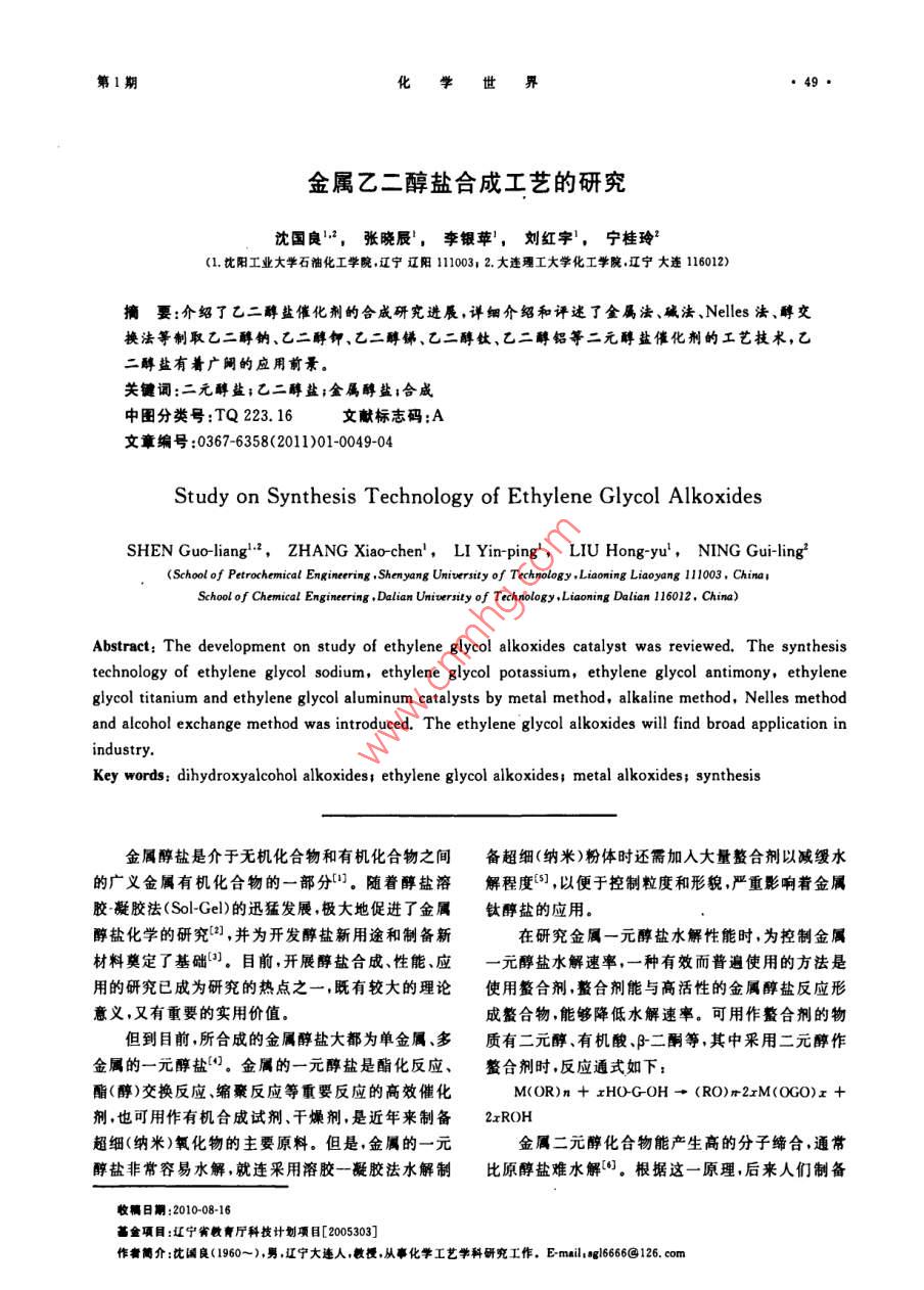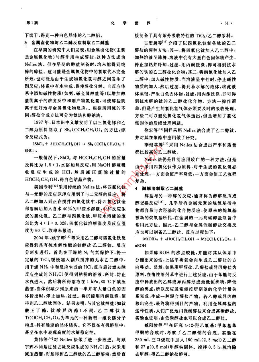 化學(xué)世界金屬乙二醇鹽合成工藝的研究沈國(guó)良2,張曉辰,李銀蘋,劉紅字,寧桂玲2(1沈陽(yáng)工業(yè)大學(xué)石油化工學(xué)院遼寧遼陽(yáng)1110032.大連理工大學(xué)化工學(xué)院,遼寧大連116012摘要:介紹了乙二醇鹽催化劑的合成研究進(jìn)展,詳細(xì)介紹和評(píng)述了金屬法、堿法、Nels法、醇交換法等制取乙二醇鈉、乙二醇鉀、乙二醇銻、乙二醇鈦、乙二醇鋁等二元醇鹽催化劑的工藝技術(shù),乙二醇鹽有著廣的應(yīng)用前景。關(guān)鍵詞:二元醇鹽;乙二醇鹽;金屬醇鹽;合成中圖分類號(hào):TQ223.16文獻(xiàn)標(biāo)志碼:A文章編號(hào):0367-6358(2011)01-0049-04Study on Synthesis Technology of Ethylene Glycol AlkoxidesSHEN Guo-liang, ZHANG Xiaochen, LI Yin-ping, LIU Hong-yu, NING Gui-ling2(School of Petrochemical Engineering, Shenyang Universty of Technology, Liaoning Liaoyang 111003, ChSchool of Chemical Engineering, Dalian University of Technology, Liaoning Dalian 116012, ChinaAbstract: The development on study of ethylene glycol alkoxides catalyst was reviewed. the synthesistechnology of ethylene glycol sodium, ethylene glycol potassium, ethylene glycol antimony, ethyleneglycol titanium and ethylene glycol aluminum catalysts by metal method alkaline method, Nelles methodand alcohol exchange method was introduced. The ethylene glycol alkoxides will find broad application inKey words: dihydroxyalcohol alkoxides; ethylene glycol alkoxides; metal alkoxides; synthesis金屬醇鹽是介于無(wú)機(jī)化合物和有機(jī)化合物之間備超細(xì)(納米)粉體時(shí)還需加入大量整合劑以減緩水的廣義金屬有機(jī)化合物的一部分。隨著醇鹽溶解程度,以便于控制粒度和形貌嚴(yán)重影響著金屬膠凝膠法( Sol-Gel)的迅猛發(fā)展極大地促進(jìn)了金屬鈦醇鹽的應(yīng)用醇鹽化學(xué)的研究(,并為開發(fā)醇鹽新用途和制備新在研究金屬一元醇鹽水解性能時(shí),為控制金屬材料奠定了基礎(chǔ))。目前,開展醇鹽合成性能應(yīng)一元醇鹽水解速率,一種有效而普遍使用的方法是用的研究已成為研究的熱點(diǎn)之一,既有較大的理論使用螯合劑,整合劑能與高活性的金屬醇鹽反應(yīng)形意義,又有重要的實(shí)用價(jià)值成螯合物,能夠降低水解速率。可用作鰲合劑的物但到目前,所合成的金屬醇鹽大都為單金屬、多質(zhì)有二元醇有機(jī)酸B二酮等其中采用二元醇作金屬的一元醇鹽。金屬的一元醇鹽是酯化反應(yīng)、鱉合劑時(shí),反應(yīng)通式如下酯(醇)交換反應(yīng)、縮聚反應(yīng)等重要反應(yīng)的高效催化M(OR)n +rHO-G-OH -(RO)2xM(OGO)r+劑,也可用作有機(jī)合成試劑、干燥劑,是近年來(lái)制備2xROH超細(xì)(納米)氧化物的主要原料。但是,金屬的一元金屬二元醇化合物能產(chǎn)生高的分子締合,通常醇鹽非常容易水解,就連采用溶膠一凝膠法水解制比原醇鹽難水解(。根據(jù)這一原理后來(lái)人們制備收稿日期:201008-16薔金項(xiàng)目:遼寧省教育廳科技計(jì)劃項(xiàng)目[2005303]作者簡(jiǎn)介:沈國(guó)良(1960~),男,遼寧大連人,教授從辜化學(xué)工藝學(xué)科研究工作,Emil"gl6666126.com化學(xué)世界11年出許多二元醇鹽,并用于聚合反應(yīng)、烷基化反應(yīng)、酯董桂敏等在500mL三口燒瓶中加入200化反應(yīng)酯(醇)交換反應(yīng)縮聚反應(yīng)等反應(yīng)的高效催 mLTHF(四氫呋喃)及9.17g(含量70%)礦物油包化劑和制備納米功能材料的前驅(qū)物裹的NaOH,使NaOH充分分散,滴加15mL乙二在金屬二元醇鹽中,研制和應(yīng)用最多的是乙二醇室溫下劇烈攪拌反應(yīng)1.0h,生產(chǎn)大量灰色沉醇鹽。淀,即乙二醇單鈉鹽溶液。乙二醇單鈉在氫氣流中1金屬與乙二醇反應(yīng)制取乙二醇加熱到180~200℃,可形成乙二醇二鈉和乙二醇。由于醇具有微弱的酸性,所以金屬可以與醇直黃啟谷等在裝有攪拌器冷凝管、溫度計(jì)和滴接作用生成醇鹽,這一反應(yīng)與金屬?gòu)乃嶂兄脫Q出氫液漏斗的500mL四頸瓶中,加人104g氫氧化鉀、2的反應(yīng)歷程非常相似。金屬可以直接與乙二醇反應(yīng)g水,控制溫度為40℃,快速攪拌,并從滴液漏斗中制取乙二醇鹽,該方法又稱金屬法,其反應(yīng)式為:慢慢滴入20g乙二醇,反應(yīng)1~2h,過濾,二氯甲烷M+ nHOCH2CH2OH→M(OCH2CH2O)n+nhH2↑洗滌兩次。當(dāng)溫度不太高時(shí),乙二醇與氫氧化鉀的只有非?;顫姷慕饘?即電正性非常強(qiáng)的金屬,反應(yīng)速度較慢。為了獲得盡量多的乙二醇二鉀氫才能以這種方式與醇反應(yīng),反應(yīng)條件也比金屬?gòu)乃嵫趸浀挠昧恳惨筮^量,一般是乙二醇的5~中置換出氫要苛刻。這些金屬一般包括堿金屬和除倍Mg、Be外的堿土金屬。據(jù)報(bào)道,鋰、鈉和鉀的醇鹽1958年, Ferdinand以三氧化二銻和乙二醇為是將金屬溶于醇中,在情性氣體(Ar或N2)保護(hù)下原料制取了Sb2(OCH2CH2O3,其反應(yīng)式為:回流的方法制得,這種反應(yīng)的可能性隨金屬正電性Sb2O3+3HOCH2CH2OH→的增加而增大。但另一方面,醇對(duì)反應(yīng)速度也產(chǎn)生Sbz(OCH; CH2O)+3H,O影響。金屬鈉與乙二醇的反應(yīng),沒有與甲醇、乙醇反般按Sb2O3與HOCH2CH2OH的質(zhì)量比為應(yīng)劇烈1:6投料,160~190℃常壓反應(yīng),除去反應(yīng)生成的袁代蓉口將0.46g(20.0mmol)金屬鈉、20水,經(jīng)脫色、熱過濾冷卻結(jié)晶、分離烘干得成品,反mL甲苯加熱攪成鈉粉,攪拌下滴加0.310g(5.0應(yīng)約需20h以上mo)的乙二醇40℃攪拌過夜,制得乙二醇二鈉2002年, Noppahawan