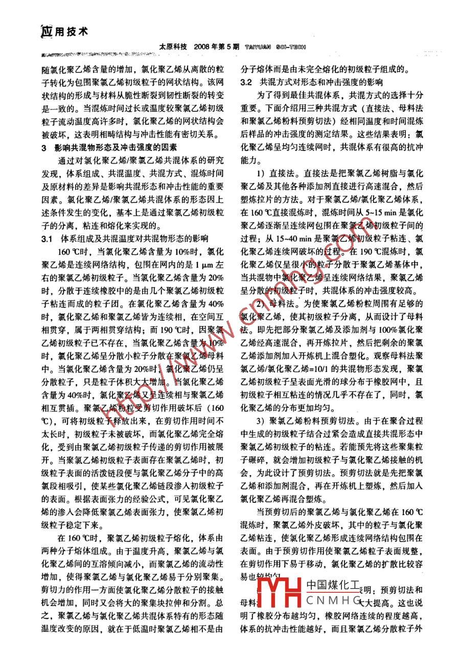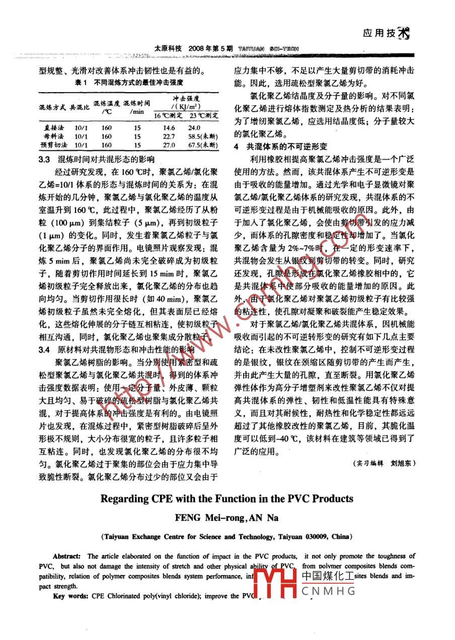 應(yīng)用技術(shù)太原科技2008年第 5期TANYUaRO 8CGD-TECN文章編號:1006- 4877(2008 )05 0077-03氯化聚乙烯在聚氯乙烯產(chǎn)品中的作用馮美榮,安娜(太原市科技交流中心,山西太原030009)摘要:從共混體系相容性、 共混物形態(tài)與性能的關(guān)系、影響共混物形態(tài)及沖擊強(qiáng)度的因素等方面,闡述了氯化聚乙烯在改善聚氯乙烯制品的沖擊性能方面的應(yīng)用。關(guān)鍵詞:氯化聚乙烯;聚氯乙烯制品;強(qiáng)度中圖分類號:TP325.3文獻(xiàn)標(biāo)志碼:A聚氯乙烯樹脂是目前世界上產(chǎn)耗量最大的塑料有一定的相容性,而又不失微粒性和分散性。氯含品種之一,由于性能優(yōu)良而被廣泛地應(yīng)用于工農(nóng)業(yè)量少于25%的氯化聚乙烯與聚氯乙烯是不相容的,及日常生活用品中。但是,聚氯乙烯樹脂也存在一不能使聚 氣乙烯的性能獲得任何改善。當(dāng)氯含量大些明顯的不足,即韌性差。聚氯乙烯樹脂本身屬脆于40%時,氯化聚乙烯與聚氯乙烯高度相容,與增硬型聚合物,對制品沖擊十分敏感,受沖擊時極易塑劑一樣起溶解作用。通常,氯含量為36%左右的脆裂,因而不能用做結(jié)構(gòu)材料,為此有必要對聚氯氯化聚乙烯是用于改善聚氯乙烯沖擊性能的主要材乙烯樹脂進(jìn)行沖擊改性。如何提高韌性而又不損害料之一。下面,就氯化聚乙烯改性聚氯乙烯的沖擊材料的拉伸強(qiáng)度和其他物性,是聚氯乙烯制品改性性能做-些介紹。中的一一個重要課題。近年來,隨著聚氯乙烯硬質(zhì)制1共混體系相容性品應(yīng)用的迅速增長,其沖擊改性問題越來越得到人共混體系相容性涉及整個系統(tǒng)的物理、化學(xué)及們的重視。用于聚氣乙烯硬質(zhì)制品的沖擊改性劑很機(jī)械性能。相容性的改變,往往對共混體系的加工多,常用的是氯化聚乙烯。性和使用性造成很大影響。因此,通過改善體系相氯化聚乙烯是聚乙烯分子中仲碳原子上的氫原容性來建立優(yōu)良的共混體系是共混改性研究的一大子被氯原子取代后得到的一種高分子無規(guī)氯化物。課題。采用不同的生產(chǎn)工藝可制得從橡膠狀到硬質(zhì)塑料狀就聚氯乙烯沖擊改性劑而言,通常要求其與聚不同的產(chǎn)品。通常氯化聚乙烯(CPE) 的性質(zhì)決定氯乙烯的相容性適中。相容性過大,兩者完全呈分于其分子量、結(jié)晶度、氯含量及氯原子在聚合物鏈子級混合, 沖擊改性劑只起著增塑劑的作用,它與上的分布。隨著氯含量的增加,氯化聚乙烯的玻璃聚氯乙烯分子緊密附著,從而使沖擊應(yīng)力直接作用化轉(zhuǎn)變溫度升高,其狀態(tài)由韌性的熱塑性材料變成于聚氯乙烯鏈上,得不到高沖擊強(qiáng)度。反之,兩者橡膠狀材料,然后變得接近皮革,最后變成硬而脆的相容性過小,達(dá)不到均一分散的目的, 沖擊改性的材料。氯化聚乙烯改性后的聚氯乙烯制品性能也劑會失去對聚氯乙烯的黏附力,無法對震動起吸收與上述因素有關(guān)。作用,沖擊強(qiáng)度亦不能提高。由于氯化聚乙烯分子氯化聚乙烯和聚氯乙烯材料的相容性主要受氯鏈?zhǔn)怯啥鄠€含氯量較高的鏈段和氯含量較低的鏈段化聚乙烯中氯含量和氣原子在聚乙烯鏈上的分布情組成,其高氯段應(yīng)與聚氯乙烯在相界面處有鏈段互況控制。氯含量為25%-40%時氯原子隨機(jī)分布的溶性,由于這樣組成的相間過渡會與聚氯乙烯相幾氯化聚乙烯樹脂為彈性體,具有一定極性,玻璃化乎相同,致使不易觀測。分析表明,正是氯化聚乙溫度較低,是聚氯乙烯的良好沖擊改性劑。這是由烯與聚氯乙烯之間的鏈段互溶性提供了兩相的黏著于含氨量為25%- 40%的氯化聚乙烯與聚氣乙烯既力, 保證了較好的力學(xué)性能中國煤化工收稿日期:2008-03-11;修回日期:2008-04-10YHC N M H G的固態(tài)結(jié)構(gòu)及共混作者簡介:馮美榮( 1965- ),女,山西運(yùn)域人。1986年7月畢結(jié)構(gòu)與沖擊性能、斷裂狀態(tài)的關(guān)系研究得知:對氯業(yè)于天津大學(xué)分校,高級工程師,總工?;垡蚁┫噙M(jìn)行的選擇性染色表明,兩相體系形態(tài).77.應(yīng)用技術(shù)太原科技2008 年第5期TIMYUA SGI-TEC0O隨氯化聚乙烯含量的增加,氯化聚乙烯從離散的粒分子熔體而是由未完全熔化的初級粒子組成的。子轉(zhuǎn)化為包圍聚氯乙烯初級粒子的網(wǎng)狀結(jié)構(gòu)。該網(wǎng)3.2 共混方式對形態(tài)和沖擊強(qiáng)度的影響狀結(jié)構(gòu)的形成與材料從脆性斷裂到韌性斷裂的轉(zhuǎn)變?yōu)榱说玫阶罴压不祗w系,共混方式的選擇十分是- -致的。當(dāng)混煉時間過長或溫度較聚氯乙烯初級重要。下面介紹用三種共混方式(直接法、母料法粒子流動溫度高許多時,氯化聚乙烯的網(wǎng)狀結(jié)構(gòu)會和聚氯乙烯粉料預(yù)剪切法)經(jīng)相同溫度和時間混煉被破壞,這表明相疇結(jié)構(gòu)與沖擊性能有密切關(guān)系。后樣品的沖擊強(qiáng)度的測定結(jié)果。這些結(jié)果表明:氯3影響共混物形態(tài) 及沖擊強(qiáng)度的因素化聚乙烯呈均勻連續(xù)網(wǎng)時,共混體系有很高的抗沖通過對氯化聚乙烯/聚氣乙烯共混體系的研究能力。發(fā)現(xiàn),體系組成、共混溫度、共混方式、混煉時間1)直接法。直接法是把聚氯乙烯樹脂與氣化及原材料的差異是影響共混形態(tài)和沖擊性能的重要聚乙烯及其他各種添加劑直接進(jìn)行高速混合,然后因素。氯化