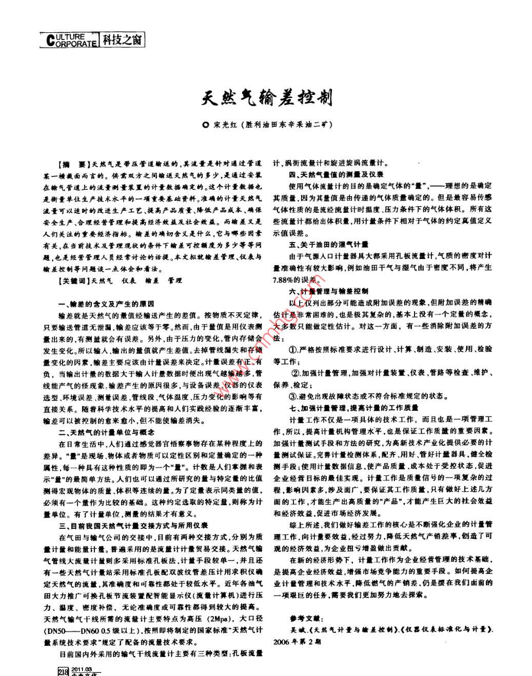 CUTRORTEI 科技之窗0 PORPORATE天然氣輸差控制。宋光紅(勝利油田東辛采油二礦)[摘要]天然氣是帶壓管道輸送的,其流量是針對通過管道 計,渦街流量計和旋進(jìn)旋渦流量計。某一橫裁面而言的。供需雙方之間輸送天然氣的多少,是通過安裝四、天然氣值的測及儀表在輸氣管道上的流量測量裝置的計量數(shù)據(jù)確定的。這個計量數(shù)據(jù)也使用氣體流量計的目的是確定氣體的“量",一理 想的是確定是街量單位生產(chǎn)技術(shù)水平的一項重要基礎(chǔ)資料。準(zhǔn)確的計量天然氣其質(zhì)量 .因為其量值是由傳遞的氣體質(zhì)量確定的。但是最容易傳愚流量可以適時的改進(jìn)生產(chǎn)工藝、提高產(chǎn)品質(zhì)量、降低產(chǎn)品成本、確保氣體性質(zhì) 的是流經(jīng)流量計時溫度、壓力條件下的氣體體積。所有這安全生產(chǎn)、合理經(jīng)營管理和提高經(jīng)濟(jì)效益及社會效益。而輸差又是些流量計都給 出體積量,用計量條件下相對于氣體的約定真值定義人們關(guān)注的重要經(jīng)濟(jì)指標(biāo)。輸差的確切含義是什么,它與哪些因素示值誤差 。有關(guān),在當(dāng)前技術(shù)及管理現(xiàn)狀的條件下輸差可控額度為多少等等阿五.關(guān)于油田的濕氣計量題,也是經(jīng)營管理人員經(jīng)常討論的話提。本文擬就輸差管理、儀表與由于氣源入口計量器具大都采用孔板流量計氣質(zhì)的密度對計輸差控制等問題談一點體會和看法。量準(zhǔn)確性有較大影響,例如油田干氣與濕氣由于密度不同,將產(chǎn)生[關(guān)鍵詞]天然氣儀表輸差管理7.88%的誤差。六、計量管理與輸差控制一、輸差的含義及產(chǎn)生的原因以上僅列出部分可能造成附加誤差的現(xiàn)象,但附加誤差的精確輸差就是天然氣的量值經(jīng)輸送產(chǎn)生的差值。按物質(zhì)不滅定律,估計是非 常困難的,也是極其復(fù)雜的,基本上沒有一個定量的概念,只要輸送管道無泄潮.輸差應(yīng)該等于零。然而,由于量值是用儀表測大多數(shù)只能做定性估計。 對這一方面, 有一些消除附加誤差的方量出來的,有測量就會有誤差。另外.由于壓力的變化,管內(nèi)存儲會法:發(fā)生變化。所以輸入、輸出的量值就產(chǎn)生差值。去掉管線漏失和存儲①.嚴(yán)格按照標(biāo)準(zhǔn)要求進(jìn)行設(shè)計、計算制造、安裝使用、檢驗量變化的因素,輸差主要應(yīng)該由計量誤差來決定。計量誤差有正、有等工作:負(fù),當(dāng)輸出計量的數(shù)據(jù)大于輸人計量數(shù)據(jù)時便出現(xiàn)氣越輸越多.管②,加強(qiáng)計量管理,加強(qiáng)對計量裝置、儀表、管路等檢查、維護(hù)、線能產(chǎn)氣的怪現(xiàn)象。輸差產(chǎn)生的原因很多,與設(shè)備誤差、儀器的儀表保養(yǎng) 檢定;選型、環(huán)境誤差、測量誤差,管線段,氣體溫度、壓力變化的影響等有③避免出現(xiàn)故障狀態(tài)或不符合標(biāo)準(zhǔn)規(guī)定的狀態(tài)。直接關(guān)系。隨著科學(xué)技術(shù)水平的提高和人們實踐經(jīng)驗的逐漸豐富,七、加強(qiáng)計量管理,提高計量的工作質(zhì)量輸差可以被控制的愈來愈小,但不能使輸差消失。計量工作不僅是- -項具體的技術(shù)工作,而且也是一項管理工二、天然氣的計量單位與概念作,所以.提離計量機(jī)構(gòu)管理水平.也是保證工作質(zhì)量的重要因素。在日常生活中,人們通過感覺器官悟察事物存在某種程度上的加強(qiáng)計量測試手 段和方法的研究.為高新技術(shù)產(chǎn)業(yè)化提供必要的計差異?!傲?是現(xiàn)場物體或者物質(zhì)可以定性區(qū)別和定量確定的一種量測試保證 。完善計量檢測體系,配齊、用好、管好計量器具,健全檢屬性.每一種具有這種性質(zhì)的即為-個"量"。計數(shù)是人們掌攆和表測手段;使用計量數(shù)據(jù)信息,使產(chǎn) 品質(zhì)量成本處于受控狀態(tài)促進(jìn)示"量"的最簡單方法。人們也可以通過所研究的量與特定量的比值企 業(yè)經(jīng)營目標(biāo)的最佳實現(xiàn)。計量工作是質(zhì)量信號的-項復(fù)雜的過測得宏觀物體的質(zhì)量體積等連續(xù)的量。為了定量表示同類量的值,程 ,影響因素多,涉及面廣,要保證其工作質(zhì)量,只有做好上述幾方必須有一個量作為比較的基礎(chǔ)。這種約定選取的特定量,則稱為計面的 工作,才能生產(chǎn)出高質(zhì)量的"產(chǎn)品,才能產(chǎn)生巨大的社會效益量單位。有了計量單位,測量的結(jié)果才有意義。和經(jīng)濟(jì)效益,促進(jìn)市場經(jīng)濟(jì)發(fā)展。三.目前我國天然氣計量交接方式與所用儀表綜上所述.我們做好輸差工作的核心是不斷強(qiáng)化企業(yè)的計量管在氣田與輸氣公司的交接中,目前有兩種交接方式,分別為質(zhì)理工作 ,向計量要效益,經(jīng)過努力,降低天然氣產(chǎn)銷差率,創(chuàng)造了可1 t計量和能量計量。普遍采用的是流量計計量貿(mào)易交接。天然氣輸觀的經(jīng)濟(jì) 效益,為企業(yè)扭虧增盈做出貢獻(xiàn)。氣管線大流量計量則多采用標(biāo)準(zhǔn)孔板法.計量手段較單- - ,并且還在新的經(jīng)濟(jì)形勢下,計量工作作為企業(yè)經(jīng)營管理的技術(shù)基礎(chǔ),有一些天然氣計量站采用標(biāo)準(zhǔn)孔板配雙波紋管差壓計用求積儀確是 提高企業(yè)經(jīng)濟(jì)效益,