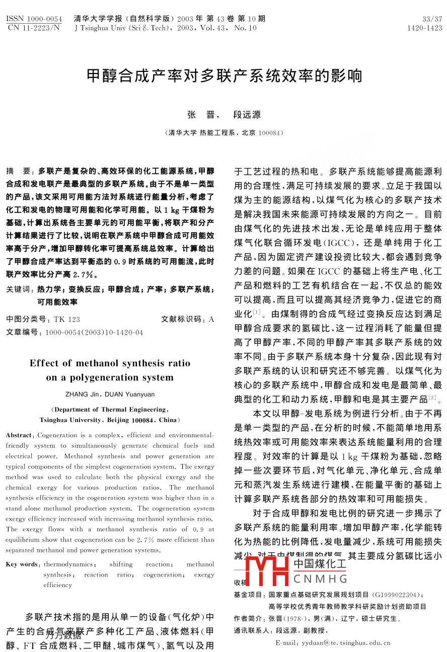 N1000-0清華大學學報(自然科學版)2003年第43卷第10期J Tsinghua Univ(Sci & Tech), 2003. Vol 43, No. 10420-1423甲醇合成產(chǎn)率對多聯(lián)產(chǎn)系統(tǒng)效率的影響張晉,段遠源(清華大學熱能工程系,北京100084)摘要:多聯(lián)產(chǎn)是復(fù)雜的、髙效環(huán)保的化工能源系統(tǒng),甲醇于工藝過程的熱和電。多聯(lián)產(chǎn)系統(tǒng)能夠提高能源利合成和發(fā)電聯(lián)產(chǎn)是最典型的多聯(lián)產(chǎn)系統(tǒng)由于不是單一類型用的合理性滿足可持續(xù)發(fā)展的要求。立足于我國以的產(chǎn)品,該文采用可用能方法對系統(tǒng)進行能量分析,考慮了煤為主的能源結(jié)構(gòu),以煤氣化為核心的多聯(lián)產(chǎn)技術(shù)化工和發(fā)電的物理可用能和化學可用能。以1kg干煤粉為是解決我國未來能源可持續(xù)發(fā)展的方向之一。目前基礎(chǔ),計算出系統(tǒng)各主要單元的可用能平衡,將聯(lián)產(chǎn)和分產(chǎn)計算結(jié)果進行了比較,說明在聯(lián)產(chǎn)系統(tǒng)中甲醇合成可用能效由煤氣化的先進技術(shù)出發(fā),無論是單純應(yīng)用于整體率高于分產(chǎn),增加甲醇轉(zhuǎn)化率可提高系統(tǒng)總效率。計算給出煤氣化聯(lián)合循環(huán)發(fā)電(IGCC),還是單純用于化工了甲醇合成產(chǎn)率達到平衡態(tài)的0.9時系統(tǒng)的可用能流,此時產(chǎn)品,因為固定資產(chǎn)建設(shè)投資比較大都會遇到競爭聯(lián)產(chǎn)效率比分產(chǎn)高2.7%。力差的問題。如果在IGCC的基礎(chǔ)上將生產(chǎn)電、化工關(guān)鍵詞:熱力學;變換反應(yīng);甲醇合成;產(chǎn)率;多聯(lián)產(chǎn)系統(tǒng)產(chǎn)品和燃料的工藝有機結(jié)合在一起,不僅總的能效可用能效率可以提高,而且可以提高其經(jīng)濟競爭力,促進它的商中圖分類號:TK123文獻標識碼:業(yè)化。由煤制得的合成氣經(jīng)過變換反應(yīng)達到滿足1000-0054(2003)10-1420-04甲醇合成要求的氬碳比,這一過程消耗了能量但提高了甲醇產(chǎn)率,不同的甲醇產(chǎn)率其多聯(lián)產(chǎn)系統(tǒng)的效Effect of methanol synthesis ratio率不同由于多聯(lián)產(chǎn)系統(tǒng)本身十分復(fù)雜,因此現(xiàn)有對多聯(lián)產(chǎn)系統(tǒng)的認識和研究還不夠完善。以煤氣化為on a polygeneration system核心的多聯(lián)產(chǎn)系統(tǒng)中,甲醇合成和發(fā)電是最簡單、最ZHANG Jin, DUAN Yuanyuan典型的化工和動力系統(tǒng),甲醇和電是其主要產(chǎn)品。Department of Therma本文以甲醇發(fā)電系統(tǒng)為例進行分析。由于不再nghua University, Beijing 100084, Chin是單一類型的產(chǎn)品,在分析的時候,不能簡單地用系A(chǔ)bstract: Cogeneration is a complex, efficient and environmentalfriendly system to simultaneously generate chemical fuels and統(tǒng)熱效率或可用能效率來表達系統(tǒng)能量利用的合理electrical power. Methanol synthesis and power generation are程度。對效率的計算是以1kg干煤粉為基礎(chǔ),忽略ypical components of the simplest cogeneration system, e exergy掉一些次要環(huán)節(jié)后,對氣化單元、凈化單元、合成單method was used to calculate both the physical exergy and thehemical exergy for various production ratios, The methanol元和蒸汽發(fā)生系統(tǒng)進行建模,在能量平衡的基礎(chǔ)上synthesis efficiency in theeration system was higher than in a計算多聯(lián)產(chǎn)系統(tǒng)各部分的熱效率和可用能損失。stand alone methanol production system. The cogeneration systemexergy efficiency increased with increasing methanol synthesis ratio對于合成甲醇和發(fā)電比例的研究進一步揭示了ws with a met hay多聯(lián)產(chǎn)系統(tǒng)的能量利用率。增加甲醇產(chǎn)率,化學能轉(zhuǎn)quilibrium show that cogeneration can be27% more efficient than化為熱能的比例降低,發(fā)電量減少,系統(tǒng)可用能損失separated methanol ando: cogenera. meth減小中柑生組的柑氣其主要成分氫碳比遠generation systems.Key words: thermodynamics; shifting reactie中國煤化工reactCNMHG基金項目:國家重點基礎(chǔ)研究發(fā)展規(guī)劃項目(G1999022304)高等學校優(yōu)秀青年教師教學科研獎勵計劃資助項目多聯(lián)產(chǎn)技術(shù)指的是用從單一的設(shè)備(氣化爐)中作者簡介:張晉(1978-),男(滿),遼寧,碩士研究生產(chǎn)生的合氖產(chǎn)多種化工產(chǎn)品液體燃料(甲通訊聯(lián)系人:段遠源,副教授淳、FT合成燃料、二甲醚、城市煤氣)、氫氣以及用E-mail:yyduan@tetsinghua.edu.cn張晉,等:甲醇合成產(chǎn)率對多聯(lián)產(chǎn)系統(tǒng)效率的影響1421于2:1(甲醇合成反應(yīng)中H、CO化學計量比),2系統(tǒng)的能量平衡和物質(zhì)平衡因此為增加甲醇產(chǎn)率需要調(diào)整水煤氣變換過程中的煤氣成分,對該過程的設(shè)計和比較是本文的研究目針對多聯(lián)產(chǎn)系統(tǒng)的流程,本文以1kg山西晉城的之9無煙煤干煤粉為基礎(chǔ)進行計算,煤的主要化學元素、水份和灰份的質(zhì)量分數(shù)w結(jié)果見表11多聯(lián)產(chǎn)的原則性系統(tǒng)圖表1山西晉城9無煙煤空氣干燥基成分%圖1所示為甲醇合成和發(fā)電的多聯(lián)產(chǎn)系統(tǒng)的簡水份(HO)灰份(A) S CHN O化流程。22.412.0266.181.90.622.69硫問收}硫單質(zhì)該組分在干法氣化爐中對氣化劑配比的優(yōu)化結(jié)變換器}一匚脫硫}“匚脫碳了果為氧煤質(zhì)量比0.75,水煤質(zhì)量比0.20-4。根據(jù)氣窄分壓氣機空
