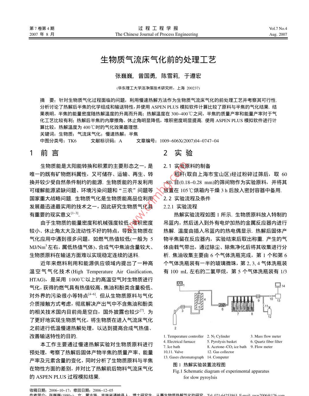 第7卷第4期過程工程學報Vol.7 No.42007年8月The Chinese Journal of Process EngineeringAug. 2007生物質氣流床氣化前的處理工藝張巍巍,曾國勇,陳雪莉,于遵宏(華東理工大學潔凈煤技術研究所,上海200237)摘要:針對生物質氣化過程面臨的問題,利用慢速熱解方法作為生物質氣流床氣化的前處理工藝并考察其可行性.分析討論了熱解后半焦的化學組成和輸送特性,并使用ASPEN PLUS模擬軟件計算比較了原料與半焦的氣化結果.結果表明,半焦的能量密度隨熱解溫度的升高而升高;熱解溫度在300- 400C之間,半焦的質量產率和能量產率對于氣化工藝比較有利;熱解后半焦的內摩擦角、體止角明顯降低,堆積密度明顯提高.使用ASPEN PLUS模擬軟件進行計算比較,熱解溫度為400C時的氣化效果最理想.關鍵詞:生物質;氣流床氣化;慢速熱解;半焦中圖分類號: TK文獻標識碼: A文章編號: 1009 -606X(2007)04- -0747-041前言2實驗生物質能是太陽能轉換和積累的主要形態(tài)之一,是2.1實驗原料的制備唯一的既有礦物燃料屬性,又可儲存、運輸、再生、轉稻稈(取自.上海市寶山區(qū))經過粉碎過篩后,取60換并較少受自然條件制約的能源.生物質能的開發(fā)利用-80 目(0.18-0.28 mm)的篩間物作為實驗原料,并將其可緩解能源緊缺問題、環(huán)境污染問題和“三農”問題等放置在105C烘箱內干燥3 h后放入密封容器中備用.國家重大戰(zhàn)略問題.生物質氣化是生物質能高品位利用2. 2實驗流程及條件發(fā)展最迅速最實用的技術之一- ,因此研究生物質氣化具2.2.1實驗流程有重要的現實意義1-31.熱解實驗流程如圖1所示.生物質原料放入特制的由于生物質的能量密度和機械強度較低、堆積密度吊籃內,然后送入到外有電爐加熱的金屬反應器內進行較小、休止角太大及流動性不好的特點,導致生物質在熱解.溫度由插入吊籃內的熱電偶顯示.熱解后固體產氣化應用中遇到很多問題,如燃氣熱值較低(一般為5物半焦留在反應器內,實驗結束后取出稱重.產生的氣MJNm'左右,屬低熱值氣體)、合成氣中焦油含量較大、體由載 氣帶出,通過除塵、除焦凈化后將其收集進行分生物質原料在輸送方面難以實現穩(wěn)定連續(xù)的送料.析.焦油收集主要由6個氣體洗瓶完成,第1個和第6近年來燃料利用和能源供應領域內提出了一種高個氣體洗瓶裝有一半的玻璃微珠, 第2, 3,4氣體洗瓶裝溫空氣氣化技術(High Temperature Air Gasification, 有 100 mL左右的二氯甲烷,第5個氣體洗瓶裝有1/3HTAG),是采用1000 C以上的高溫空氣對生物質進行Q14氣化,獲得的燃氣具有熱值較高、焦油和酚類含量極低、對外界的污染很小等特點[4-61.但從生物質原料與氣化介質接觸方式考慮,徹底解決產出氣中不含焦油和酚類的相關技術國內目前尚是空白,國外披露也較少7。為了更好地實現生物質氣化,將生物質在進入氣流床氣化之前進行低溫慢速熱解處理,以達到提高合成氣熱值、改善輸送特性的目的.emper2. N2 Cylinder3. Mass flow meter本工作主要通過慢速熱解實驗對生物質原料進行4. Electrical furmace5. Pyrolysis basket6. Quartz fiber filter8. Acetone- CO2 ice bath 9. Flow meter預處理,考察了熱解后固體產物半焦的質量產率、能量10.11. Valve12. Gas cllector13. Gases chromatograph 14. Computer產率及元素含量的變化,同時分析了生物質原料與半焦圖1熱解實驗裝置流程圖在物性方面的差別,并對比了熱解前后物料氣流床氣化Fig.1 Schematic diagram of experimental apparatus的ASPEN PLUS過程模擬結果.for slow pyroylsis收稿日期: 2006- -10-17,修回日期: 2006 -12-052張蹦飾11080七楚士旌,士林省通榆后748過程工程學報第7卷的玻璃微珠和50 mL二氯甲烷.前4個氣體洗瓶放入冰煤質儀器廠生產的5E-1AC/M自動量熱儀測得,從表可浴中,后2個氣體洗瓶放入丙酮和干冰的混合液中.以看出,隨著熱解溫度的升高,半焦的碳元素含量明顯2.2.2實驗條件增加,氧元素含量明顯降低;半焦的熱值也比原料的熱實驗開始前,用氮氣將反應器中的空氣排凈.熱解值顯著提高.說明熱解可以明顯地提高生物質的能量密終溫為300- -550'C,升溫速率為5"C/min.通過設定控度溫儀.上的參數,使爐膛內的溫度程序升溫至目標溫度,3.2半焦的質量產率和能量產率恒溫- -定時間,尾氣管口沒有氣體產生時認為反應結束.質量產率ηM和能量產率n的定義如下8:3結果 與討論"artshOHV。mbiomassne=nmMOHV3.1熱解后半焦的熱值及元素分析結果表1比較了原料與半焦各元素含量及熱值的差別.式中,mchartash 和mbiomas分別為熱解后焦炭與灰分的質C, H, O, N, s元素含量由德國Elementar 公司生產的量和生物質原料的質量, 0HVcm和OHVbiomass分別為半Vario MACRO元素分析儀進行定量分析,熱值由長沙焦和生物質原料的熱值.表1原料與半焦的元素分析及熱值的比較Table 1Comparison of ultimate analysis and higher heat value (HHV) of straw and semi-charUltimate analysis (%)”SampleHigher heat value (MJ/kg)CHNStraw5.6040.290.520.2017.23300 C. semi-char58.834.3116.371.1023.72400’C. semi-char62.813.238.451.1224.03500 C semi-char2.576.241.210.4324.58550 C semi-char2.23.021.124. 54Note: 1) Mass percentage on dry basis; 2) By difference.圖2給出了半焦的質量產率和能量產率隨熱解溫度生物質堆積密度小,難以實現穩(wěn)定連續(xù)的輸送,所以考的變化關系.由圖可見,半焦的質量產率和能量產率都察低溫慢速熱解前后物料的物性參數變化對輸送性能隨著熱解溫度的升高而降低,且溫度越高,降低的幅度的影響.影響輸送性能的主要參數有堆