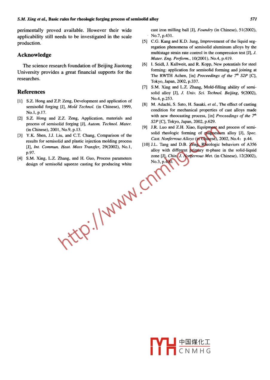 Journal of University of Science and Technology BeijingMaterialsVolume I1, Number 6, December 2004, Page 566Basic rules for rheologic forging process of semisolid alloyShuming Xing, Lizhong Zhang, Jianbo Tan, Chuanlin Zheng, Hanwu Liu, Peng Zhang, and Yunhui DuSemisolid Processing Research Center, Beijing Jiaotong University, Beijng 100044, China(Received 2004-01-28)Abstract: Semisolid mold forging is a major type of semisolid processing, which is different from neither traditional mold forgingnor traditional permanent casting. However, processing defects are often seen in work pieces because of lacking available rules forthe process design and control. Some basic rules for the process design and control, simply named the shortest flowing length, pres-sure flling and the minimum uplifting mold pressure, are advanced in the paper based on amount of researches and experiments. Theequations to determine the major process parameters are given out such as the flling pressure, forming pressure and locking moldpressure for the process design and control. The rules and equations are experimentally proved available and applicable by severalactual work pieces produced by the semisolid forging process.Key words: semisolid alloy; theologic forming; mold-forge; process design; rule1 Introductionsolid forging process or the liquid casting process. Ifthe process design and control is not reasonable, someSemisolid forging, a new process to make metalsdefects will be seen in the products.and alloys shaped, is a major type of semisolid form-ing process. Its obvious advantages are easier to pro-Although some suggestions for the process designduce complex work pieces because of its excellentand control can be seen in some papers [5, 6], the .forming ability, more flexible to shape, and morespecific and complete rules are still necessary to ex-compact in the inner quality for its high pressure thanplore in detail. Three basic rules for the semisolidthe semisolid die casting process. Although there areforging process design and control and three basicmany examples to successfully produce work piecesequations used to determine the process parametersby the process in the world [1, 2], the process defectsare experimentally and theoretically advanced in thesuch as shrinkages, cracks, cold shut, shut run and sopaper according to previous researches and recent ex-on are often seen in the products due to lacking valu-perimental results.able design rules [3, 4]. So it is necessary and urgentto build basic rules for the design and control of the2 Three Basic rulessemisolid rheologic forging process.To determine the process project is a key task in theIt is known that a semisolid process is generally di-process design, especially in the selction of formingvided into two essential types, one is called rheologicequipment and mold designs. The major contents of aforming process, the other is named thixologic form-process project include determining the forming situa-ing process. Similarly, the semisolid forging processtion of a wok piece, selecting the dividing mold planes,can also be divided into two types: semisolidcalculating the key process parameters such as therheologic forging process and semisolid thixologicfilling pressure, locking mold pressure and formingprocess. In the later process the billets used to formpressure, and deciding the number and shapes of the:an keep a certain shape even at the semisolid tem-core used to form inner holes. Although a processperature, therefore its process design and control isproject is strongly relative to the shape and demandssimilar to the traditional forging process of solid mate-IL ovist some common princi-rials. However, in the rheologic forge process, the中國煤化工by tereicall and ex-charge used to form is semisolid slurry that can flow:YHC N M H Ghe common basic princi-like common liquid without any special shapes. So theples or rules are: (1) the shortest flowing length, i.e.process design and control for the rheologic forginghe length to be filled must be shorter than the limitprocess is a special problem differing from either theflowing length of the alloy; (2) pressure filling, whichCorresponding author: Shuming Xing, E-mail: smxing@ center.nju.cdu.cnS.M. Xing et al, Basic rules for rheologic forging process of semisolid alloy567demands the most parts of the mold forcefully flledlIn fact the limit flowing length of semisolid slurryby a pressure, ie. the mold is filled with pressure andis relative to the dimensions of flowing channels. Theavoiding filling without pressure as much as possible;larger the section area of flowing channels, the smaller(3) the minimum uplifing mold pressure, i.e. keep thethe loss of pressure and temperature during the flow-pressure to uplift mold less than that to lock mold.ing process, and therefore the longer the limit flowinglength. As a result, the SFL rule is an equivalence ofIf the first rule is violated in the process design orthe maximum flowing section area rule.control, the work piece cannot be completely formedat all. If the second one is breached, it is difficult toIn usage of the SFL rule, it is important to know theobtain a dense work piece. If the third one is violated,effects of process factors and slurry factors on thethe process cannot carry out because of safety or eco-limit flowing length. An equation to determine thenomics. Only if the three basic principles or rules arelimit flowing length Lmax of slurry with a criticalabided well, a fine product may be produced out.stress Tc flowing through a circle pipe with radius Racted by the pressure p; has been theoretically and ex-2.1 The shortest flowing length (SFL) ruleperimentally deduced by S.M. Xing and L.Z. ZhangThe essence of the semisolid rheologic forging is a[5], shown as:process to make semisolid slurry flow into molds, beLmax=PLR(1)solidified into solid and compensate the shrinkage un-Tcder the action of a pressure. However, semisolid slurryFrom equation (1), i