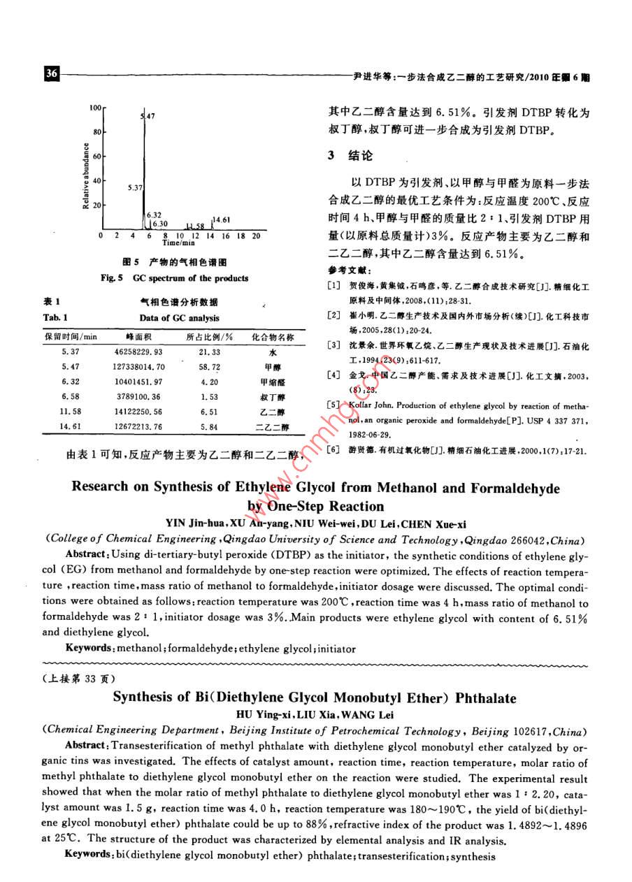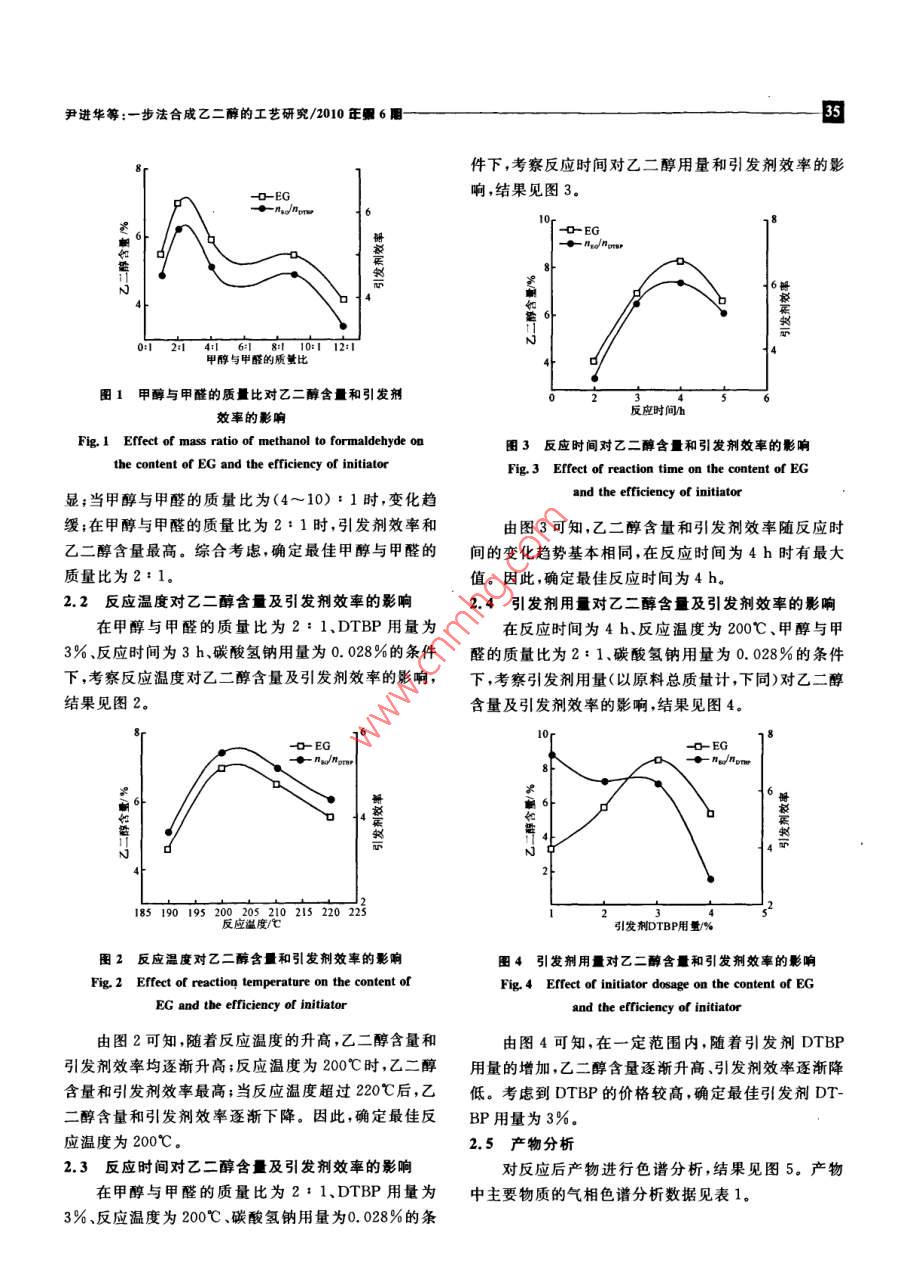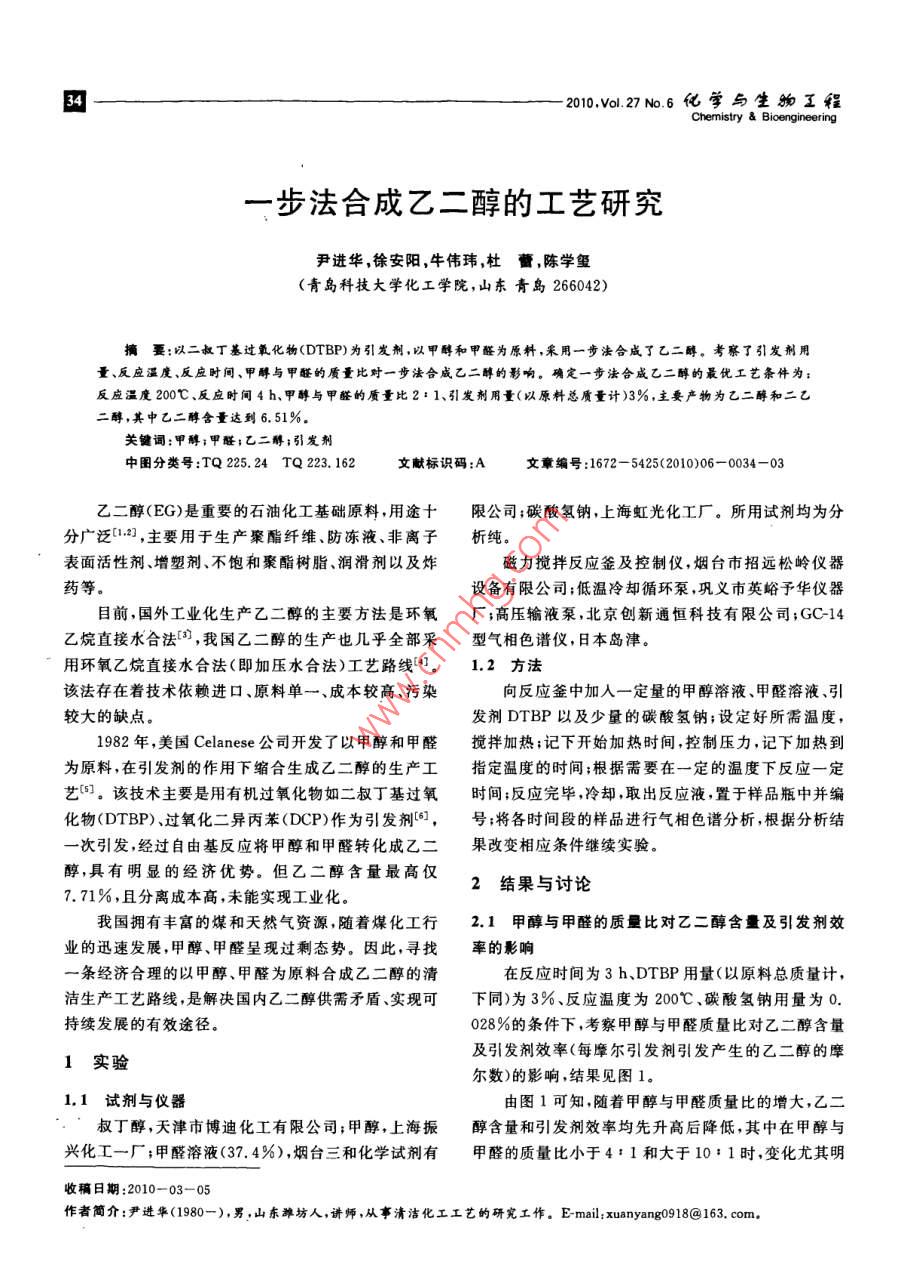 2010vo27№.6化學(xué)與生物工Chemistry Bioengineering步法合成乙二醇的工藝研究尹進(jìn)華,徐安陽,牛偉瑋,杜蕾,陳學(xué)璽(青島科技大學(xué)化工學(xué)院,山東青島266042)摘要:以二叔丁基過氧化物(DTBP)為引發(fā)劑,以甲醇和甲醛為原料,采用一步法合成了乙二醇。考察了引發(fā)劑用量、反應(yīng)溫度、反應(yīng)時(shí)間、甲醇與甲醛的質(zhì)量比對一步法合咸乙二醇的影響。確定一步法合成乙二醇的最優(yōu)工藝條件為反應(yīng)溫度200℃、反應(yīng)時(shí)間4h、甲醇與甲醛的質(zhì)量比2:1、引發(fā)劑用量(以原料總質(zhì)量計(jì))3%,主要產(chǎn)物為乙二酶和二乙二醇,其中乙二醇含量達(dá)到6.51%關(guān)鍵詞:甲醇;甲醛;乙二醇;引發(fā)劑中圖分類號:TQ225.24TQ223.162文獻(xiàn)標(biāo)識碼:A文章編號:1672-5425(2010)06-0034-03乙二醇(EG)是重要的石油化工基礎(chǔ)原料,用途十限公司;碳酸氫鈉,上海虹光化工廠。所用試劑均為分分廣泛[2,主要用于生產(chǎn)聚酯纖維、防凍液、非離子析純。表面活性劑、增塑劑、不飽和聚酯樹脂、潤滑劑以及炸磁力攪拌反應(yīng)釜及控制儀,煙臺市招遠(yuǎn)松嶺儀器藥等。設(shè)備有限公司;低溫冷卻循環(huán)泵,鞏義市英峪予華儀器目前,國外工業(yè)化生產(chǎn)乙二醇的主要方法是環(huán)氧廠;高壓輸液泵,北京創(chuàng)新通恒科技有限公司;GC-14乙烷直接水合法,我國乙二醇的生產(chǎn)也幾乎全部采型氣相色譜儀,日本島津。用環(huán)氧乙烷直接水合法(即加壓水合法)工藝路線。1.2方法該法存在著技術(shù)依賴進(jìn)口、原料單一、成本較高、污染向反應(yīng)釜中加入一定量的甲醇溶液、甲醛溶液、引較大的缺點(diǎn)發(fā)劑DTBP以及少量的碳酸氫鈉;設(shè)定好所需溫度,1982年,美國 Celanese公司開發(fā)了以甲醇和甲醛攪拌加熱;記下開始加熱時(shí)間,控制壓力,記下加熱到為原料,在引發(fā)劑的作用下縮合生成乙二醇的生產(chǎn)工指定溫度的時(shí)間;根據(jù)需要在一定的溫度下反應(yīng)一定藝(。該技術(shù)主要是用有機(jī)過氧化物如二叔丁基過氧時(shí)間;反應(yīng)完畢,冷卻,取出反應(yīng)液,置于樣品瓶中并編化物(DTBP過氧化二異丙苯(DCP)作為引發(fā)劑,號;將各時(shí)間段的樣品進(jìn)行氣相色譜分析,根據(jù)分析結(jié)次引發(fā),經(jīng)過自由基反應(yīng)將甲醇和甲醛轉(zhuǎn)化成乙二果改變相應(yīng)條件繼續(xù)實(shí)驗(yàn)醇,具有明顯的經(jīng)濟(jì)優(yōu)勢。但乙二醇含量最高僅2結(jié)果與討論7.71%,且分離成本高,未能實(shí)現(xiàn)工業(yè)化我國擁有豐富的煤和天然氣資源,隨著煤化工行2.1甲醇與甲醛的質(zhì)量比對乙二醇含量及引發(fā)劑效業(yè)的迅速發(fā)展,甲醇、甲醛呈現(xiàn)過剩態(tài)勢。因此,尋找率的影響一條經(jīng)濟(jì)合理的以甲醇、甲醛為原料合成乙二醇的清在反應(yīng)時(shí)間為3h、DTBP用量(以原料總質(zhì)量計(jì)潔生產(chǎn)工藝路線,是解決國內(nèi)乙二醇供需矛盾、實(shí)現(xiàn)可下同)為3%反應(yīng)溫度為200℃、碳酸氫鈉用量為0.持續(xù)發(fā)展的有效途徑028%的條件下,考察甲醇與甲醛質(zhì)量比對乙二醇含量1實(shí)驗(yàn)及引發(fā)劑效率(每摩爾引發(fā)劑引發(fā)產(chǎn)生的乙二醇的摩爾數(shù))的影響,結(jié)果見圖1。1,1試劑與儀器由圖1可知,隨著甲醇與甲醛質(zhì)量比的增大,乙叔丁醇,天津市博迪化工有限公司;甲醇,上海振醇含量和引發(fā)劑效率均先升高后降低,其中在甲醇與興化工一廠;甲醛溶液(37.4%),煙臺三和化學(xué)試劑有甲醛的質(zhì)量比小于4:1和大于10:1時(shí),變化尤其明收稿日期:2010-03-05作者簡介:尹進(jìn)華(1980一),男,山東濰坊人,講師,從事清潔化工工藝的研究工作。E-mail:xuanyang0918@163.com,尹進(jìn)華等:-步法合成乙二醇的工藝研究/2010正6件下,考察反應(yīng)時(shí)間對乙二醇用量和引發(fā)劑效率的影響結(jié)果見圖3甲醇與甲醛的質(zhì)量比圖1甲醇與甲醛的質(zhì)量比對乙二醇含量和引發(fā)劑效率的影響Fig 1 Effect of mass ratio of methanol to formaldehyde on圖3反應(yīng)時(shí)間對乙二醇含量和引發(fā)荊效率的影響the content of EG and the efficiency of initiatorFig 3 Effect of reaction time on the content of EG顯;當(dāng)甲醇與甲醛的質(zhì)量比為(4~10):1時(shí),變化趨and the efficiency of initiator緩;在甲醇與甲醛的質(zhì)量比為2:1時(shí),引發(fā)劑效率和由圖3可知,乙二醇含量和引發(fā)劑效率隨反應(yīng)時(shí)乙二醇含量最高。綜合考慮,確定最佳甲醇與甲醛的間的變化趨勢基本相同,在反應(yīng)時(shí)間為4h時(shí)有最大質(zhì)量比為2:1。值。因此,確定最佳反應(yīng)時(shí)間為4h。2.2反應(yīng)溫度對乙二醇含量及引發(fā)劑效率的影響2.4引發(fā)劑用量對乙二醇含量及引發(fā)劑效率的影響在甲醇與甲醛的質(zhì)量比為2:1、DTBP用量為在反應(yīng)時(shí)間為4h反應(yīng)溫度為200℃、甲醇與甲3%反應(yīng)時(shí)間為3h碳酸氫鈉用量為0.028%的條件醛的質(zhì)量比為2:1、碳酸氫鈉用量為0.028%的條件下,考察反應(yīng)溫度對乙二醇含量及引發(fā)劑效率的影響,下,考察引發(fā)劑用量(以原料總質(zhì)量計(jì),下同)對乙二醇結(jié)果見圖2。含量及引發(fā)劑效率的影響,結(jié)果見圖4。1851901955210215220引發(fā)劑DTBP用量%圖2反應(yīng)溫度對乙