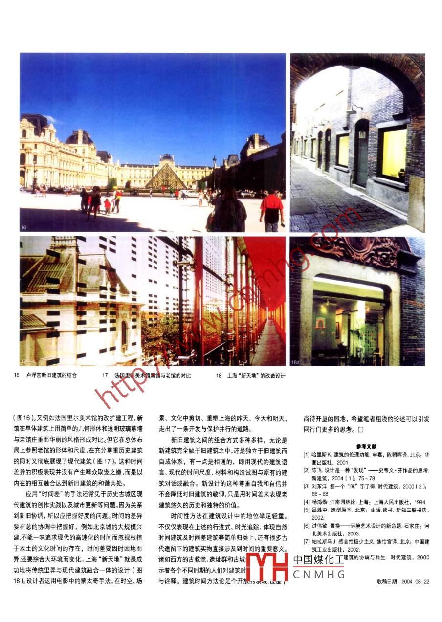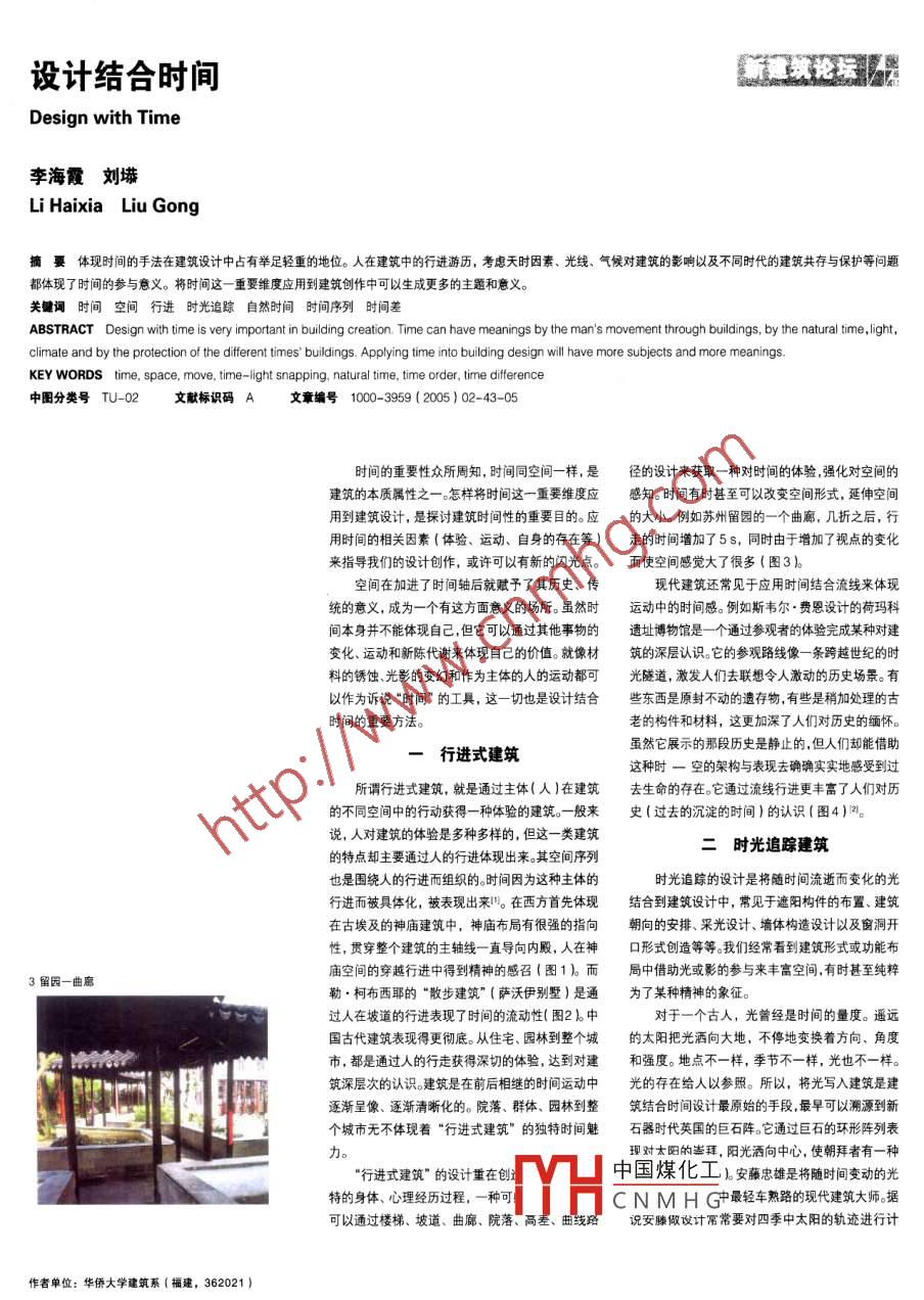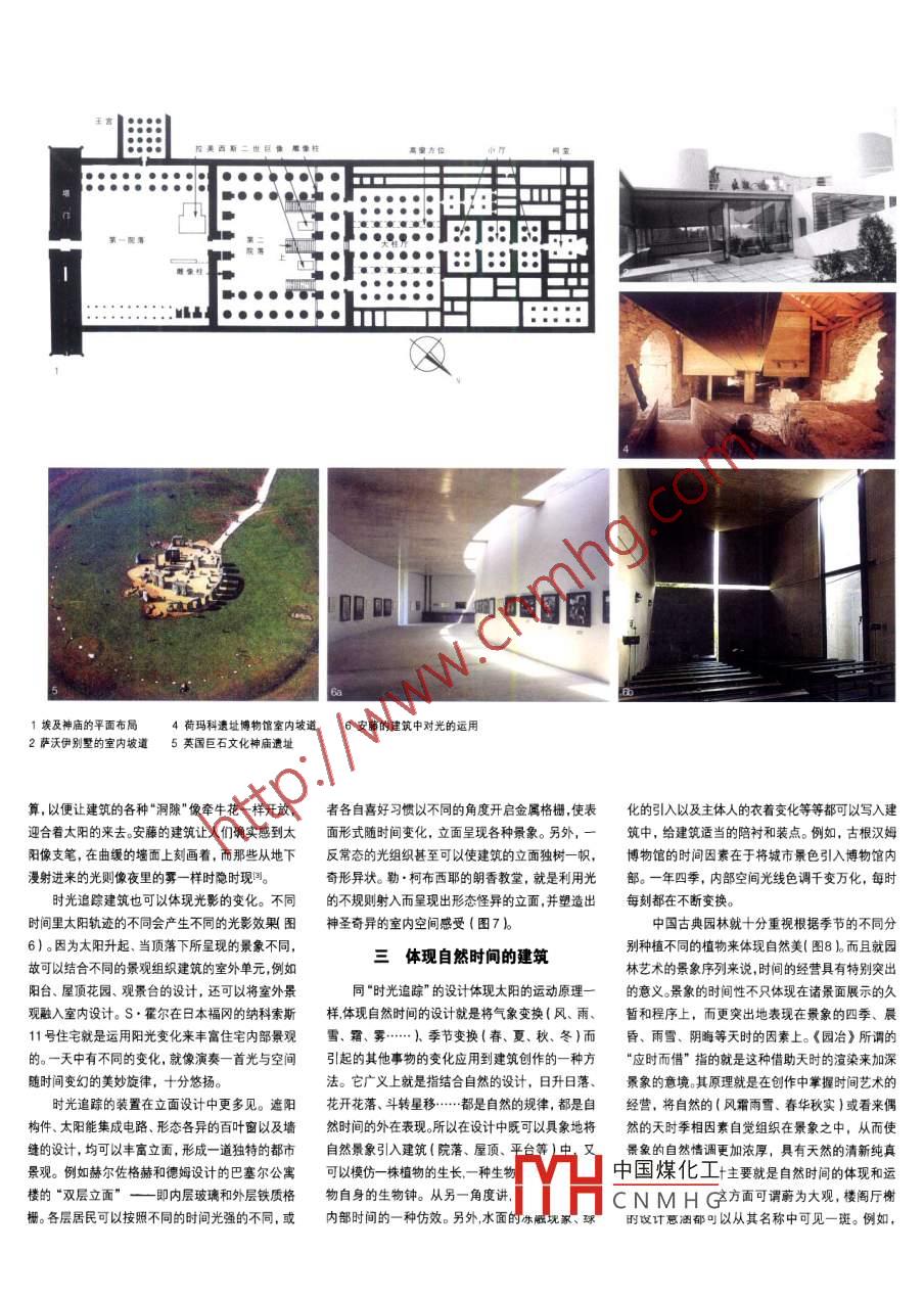 設計結(jié)合時間新建筑論壇潤西器Design with Time李海霞劉堞Li Haixia Liu Gong摘要體現(xiàn)時間的手法在建筑設計中占有舉足輕重的地位。人在建筑中的行進游歷,考慮天時因素、光線、氣候?qū)ㄖ挠绊懸约安煌瑫r代的建筑共存與保護等問題都體現(xiàn)了時間的參與意義。將時間這一重要維 度應用到建筑創(chuàng)作中可以生成更多的主題和意義。關(guān)鍵詞時間空間行進時光追蹤自然時間時間序列時間差ABSTRACT Design with time is very important in building creation. Time can have meanings by the man's movement through buildings, by the natural time,ight,climate and by the protection of the diterent times' buildings. Applying time into building design will have more subjects and more meanings.KEY WORDS time, space, move, time -light snapping, natural time, time order, time dfference中圈分類號TU-02文獻標識碼A文章編號 1000-3959 (2005)02-43-05時間的重要性眾所周知,時間同空間一樣,是徑的設計來獲取一種對時間的體驗,強化對空間的建筑的本質(zhì)屬性之一。怎樣將時間這一重要維度應感知。時間有時甚至可以改變空間形式,延伸空間用到建筑設計,是探討建筑時間性的重要目的。應的大小。例如蘇州留園的一一個曲廊, 幾折之后,行用時間的相關(guān)因素(體驗、運動、自身的存在等)走的時間增加了5 s,同時由于增加了視點的變化來指導我們的設計創(chuàng)作,或許可以有新的閃光點。而使空間感覺大了很多(圖3)??臻g在加進了時間軸后就賦予了其歷史、傳現(xiàn)代建筑還常見于應用時間結(jié)合流線來體現(xiàn)統(tǒng)的意義,成為一個有這方面意義的場所。雖然時運動中的時間感。例如斯韋爾.費恩設計的荷瑪科間本身并不能體現(xiàn)自己,但它可以通過其他事物的遺址博物館是一個通過參觀者的體驗完成某種對建變化、運動和新陳代謝來體現(xiàn)自己的價值。就像材筑的深層認識。它的參觀路線像- - 條跨越世紀的時料的銹蝕、光影的變幻和作為主體的人的運動都可光隧道,激發(fā)人們?nèi)ヂ?lián)想令人激動的歷史場景。有以作為訴說“時間"的工具,這一切也是設計結(jié)合些東西是原封不動的遺存物,有些是稍加處理的古時間的重要方法。老的構(gòu)件和材料,這更加深了人們對歷史的緬懷。雖然它展示的那段歷史是靜止的,但人們卻能借助一行進式建筑這種時- -空的架構(gòu)與表現(xiàn)去確確實實地感受到過所謂行進式建筑,就是通過主體(人)在建筑去生命的存在。它通過流線行進更豐富了人們對歷的不同空間中的行動獲得-種體驗的建筑。一般來史(過去的沉淀的時間)的認識(圖4)2。說,人對建筑的體驗是多種多樣的,但這一-類建筑二時光追蹤建筑的特點卻主要通過人的行進體現(xiàn)出來。其空間序列也是圍繞人的行進而組織的。時間因為這種主體的時光追蹤的設計是將隨時間流逝而變化的光行進而被具體化,被表現(xiàn)出來"。在西方首先體現(xiàn)結(jié)合到建筑設計中,常見于遮陽構(gòu)件的布置、建筑在古埃及的神廟建筑中,神廟布局有很強的指向朝向的安排、采光設計、墻體構(gòu)造設計以及窗洞開性,貫穿整個建筑的主軸線一直導向內(nèi)殿, 人在神口形式創(chuàng)造等等。我們經(jīng)??吹浇ㄖ问交蚬δ懿紡R空間的穿越行進中得到精神的感召(圖1)。而局中借助光或影的參與來豐富空間,有時甚至純粹3留園一曲廊勒.柯布西耶的“散步建筑”(薩沃伊別墅)是通為了某種精神的象征。過人在坡道的行進表現(xiàn)了時間的流動性(圖2)中對于- -個古人,光曾經(jīng)是時間的量度。遙遠國古代建筑表現(xiàn)得更徹底。從住宅、園林到整個城的太陽把光酒向大地,不停地變換著方向、角度市,都是通過人的行走獲得深切的體驗,達到對建和強度。地點不一樣,季節(jié)不一樣,光也不一樣。筑深層次的認識。建筑是在前后相繼的時間運動中光的存在給人以參照。所以,將光寫入建筑是建逐漸呈像、逐漸清晰化的。院落、群體、園林到整筑結(jié)合時間設計最原始的手段,最早可以溯源到新個城市無不體現(xiàn)著“行進式建筑”的獨特時間魅石器時代英國的巨石陣。它通過巨石的環(huán)形陣列表力?,F(xiàn)對太陽的崇拜,陽光酒向中心。使朝拜者有一種“行進式建筑”的設計重在創(chuàng)中國煤化工)安藤忠雄是將隨時間變動的光特的身體、心理經(jīng)歷過程,一種可0HC N M H G最輕車熟路的現(xiàn)代建筑大師。據(jù)可以通過樓梯、坡道、曲廊、院落、高差、曲線路說安滕做設計常常要對四季中太陽的軌跡進行計作者單位:華僑大學建筑系(福建,362021 )2005 NEW ARHTECTURE43拉美西斯二世巨像用像柱高寶方位.小廳,祠室+........第一院落I:]::::像柱....... ●1埃及神廟的平面布局4荷瑪科遺址博物館室內(nèi)坡道6 安廊的建筑中對光的運用2薩沃伊別墅的室內(nèi)坡道5 英國巨石文化神廟遺址算,以便讓建筑的各種“洞隙”像牽?;ㄒ粯娱_放,者各自喜好習慣以不同的角度開啟金屬格柵,使表化的引入以及主體人的衣著變化等等都可以寫入建迎合著太陽的來去。安藤的建筑讓人們確實感到太面形式隨時間變化,立面呈現(xiàn)各種景象。另外,一筑中,給建筑適當?shù)呐阋r和裝點。例如,古根漢姆陽像支筆,在曲緩的墻面上刻畫著,而那些從地下反常態(tài)的光組織甚至可以使建筑的立面獨樹-幟,博物館的時間因素在于將城市景