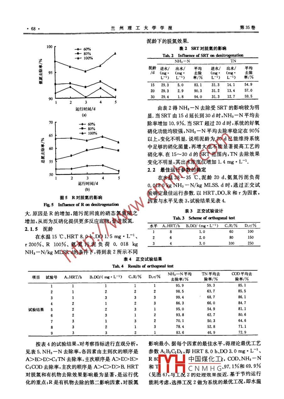 第35卷第4期蘭州理工大學(xué)學(xué)報Vol 35 No. 42009年8月Jourmal of Lanzhou University of TechnologyAug 2009文章編號: 1673 51962009)04-0065-05糞便污水與城市污水混合脫氮試驗(yàn)石明巖',莫東華',馮兆繼',余建恒",王少林”,夏耿東2(1.廣州大學(xué)土木工程學(xué)院,廣東廣州50006 2.廣州市大坦沙污水處理廠,廣東廣州510163)摘要:采用廣州市D污水廠倒置A*/O工藝的模擬裝置合并處理糞便污水與城市污水脫氮結(jié)果表明,HRT是脫氦和有機(jī)物去除最主要的影響因素,污泥回流比對脫氮影響最小.水溫28~35 C時,最優(yōu)工況確定為氨氮污泥負(fù)荷0.018 0 kg NHs -N/kg MISS. d .SRT 20 d.HRT 8.0 h.DO2.0 mg. L-.R 80%、r 150% ,COD.NHs- -N和TN平均去除率分別達(dá)到85. 5%、98.5%和63.7%,且出水濃度均可滿足(城鎮(zhèn)污水處理廠污染物排放標(biāo)準(zhǔn))(GB18918- -2002)一級A標(biāo)準(zhǔn).關(guān)鍵詞:倒置A*/O工藝;合并處理;糞便污水;城市污水;脫氮; HRT中圖分類號: X703. 1文獻(xiàn)標(biāo)識碼: ADenitrogenation test for mixed fecal and municipal wastewaterSHI Ming yan' , MO Dong -hua' , FENG Zha-ji' , YU Jian-heng2WANG Shao-lin2 , XIA Geng dong2(1. School of Civil Engineering, Guangzhou University, Guangzhou 510006, China; 2. Guangzhou Datansha Sewage Treatment Plant, Guan-gzhou 510163, China)Abstract: A simulation device of inverted A2 /0 process in Guangzhou D-Sewage Treatment Plant wasused to treat the mixed fecal and municipal wastewater with denitrogenation. The result showed that HRTwas the key influencing factor on organism and nitrogen removal efficiency and the sludge backflow ratiohad minimal influence on nitrogen removal. In conditions of water temperature from 28 to 35 C, the opti-mum operation parameters of nitrogen and organism removal were as follows: the average of ammoniasludge load was 0. 018 0 kg NH3- N/kg MLSS. d, SRT 20d, HRT 8.0h, DO2.0 mg.L-', R 80%,r 150%. The average removal rate of COD, NH3- N and TN was 85. 5%,98. 5% and 63. 7%, respective-ly. The concentration of the effluent was fully agreeable to Discharge standard of pollutants for munici-pal wasteruater treatment plant (GB 18918- -2002 IA).Key words: inverted A2 /0 process; consolidated treatment; fecal wastewater; municipal wastewater; de-nitrogenation; HRT糞便污水以糞便處理廠集中處理或輸送到污水廠處理,與城市污水合并處理則是一條經(jīng)濟(jì)、簡捷的廠處理為主2.集中處理難度大、成本高(30.據(jù)預(yù)途徑 進(jìn)入城市污水廠處理的糞便污水來源主要有測[] ,2010年糞便清運(yùn)量為4 400~5 700萬t,而我2個:一是無害化處理廠;二是市政排水管網(wǎng).廣州國的預(yù)期目標(biāo)是2010年無害化處理量達(dá)到3 500~市D污水廠運(yùn)行實(shí)踐表明,當(dāng)來自無害化廠的糞便4 600萬t5].若完全由糞便處理廠完成,則至少需污水進(jìn)入時,污水中有機(jī)物濃度瞬間提高,微生物的建100 t/d的糞便處理廠1 000座以上.即使是大城耗氧量瞬間增大,曝氣段微生物的硝化反應(yīng)受到嚴(yán)市,在相當(dāng)長時期內(nèi)也不可能實(shí)現(xiàn)完全由糞便處理重影響[6.因此,混合污水穩(wěn)定、高效脫氮是實(shí)現(xiàn)糞中國煤化工達(dá)標(biāo)的關(guān)鍵和需首收稿日期: 2009-03-31要HCN M H效、經(jīng)濟(jì)、簡捷、合基金項(xiàng)目:廣州市科技計劃項(xiàng)目(2007J10411),廣州市屬高校理、司門的胖伏買使行小處且具有較好的借鑒和應(yīng)科技計劃項(xiàng)目(08C058)用價值,對減輕水環(huán)境污染負(fù)荷具有積極的促進(jìn)作作者簡介:石明巖(1972-),女,遼寧遼陽人,博士,副教授66,蘭州理工大學(xué)學(xué)報第35卷用,對實(shí)現(xiàn)水環(huán)境保護(hù)可持續(xù)發(fā)展具有較為重要的DO和pH分別采用HACHscl00型溶氧儀和現(xiàn)實(shí)意義.CYBERSCAN510型pH計測定.1試驗(yàn)部分2結(jié)果與分析1.1 試驗(yàn)裝置與流程2.1影響因素分析試驗(yàn)裝置為模擬D廠倒置A2/O處理系統(tǒng)設(shè)2.1.1氨氮污泥負(fù)荷計,如圖1.裝置前設(shè)調(diào)節(jié)池,池內(nèi)設(shè)攪拌裝置,有效水溫為28~33 C ,控制試驗(yàn)條件:水力停留時體積500 L.裝置為有機(jī)玻璃材質(zhì),長X寬X高為間(HRT)8 h、好氧區(qū)溶解氧(D0)1.5 mg.L-1、污800 mmX 600 mmX 600 mm,有效水深420 mm,有泥回流比(R)100%、混合液回流比(r)200%、泥齡效體積200 L,缺氧/厭氧/好氧區(qū)體積比1: 1:2. (SRT)15 d,改變糞便污水與城市污水體積混合比,缺氧/厭氧區(qū)設(shè)攪拌裝置,電機(jī)轉(zhuǎn)速20~30 r/ min;得不同氨氦污泥負(fù)荷下的試驗(yàn)結(jié)果,如圖2.好氧區(qū)用隔板分成2格,每格底部設(shè)曝氣裝置.裝置氨氮污泥負(fù)荷末端為沉淀區(qū),長X寬600X200 mm,有效水深5000.018 0 | 0.01980.024 0mm,泥斗高250 mm,有效體積55 L,底部設(shè)排泥管00和污泥回流管. .30一8- 曲825留20+進(jìn)水氨氮↓40年15+出水氨氮族10+氨氨去除半士0135791113151719212325運(yùn)行時間/da)1.進(jìn)水蠕動泵;2.電磁式空氣壓縮機(jī);3.玻璃轉(zhuǎn)子流量計;4.污泥回流螺桿泵;5.混合液回流蠕動泵;6.電動攪0.0240 |拌機(jī);7.曝氣設(shè)備;8.在線DO儀;9.排泥管;10.出水管.3:I.調(diào)節(jié)池; I.缺氧區(qū);I.厭氧區(qū);IN.好氧I區(qū);V.好氧I區(qū);V.沉淀區(qū).圖1工藝流程內(nèi)代。e 20Fig 1 Technological proess姓I進(jìn)水由糞便污水與城市污水混合而成.糞便污士出水氨氨水為廣州市某無害化處理廠出水,城市污水取自D士氨鼠去除率廠沉砂池出水,水質(zhì)見表1.接種污泥取自D廠二沉135791113151719212325池回流污