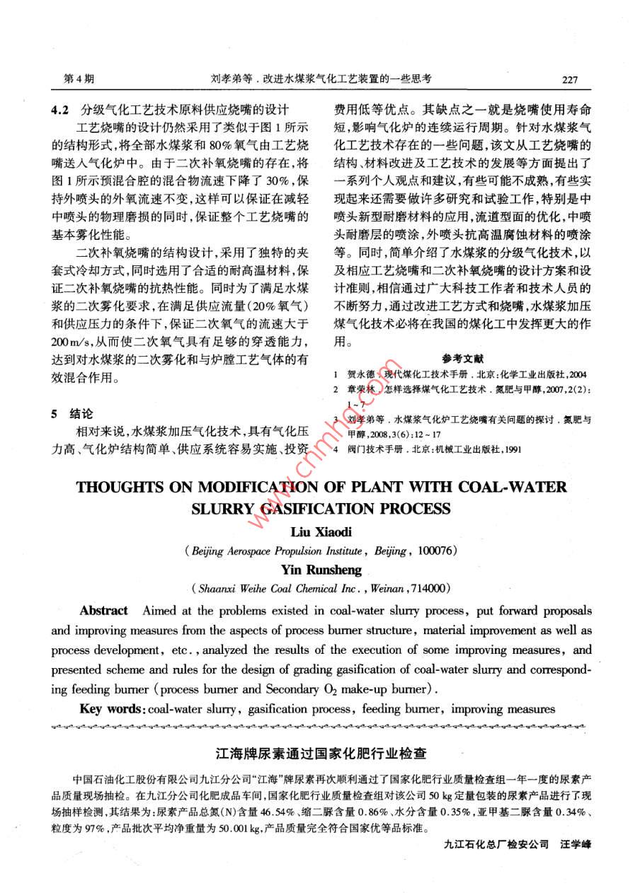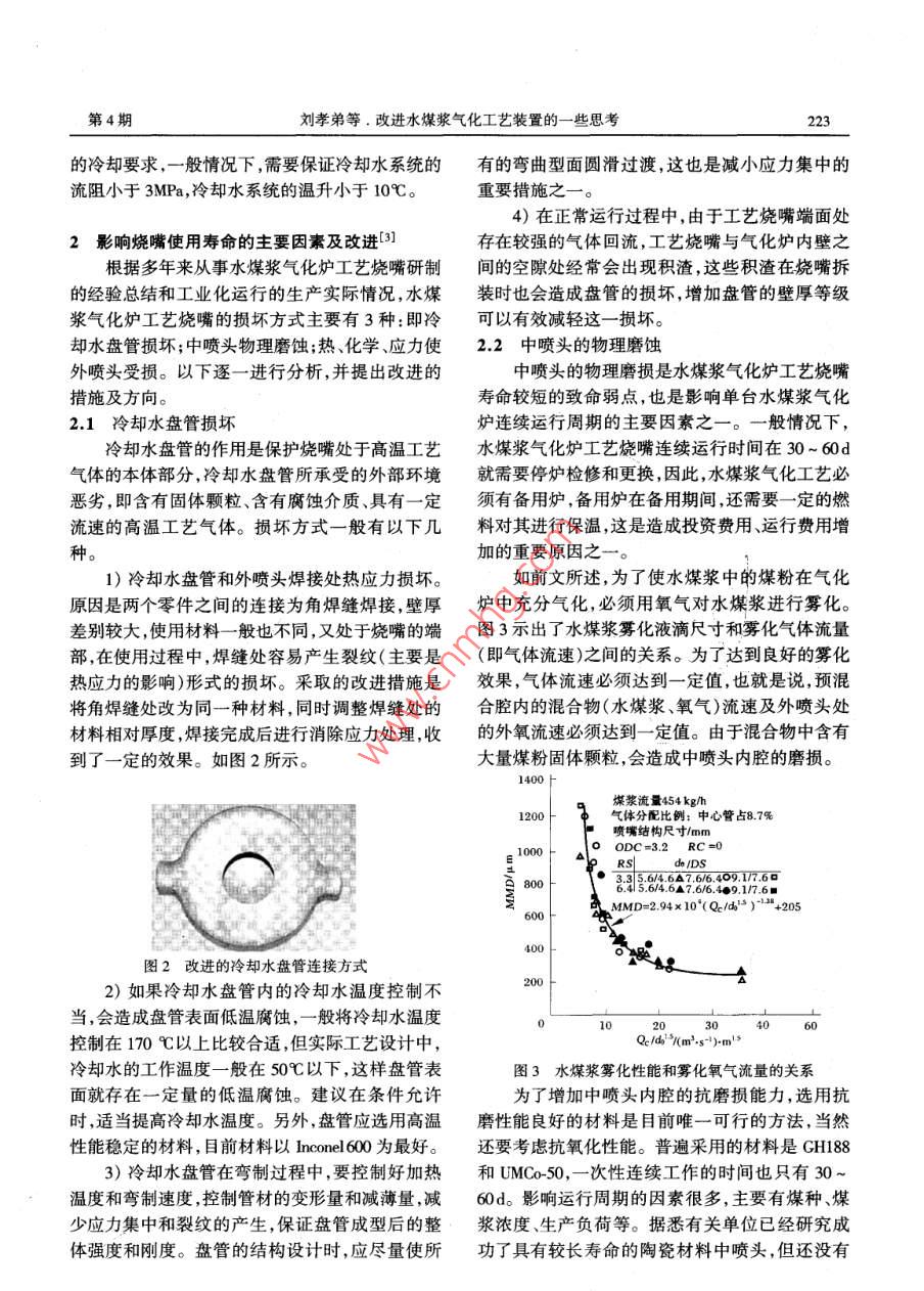 2009年8月去做第32卷第4期Large Scale Nitrogenous Fertilizer IndustryVol 32 No, 4改進(jìn)水煤漿氣化工藝裝置的一些思考劉孝弟尹潤生2(1.北京航天動(dòng)力研究所,北京,100076;2.陜西渭河煤化工集團(tuán)有限責(zé)任公司,陜西渭南,74000摘要針對水煤漿氣化工藝技術(shù)存在的一些問題,從工藝燒嘴的結(jié)構(gòu)、材料改進(jìn)及工藝技術(shù)的發(fā)展等方面提出了改進(jìn)措施和建議,并對部分改進(jìn)措施實(shí)施后的效果進(jìn)行了分析,介紹了水煤漿的分級(jí)氣化技術(shù)及相應(yīng)的原料供應(yīng)燒嘴(工藝燒嘴和二次補(bǔ)氧燒嘴)的設(shè)計(jì)方案和設(shè)計(jì)準(zhǔn)則。關(guān)鍵詞水煤漿氣化工藝原料供應(yīng)燒嘴改進(jìn)措施1原料供應(yīng)燒嘴的設(shè)計(jì)改進(jìn)12流通通道設(shè)計(jì)目前普遍采用的水煤漿氣化爐工藝燒嘴頭部無論是中心氧、還是水煤漿及外氧的流通面結(jié)構(gòu)如圖1所示12,為三通道同軸形式在外噴積均需要滿足各自介質(zhì)的流量要求。在供應(yīng)壓頭上布置冷卻水盤管對燒嘴頭部進(jìn)行強(qiáng)制冷卻。力允許的情況下,力爭達(dá)到良好的混合和霧化效燒嘴的設(shè)計(jì)需要考慮的主要因素有以下幾個(gè)方面果。但是,中心氧的比例有一定的限制,一般為總內(nèi)容。氧量的5%-25%,其余均作為外氧。中心氧量冷卻水盤管外噴管中噴頭內(nèi)噴頭不能太小,不然達(dá)不到對煤漿的稀釋和加速作用。2Q9999中心氧量太大會(huì)使預(yù)混合腔的混合物流速增加太多,造成混合腔出口處的磨損加重,降低燒嘴的連續(xù)使用壽命;另一方面,中心氧量增大時(shí),必然使燒嘴出口物料的軸向速度分量增大,徑向速度分量減小,其結(jié)果是使整個(gè)燒嘴出口的火焰變得細(xì)長,無法與氣化爐的內(nèi)部型面匹配,造成較大直徑的煤粉顆粒在氣化爐內(nèi)停留時(shí)間變短,爐渣中的圖1水煤漿氣化爐工藝燒嘴頭部典型結(jié)構(gòu)含碳量增加,引起氣化效率降低,而且,還會(huì)使火11結(jié)構(gòu)形式焰直沖爐底,影響爐底激冷環(huán)的工作壽命。一般情況下為同軸三套管。燒嘴中心氧管的13流速設(shè)計(jì)出口設(shè)計(jì)成縮口形式,目的是對中心氧進(jìn)行加速中心氧的出口流速一般為150~180m/s,煤同時(shí)其出口相對于燒嘴端面基準(zhǔn)面有一定的縮入漿出口流速一般為2-4ms,預(yù)混合腔出口平均量,這樣形成一個(gè)水煤漿和中心氧的預(yù)混合腔,水流速一般為12-20ms,外氧的出口流速一般為煤漿的出口管路也設(shè)計(jì)成縮口形式,使進(jìn)入預(yù)混160~200m/s。合腔的水煤漿具備一定的初始速度。在預(yù)混合腔1.4冷卻水流量設(shè)計(jì)內(nèi),利用中心氧對水煤漿進(jìn)行稀釋和初加速,改善冷卻水的流量設(shè)計(jì),要充分考慮到燒嘴頭部水煤漿的流變性能,其目的是為了保證水煤漿在收稿日期:x000;收到修改稿日期:209013離開燒嘴后的霧化效果。外氧管口的縮變量更大作者簡介:劉孝弟,男,1958年出生,1984年國防科技大學(xué)應(yīng)些,目的是提供更高流速的氧氣,使通過預(yù)混腔用力學(xué)專業(yè)畢業(yè),碩土研究生北京航天動(dòng)力研究所研究員,清華的水煤漿混合物進(jìn)行良好的霧化,以便在氣化爐大學(xué)在讀博士,中國石油和化學(xué)工業(yè)協(xié)會(huì)煤氣化協(xié)調(diào)委員會(huì)專家問,中國氮肥工業(yè)協(xié)會(huì)技術(shù)專家委員會(huì)委員。聯(lián)系電話:01內(nèi)達(dá)到良好的氣化效果。63719878,13801354578第4期劉孝弟等.改進(jìn)水煤漿氣化工藝裝置的一些思考223的冷卻要求,一般情況下,需要保證冷卻水系統(tǒng)的有的彎曲型面圓滑過渡,這也是減小應(yīng)力集中的流阻小于3MPa,冷卻水系統(tǒng)的溫升小于10℃。重要措施之4)在正常運(yùn)行過程中,由于工藝燒嘴端面處2影響燒嘴使用壽命的主要因素及改進(jìn){3存在較強(qiáng)的氣體回流,工藝燒嘴與氣化爐內(nèi)壁之根據(jù)多年來從事水煤漿氣化爐工藝燒嘴研制間的空隙處經(jīng)常會(huì)出現(xiàn)積渣,這些積渣在燒嘴拆的經(jīng)驗(yàn)總結(jié)和工業(yè)化運(yùn)行的生產(chǎn)實(shí)際情況,水煤裝時(shí)也會(huì)造成盤管的損壞,增加盤管的壁厚等級(jí)漿氣化爐工藝燒嘴的損壞方式主要有3種:即冷可以有效減輕這一損壞。卻水盤管損壞;中噴頭物理磨蝕;熱、化學(xué)、應(yīng)力使2,2中噴頭的物理磨蝕外噴頭受損。以下逐一進(jìn)行分析,并提出改進(jìn)的中噴頭的物理磨損是水煤漿氣化爐工藝燒嘴措施及方向壽命較短的致命弱點(diǎn),也是影響單臺(tái)水煤漿氣化2.1冷卻水盤管損壞爐連續(xù)運(yùn)行周期的主要因素之一。一般情況下冷卻水盤管的作用是保護(hù)燒嘴處于髙溫工藝水煤漿氣化爐工藝燒嘴連續(xù)運(yùn)行時(shí)間在30~60d氣體的本體部分,冷卻水盤管所承受的外部環(huán)境就需要停爐檢修和更換,因此,水煤漿氣化工藝必惡劣,即含有固體顆粒、含有腐蝕介質(zhì)、具有一定須有備用爐,備用爐在備用期間,還需要一定的燃流速的高溫工藝氣體。損壞方式一般有以下幾料對其進(jìn)行保溫這是造成投資費(fèi)用運(yùn)行費(fèi)用增種加的重要原因之1)冷卻水盤管和外噴頭焊接處熱應(yīng)力損壞。如前文所述,為了使水煤漿中的煤粉在氣化原因是兩個(gè)零件之間