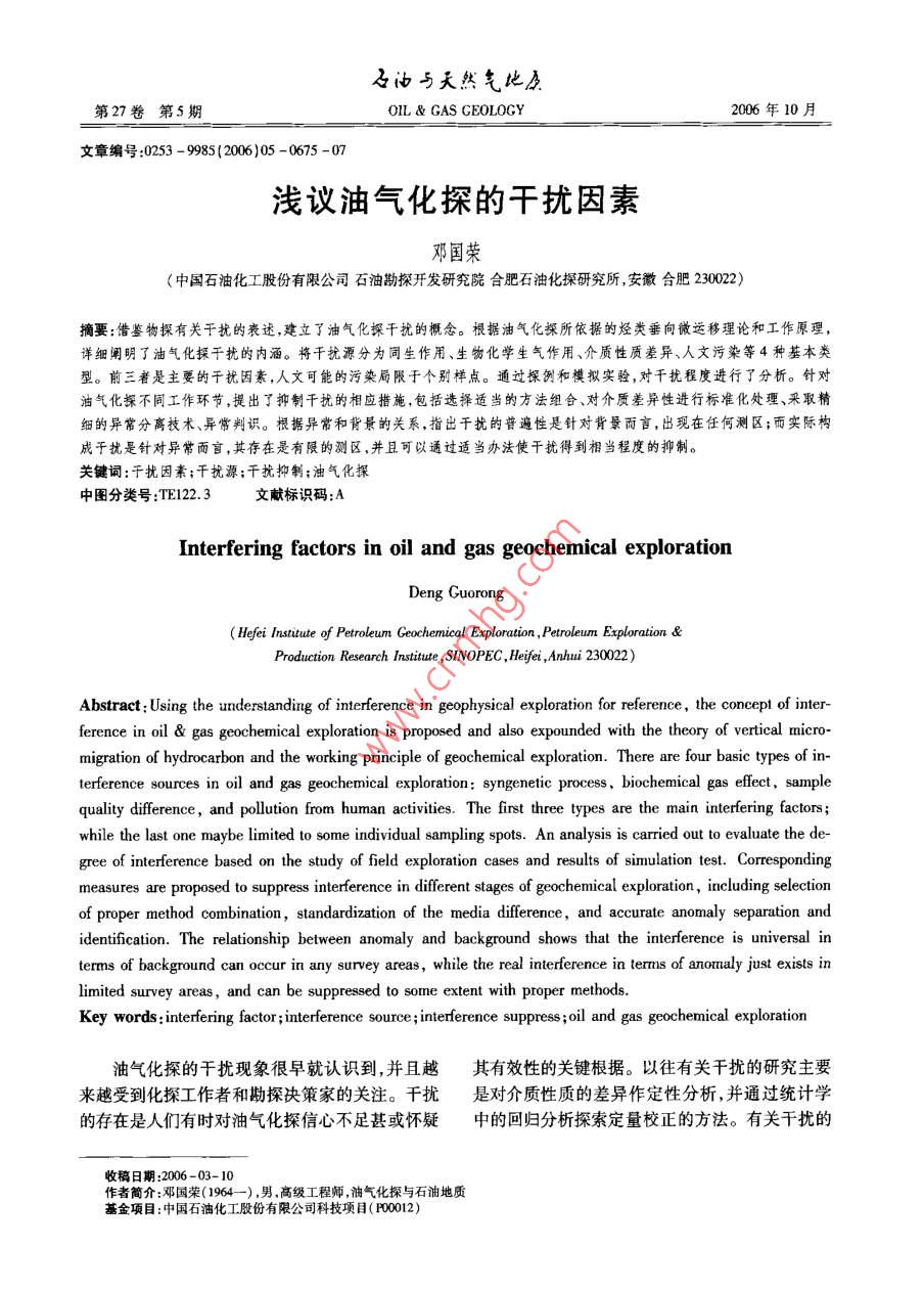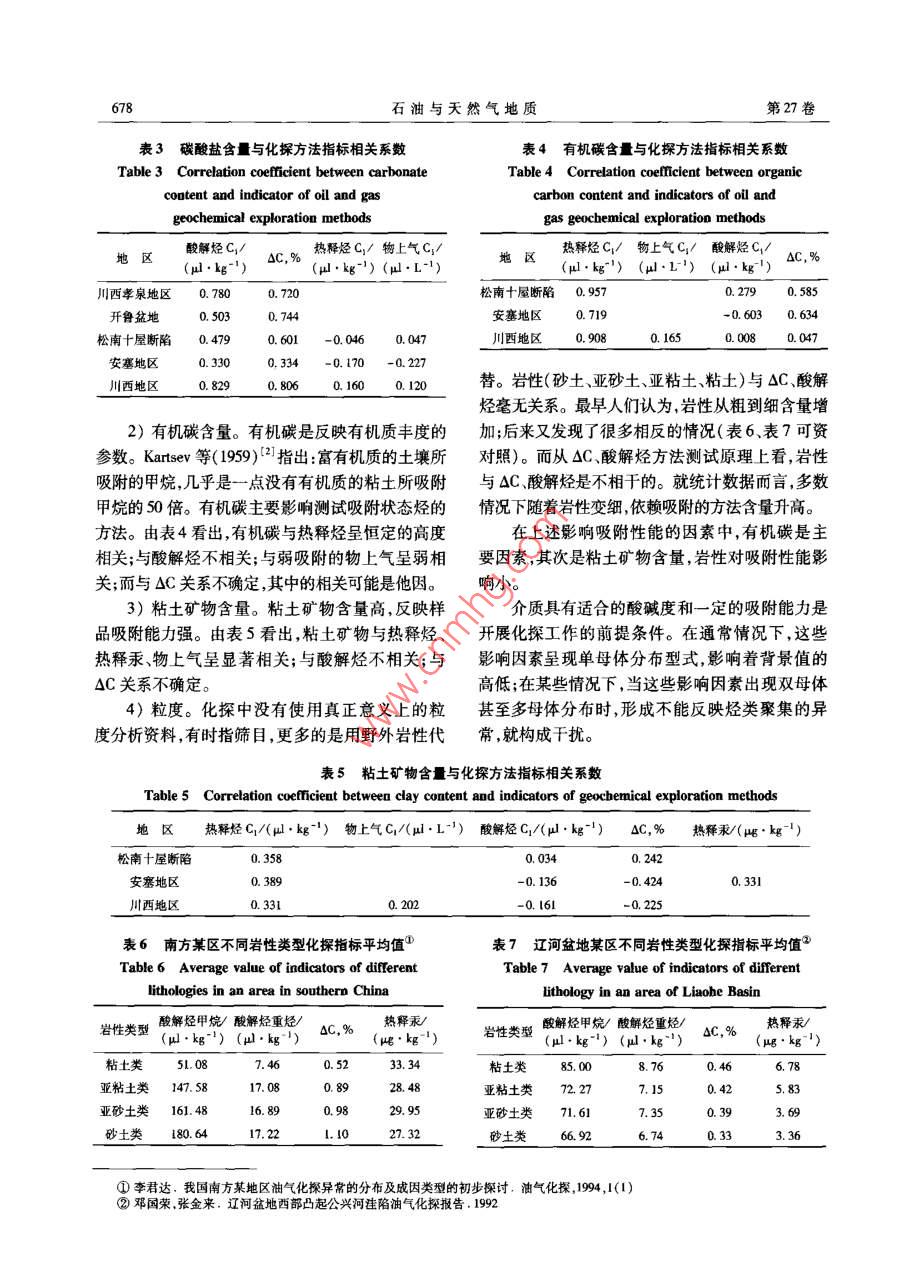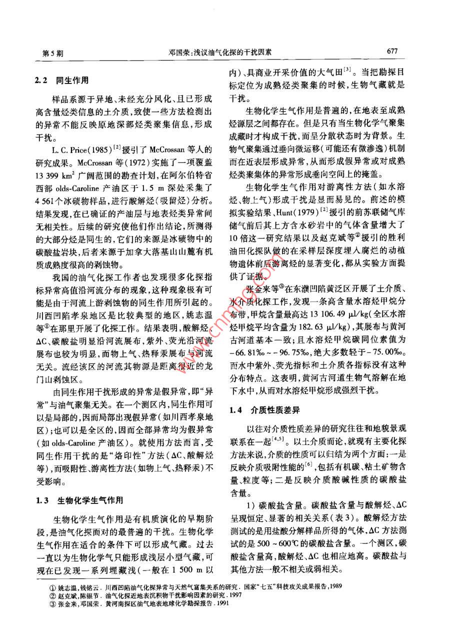 石油與天然氣比房第27卷第5期OIL & GAS CE0L0GY2006年10月文章編號:0253 - 9985(2006)05 -0675 -07淺議油氣化探的干擾因素鄧國榮(中國石油化工股份有限公司石油勘探開發(fā)研究院合肥石油化探研究所,安徽合肥230022摘要:借鑒物探有關干擾的表述,建立了油氣化探干擾的概念。根據(jù)油氣化探所依據(jù)的烴類垂向微運移理論和工作原理,詳細闡明了油氣化探干擾的內(nèi)酒。將干擾源分為同生作用、生物化學生氣作用、介質(zhì)性質(zhì)差異、人文污染等4種基本類型。前三者是主要的干擾因素,人文可能的污染局限于個別樣點。通過探例和模擬實驗,對干擾程度進行了分析。針對油氣化探不同工作環(huán)節(jié),提出了抑制干擾的相應措施,包括選擇適當?shù)姆椒ńM合、對介質(zhì)差異性進行標準化處理、采取精細的異常分離技術、異常判識。根據(jù)異常和背景的關系,指出干擾的普遍性是針對背景而言,出現(xiàn)在任何測區(qū);而實際構成于擾是針對異常而言,其存在是有限的測區(qū),并且可以通過適當辦法使干擾得到相當程度的抑制。關鍵詞:于擾因素;干擾源;干擾抑制;油氣化探中圖分類號:TE122.3文獻標識碼:AInterfering factors in oil and gas geochemical explorationDeng Guorong( Hefei Institute of Petroleun Geochemical Exploration,Petroleum Exploration &Production Research Institute ,SINOPEC , Heifei ,Anhui 230022)Abstract : Using the understanding of interference in geophysical exploration for reference, the concept of inter-ference in oil & gas geochemical exploration is proposed and also expounded with the theory of vertical micro-migration of hydrocarbon and the working principle of geochemical exploration. There are four basic types of in-terference sources in oil and gas geochemical exploration: syngenetic proces, biochemical gas effect, samplequality difference, and pollution from human activities. The first three types are the main interfering factors;while the last one maybe limited to some individual sampling spots. An analysis is carried out to evaluate the de-gree of intererence based on the study of field exploration cases and results of simulation test. Correspondingmeasures are proposed to suppress interference in different stages of geochemical exploration, including selectionof proper method combination, standardization of the media difference ,and accurate anomaly separation andidentification. The relationship between anomaly and background shows that the interference is universal interms of background can occur in any survey areas, while the real interference in terms of anomaly just exists inlimited survey areas, and can be suppressed to some extent with proper methods.Key words: interfering factor ; interference source ; interference suppress ;oil and gas geochemical exploration油氣化探的干擾現(xiàn)象很早就認識到,并且越其有效性的關鍵根據(jù)。以往有關千擾的研究主要來越受到化探工作者和勘探?jīng)Q策家的關注。干擾是對介質(zhì)性質(zhì)的差異作定性分析,并通過統(tǒng)計學的存在是人們有時對油氣化探信心不足甚或懷疑中的回歸分析探索定量校正的方法。有關干擾的收稿日期:2006 -03- 10作者簡介:鄧國榮(1964- -) ,男,高級工程師,油氣化探與石油地質(zhì)基金項目:中國石油化工股份有限公司科技項目(00012)676石油與天然氣地質(zhì)第27卷研究是油氣化探工作者必須進行的基礎課題,需2.1人文污染要建立干擾的概念、對于擾源及干擾程度進行分析、提出抑制干擾的措施。人文污染也稱人為污染或人工污染,主要是指樣品采集和運輸過程中成品油的污染以及油氣1干擾因素的含義田開采活動引起的污染。張金來”進行了模擬實驗:用長1 m、直徑對某領域的研究,必須先建立起科學的概念。10cm的圓筒硬質(zhì)塑料管,底部充原油伴生氣或原目前,尚沒有油氣化探干擾的定義。借鑒物探有油,上裝土介質(zhì)和水介質(zhì),在土壤和水的自重作用關干擾的表述" ,將干擾定義為探測目標(成熟烴下,油氣向上運移,模擬烴類在土介質(zhì)和水介質(zhì)中類聚集)以外的因素引起的地球化學場對異常場產(chǎn)生的指標分異效應。的影響。根據(jù)油氣化探所依據(jù)的烴類垂向微滲漏實驗結果(表1,表2)表明:理論以及工作原理,對油氣化探干擾的內(nèi)涵作進1)充原油伴生氣或原油前后,土介質(zhì)QC、重一步闡明。烴無明顯變化,說明人文污染對OC、酸解烴影響1)對油氣勘探而言,探測目標一般是指成熟微弱。的烴類聚集,因而生物氣聚集就是于擾。2)充原油前后,水介質(zhì)甲烷和重烴無明顯變2)于擾是針對異常場的。干擾普遍存在,但化,說明原油對水溶烴影響微弱;充原油伴生氣以是只有當它對異常場形成影響時才構成干擾。油后,水介質(zhì)甲烷和重烴發(fā)生顯著變化,說明天然氣氣化探基于烴類垂向微運移理論。因而以地表土對水溶烴影響顯著。介質(zhì)油氣化探而論,方法的測量值是采樣層及其3)無論是土介質(zhì)還是水介質(zhì),其紫外、熒光以下所有層位烴類信息的綜合反映。在沒有成熟對原油的響應都非常明顯。烴類聚集的地區(qū),各方法均有一定的測量值,這個勘探實踐表明,在已開發(fā)的油氣田區(qū)域內(nèi)開展了大量的土介質(zhì)、水介質(zhì)化探工作,油氣田上方測量值就是背景或者說平均干擾水平。3)成熟的但呈分散狀態(tài)的烴類(比如烴源巖沒有出現(xiàn)大面積頂端異常。樣品采集和運輸過程中的烴類)如果通過微運移到達地表則形成背景中成品油的污染