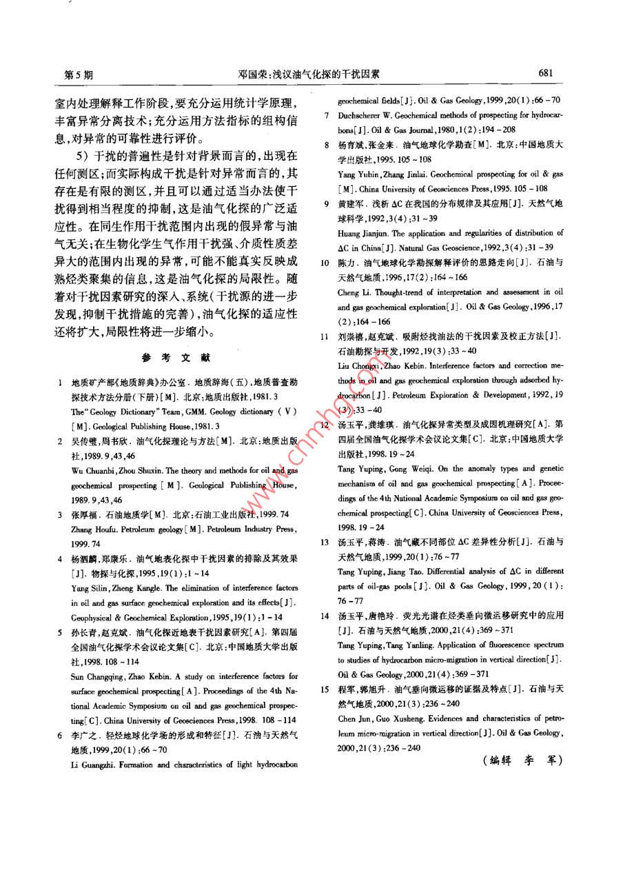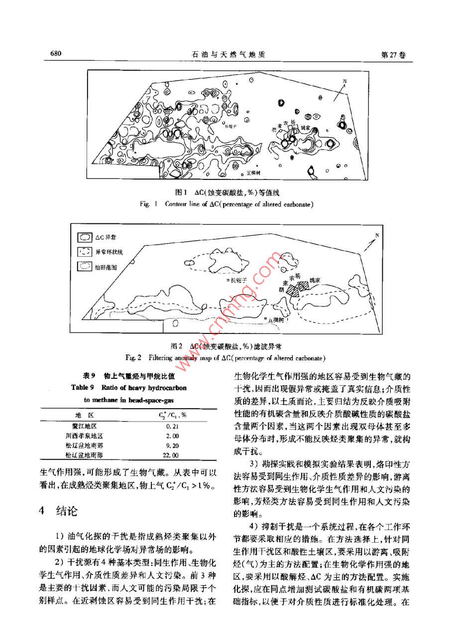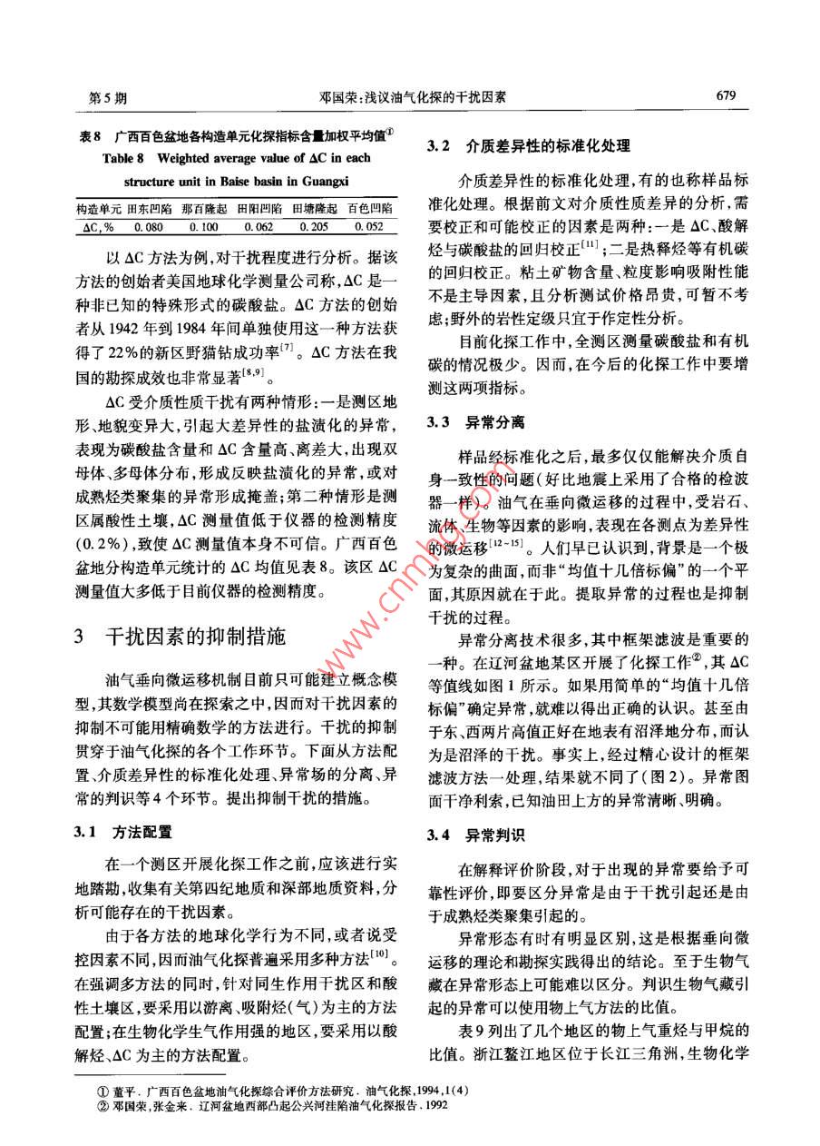 石油與天然氣比房第27卷第5期OIL & GAS CE0L0GY2006年10月文章編號:0253 - 9985(2006)05 -0675 -07淺議油氣化探的干擾因素鄧國榮(中國石油化工股份有限公司石油勘探開發(fā)研究院合肥石油化探研究所,安徽合肥230022摘要:借鑒物探有關干擾的表述,建立了油氣化探干擾的概念。根據(jù)油氣化探所依據(jù)的烴類垂向微運移理論和工作原理,詳細闡明了油氣化探干擾的內(nèi)酒。將干擾源分為同生作用、生物化學生氣作用、介質(zhì)性質(zhì)差異、人文污染等4種基本類型。前三者是主要的干擾因素,人文可能的污染局限于個別樣點。通過探例和模擬實驗,對干擾程度進行了分析。針對油氣化探不同工作環(huán)節(jié),提出了抑制干擾的相應措施,包括選擇適當?shù)姆椒ńM合、對介質(zhì)差異性進行標準化處理、采取精細的異常分離技術、異常判識。根據(jù)異常和背景的關系,指出干擾的普遍性是針對背景而言,出現(xiàn)在任何測區(qū);而實際構成于擾是針對異常而言,其存在是有限的測區(qū),并且可以通過適當辦法使干擾得到相當程度的抑制。關鍵詞:于擾因素;干擾源;干擾抑制;油氣化探中圖分類號:TE122.3文獻標識碼:AInterfering factors in oil and gas geochemical explorationDeng Guorong( Hefei Institute of Petroleun Geochemical Exploration,Petroleum Exploration &Production Research Institute ,SINOPEC , Heifei ,Anhui 230022)Abstract : Using the understanding of interference in geophysical exploration for reference, the concept of inter-ference in oil & gas geochemical exploration is proposed and also expounded with the theory of vertical micro-migration of hydrocarbon and the working principle of geochemical exploration. There are four basic types of in-terference sources in oil and gas geochemical exploration: syngenetic proces, biochemical gas effect, samplequality difference, and pollution from human activities. The first three types are the main interfering factors;while the last one maybe limited to some individual sampling spots. An analysis is carried out to evaluate the de-gree of intererence based on the study of field exploration cases and results of simulation test. Correspondingmeasures are proposed to suppress interference in different stages of geochemical exploration, including selectionof proper method combination, standardization of the media difference ,and accurate anomaly separation andidentification. The relationship between anomaly and background shows that the interference is universal interms of background can occur in any survey areas, while the real interference in terms of anomaly just exists inlimited survey areas, and can be suppressed to some extent with proper methods.Key words: interfering factor ; interference source ; interference suppress ;oil and gas geochemical exploration油氣化探的干擾現(xiàn)象很早就認識到,并且越其有效性的關鍵根據(jù)。以往有關千擾的研究主要來越受到化探工作者和勘探?jīng)Q策家的關注。干擾是對介質(zhì)性質(zhì)的差異作定性分析,并通過統(tǒng)計學的存在是人們有時對油氣化探信心不足甚或懷疑中的回歸分析探索定量校正的方法。有關干擾的收稿日期:2006 -03- 10作者簡介:鄧國榮(1964- -) ,男,高級工程師,油氣化探與石油地質(zhì)基金項目:中國石油化工股份有限公司科技項目(00012)676石油與天然氣地質(zhì)第27卷研究是油氣化探工作者必須進行的基礎課題,需2.1人文污染要建立干擾的概念、對于擾源及干擾程度進行分析、提出抑制干擾的措施。人文污染也稱人為污染或人工污染,主要是指樣品采集和運輸過程中成品油的污染以及油氣1干擾因素的含義田開采活動引起的污染。張金來”進行了模擬實驗:用長1 m、直徑對某領域的研究,必須先建立起科學的概念。10cm的圓筒硬質(zhì)塑料管,底部充原油伴生氣或原目前,尚沒有油氣化探干擾的定義。借鑒物探有油,上裝土介質(zhì)和水介質(zhì),在土壤和水的自重作用關干擾的表述" ,將干擾定義為探測目標(成熟烴下,油氣向上運移,模擬烴類在土介質(zhì)和水介質(zhì)中類聚集)以外的因素引起的地球化學場對異常場產(chǎn)生的指標分異效應。的影響。根據(jù)油氣化探所依據(jù)的烴類垂向微滲漏實驗結果(表1,表2)表明:理論以及工作原理,對油氣化探干擾的內(nèi)涵作進1)充原油伴生氣或原油前后,土介質(zhì)QC、重一步闡明。烴無明顯變化,說明人文污染對OC、酸解烴影響1)對油氣勘探而言,探測目標一般是指成熟微弱。的烴類聚集,因而生物氣聚集就是于擾。2)充原油前后,水介質(zhì)甲烷和重烴無明顯變2)于擾是針對異常場的。干擾普遍存在,但化,說明原油對水溶烴影響微弱;充原油伴生氣以是只有當它對異常場形成影響時才構成干擾。油后,水介質(zhì)甲烷和重烴發(fā)生顯著變化,說明天然氣氣化探基于烴類垂向微運移理論。因而以地表土對水溶烴影響顯著。介質(zhì)油氣化探而論,方法的測量值是采樣層及其3)無論是土介質(zhì)還是水介質(zhì),其紫外、熒光以下所有層位烴類信息的綜合反映。在沒有成熟對原油的響應都非常明顯。烴類聚集的地區(qū),各方法均有一定的測量值,這個勘探實踐表明,在已開發(fā)的油氣田區(qū)域內(nèi)開展了大量的土介質(zhì)、水介質(zhì)化探工作,油氣田上方測量值就是背景或者說平均干擾水平。3)成熟的但呈分散狀態(tài)的烴類(比如烴源巖沒有出現(xiàn)大面積頂端異常。樣品采集和運輸過程中的烴類)如果通過微運移到達地表則形成背景中成品油的污染