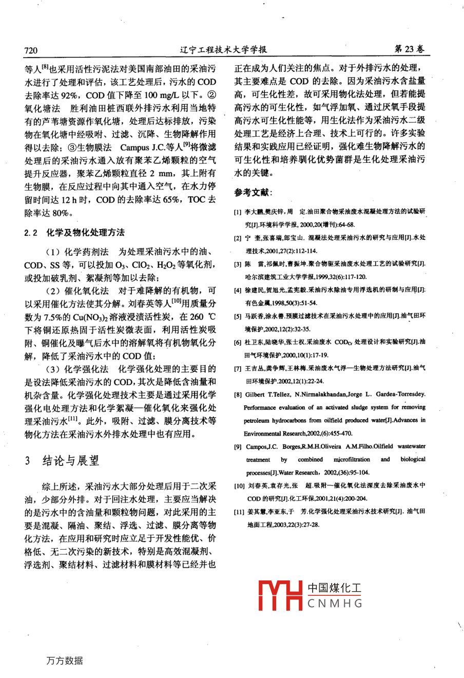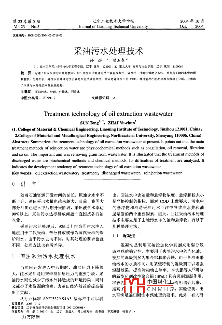 第23卷第5期遼寧工程技術(shù)大學(xué)學(xué)報(bào)2004年10月Vo1.23 No.5Jourmal of Liaoning Technical UniversityOct.2004文章編號(hào): 1008-0562(2004)03-0718-03.采油污水處理技術(shù)孫彤上2,翟玉春2(1.遼寧工學(xué)院材料與化學(xué)工程學(xué)院,遼寧錦州121001; 2.東北大學(xué)材料與冶金學(xué)院,遼寧沈陽100060摘要: 綜述了目前采油污水處理技術(shù)。指出回注水的處理方法主要有混凝法、隔油法、過濾法等物化方法,重點(diǎn)是去除污水中的顆粒物質(zhì):另外指明,外排水的處理方法主要是生化法及化學(xué)法,重點(diǎn)是降低水中的COD.對(duì)目前存在的處理難點(diǎn)做出了分析,并提出了采油污水處理技術(shù)的發(fā)展趨勢(shì)。關(guān)鍵詞:采油污水: 處理:外排水;回注水中圖分類號(hào): TE991.2文獻(xiàn)標(biāo)識(shí)碼: A .Treatment technology of oil extraction wastewaterSUN Tong'2, ZHAI Yu-chun2(1. College of Material & Chemical Enginering, Liaoning Institute of Technology, Jinzhou 121001, China;2.College of Material and Metallurgical Engineering, Northeastern University, Shenyang 110006, China)Abstract: Summarizes the treatment technology of oil extraction wastewater at present. It points out that the maintreatment methods of reinjection water are physicochemical methods such as coagulation, oil removal, filtrationand so on. The important aim was removing grain from wastewater. It is ilustrated that the treatment methods ofdischarged water are biochemical methods and chemical methods. Its difficulties of treatment are analyzed. Itindicates the development tendency of treatment technology of oil extraction wastewater.Key words: oil extraction wastewater; treatment; discharged wastewater; reinjection wastewater0引言隨著石油資源開發(fā)時(shí)間的延長(zhǎng),原油含水率不出,回注水中含油量和懸浮物濃度、懸浮顆粒大小斷上升,油田采出水量也越來越大,目前,我國(guó)大是嚴(yán)格控制的指標(biāo),而對(duì)COD未做要求。污水中部分油田已進(jìn)入中后期開采階段,采出液含水率達(dá)的懸浮物和油是采油污水回注中導(dǎo)致注水井和油90%以上,采油污水達(dá)標(biāo)排放問題一直困擾各石油層堵塞的兩個(gè)重要因素,因此,回注采油污水處理企業(yè)。技術(shù)主要立足于去除污水中的油和懸浮物,有以下采油污水經(jīng)處理后,90%以 上作為回注水注入幾種處理方法。地層用于二次采油,部分排放或作為蒸汽采油的鍋1. 1混凝法爐用水。由于污水去向不同,對(duì)其處理的要求也就不同,處理方法也有所差異?;炷ㄊ抢弥苯油都踊瘜W(xué)藥劑來削弱分散態(tài)油珠的穩(wěn)定性,主要用于去除污水中的乳化油。1回注采油污水處理技術(shù)投加的混凝劑多為聚合鋁和聚合鐵,由于各油田采當(dāng)油田開發(fā)進(jìn)入中后期時(shí),油層壓力下降很油污水的水質(zhì)不同,用某些特制的混凝劑可以增強(qiáng)大,注水采油是用來維持油層壓力的重要手段。采混凝效果,提高污染物去除率。李大鵬等人”研制油污水回注減少了污水外排造成的環(huán)境污染,同時(shí)的新型藥劑改性聚合鋁(HPAC)具有強(qiáng)制混凝作用,又減少了水資源的浪費(fèi),為油田經(jīng)濟(jì)效益的提高做將破乳中國(guó)煤化工有機(jī)結(jié)合起來,提高了|YHCN MH G,實(shí)驗(yàn)證明,出出了貢獻(xiàn)。從行業(yè)標(biāo)準(zhǔn)SY/T5329-94A3 級(jí)標(biāo)準(zhǔn)中可以看水可滿足油田回注水預(yù)處理的要求。此外,有人研收稿日期: 2003-10-12基金項(xiàng)目:遼寧省自然科學(xué)基金資助項(xiàng)目(9910300401)作者簡(jiǎn)介:孫彤(1966-). 女遼寧蓋縣人, 博士研究生,副教授。本文編校:楊瑞華第5期孫彤等:采油污水處理技術(shù)719究了用助凝劑和絮凝劑聯(lián)合使用,及聚合的復(fù)配技資少、污染小的特點(diǎn)。術(shù)制成新的高效混凝劑處理采油污水,效果良好”。1.7 離子調(diào)整法. 1.2 隔油法隔油法采用平流式隔油池、平行斜板式隔油池離子調(diào)整法是指針對(duì)采油污水中的弱酸性緩或波紋斜板式隔油池,靠重力作用進(jìn)行油水分離,沖體系,通過調(diào)整水中有關(guān)離子的含量,破壞該緩沖體系,去除腐蝕、結(jié)垢離子,優(yōu)化水質(zhì)。主要去除游離態(tài)和機(jī)械分散態(tài)油。1.3聚結(jié)法2外排采油污水處理技術(shù)聚結(jié)法是在聚結(jié)反應(yīng)器中,采用某些聚結(jié)材隨著油田綜合含水率的提高,采油污水的產(chǎn)生料,依靠污水中油粒的聚結(jié)作用,原水中的油粒相量不斷增加,已不能全部用于油田回注或回灌,部互聚結(jié)成直徑較大的顆粒,改變?cè)性偷念w粒分采油污水要排放到環(huán)境中,在對(duì)這些外排采油污分布情況,使之易于重力分離。水處理時(shí)要充分考慮COD、油等各項(xiàng)指標(biāo)。目前,聚結(jié)材料可分為以潤(rùn)濕聚結(jié)為主的親油性材外排采油污水的處理技術(shù)主要有以下幾種。料和以碰撞聚結(jié)為主的親水性材料,聚結(jié)材料對(duì)除2.1 生化處理方法油性能有影響,應(yīng)根據(jù)污水的具體情況選擇使用聚結(jié)材料。采油污水經(jīng)隔油、氣浮等物化方法處理后,出對(duì)于穩(wěn)定性較好的聚合物驅(qū)采油污水,波紋板水水質(zhì)不能滿足GB8978- 1996《污水綜合排放標(biāo)準(zhǔn)》狀聚結(jié)材料的聚結(jié)除油效果好于粒狀材料,親油性.二類水質(zhì)標(biāo)準(zhǔn)要求,不能直接