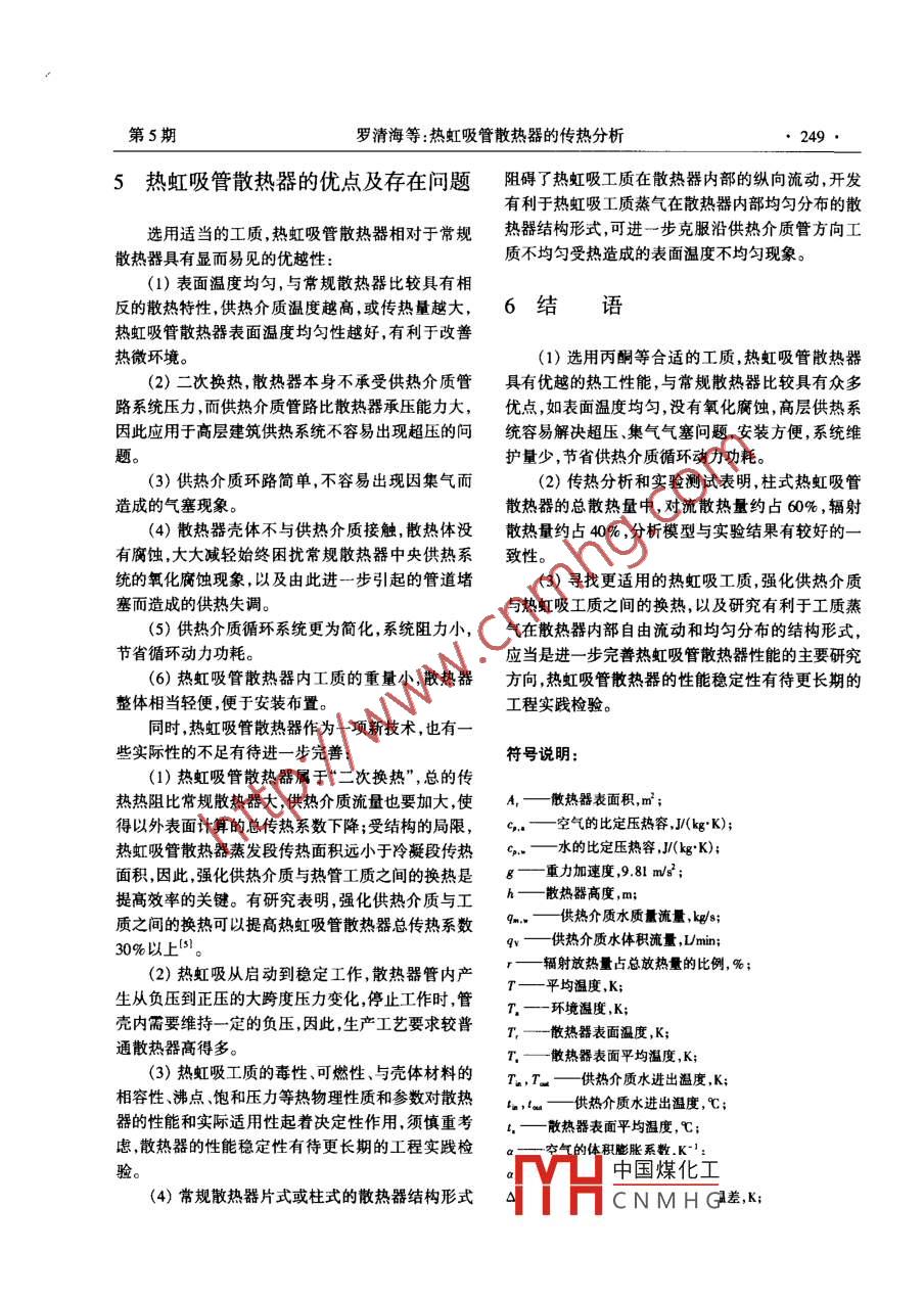 第24卷第5期煤氣與熱力Vol. 24 No. 52004年5月Gas heatMay 2004章編號:1000-4416(2004)05-0246-05熱虹吸管散熱器的傳熱分析羅清海湯廣發(fā),龔光彩,付崢(湖南大學(xué)土木工程學(xué)院湖南長沙410082)摘要:對熱虹吸管散熱器進行傳熱分析,并以丙酮為熱虹吸工質(zhì)進行了實驗驗證,測試結(jié)果與分析模型計算有較好的一致性。與常規(guī)散熱器進行了實驗比較分析,對熱虹吸管散熱器的優(yōu)點、不足作了討論。關(guān)鍵詞:熱虹吸管散熱器;傳熱;均溫性中圖分類號:TU995文獻標(biāo)識碼:AHeat Transfer Analysis on Thermosyphon RadiatorLUO Qing-hai, TANG Guang-fa, GONG Guang-cai, FU Zheng-rongCollege of Civil Engineering, Hunan Uniersity, Changsha 410082, ChinaAbstract: Heat transfer of the thermosyphon radiator is analyzed, experimental tests with acetone as therphon working fluid have been performed, and good agreement between measurement and calculation with an.sis model is obtained. Advantages and disadvantages of the thermosyphon radiator, being compared with conv-entional radiator by means of experiments and analyKey words: thermosyphon radiator; heat transfer; isothem0引言1基本原理熱管和熱虹吸換熱技術(shù)具備優(yōu)良的熱傳導(dǎo)性熱虹吸管散熱器利用柱型或板型散熱器為殼能、二次間壁換熱、表面溫度均勻熱流密度可調(diào)節(jié)體本在散熱器底部穿入供熱介質(zhì)管,殼體內(nèi)注入工等常規(guī)換熱技術(shù)所不具備的優(yōu)越性能因而在工業(yè)質(zhì)并建立真空環(huán)境這是一種常溫重力式熱管(見換熱和回收節(jié)能等方面獲得廣泛應(yīng)用,在冶金、化圖1)。工、建材、動力等行業(yè)有很多成功實例。為了提高鋼制散熱器的承壓能力解決容易出現(xiàn)的氧化腐蝕問題,近年來,一些熱管和熱虹吸管散熱器形式陸續(xù)液槽出現(xiàn)成為散熱器開發(fā)的熱點。本文對熱虹吸管散H熱器進行傳熱分析,以丙酮為熱虹吸工質(zhì)進行實驗驗證,同時,與常規(guī)散熱器進行實驗比較分析,對熱圖1熱虹吸管散熱器的結(jié)構(gòu)形式虹吸管散熱器的優(yōu)點、不足作了進一步討論,為深度開發(fā)以及工程應(yīng)用提供了基礎(chǔ)數(shù)據(jù)。其工作過程是:在散熱器底部供熱系統(tǒng)通過供中國煤化工羅2),南根東人生主從事常效節(jié)數(shù)CNMHG第5期羅清海等:熱虹吸管散熱器的傳熱分析247熱介質(zhì)管將殼體內(nèi)的工質(zhì)加熱,在工作溫度內(nèi),工質(zhì)④,=ceA,g-(7-7沸騰,工質(zhì)蒸氣上升至散熱器上部凝結(jié)放熱,凝結(jié)液根據(jù)實驗條件及散熱器表面特性確定角系數(shù)沿散熱器內(nèi)壁回流至加熱段被再次加熱蒸發(fā)熱量g=1,發(fā)射率c=0.9通過工質(zhì)的不斷循環(huán)相變進行熱量傳遞與經(jīng)典熱管的區(qū)別在于冷凝液不是借助毛細(xì)3實驗系統(tǒng)力作用回流,而是在重力作用下沿著散熱器內(nèi)壁面回流;另一個方面,經(jīng)典熱管的蒸發(fā)段與冷凝段的傳為驗證熱虹吸管散熱器傳熱分析模型的正確熱面積具有可比性而作為散熱器形式的重力熱虹性,以丙酮為熱虹吸工質(zhì)對柱式熱虹吸管散熱器的吸管蒸發(fā)段相當(dāng)于散熱器的內(nèi)熱源冷凝段(熱沉)放熱性能進行了實驗測試同時,為了與常規(guī)散熱器的表面積遠(yuǎn)遠(yuǎn)大于蒸發(fā)段(熱源)的表面積。進行性能比較,作了常規(guī)散熱器性能實驗測試。實驗系統(tǒng)參照文獻建成,由熱水系統(tǒng)測試小2傳熱分析室真空系統(tǒng)、散熱器真空系統(tǒng)、溫度控制系統(tǒng)、參數(shù)測量系統(tǒng)等5個子系統(tǒng)組成。測試程序參照文獻選用合適的工質(zhì)熱虹吸管散熱器具有很好的進行。表面溫度均勻性質(zhì),因此,盡管散熱器內(nèi)部傳熱機理散熱器供熱介質(zhì)供回水溫度由WMY-01B數(shù)極為復(fù)雜,但散熱器與環(huán)境之間的傳熱計算比常規(guī)字溫度計測定,流量由LZB-15浮子流量計和臺秤散熱器更為簡單對于熱虹吸管散熱器表面可近似測定散熱器表面溫度由銅-康銅熱電偶和UJ-36按均溫處理。描述散熱器的傳熱模型很多,本文選型攜帶式電位差計測定熱虹吸管散熱器內(nèi)部壓力用 Churchill2等人提出的模型對所研究的散熱器進由Z-60型真空壓力表測定,另外配備秒表1只。行傳熱分析,其適用的瑞利數(shù)范圍是0.1~102。全部測試儀器、儀表經(jīng)過校定,散熱器表面熱電偶布由供熱介質(zhì)水供給散熱器的熱量為:置見圖2中,=qm,△T,=qm,Cn(T如-T)(1)真空壓力表散熱器的散熱量由對流散熱量和輻射散熱量兩熱虹吸教熱器排氣門]部分組成,即供熱介質(zhì)管散熱器的垂直表面引起自然對流,其瑞利數(shù)可定義為T-T2-熱電偶Rasc.p h'egaal: spk圖2散熱器表面熱電偶布量式中△T=T.-T是散熱器表面與環(huán)境之間的溫質(zhì)的熱物理特性對熱虹吸管的熱工性能有著差,建筑供暖散熱器表面溫度與環(huán)境溫度相差不是關(guān)鍵性的影響熱虹吸管是依靠工質(zhì)的相變來傳遞太大所以空氣流體物性參數(shù)由平均溫度T=(7,熱量的選擇一般應(yīng)考慮以下一些原則,+T)2確定。參照常規(guī)散熱器的供熱要求初步(1)工作液體應(yīng)適應(yīng)散熱器的工作溫度區(qū),并計算得出瑞利數(shù)的變化范圍為1~2×10°。有適當(dāng)?shù)娘柡驼魵鈮篊hurchill傳熱關(guān)系式為(2)工作液體與殼體、吸液芯材料應(yīng)相容,且應(yīng)具有良好的熱穩(wěn)定性=0.8