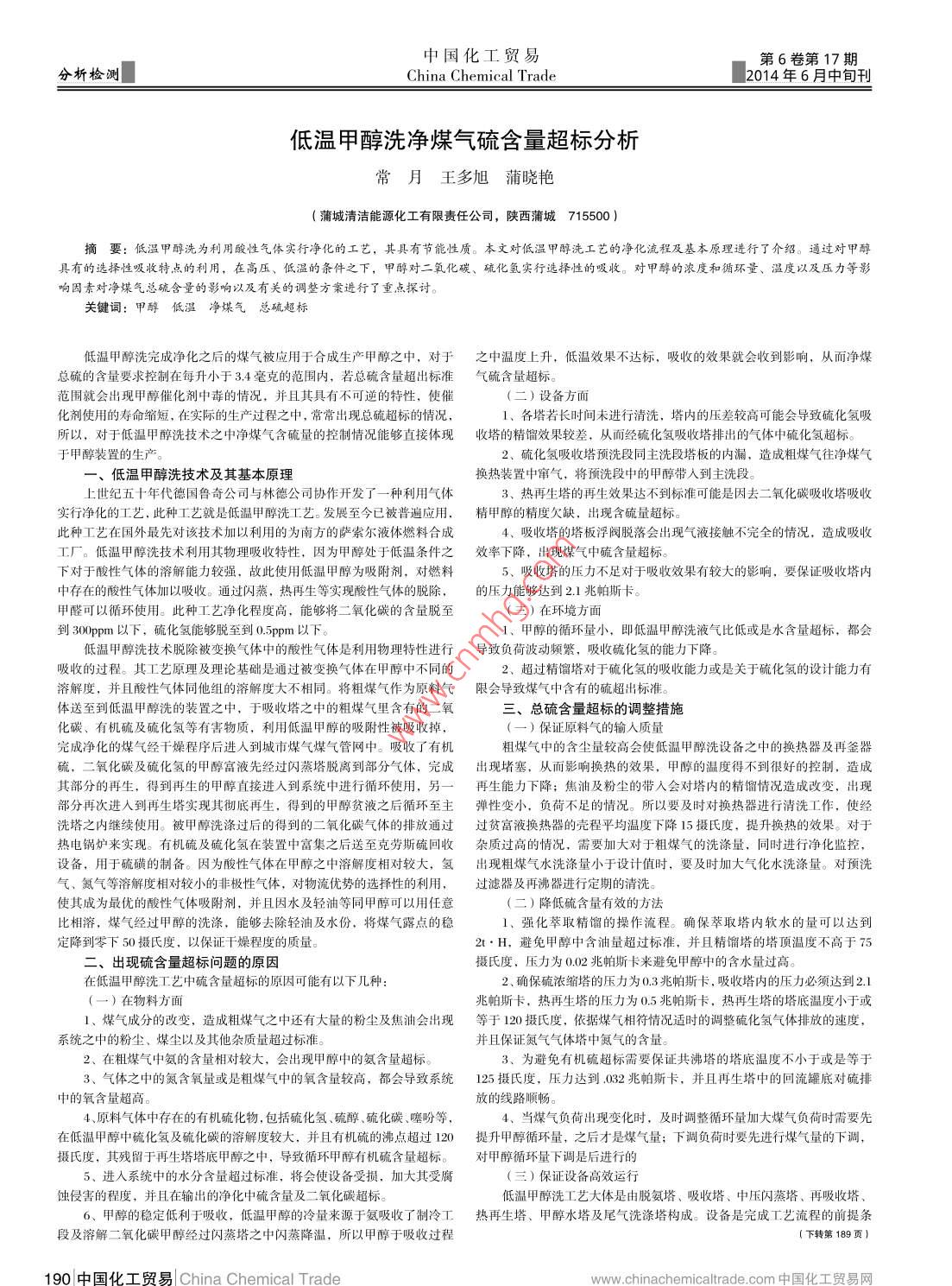 中國化工貿(mào)易分析檢測第6卷第17期China chemical trade2014年6月中旬刊低溫甲醇洗凈煤氣硫含量超標分析常月王多旭蒲曉艷(蒲城清潔能源化工有限責任公司,陜西蒲城715500)摘要:低溫甲醇洗為利用酸性氣體實行凈仳的工藝,其具有節(jié)能性質(zhì)。本文對低溫甲醇洗工藝的凈化流程及基本原理進行了介紹。通過對甲醇具有的選擇性吸收特點的利用,在高壓、低溫的條件之下,甲醇對二氧化碳、硫仳氫實行選擇性的吸收。對甲醇的濃度和循環(huán)量、溫度以及壓力等影響因素對凈煤氣總硫含量的影響以及有關的調(diào)整方案進行了重點探討。關鍵詞:甲酵低溫凈煤氣總硫超標低溫甲醇洗完成凈化之后的煤氣被應用于合成生產(chǎn)甲醇之中,對于之中溫度上升,低溫效果不達標,吸收的效果就會收到影響,從而凈煤總硫的含量要求控制在每升小于34毫克的范圍內(nèi),若總硫含量超出標準氣硫含量超標。范圍就會出現(xiàn)甲醇催化劑中毒的情況,并且其具有不可逆的特性,使催(二)設備方面化劑使用的壽命縮短,在實際的生產(chǎn)過程之中,常常出現(xiàn)總硫超標的情況l、各塔若長時間未進行清洗,塔內(nèi)的壓差較高可能會導致硫化氫吸所以,對于低溫甲醇洗技術之中浄煤氣含硫量的控制情況能夠直接體現(xiàn)收塔的精餾效果較差,從而經(jīng)硫化氫吸收塔排岀的氣體中硫化氫超標。于甲醇裝置的生產(chǎn)。2、硫化氫吸收塔預洗段同主洗段塔板的內(nèi)漏,造成粗煤氣往凈煤氣低溫甲醇洗技術及其基本原理換熱裝置中竄氣,將預洗段中的甲醇帶入到主洗段上世紀五十年代德國魯奇公司與林德公司協(xié)作開發(fā)了一種利用氣體3、熱再生塔的再生效果達不到標準可能是因去二氧化碳吸收塔吸收實行凈化的工藝,此種工藝就是低溫甲醇洗工藝。發(fā)展至今已被普遍應用,精甲醇的精度欠缺,岀現(xiàn)含硫量超標此種工藝在國外最先對該技術加以利用的為南方的薩索爾液體燃料合成4、吸收塔的塔板浮閥脫落會出現(xiàn)氣液接觸不完全的情況,遣成吸收工廠。低溫甲醇洗技術利用其物理吸收特性,因為甲醇處于低溫條件之效率下降,岀現(xiàn)煤氣中硫含量超標。下對于酸性氣體的溶解能力較強,故此使用低溫甲醇為吸附劑,對燃料5、吸收塔的壓力不足對于吸收效果有較大的影響,要保證吸收塔內(nèi)中存在的酸性氣體加以吸收。通過閃蒸,熱再生等實現(xiàn)酸性氣體的脫除,的壓力能夠達到2.1兆帕斯卡。甲醛可以循環(huán)使用。此種工藝凈化程度高,能夠?qū)⒍趸嫉暮棵撝?三)在環(huán)境方面到3pm以下,硫化氫能夠脫至到0.5ppm以下。1、甲醇的循環(huán)量小,即低溫甲醇洗液氣比低或是水含量超標,都會低溫甲醇洗技術脫除被變換氣體中的酸性氣體是利用物理特性進行導致負荷波動颎繁,吸收硫化氫的能力下降吸收的過程。其工藝原理及理論基礎是通過被變換氣體在甲醇中不同的2、超過精餾塔對于硫化氫的吸收能力或是關于硫化氫的設計能力有溶解度,并且酸性氣體同他組的溶解度大不相同。將粗煤氣作為原料氣限會導致煤氣中含有的硫超出標準。體送至到低溫甲醇洗的裝置之中,于吸收塔之中的粗煤氣里含有的二氧三、總硫含量超標的調(diào)整措施化碳、有機硫及硫化氫等有害物質(zhì),利用低溫甲醇的吸附性被吸收掉)保證原料氣的輸入質(zhì)量完成凈化的煤氣經(jīng)干燥程序后進入到城市煤氣煤氣管網(wǎng)中。吸收了有機粗煤氣中的含塵量較高會使低溫甲醇洗設備之中的換熱器及再釜器硫,二氧化碳及硫化氬的甲醇富液先經(jīng)過閃蒸塔脫離到部分氣體,完成岀現(xiàn)堵塞,從而影響換熱的效果,甲醇的溫度得不到很好的控制,造成其部分的再生,得到再生的甲醇直接進入到系統(tǒng)中進行循環(huán)使用,另一再生能力下降;焦油及粉塵的帶入會對塔內(nèi)的精餾情況造成改變,出現(xiàn)部分再次進入到再生塔實現(xiàn)其徹底再生,得到的甲醇貧液之后循環(huán)至主彈性變小,負荷不足的情況。所以要及時對換熱器進行清洗工作,使經(jīng)洗塔之內(nèi)繼續(xù)使用。被甲醇洗滌過后的得到的二氧化碳氣體的排放通過過貧富液換熱器的殼程平均溫度下降15攝氏度,提升換熱的效果。對于熱電鍋爐來實現(xiàn)。有杋硫及硫化氫在裝置中富集之后送至克勞斯硫冋收雜質(zhì)過高的情況,需要加大對于粗煤氣的洗滌量,同時進行凈化監(jiān)控,設備,用于硫磺的制備。因為酸性氣體在甲醇之中溶解度相對較大,氫岀現(xiàn)粗煤氣水洗滌量小于設計值時,要及時加大氣化水洗滌量。對預洗氣、氮氣等溶解度相對較小的非極性氣體,對物流優(yōu)勢的選擇性的利用,過濾器及再沸器進行定期的清洗。使其成為最優(yōu)的酸性氣體吸附劑,并且因水及輕油等同甲醇可以用任意(二)降低硫含量有效的方法相溶,煤氣經(jīng)過甲醇的洗滌,能夠去除輕油及水份,將煤氣露點的穩(wěn)Ⅰ、強化萃取精餾的操作流程。確保萃取塔內(nèi)軟水的量可以達到定降到零下50攝氏度,以保證干燥程度的質(zhì)量。2t·H,避免甲醇中含油量超過標準,并且精餾塔的塔頂溫度不高于75二、出現(xiàn)硫含量超標問題的原因攝氏度,壓力為0.02兆帕斯卡來避免甲醇中的含水量過高。在低溫甲醇洗工藝中硫含量超標的原因可能有以下幾種2、確保硫濃縮塔的壓力為0.3兆帕斯卡,吸