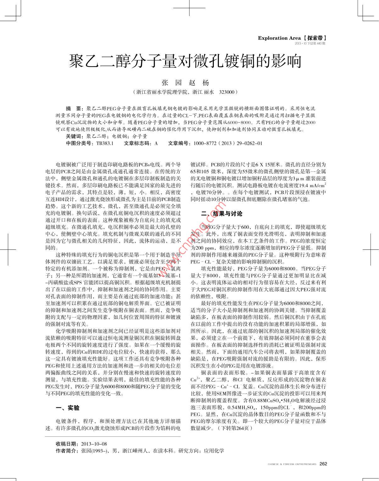 Exploration Area【探索帶】聚乙二醇分子量對微孔鍍銅的影響張園趙楊(浙江省麗水學(xué)院理學(xué)院,浙江麗水323000)摘要:聚二醇PEG分子量在微盲孔板填充銅電鍍的影響是采用光學(xué)顯微鏡的橫斷面圖像證明的。采用恒電流測量不同分子量的PEG在電鍍銅的電化學(xué)行為。在過量的CL-下,PEG表面覆蓋在銅表面的吸附是通過用掃描電子顯黴鏡觀察Cu沉淀物的大小和分布。隨著PEG分子量的增加,當(dāng)PEG分子量范圍從60-8006只有PEG的分子量超過2000可以有效地使陰極極仳從而誘導(dǎo)雙磺丙二硫在銅的催仳作用下沉積,使抑制劑和加速劑協(xié)冋互動對微盲孔板填充。關(guān)鍵詞:聚乙二醇;電鍍銅;分子量中圖分類號:TB383.1文章標(biāo)志碼:A文章編號:1000-8772(2013)29-0262-01電鍍銅被廣泛用于制造印刷電路板的PCBs電線。兩個導(dǎo)鍍試樣。PCB的片段的尺寸是6X15厘米。微孔的直徑分別為電層的PCB之間是由金屬微孔或通孔通常連接。在傳統(tǒng)的方65和105微米,深度為55微米的微孔側(cè)壁的微孔是第一金屬法中,側(cè)壁金屬微孔和通孔的電鍍銅在多層印制板制造的關(guān)的無電鍍銅和銅電鍍以增加銅籽晶層的厚度為3μm灌裝前進鍵技術(shù)。然而,多層印刷電路板已不能滿足國家的最先進的行隨后的電鍍沉積。測試電路板電鍍在電流密度194mAm2電子產(chǎn)品的需求,其特點是輕,薄,短,小。相反,高密度,電鍍70分鐘。。在每個電鍍測試,PCB片段預(yù)浸在鍍液中互連HD設(shè)計,通過激光燒蝕形成微孔為主是目前的PCB制造同時搖動10分鐘以濕微孔徹底刪除在微孔堵塞的氣泡趨勢。這個新的工藝技術(shù),微孔,甚至微通孔是必須完全填充的電鍍銅。換句話說,在微孔底銅電沉積的速度必須超過二、結(jié)果與討論通過開口和在板的表面。這種現(xiàn)象被稱為自底向上的填充或超級填充。在微通孔填充,電沉積銅率必須是最大的孔壁的當(dāng)PEG分子量大于600,自底向上的填充,即使超級填充中心,使側(cè)壁中心填充。填充機制與微觀關(guān)聯(lián)的通孔的不同發(fā)生。此外,出現(xiàn)了銅表面變得光滑明亮,表明抑制和加速是因為它與微孔相關(guān)的幾何特征,因此,流體的運動,是不劑之間的協(xié)同效應(yīng),在本工藝條件的工作。PEG的濃度恒定同的。為200pm,相應(yīng)的摩爾濃度逐漸增加的PEG分子量低。抑制這種特殊的填充行為的銅電沉積是第一個用于制造半導(dǎo)劑的抑制作用越來越強的PEG分子量。這種吸附行為意味著體劑件的雙鑲嵌工藝。以滿足要求,鍍液必須包含至少兩個PEG-CL-復(fù)雜關(guān)鍵的影響抑制銅的沉積。特定的有機添加劑。一個被稱為抑制劑,它是由PEG,氯離填充性能最好,PEG分子量為6000和8000。當(dāng)PEG分子子;另一種是所謂的加速劑,它通常有一個巰基如3-巰基-1量大于8000,填充性能與PEG分子量通過更加明顯比在減丙磺酸鹽或SPS官能團以提高銅沉積。根據(jù)超級填充機制提小。這表明流體運動的相對行為很容易在大經(jīng),反過來有利出了在以前的工作中,抑制和加速劑之間的協(xié)同作用。主要于大PEG對銅沉積的抑制作用在大底部通過因大PEG強對流對孔表面的抑制作用,而主要是在通過底部的加速功能;甚的依賴性,吸附。至加速劑可以積累在通過底部的銅電解質(zhì)界面。它已被證明最好的填充性能發(fā)生在PEG分子量為6000和8000之間,的抑制和加速劑之間發(fā)生競爭吸附在銅表面。然而,競爭吸適當(dāng)?shù)姆肿哟笮∈且种苿┖图铀賱┑膮f(xié)調(diào)關(guān)鍵。當(dāng)抑制覆蓋附的支配與一定的物理因素,如幾何位置周圍的特征和鍍液缺陷多,在板表面的抑制作用較弱。然后銅沉積由于在孔底的強制對流等有關(guān)。在以前的工作中提出的沒有功能的加速積累的局部增強,如化學(xué)吸附抑制劑和加速劑之間已經(jīng)證明是這些添加劑對圖所示。因此,在通過底部的銅沉積的加速劑局部的催化效流依賴的吸附特征可以通過恒電流測量銅沉積在銅旋轉(zhuǎn)圓盤果,必須建立在一個前提下,有效抑制必須同時在董事會表電極兩個不同的旋轉(zhuǎn)速度進行了強度。如果在一個緩慢的旋面操作。在板表面的抑制選擇性的消耗已被證明是強制對流轉(zhuǎn)速度,得到的Cu的RDE的過電位較小,快速的獲得,那么相關(guān)。然而,下面的通用汽車公司將表明,如果抑制覆蓋的這一定具有鍍液填充性能好。這項工作還具有競爭吸附各種缺陷是,在PEG吸附強制對流的援助是有限的。因此,保形PEG和使用上述通用方法的加速劑和進一步的相關(guān)的電位差沉積發(fā)生在小的PEG是用在電鍍?nèi)芤簝善袂€之間的關(guān)系,并分別在慢速和快速的旋轉(zhuǎn)速度的銅表面的表面形貌。一如果銅表面暴露于高濃度含有測量,與填充性能。實驗結(jié)果表明,最佳的填充性能的各種Cu3,聚乙二醇,和CI電解質(zhì),反應(yīng)形成的沉淀物在銅表PEG發(fā)生時,PEG分子量為6000和18000和隨PEG分子量的變化面不經(jīng)PEG-Cu-CL復(fù)蓋。Cu沉淀的晶體生長和分布進行與不同PEG的填充性能的變化一致比較,使用SEM圖像進一步證實的Cu沉淀的投影可以用來判析抑制劑的覆蓋程度。含有0.88 MCuSO4·5H2O電解液經(jīng)過浸、實驗泡三表面形貌,0.54MH2SO4,150ppm的CL,和200ppm的PEG。顯然,在Cu沉淀的晶體數(shù)目的PEG分子量函數(shù)和不與電鍍條件,程序,和預(yù)處理方