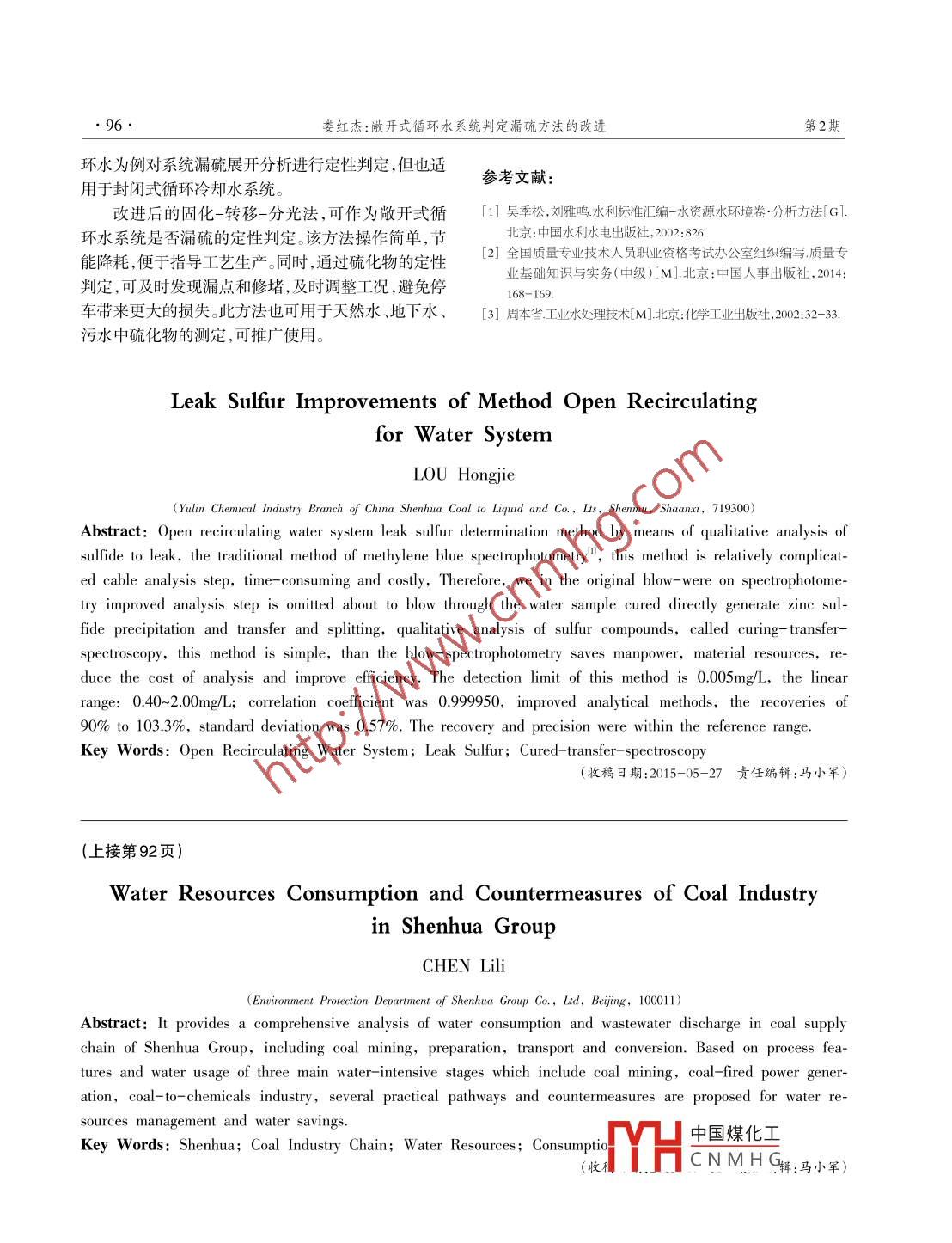 第14卷第2期神苯科技2016年3月VOL.14 NO.2March.2016敞開式循環(huán)水系統(tǒng)判定漏硫方法的改進;婁紅杰(中國神華煤制油化工有限公司榆林化工分公司,陜西神木,719300)摘要:敞開式循環(huán)水系統(tǒng)判定漏硫方法可借助硫化物的定性分析來測漏,傳統(tǒng)的方法為亞甲藍分光光度法”,此方法分析步驟比較繁瑣,費時費力且成本高。因此在原有的吹氣- -光度法上,進行了改進,即將吹氣分析步驟省略。通過將水樣直接固化生成硫化鋅沉淀,并轉移及分光,對硫化物進行定性分析,我們稱之為固化-轉移-分光法。此方法簡單易行,比吹氣-光度法節(jié)省了人力、物力,降低了分析成本,提高了工效。該方法的檢測限為0.005mg/L,線性范圍:0.40~2.00mg/L;相關系數(shù)為099950,改進后的分析方法,加標回收率為90%~103.3%,標準偏差為0.57%。其回收率和精密度均在參考范圍內。關鍵詞:敞開式循環(huán)水系統(tǒng) 漏硫固化- 轉移-分光法中圖分類號:X7文獻標識碼:B文章編號:1674- -8492(2016)02-093-04(5)回收率和精密度的測定及控制。1前言(6)定性判定。隨著煤化工主工藝漏硫事件的發(fā)生,會對循環(huán)(7)實驗方法的結論。水系統(tǒng)造成腐蝕和滲漏,還會導致監(jiān)測換熱器和管2實驗部分道的堵塞及滲漏,乃至停車。由于生產(chǎn)中尋找漏點相當困難,通過硫化物的定性判定,可及時發(fā)現(xiàn)漏點和2.1 參 照標準與適用范圍修堵。因此,尋求簡便易行檢測漏硫的方法非常硫化物的測定方法參照GB 6903/T-2005《鍋爐重要。用水和冷卻水分析方法通則》的規(guī)定及采用SL89-敞開式循環(huán)水系統(tǒng)判定漏硫方法可借助硫化物1994《硫化物的測定(亞甲藍分光光度法)》;測量范圍的定性分析來測漏,傳統(tǒng)的方法為酸化吹氣-亞甲藍為0.005~2.00mg/L。改進后的固化-轉移分光法適用分光光度法" ,此方法不但費時、費力、成本高,而且于定性分析或定量檢驗后的定性分析。該方法的檢測分析步驟比較繁索,因此我們在原有傳統(tǒng)的吹氣-光限 為0.005mg/L,線性范圍:0.40-2.00mg/L;相關系數(shù)度法上進行了改進,即將吹氣分析步驟省略,通過將為.99950,改進后的分析方法,加標回收率為90%~水樣直接固化生成硫化鋅沉淀并轉移及分光,對硫化103.3%,標準偏差為0.57%。其回收率和精密度均在物進行定性分析,我們稱之為固化轉移-分光法,此參考范圍內。方法簡便易行,既降低了分析成本,又節(jié)省了人力、物.2.2 測定原理力,提高了工效。在強酸介質中,硫離子與對氨基二甲苯胺鹽酸鹽本文主要從以下幾點建立實驗方法:(N,N-二甲基-對苯二胺鹽酸鹽)在三氯化鐵存在下(1)將水樣固化生成沉淀,并對沉淀物進行過濾、反應,生成亞甲基蘭。在波長665nm處進行吸光度測截留、轉移,對硫離子吸光度進行測定。定,其吸光度與硫離子含量成正比。(2)儀器和分析條件的選擇。2.3主要儀器與試劑(3)標準曲線的建立。2.3.1儀器(4)水樣的測定。(1)可見分光光度計:7230G型,上海菁華儀器有作者簡介:婁紅杰(1971-),女,蒙古族,助理工程師,現(xiàn)任職于中國神華煤制油化]中國煤化工,: 18149126172.E-mail: louhongie_ 001@163.comMYHCNMHG●94●婁紅杰:敞開式循環(huán)水系統(tǒng)判定漏硫方法的改進第2期限公司。1.200(2)具塞帶磨口比色管:50mLc1.0002.00, 1.029(3)玻璃漏斗:φ75mm、漏斗下端管徑長截短至0.8001.60,0.819約25mm,便于轉移和洗滌。(4)脫脂紗布加脫脂棉:脫脂紗布在上,脫脂棉在R0.600" 1.20,0.617 .蘭0.400下,疊放在一-起,使沉淀所附平面趨于平滑,易于' 0.80,0.409沖洗。0.200' 0.40,0.20200040.00,02.3.2 試劑1.001.52.002.50磷酸氫二銨[(NH)HPO]溶液、三氯化鐵(FeCl)硫離子的濃度(mg*L")圖1 吸光度-硫離子濃度曲線溶液、乙酸鋅溶液、N,N-二甲基-對苯二胺鹽酸鹽工3.3水樣的測定作溶液及貯備液、硫化物標準工作溶液、pH為9.22的3.3.1 固化硼酸鈉緩沖溶液。上述試劑按SL89- 1994標準要求進硫離子很容易氧化,硫化氫易從水樣中逸出,在行配制。水樣中加入一-定量的乙酸鋅溶液和適量硼酸鈉緩沖3結果與討論液,使呈堿性并生成硫化鋅絮狀沉淀。具體操作為50mL比色管中加入水樣50mL,然后加人10mL硼酸3.1消除及干擾硫代硫酸鹽、亞硫酸鹽小于10mg/L時,不影響測鈉緩沖液,搖勻,再加入2mL乙酸鋅溶液,即有白色絮定。亞硝酸鹽達0.5mg/L時,產(chǎn)生干擾。其他還原劑或狀物生成。氧化劑亦可影響顯色反應。硫代硫酸鹽和亞硫酸鹽的3.3.2轉移干擾采用產(chǎn)生硫化鋅沉淀的方法消除,在比色前加入將適當薄度的圓形脫脂棉和--層脫脂紗布疊放(NH),HPO,以去除高鐵離子的干擾,當水樣渾濁、有在一起,脫脂紗布在上,用少量三級去離子水潤濕,色、干擾物質含量高時,可適當將試樣進行稀釋,以消然后緊貼于直徑為75mm、漏斗徑長度截至25mm的玻璃漏斗內壁。將固化后的沉淀靜置10min,然后將除干擾。比色管中絮狀沉淀物傾倒在脫脂紗布上,對沉淀物3.2繪制標準曲線6;支50mL比色管中,分別吸取0.01mg/mL硫離子的進行過濾,棄去濾液,濾液應為澄清。截留沉淀后,用無齒不銹鋼鑷子,夾住脫脂棉及標準溶液0.00ml、2.00mL、4.00mL、6.00mL、8.00mL、脫脂紗布邊緣,向上提拉,但不可超過漏斗邊緣,露10.00mL,加水至40mL,再向比色管內分別加入1.50mL出漏斗錐形口,用洗瓶充分沖洗沉淀,然后將脫脂紗對N,N-二甲基-對苯二胺鹽酸鹽工作溶液和0.30mL布及脫脂棉進行翻卷,使脫脂紗布在外,脫脂棉在FeCl,溶液,搖勻,靜置5min,然后
