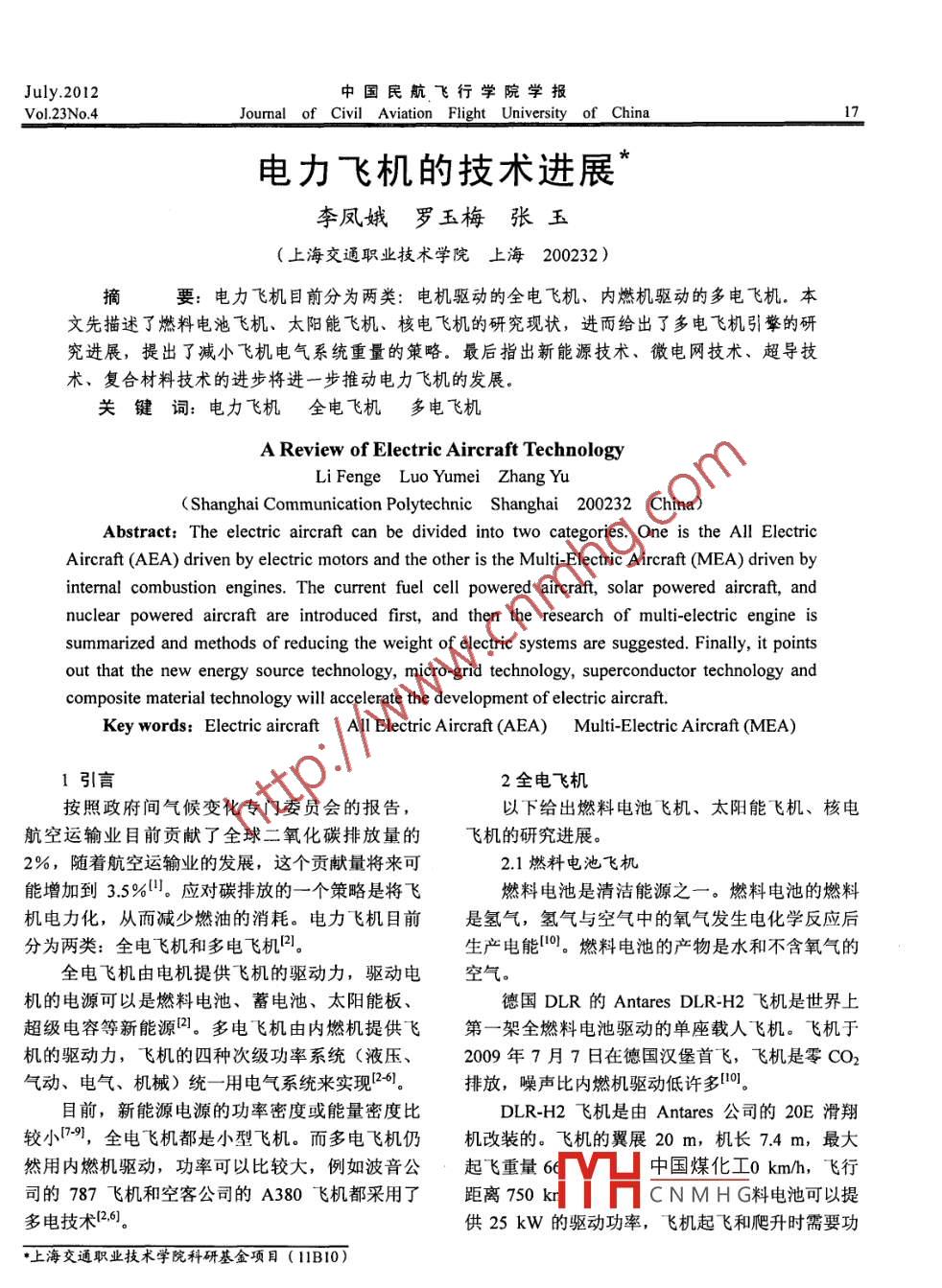 July.2012中國(guó)民航飛行學(xué)院學(xué)報(bào)Vo1.23No.4Journal of Civil Aviation Flight University of_ China17電力飛機(jī)的技術(shù)進(jìn)展李鳳娥羅玉梅張玉(上海交通職業(yè)技術(shù)學(xué)院 上海200232)掖要:電力飛機(jī)目前分為兩類:電機(jī)驅(qū)動(dòng)的全電飛機(jī)、內(nèi)燃機(jī)驅(qū)動(dòng)的多電飛機(jī)。本文先描述了燃料電池飛機(jī)、太陽(yáng)能飛機(jī)、核電飛機(jī)的研究現(xiàn)狀,進(jìn)而給出了多電飛機(jī)引擎的研究進(jìn)展,提出了減小飛機(jī)電氣系統(tǒng)重量的策略。最后指出新能源技術(shù)、微電網(wǎng)技術(shù)、超導(dǎo)技術(shù)、復(fù)合材料技術(shù)的進(jìn)步將進(jìn)一步推動(dòng)電力飛機(jī)的發(fā)展。關(guān)鍵詞:電力飛機(jī)全電飛機(jī)多電飛機(jī)A Review of Electric Aircraft TechnologyLi Fenge Luo Yumei Zhang Yu(Shanghai Communication Polytechnic Shanghai 200232 China)Abstract: The electric aircraft can be divided into two categories. One is the All ElectricAircraft (AEA) driven by electric motors and the other is the Multi-Electric Aircraft (MEA) driven byintermal combustion engines. The current fuel cell powered aircraft, solar powered aircraft, andnuclear powered aircraft are introduced first, and then the research of multi-electric engine issummarized and methods of reducing the weight of electric systems are suggested. Finally, it pointsout that the new energy source technology, micro-grid technology, superconductor technology andcomposite material technology will accelerate the development of electric aircraft.Key words: Electric aircraft All Electric Aircraft (AEA) Multi-Electric Aircraft (MEA)1引言2全電飛機(jī)按照政府間氣候變化專門委員會(huì)的報(bào)告,以下給出燃料電池飛機(jī)、太陽(yáng)能飛機(jī)、核電航空運(yùn)輸業(yè)目前貢獻(xiàn)了全球二氧化碳排放量的飛機(jī)的研究進(jìn)展。2%,隨著航空運(yùn)輸業(yè)的發(fā)展,這個(gè)貢獻(xiàn)量將來(lái)可2.1燃料電池飛機(jī)能增加到3.5%"。應(yīng)對(duì)碳排放的一一個(gè)策略是將飛燃料電池是清潔能源之一- 。燃料電池的燃料機(jī)電力化,從而減少燃油的消耗。電力飛機(jī)目前是氫氣, 氫氣與空氣中的氧氣發(fā)生電化學(xué)反應(yīng)后分為兩類:全電飛機(jī)和多電飛機(jī)2。生產(chǎn)電能10)。燃料電池的產(chǎn)物是水和不含氧氣的全電飛機(jī)由電機(jī)提供飛機(jī)的驅(qū)動(dòng)力,驅(qū)動(dòng)電.空氣。機(jī)的電源可以是燃料電池、蓄電池、太陽(yáng)能板、德國(guó)DLR的Antares DLR-H2飛機(jī)是世界上超級(jí)電容等新能源21。多電飛機(jī)由內(nèi)燃機(jī)提供飛第一架全燃料電池驅(qū)動(dòng)的單座載人飛機(jī)。飛機(jī)于機(jī)的驅(qū)動(dòng)力,飛機(jī)的四種 次級(jí)功率系統(tǒng)(液壓、2009年7月7日在德國(guó)漢堡首飛,飛機(jī)是零CO2氣動(dòng)、電氣、機(jī)械)統(tǒng)一用電氣系統(tǒng)來(lái)實(shí)現(xiàn)[-61。排放,噪聲比內(nèi)燃機(jī)驅(qū)動(dòng)低許多0。目前,新能源電源的功率密度或能量密度比DLR-H2飛機(jī)是由Antares 公司的20E滑翔較小7-9,全電飛機(jī)都是小型飛機(jī)。而多電飛機(jī)仍機(jī)改裝的。飛機(jī)的翼展20 m,機(jī)長(zhǎng)7.4 m,最大然用內(nèi)燃機(jī)驅(qū)動(dòng),功率可以比較大,例如波音公起飛重量6中國(guó)煤化工0 km/h, 飛行司的787飛機(jī)和空客 公司的A380飛機(jī)都采用了距離750 kr|YHCNMHG料電池可以提多電技術(shù)12.6]。供25 kW的驅(qū)動(dòng)功率,飛機(jī)起 飛和爬升時(shí)需要功●上海交通職業(yè)技術(shù)學(xué)院科研基金項(xiàng)目(11B10)中國(guó)民航飛行學(xué)院學(xué)報(bào)July.201218Joumal of Civil Aviation Flight University of ChinaVol.23No.4率較大,巡航時(shí)功率大約是10 kw12.10。NASA順次設(shè)計(jì)了一系列太陽(yáng)能飛機(jī): Solar傳統(tǒng)內(nèi)燃機(jī)驅(qū)動(dòng)飛機(jī)的燃油利用效率是18%Challenger、PathfinderPathfinder Plus.到25%,DLR-H2 飛機(jī)的氫燃料利用效率大約是Centurion、Helios (.14.15]。 在1998 年8月6日,44%,能源利用效率約提高了- -倍[10]。Pathfinder Plus實(shí)現(xiàn)了在80 210 ft高度的飛行,創(chuàng)燃料電池的一個(gè)燃燒產(chǎn)物是水,可以用來(lái)沖造了螺旋槳推進(jìn)飛機(jī)飛行高度的世界紀(jì)錄12.14.15。洗廁所,減少了飛機(jī)機(jī)載水的攜帶量。另一個(gè)燃Centurion飛機(jī)的設(shè)計(jì)目 標(biāo)就是在100 000 ft燒產(chǎn)物是不含氧氣的空氣,該氣體可以用于飛機(jī)進(jìn)行數(shù)周或數(shù)月飛行,可進(jìn)行科研圖像采集或者燃油箱的惰化處理"。另外,液態(tài)氫燃料在氣化作為遠(yuǎn)程通信的中繼站。當(dāng)太陽(yáng)能耗盡時(shí),過(guò)程中要吸收大量熱量,這一氣化過(guò)程可以用來(lái)Centurion飛機(jī)可以利用自帶的鋰電池再飛行2到保持超導(dǎo)材料所需要的低溫環(huán)境8。5小時(shí)[.14.15]。波音公司的Boeing Fuel Cell Demonstrator 飛Helios飛機(jī)是NASA的HALSOL項(xiàng)目的終極機(jī)是世界.上第一架采用燃料電池和鋰電池混合驅(qū)目標(biāo)。Helios 比Centurion大25%到50%,它將動(dòng)的兩座載人飛機(jī)?!憋w機(jī)于 2008年4月3日在西白天太陽(yáng)能的三分之二存儲(chǔ)起來(lái)供晚上沒有太陽(yáng)班牙馬德里成功首飛川。飛機(jī)起飛和爬升時(shí)需要時(shí)使用,因此可以實(shí)現(xiàn)不間斷