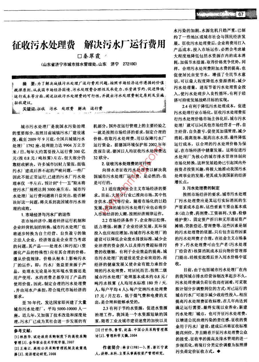 67水污染的加劇,水源危機(jī)趨嚴(yán)重已制約了一些地區(qū)或城市社會(huì)與國(guó)民經(jīng)濟(jì)發(fā)征收污水處理費(fèi)解決污水廠運(yùn)行費(fèi)用展。征收污水處理費(fèi)后,企業(yè)將費(fèi)用打入產(chǎn)品成本投入市場(chǎng)運(yùn)作,必然會(huì)考慮最口秦翠霞大程度地降低包括水資源在內(nèi)的成本消山東省濟(jì)寧市城市排水管理處,山東濟(jì)寧272100耗,加強(qiáng)節(jié)水措施取得價(jià)格競(jìng)爭(zhēng)優(yōu)勢(shì)。同樣,合理污水處理費(fèi)附加水費(fèi)的提高,也促使居民自覺(jué)節(jié)水,增強(qiáng)了全民節(jié)水意摘要:為了解決城鎮(zhèn)污水處理廠運(yùn)行費(fèi)用問(wèn)題按照市場(chǎng)經(jīng)濟(jì)運(yùn)作遵循的價(jià)值:識(shí),可以最人程度降低水資源消耗,減少規(guī)律原則、從我國(guó)市場(chǎng)經(jīng)濟(jì)國(guó)情、污水處理費(fèi)合理性及承受力、水資源節(jié)約、促進(jìn)降低:污水處理量,進(jìn)而節(jié)省污水處理資金投運(yùn)行成本等方面,闡述征收污水處理費(fèi)的可行性,并提出污水處理費(fèi)制定原則及實(shí)施,入,使污水處理步入良性循環(huán),有利于經(jīng)征收建議。濟(jì)可持續(xù)發(fā)展戰(zhàn)略目標(biāo)的實(shí)現(xiàn)關(guān)鍵詞:征收污水處理費(fèi)解決運(yùn)行費(fèi)24有利于降低污水處理成本,促進(jìn)污水處理行業(yè)市場(chǎng)化征收污水處理費(fèi)實(shí)行污水處理價(jià)格市場(chǎng)主體化后,城市污水城市污水處理廠是我國(guó)水污染治理機(jī)部分。國(guó)外在運(yùn)行管理上的主要經(jīng)驗(yàn)之處理就可以同其他市場(chǎng)經(jīng)營(yíng)者一樣,自的重要部分,按照目前城鎮(zhèn)污水廠建設(shè)速一就是按照市場(chǎng)經(jīng)濟(jì)的要求,制定合理的主經(jīng)營(yíng),自負(fù)盈虧,促使其加強(qiáng)管理,減少度截全2009年9月底,全國(guó)共城鎮(zhèn)污水價(jià)格,收取污水處理費(fèi),用以保障污水廠消耗、提高效率提高出水水質(zhì)最終降低處理丿1792座,處理能力達(dá)9904萬(wàn)立方運(yùn)行資金。據(jù)德國(guó)環(huán)境保護(hù)部2002年年運(yùn)行成本,以合理的污水處理價(jià)格為保米/日,每年大約需要投入運(yùn)行費(fèi)300億度報(bào)告說(shuō)德國(guó)日人均征收污水處理費(fèi)達(dá)證,在市場(chǎng)經(jīng)濟(jì)中健康發(fā)展。這將促進(jìn)污(按08元/噸核算)左右,但大部分仍32歐分水處理廠為核心的城市排水管理體制向靠財(cái)政解決。許多城市因財(cái)力緊張,面臨2征收污水處理費(fèi)的可行性市場(chǎng)化轉(zhuǎn)換這種發(fā)展趨勢(shì)已引起國(guó)內(nèi)外污水建成后養(yǎng)不起的嚴(yán)峻問(wèn)題,一些廠向排水者征收污水處理費(fèi)以解決我投資者投資興趣將極大地推動(dòng)我國(guó)污水因此不能正常運(yùn)行,已建的污水廠污水處國(guó)城市污水處理廠運(yùn)行費(fèi),是必然的,也處理事業(yè)的發(fā)展使其成為我國(guó)新的經(jīng)濟(jì)理率僅一半左右。預(yù)計(jì)到十一五”期末將是可行的增長(zhǎng)點(diǎn)。使污水廠規(guī)模達(dá)到3000座左右,城市污21適應(yīng)我國(guó)社會(huì)主義市場(chǎng)經(jīng)濟(jì)的要3.污水處理費(fèi)的制定水處理丿運(yùn)行費(fèi)問(wèn)題將H益突出能否解求目前,大部分行業(yè)已推向市場(chǎng),其中包按照市場(chǎng)經(jīng)濟(jì)的要求,城市污水處理決好這一問(wèn)題將關(guān)系到我國(guó)城市污水治含供水煤氣等行業(yè)。隨著市場(chǎng)化的出趨廠污水處理費(fèi)應(yīng)是其運(yùn)行實(shí)際消耗的生理的成敗。發(fā)展我國(guó)的城市污水處理行業(yè)也必將步產(chǎn)要素成木總和這些要素主要由基本成1.市場(chǎng)經(jīng)濟(jì)與污水廠的運(yùn)作入市場(chǎng)經(jīng)濟(jì)的潮,按照經(jīng)濟(jì)規(guī)律運(yùn)作。本(動(dòng)力費(fèi)、藥劑費(fèi)、工資福利、大修、檢修在市場(chǎng)纖濟(jì)中隨著纖濟(jì)運(yùn)行機(jī)制和22市場(chǎng)經(jīng)濟(jì)條件下,企業(yè)得以松綁,維護(hù)費(fèi))、固定資產(chǎn)折舊和無(wú)形遞延資產(chǎn)企業(yè)經(jīng)背機(jī)制的轉(zhuǎn)換,城市污水處理廠也活力增強(qiáng),刺激了企業(yè)經(jīng)濟(jì)發(fā)展,其環(huán)保攤銷貸款償還、管理費(fèi)等,這些因素是制將逐步轉(zhuǎn)換為臼主經(jīng)營(yíng)、自負(fù)盈虧的獨(dú)投入也應(yīng)相應(yīng)增加而城市污水處理廠的約污水處理費(fèi)的依據(jù),只有包含這些因素立法人企業(yè),經(jīng)濟(jì)效益是企業(yè)首當(dāng)考慮建設(shè)可以降低企業(yè)廢水排放標(biāo)準(zhǔn),減少企的污水處理費(fèi)才合理。在社會(huì)主義市場(chǎng)條的問(wèn)題,其產(chǎn)品—處理水(和污泥)(資業(yè)治理的資金投入以及排污費(fèi)超標(biāo)排污件下,污水處理費(fèi)可由生產(chǎn)者(污水處理源化產(chǎn)品的特殊性)應(yīng)有其合理的價(jià)格,費(fèi)的收繳額,有利于企業(yè)效益的提高,城經(jīng)營(yíng)者)核算消耗成本后向物價(jià)管理部遵從價(jià)值規(guī)律,價(jià)格從根本上影響污水市污水處理廠的建設(shè)是受企業(yè)歡迎的,而門(mén)提出,經(jīng)核實(shí)批準(zhǔn)后并入用水價(jià)格中征廠的運(yùn)作。即:污水
