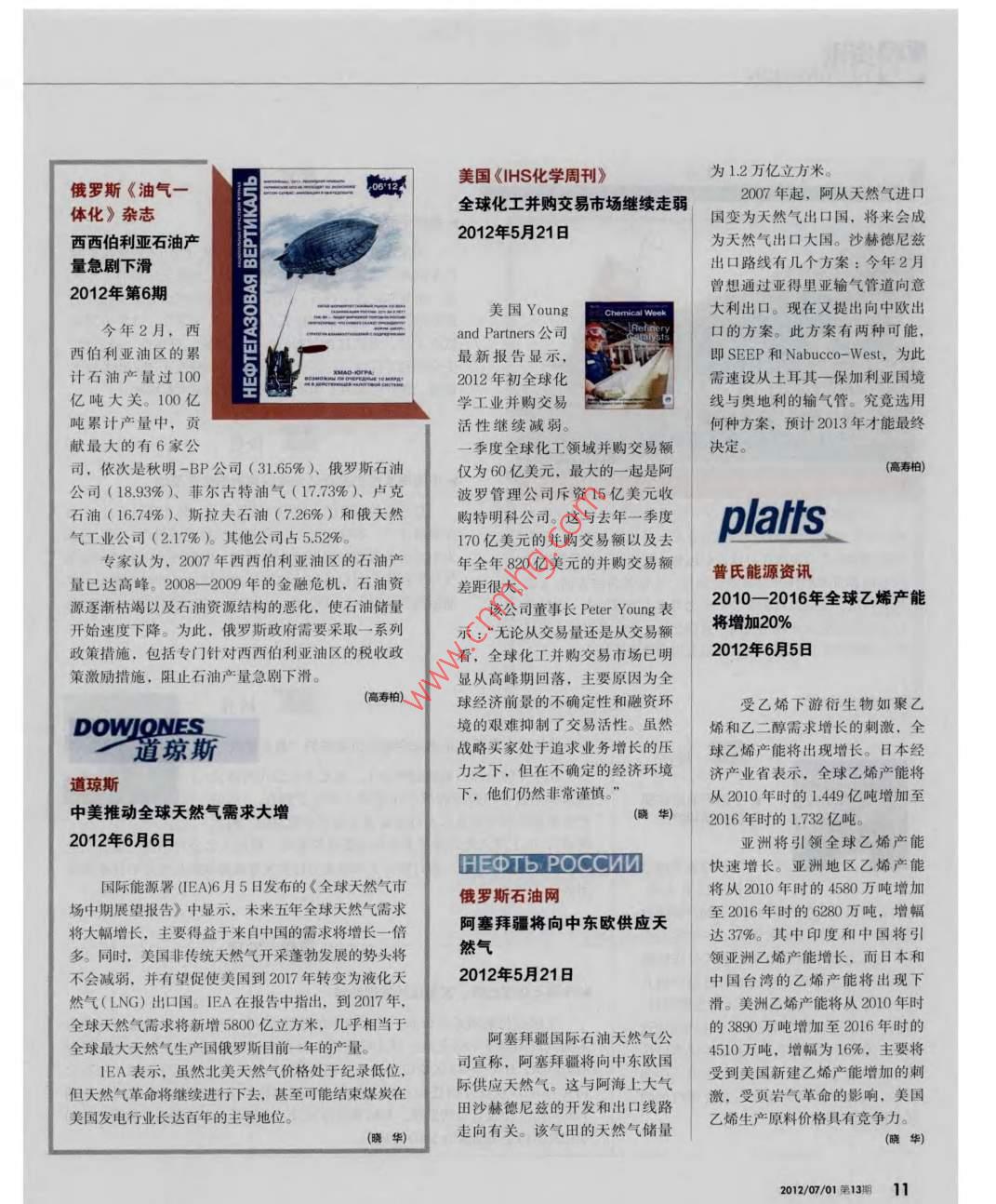 美國《|HS化學(xué)周刊》為12萬億立方米俄羅斯《油氣一全球化工并購交易市場繼續(xù)走弱2007年起,阿從天然氣進(jìn)口體化》雜志國變?yōu)樘烊粴獬隹趪?將來會成西西伯利亞石油產(chǎn)2012年5月21日為天然氣出口大國。沙赫德尼茲量急劇下滑出口路線有幾個方案:今年2月2012年第6期曾想通過亞得里亞輸氣管道向意美國 Young大利出口?,F(xiàn)在又提出向中歐出今年2月,西and Partners公司口的方案。此方案有兩種可能西伯利亞油區(qū)的累巴最新報告顯示,Es即SEEP和 Nabucco-West,為此計石油產(chǎn)量過1002012年初全球化需速設(shè)從土耳其一保加利亞國境億噸大關(guān)。100億學(xué)工業(yè)并購交易線與奧地利的輸氣管。究竟選用噸累計產(chǎn)量中,貢活性繼續(xù)減弱。何種方案,預(yù)計2013年才能最終獻(xiàn)最大的有6家公季度全球化工領(lǐng)域并購交易額決定。司,依次是秋明-BP公司(31.65%)、俄羅斯石油僅為60億美元,最大的一起是阿(高壽柏)公司(18.93%)、菲爾古特油氣(17.73%)、盧克波羅管理公司斥資15億美元收石油(1674%)、斯拉夫石油(728%)和俄天然購特持明科公司。這與去年一季度氣工業(yè)公司(2.17%)。其他公司占5.52%170億美元的并購交易額以及去platts專家認(rèn)為,2007年西西伯利亞油區(qū)的石油產(chǎn)年全年820億美元的并購交易額量已達(dá)高峰。2008-2009年的金融危機(jī),石油資普氏能源資訊差距很大。源逐漸枯竭以及石油資源結(jié)構(gòu)的惡化,使石油儲量該公司董事長 Peter Young表2010-2016年全球乙烯產(chǎn)能開始速度下降。為此,俄羅斯政府需要采取一系列示:“無論從交易量還是從交易額將增加20%政策措施,包括專門針對西西伯利亞油區(qū)的稅收政看,全球化工并購交易市場已明2012年6月5日策激勵措施,阻止石油產(chǎn)量急劇下滑。顯從高峰期回落,主要原因為全(高壽柏)球經(jīng)濟(jì)前景的不確定性和融資環(huán)受乙烯下游衍生物如聚乙DOWONES境的艱難抑制了交易活性。雖然烯和乙二醇需求增長的刺激,全道瓊斯戰(zhàn)略買家處于追求業(yè)務(wù)增長的壓球乙烯產(chǎn)能將出現(xiàn)增長。日本經(jīng)力之下,但在不確定的經(jīng)濟(jì)環(huán)境濟(jì)產(chǎn)業(yè)省表示,全球乙烯產(chǎn)能將道瓊斯下,他們?nèi)匀环浅V?jǐn)慎?!睆?010年時的1.449億噸增加至中美推動全球天然氣需求大增曉華)2016年時的1.732億噸2012年6月6日亞洲將引領(lǐng)全球乙烯產(chǎn)能HEOTb POCCWM快速增長。亞洲地區(qū)乙烯產(chǎn)能國際能源署(IEA)6月5日發(fā)布的《全球天然氣市俄羅斯石油網(wǎng)將從2010年時的4580萬噸增加場中期展望報告》中顯示,未來五年全球天然氣需求阿塞拜疆將向中東歐供應(yīng)天至2016年時的6280萬噸,增幅將大幅增長,主要得益于來自中國的需求將增長一倍多。同時,美國非傳統(tǒng)天然氣開采蓬勃發(fā)展的勢頭將然氣達(dá)37%。其中印度和中國將引領(lǐng)亞洲乙烯產(chǎn)能增長,而日本和不會減弱,并有望促使美國到2017年轉(zhuǎn)變?yōu)橐夯?012年5月21日中國臺灣的乙烯產(chǎn)能將出現(xiàn)下然氣(LNG)出口國。IEA在報告中指出,到2017年,滑。美洲乙烯產(chǎn)能將從2010年時全球天然氣需求將新增5800億立方米,幾乎相當(dāng)于全球最大天然氣生產(chǎn)國俄羅斯目前一年的產(chǎn)量。阿塞拜疆國際石油天然氣公的3890萬噸增加至2016年時的4510萬噸,增幅為16%,主要將EA表示,雖然北美天然氣價格處于紀(jì)錄低位,詞宣稱,阿塞拜疆將向中東歐國受到美國新建乙烯產(chǎn)能增加的刺但天然氣革命將繼續(xù)進(jìn)行下去,甚至可能結(jié)束煤炭在際供應(yīng)天然氣。這與阿海上大氣激,受頁巖氣革命的影響,美國美國發(fā)電行業(yè)長達(dá)百年的主導(dǎo)地位田沙赫德尼茲的開發(fā)和出口線路(曉華走向有關(guān)。該氣田的天然氣儲量乙烯生產(chǎn)原料價格具有競爭力012/07/01第13期11
