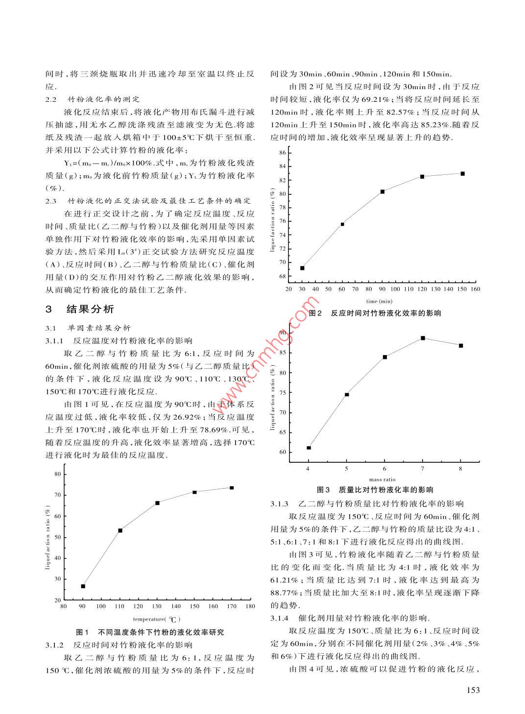 第30卷第4期柳州師專學(xué)報(bào)Vol30 No 42015年8月Journal of Liuzhou Teachers CollegeAug.2015竹粉乙二醇液化工藝的優(yōu)化陳燕萌,錢善勤,文勝,玉瀾,廖政達(dá)(廣西科技師范學(xué)院化學(xué)與生命科學(xué)系,廣西來(lái)賓546199摘要:為了研究竹粉乙二醇液化的優(yōu)化工藝,通過(guò)單因素試驗(yàn)研究了反應(yīng)溫度、反應(yīng)時(shí)間、催化劑用量、乙二醇與竹粉質(zhì)量比等因素對(duì)竹粉液化效率的影響,并通過(guò)正交試驗(yàn)確定最佳液化工藝條件.在竹粉乙二醇液化過(guò)程中,影響液化效果最為顯著的條件是反應(yīng)溫度,其余依次是反應(yīng)時(shí)間,質(zhì)量比以及催化劑用量.結(jié)果表明:最佳的工藝條件為液化反應(yīng)溫度170℃,液化時(shí)間90min,乙二醇與竹粉質(zhì)量比為6,催化劑用量6%關(guān)鍵詞:竹粉;乙二醇;液化工藝;優(yōu)化中圖分類號(hào):TQ3534+1文獻(xiàn)標(biāo)識(shí)碼:A文章編號(hào):1003-7020(2015)04-0152-04竹子是我國(guó)重要的植物資源之一,具有生長(zhǎng)快1材料、儀器設(shè)備更新快、生態(tài)與經(jīng)濟(jì)價(jià)值高等特點(diǎn)1現(xiàn)在隨著我國(guó)竹類生產(chǎn)及加工類產(chǎn)業(yè)的迅速發(fā)展,加工過(guò)程中所產(chǎn)生1.1試驗(yàn)原料的竹屑?xì)堅(jiān)鹉暝龆?3,竹屑?xì)堅(jiān)ǔ2扇》贌蛑穹廴∽詮V西柳州融安縣豐園木業(yè)有限公司,粉者隨意丟棄等方法處理,這不僅污染了環(huán)境,而且也碎后過(guò)篩選用40-80目,放于100±5℃的烘箱中烘干液化反應(yīng)是實(shí)現(xiàn)固態(tài)生物質(zhì)資源高附加值利用多量恒定,用自封袋包裝好后放入干燥器中保存造成了極大的資源浪費(fèi)至質(zhì)的一種有效方法,是在高溫條件下通過(guò)一定的溶劑1.2化學(xué)試劑催化劑及壓力的作用使材料由固態(tài)轉(zhuǎn)變?yōu)橐簯B(tài)的熱噸,西隴化工:無(wú)水乙醇,分析純,西隴化工.,6乙二醇(甘醇),分析純,西隴化工;濃硫酸,分析化學(xué)過(guò)程4.天然生物質(zhì)材料的主要成分是纖維素、半1.3儀器設(shè)備纖維素和木質(zhì)素,這些含大量羥基的高分子物質(zhì),在萬(wàn)能粉碎機(jī),天津泰斯特FW100;遠(yuǎn)紅外快速干高溫條件下可以液化反應(yīng),裂解生成富含酚基群、多燥箱,上海躍進(jìn)醫(yī)療器械有限公司YHG-600Bs;強(qiáng)力元醇的小分子量物質(zhì),作為制備酚醛樹(shù)脂和聚氨酯等電動(dòng)攪拌機(jī),上海昂尼儀器儀表有限公司JB90-D;集多種高分子材料的原料甘蔗渣、水稻秸稈、玉米秸熱式恒溫加熱磁力攪拌器,河南鞏義市予華儀器有限桿以及竹材殘基等含多種纖維素物質(zhì)均已成功進(jìn)公司DF-1015;循環(huán)水式真空泵,鞏義市予華儀器有行液化反應(yīng),在液化工藝上也采用了苯酚、多元醇等限公司SHz-DⅢ;旋轉(zhuǎn)蒸發(fā)器,上海亞榮生化儀器多種液化方法近年來(lái),國(guó)內(nèi)外學(xué)者在竹材液化制RE-52AA備高分子材料方面有一定的進(jìn)展,而且竹材制備的聚2實(shí)驗(yàn)方法氨酯膠黏劑及聚氨酯泡沫具有很好的可降解性,同2實(shí)驗(yàn)方法時(shí)也為替代石油制品的高分子材料創(chuàng)造了新型的途2.1竹粉液化方法稱取5g竹粉裝入250m1的三頸燒瓶中,按設(shè)定比本文是以竹材加工廢棄物竹粉為原料,采用分步例加入乙二醇和濃硫酸并混合均勻,裝上攪拌器、冷研究的方法,探討了反應(yīng)溫度、反應(yīng)時(shí)間、質(zhì)量比以及凝裝置,并將其放入加熱至預(yù)設(shè)溫度的油浴鍋中,開(kāi)催化劑用量等因素對(duì)竹粉液化效率的影響啟攪拌器并同時(shí)記錄反應(yīng)開(kāi)始時(shí)間,待反應(yīng)到預(yù)設(shè)時(shí)[收稿日期]2015-06-23[基金項(xiàng)目]廣西教育廳科研項(xiàng)目(LX2014494);柳州師專科研創(chuàng)新團(tuán)隊(duì)建設(shè)項(xiàng)目“植物纖維素的機(jī)械活化改性與應(yīng)用研究[作者簡(jiǎn)介]陳燕萌(1986—),廣西陸川人,碩士,助教,研究方向:植物纖維的酯化及應(yīng)用。[通訊作者]廖政達(dá)(1967—),廣西象州人,教授,研究方向:天然植物纖維素的改性與應(yīng)用研究。間時(shí),將三頸燒瓶取出并迅速冷卻至室溫以終止反間設(shè)為30min、60min、9Omin、120min和150min.由圖2可見(jiàn)當(dāng)反應(yīng)時(shí)間設(shè)為30min時(shí),由于反應(yīng)2.2竹粉液化率的測(cè)定時(shí)間較短,液化率僅為6921%;當(dāng)將反應(yīng)時(shí)間延長(zhǎng)至液化反應(yīng)結(jié)東后,將液化產(chǎn)物用布氏漏斗進(jìn)行減120min時(shí),液化率則上升至82.57%;當(dāng)反應(yīng)時(shí)間從壓抽濾,用無(wú)水乙醇洗滌殘?jiān)翞V液變?yōu)闊o(wú)色.將濾120min上升至150min時(shí),液化率高達(dá)85.23%.隨著反紙及殘?jiān)黄鸱湃牒嫦渲杏?00±5℃下烘干至恒重.應(yīng)時(shí)間的增加,液化效率呈現(xiàn)顯著上升的趨勢(shì)并采用以下公式計(jì)算竹粉的液化率:Y1=(m-m)/m×100%式中,m,為竹粉液化殘?jiān)?質(zhì)量(g);m為液化前竹粉質(zhì)量(g);Y為竹粉液化率%)這23竹粉液化的正交法試驗(yàn)及最佳工藝條件的確定在進(jìn)行正交設(shè)計(jì)之前,為了確定反應(yīng)溫度、,反應(yīng)78時(shí)間質(zhì)量比(乙三醇與竹粉)以及催化劑用量等因素2單獨(dú)作用下對(duì)竹粉液化效率的影響,先采用單因素試驗(yàn)方法,然后采用L(34)正交試驗(yàn)方法研究反應(