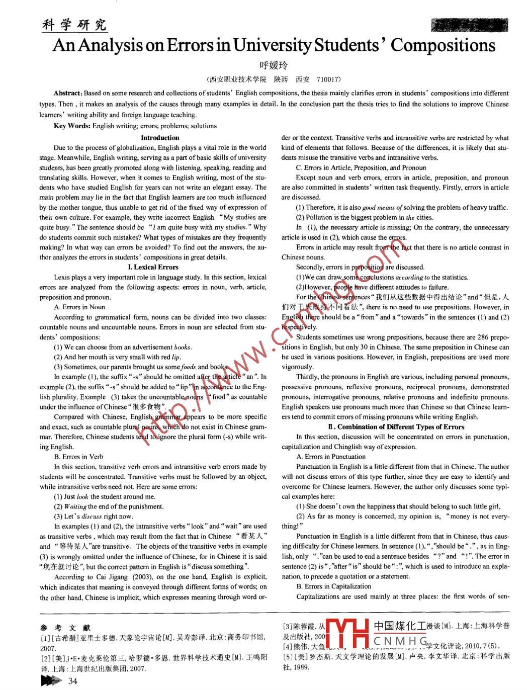 科學(xué)研究An Analysis on Errors in University Students’Compositions呼媛玲(西安職業(yè)技術(shù)學(xué)院陜西西安710017)Abstract: Based on some rescarch and clltions of students' English compositions, the thesis mainly clarfies erors in students' compositions into diferenttypes. Then , it makes an analysis of the causes through many examples in detail. In the conclusion part the thesis tries to find the solutions to improve Chineseleamers' writing ability and foreign language teaching.Key Words: English writing; errors; problems; solutinsIntroductionder or the context. Transitive verbs and intransitive verbs are restricted by whatDuc to the process of globalization, English plays a vital role in the world kind of elements that follows. Because of the diferences, it is likely that stu-stage. Meanwhile, English writing, serving as a part of basic skills of university dents misuse the transitive verbs and intransitive verbs.students, has been greatly promoted along with listening, speaking, reading andC. Errors in Article, Preposition, and Pronountranslating sills. However, when it comes to English writing, most of the stu-Except noun and verb crrors, errors in article, preposition, and pronoundents who have studied English for years can not write an elegant essay. Theare also committed in students' written task frequently. Firstly, errors in articlemain problem may lie in the fact that English learners are too much influencedare discussed.by the mother tongue, thus unable to get rid of the fixed way of expression of(1) Therefore, it is also good means of solving the problem ofheavy taffic.their own culture. For example, they write inoret English“My studies are(2) Pllution is the biggest problem in the cities.quite busy.”The sentence should be“I am quite busy with my studies.”WhyIn (1), the necessary article is missing; On the contrary, the unnecessarydo students commit such mistakes? What types of mistakes are they frequcntlyarticle is used in (2), which cause the errors.making? In what way can errors be avoided? To find out the answers, the au-Errors in article may result from the fact that there is no article contrast inthor analyzes the errors in students' compositions in great details.Chinese nouns.I. Lexical ErrorsSecondly, errors in preposition are discussed.Lexis plays a very important role in language study. In this section, lexical(1)We can draw some conclusions according to the satistis.errors are analyzed from the following aspects: errors in noun, verb, article,(2)However, people have different atitudes t0 failure.preposition and pronoun.For the Chinese sentences“我們從這些數(shù)據(jù)中得出結(jié)論”and“但是,人A. Errors in Noun們對(duì)于失敗持不同看法”,there is no need to use prepositions. However, inAccording to grammatical form, nouns can be divided into two classes:English there should be a“from" and a“towards" in the sentences (1) and (2)countable nouns and uncountable nouns. Errors in noun are selected from stu-respectively.dents' compositions:Students sometimes use wrong prepositions, because there are 286 prepo-(1) We can choose from an advertisement books.sitions in English, but only 30 in Chinese. The same preposition in Chinese can(2) And her mouth is very small with red lip.be used in various positions. However, in English, prepositions are used more(3) Sometimes, our parents brought us some foods and books.vigorously.In example (1), the suffix“-s”should be omitted after the article“an". InThrdly, the pronouns in English are various, including personal pronouns,example (2), the sufx“-s”should be added to“l(fā)ip" in accordance to the Eng-possessive pronouns, reflexive pronouns, reciprocal pronouns, dermonstratedlish plurality. Example (3) takes the uncountable nouns“ food”as countablepronouns, interrogative pronouns, relative pronouns and indefinite pronouns.under the influence ofChinese"很多食物”.English speakers use pronouns much more than Chinese so that Chinese learn-Compared with Chinese, English grammar appears to be more specificers tend to commit rrors of missing pronouns while writing English.and exact, such as countable plural nouns, which do not exist in Chinese gram-I . Combination of Different Types of Errorsmar. Therefore, Chinese students tend to ignore the plural form (-) while writIn this section, discussion will be concentated on erors in punctuation,ing English.capitalization and Chinglish way of expression.B. Errors in VerbA. Errors in PunctuationIn this section, transitive verb errors and intransitive verb errors made byPunctuation in English is a ltte difrent from that in Chinese. The authorstudents will be concentrated, Transitive verbs must be followed by an object,will not discuss errors of this type futher, since they are easy to identify andwhile intransitive verbs need not. Here are some errors:overcome for Chinese learners. However, the author only discusses some typi-(1) Just look the student around me.cal examples here: .(2) w aiting the end of the punishment.(1) She doesn't own the happiness that should belong to such itte gil,(3) Let's discuss right now.(2) As far as money is concermed, my opinion is,“ money is not every-In examples (1) and (2), the intransitive verbs“l(fā)ook" and“wait" are usedas transitive verbs,which may result from the fact that in Chineseand “ 等待某人"are transitive. The objects of the transitive verbs in exampleing difficulty for Chinese learners. In sentence (1),"“, "should be"." , as in Eng-(3) is wrongly omitted under the infuence of Chinese, for in Chinese it is saidlish, only“."can be used to end a sentence besides“?” and“!”. The error in“現(xiàn)在就討論”, but the crreet pattem in English is“discuss somehing”.sentence (2) is“,"after“is" should be“:", which is used to introduce an expla-According to Cai Jjigang (2003), on the one hand, English is explicit,natio