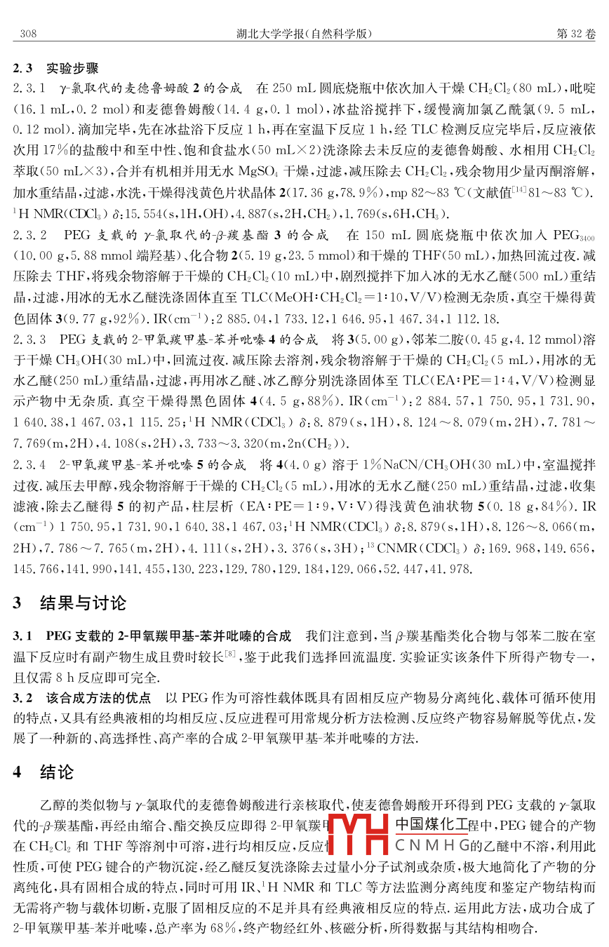 第32卷第3期湖北大學(xué)學(xué)報(bào)(自然科學(xué)版)Vol. 32 No. 32010年9月Journal of Hubei University( Natural Science)Sep.,2010文章編號(hào): 1000- 2375(2010)03 - 0307 - 032-甲氧羰甲基-苯并吡嗪的聚乙二醇支載合成研究馮春,晏曉清,盧翠芬,楊桂春(湖北大學(xué)化學(xué)化工學(xué)院,湖北武漢430062)摘要:利用聚乙二醇(PEG)作為可溶性聚合物載體,經(jīng)過(guò)3步反應(yīng)支載合成2甲氧羰甲基苯并吡嗪,總產(chǎn)率68%,反應(yīng)條件溫和.后處理簡(jiǎn)單.產(chǎn)物經(jīng)紅外、核磁分析,所得數(shù)據(jù)與其結(jié)構(gòu)相吻合.關(guān)鍵詞:聚乙二醇;支載;合成;苯并吡嗪.中圖分類號(hào):O625.7文獻(xiàn)標(biāo)志碼:A1引言苯并吡嗪是一類重要的雜環(huán)化合物,具有抗菌、抗病毒和抗腫瘤等生物活性[-2],如2-甲基-N,N'-二氧苯并吡嗪的3號(hào)位被氨基、脒基、酰肼或酯基取代后具有殺菌性[3,因此苯并吡嗪及其衍生物的合成備受關(guān)注,其主要的合成方法是鄰苯二胺與乙二醛或其類似物的縮合[45]和1,5-二烷基-1,2,5-三氮雜衍生物的熱聚合[67],其中絕大多數(shù)涉及的是苯并吡嗪或二甲基苯并吡嗪的合成,而苯并吡嗪酯的合成研究極少,產(chǎn)率很低[8].基于聚乙二醇(PEG)作為可溶性聚合物載體的優(yōu)點(diǎn)[9-10]和我們開展了系列PEG支載有機(jī)合成的研究1-13]1 ,我們將PEG3400與r氯取代的麥德魯姆酸反應(yīng),制備PEG支載的γ-氯代β羰基酯,再與鄰苯二胺進(jìn)行液相反應(yīng),得到了PEG支載的2-甲氧羰甲基苯并吡嗪,在NaCN的甲醇溶液中解脫得2-甲氧羰甲基苯并吡嗪5(Scheme1).ypoNH2-OH_i ia1% NaCN/CH;OH=PEG34005Scheme 12-甲 氧羰甲基苯并吡嗪的液相支載合成2實(shí)驗(yàn)部分2.1主要儀器熔點(diǎn)儀:WRSIA數(shù)位熔點(diǎn)儀,上海精密科學(xué)儀器有限公司,溫度計(jì)未經(jīng)校正;TLC紫外檢測(cè)儀:河南予華儀器有限公司,254nm紫外光照射;紅外光譜儀:PESpectrumOne型紅外光譜儀,NaCl-單晶涂片;核磁共振儀: INOVA( 600 MHz),'H NMR(600 MHz), 18C NMR( 150 MHz) ,CDCl:為溶劑, TMS(0.03%)為內(nèi)標(biāo).中國(guó)煤化工2.2試劑處理無(wú)水甲醇:碘引發(fā)鎂屑回流干燥;二MYHCNMHG燥;四氫呋喃:鈉絲回流干燥.收稿日期: 2009-07- 16基金項(xiàng)目:湖北省自然科學(xué)基金(2007ABA031)資助作者簡(jiǎn)介:馮春(1984 -),男,碩士生;楊桂春,通信作者. Email: yangguichun@ hubu. edu. cn308湖北大學(xué)學(xué)報(bào)(自然科學(xué)版)第32卷2.3 實(shí)驗(yàn)步驟2.3.1 r 氯取代的麥德魯姆酸2的合成在250 mL圓底燒瓶中依次加入干燥CH2Cl2 (80 mL) ,吡啶(16.1 mL,0.2 mol)和麥德魯姆酸(14.4 g,0. 1 mol),冰鹽浴攪拌下,緩慢滴加氯乙酰氯(9.5 mL,0. 12 mol).滴加完畢,先在冰鹽浴下反應(yīng)1 h,再在室溫下反應(yīng)1 h,經(jīng)TLC檢測(cè)反應(yīng)完畢后,反應(yīng)液依次用17%的鹽酸中和至中性、飽和食鹽水(50mLX2)洗滌除去未反應(yīng)的麥德魯姆酸、水相用CH2Cl2萃取(50mLX3),合并有機(jī)相并用無(wú)水MgSO.干燥,過(guò)濾,減壓除去CH2Cl2,殘余物用少量丙酮溶解,加水重結(jié)晶,過(guò)濾,水洗,干燥得淺黃色片狀晶體2(17.36 g,78. 9%),mp 82~83 °C(文獻(xiàn)值4081~83 °C).H NMR(CDCl:) 8:15. 554(s,1H,OH),4.887(s,2H,CH2),1. 769(s,6H,CH,).2.3.2PEG支載的r氯取代的β羰基酯3的合成在150 mL圓底燒瓶中依次加人PEGs00(10. 00 g,5. 88 mmol端羥基)、化合物2(5. 19 g,23. 5 mmol)和干燥的THF(50 mL) ,加熱回流過(guò)夜.減壓除去THF ,將殘余物溶解于干燥的CH2Cl2 (10 mL)中,劇烈攪拌下加人冰的無(wú)水乙醚(500 mL)重結(jié)晶,過(guò)濾,用冰的無(wú)水乙醚洗滌固體直至TLC( MeOH:CH2Cl2 = 1:10,V/V)檢測(cè)無(wú)雜質(zhì),真空干燥得黃色固體3(9.77 g,92%). IR(cm-1):2 885. 04,1 733. 12,1 646. 95,1 467.34,1 112. 18.2.3.3 PEG 支載的2-甲氧羰甲基-苯并吡嗪4的合成將3(5.00 g),鄰苯二胺(0.45 g,4. 12 mmol)溶于干燥CH:OH(30 mL)中,回流過(guò)夜.減壓除去溶劑,殘余物溶解于干燥的CH2Cl2(5 mL),用冰的無(wú)水乙醚(250 mL)重結(jié)晶,過(guò)濾,再用冰乙醚、冰乙醇分別洗滌固體至TLC(EA:PE=1:4,V/V)檢測(cè)顯示產(chǎn)物中無(wú)雜質(zhì).真空干燥得黑色固體4(4.5 g,88%). IR(cm 1):2 884. 57,1 750. 95,1 731. 90,1 640. 38,1 467.03,1 115. 25;'H NMR(CDCl;) 8:8. 879(s,1H),8. 124~8. 079(m, 2H),7.781~7.769(m,2H),4.108(s,2H),3. 733~3.320( m,2n(CH2)).2.3.4 2-甲氧羰甲基-苯并吡嗪5的合成將4(4.0g)溶于1%NaCN/CH3OH(30 mL)中,室溫?cái)嚢柽^(guò)夜.減壓去甲醇,殘余物溶解于干燥的CH2Cl2(5mL),用冰的無(wú)水乙醚(250mL)重結(jié)晶,過(guò)濾,收集濾液,除去乙醚得5的初產(chǎn)品,柱層析(EA:PE=1:9,V:V)得淺黃色油狀物5(0. 18 g,84%). IR(cm-1) 1 750. 95,1 731. 90,1 640. 38,1 467. 03;' H NMR(CDCl3) 8:8. 879(s,1H),8.126~ 8.066(m,2H),7. 786~7. 765(m,2H),4. 111(s,2H), 3.376(s, 3H);'CNMR(CDCl3) 8: 169.968, 149. 656,145.766,141. 990,141. 455, 130.223, 129.780,129. 184,129. 066,52. 447,41. 978.3結(jié)果與討論3.1 PEG 支載的2-甲氧羰甲基苯并吡嗪的合成我們注意到, 當(dāng)β羰基酯類化合物與鄰苯二胺在室溫下反應(yīng)時(shí)有副產(chǎn)物生成且費(fèi)時(shí)較長(zhǎng)[8],鑒于此我們選擇回流溫度.實(shí)驗(yàn)證實(shí)該條件下所得產(chǎn)物專-一,且僅需8 h反應(yīng)即可完全.3.2該合 成方法的優(yōu)點(diǎn)以PEG作為可溶性載體既具有固相反應(yīng)產(chǎn)物易分離純化、載體可循環(huán)使用的特點(diǎn),又具有經(jīng)典液相的均相反應(yīng)、反應(yīng)進(jìn)程可用常規(guī)分析方法檢測(cè)