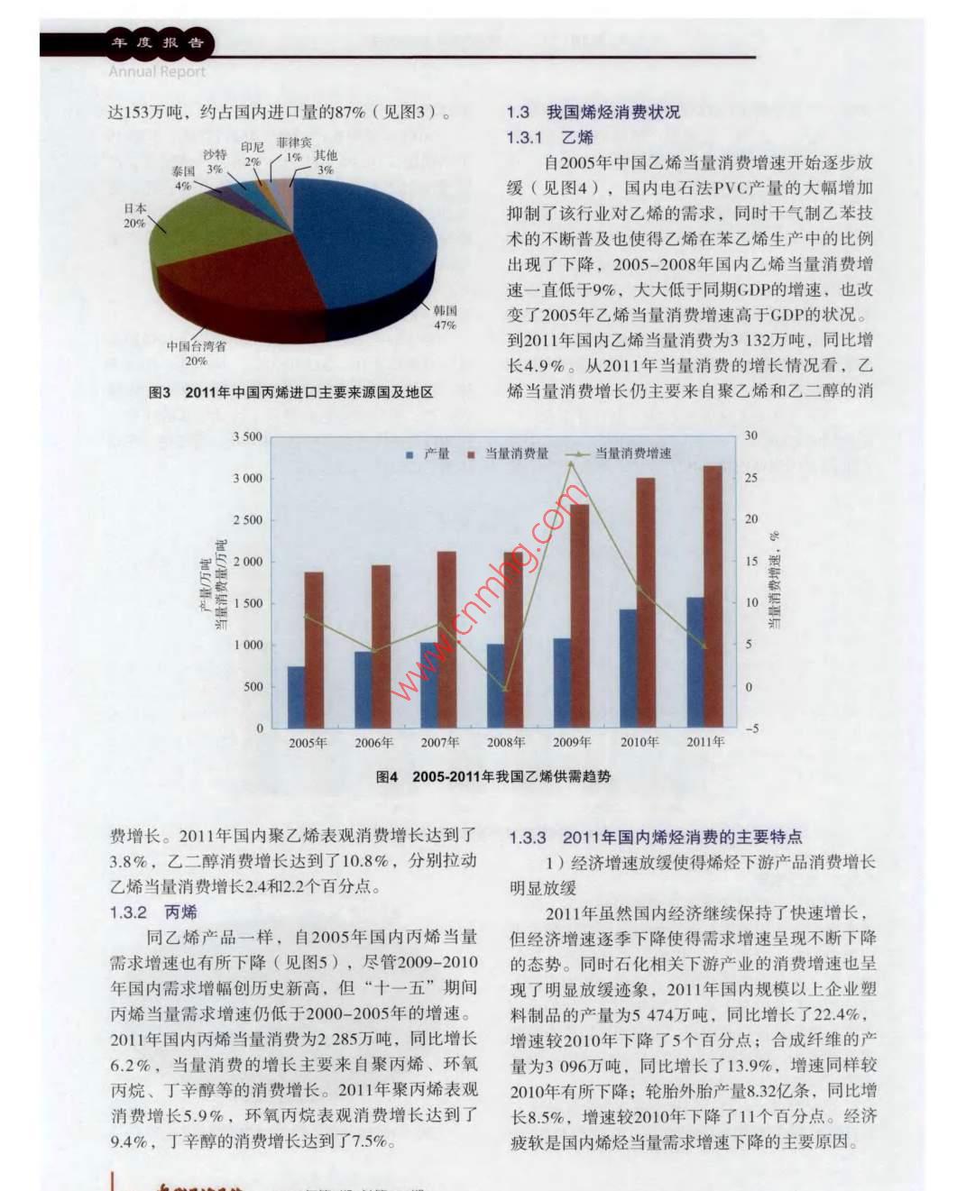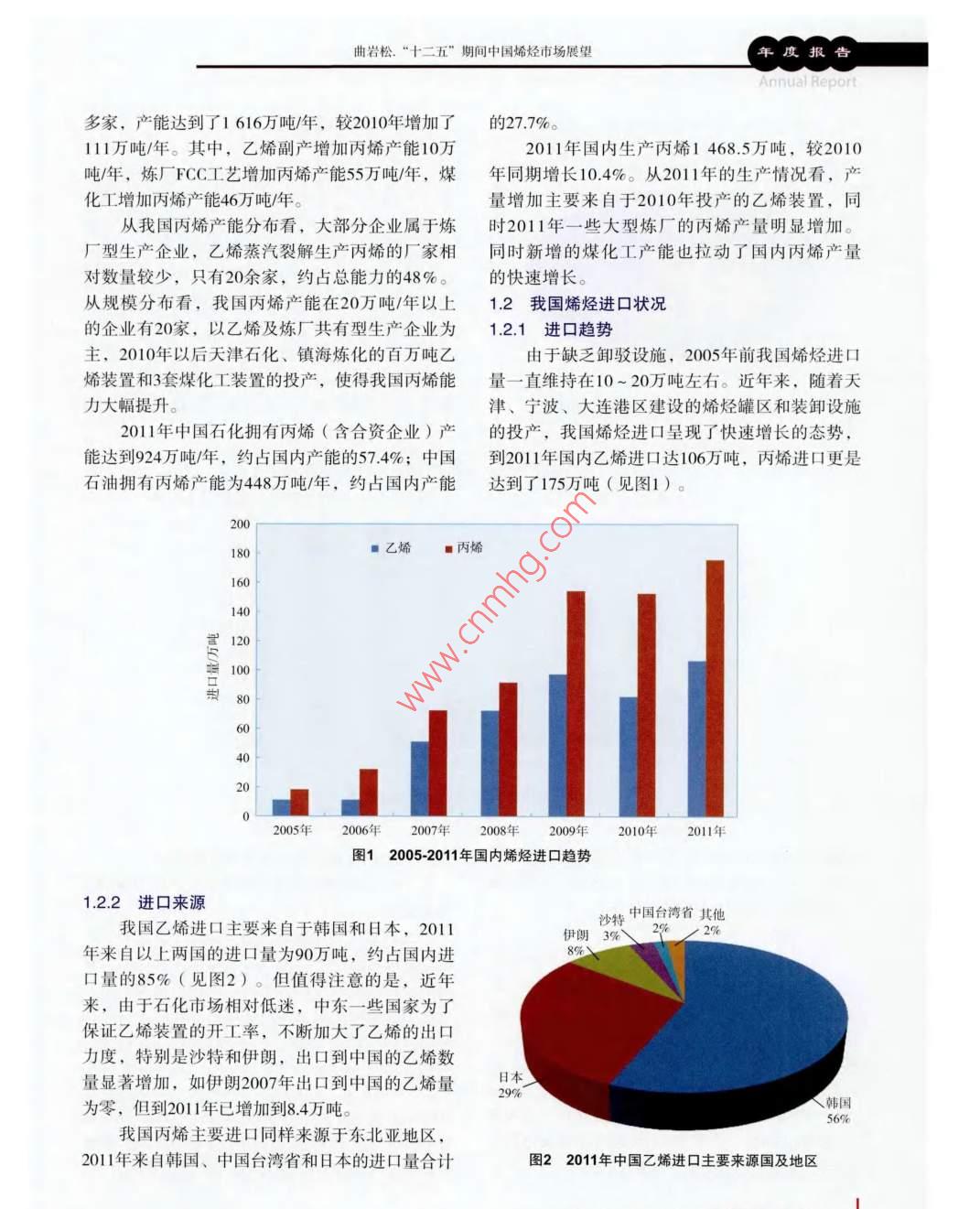 年度報告Annual Report“十二五”期間中國烯烴市場展望曲巖松(中國石化集團公司經(jīng)濟技術(shù)研究院,北京100029 )摘要: 回顧并分析了2011年中國烯烴市場的供需情況及進口狀況,預(yù)測了“十二五”期間的烯烴市場供需情況,指出了“十二五”期間仍是中國烯烴工業(yè)發(fā)展較快的時期,2015年中國烯烴下游市場將面臨日趨激烈的競爭。關(guān)鍵詞:乙烯丙烯供需預(yù)測中國2011年“十二五”期間從2009年下半年開始我國進入了新一- 輪乙烯國。與此同時,隨著國內(nèi)煤化工產(chǎn)業(yè)的發(fā)展,我擴能高峰期,到201 1年我國先后有4套新建大型乙國丙烯產(chǎn)能也大幅增加,到2011年底丙烯產(chǎn)能超烯裝置投產(chǎn),3套乙烯裝置擴能,同時3套以煤為過了1 600萬噸/年,超過美國成為世界上最大的丙原料的MTO和MTP裝置投產(chǎn),近3年國內(nèi)新增乙烯烯生產(chǎn)國。能力523萬噸/年,新增丙烯能力460萬噸/年,到1.1.1乙烯2011年底,我國乙烯產(chǎn)能達1 520萬噸/年,丙烯產(chǎn)截止到2011年底,我國共擁有乙烯生產(chǎn)企業(yè)能達1 616萬噸/年。受2009年中國政府實施加大投24家,生產(chǎn)裝置28套,產(chǎn)能達到了1 520萬噸/年。資和促進消費的政策影響,國內(nèi)烯烴消費于2009其中,中國石化擁有16套乙烯生產(chǎn)裝置(含合資年和2010年大幅增加,201 1年由于歐債危機爆發(fā)企業(yè)),產(chǎn)能達到942.5萬噸/年;中國石油擁有乙和國內(nèi)逐步退出刺激消費政策,國內(nèi)烯烴消費增烯裝置8套, 產(chǎn)能為371萬噸/年。近年來,隨著國速明顯放緩。2011年乙烯和丙烯當量消費增幅分內(nèi)大型乙烯裝置的不斷投產(chǎn),國內(nèi)單套乙烯能力別為4.9%和6.2%。不斷提高,到2011年國內(nèi)以石腦油為原料的乙烯未來幾年,中國烯烴工業(yè)仍處于快速發(fā)展裝置單套平均產(chǎn)能為55萬噸/年,已超過世界平均期,除了傳統(tǒng)烯烴來源外,煤化工、丙烷脫氫工水平(單套能力53萬噸/年)。藝將在國內(nèi)得到快速發(fā)展,預(yù)計到2015年我國乙2011年國內(nèi)生產(chǎn)乙烯1554萬噸,較2010年烯產(chǎn)能將超過2500萬噸/年,丙烯產(chǎn)能將超過同期增長9.4%。從201 1年的生產(chǎn)情況看,雖然國3 000萬噸/年。未來國內(nèi)烯烴需求將穩(wěn)定增長,預(yù)內(nèi)乙烯產(chǎn)量有了較大提高,但受到需求疲軟的影計“十二五”期間我國烯烴消費年均增速仍將保響,國內(nèi)2、3季度檢修明顯增加,除上年新建企持在5% ~ 6%。業(yè)外,大部分企業(yè)的產(chǎn)量低于2010年。1.1.2 丙烯1 2011年國內(nèi)烯烴供需回顧截止到2011年底,我國共有丙烯生產(chǎn)企業(yè)801.1 我國烯烴生產(chǎn)狀況從2009年下半年起,隨著福建、獨山子、天收稿日期: 2012-03-15。津、鎮(zhèn)海等大型乙烯裝置建成投產(chǎn),國內(nèi)乙烯能作者簡介:曲巖松,高級工程師,1986年畢業(yè)于大力大幅提升,到2011 年底我國乙烯能力已超過連理工大學(xué)化工學(xué)院,現(xiàn)任中國石化集團公司經(jīng)濟1 500萬噸/年,成為僅次于美國的第二大乙烯生產(chǎn)技術(shù)研究院市場營銷研究所所長。6當代石油石化2012年第3期 總第207期曲巖松.“十二五”期間中國烯烴市場展望年度報告Annual Report多家,產(chǎn)能達到了1 616萬噸/年,較2010年增加了的27.7%。111萬噸/年。其中,乙烯副產(chǎn)增加丙烯產(chǎn)能10萬2011年國內(nèi)生產(chǎn)丙烯1 468.5萬噸,較2010噸/年,煉廠FCC工藝增加丙烯產(chǎn)能55萬噸/年,煤年同期增長10.4%。從2011年的生產(chǎn)情況看,產(chǎn)化工增加丙烯產(chǎn)能46萬噸/年。量增加主要來自于2010年投產(chǎn)的乙烯裝置,同從我國丙烯產(chǎn)能分布看,大部分企業(yè)屬于煉時2011年--些大型煉廠的丙烯產(chǎn)量明顯增加。廠型生產(chǎn)企業(yè),乙烯蒸汽裂解生產(chǎn)丙烯的廠家相同時新增的煤化工產(chǎn)能也拉動了國內(nèi)丙烯產(chǎn)量對數(shù)量較少,只有20余家,約占總能力的48%。的快速增長。從規(guī)模分布看,我國丙烯產(chǎn)能在20萬噸/年以上1.2我國烯烴進 口狀況的企業(yè)有20家,以乙烯及煉廠共有型生產(chǎn)企業(yè)為1.2.1進口趨勢主,2010年以后天津石化、鎮(zhèn)海煉化的百萬噸乙由于缺乏卸駁設(shè)施,2005年 前我國烯烴進口烯裝置和3套煤化工裝置的投產(chǎn),使得我國丙烯能量一直維持在10~ 20萬噸左右。近年來,隨著天力大幅提升。津、寧波、大連港區(qū)建設(shè)的烯烴罐區(qū)和裝卸設(shè)施201 1年中國石化擁有丙烯(含合資企業(yè))產(chǎn)的投產(chǎn),我國烯烴進口呈現(xiàn)了快速增長的態(tài)勢,能達到924萬噸/年,約占國內(nèi)產(chǎn)能的57.4%;中國到201 1年國內(nèi)乙烯進口達106萬噸,丙烯進口更是石油擁有丙烯產(chǎn)能為448萬噸/年,約占國內(nèi)產(chǎn)能達到了175萬噸(見圖1)。200180■乙烯■丙烯1614120i 1086(4202005年2006年2007年2008年2009年2010年2011年圖1 2005-2011年國內(nèi)烯烴進口趨勢1.2.2進口來源沙特中國臺灣省其他我國乙烯進口主要來自于韓國和日本,2011伊朗3% 2902 2%年來自以上兩國的進口量為90萬噸,約占國內(nèi)進8%口量的85% (見圖2)。但值得注意的是,近年來,由于石化市場相對低迷,中東一些國家為了保證乙烯裝置的開工率,不斷加大了乙烯的出口力度,特別是沙特和伊朗,出口到中國的乙烯數(shù)量顯著增加,如伊朗2007年出口到中國的乙烯量日本29%韓國為零,但到2