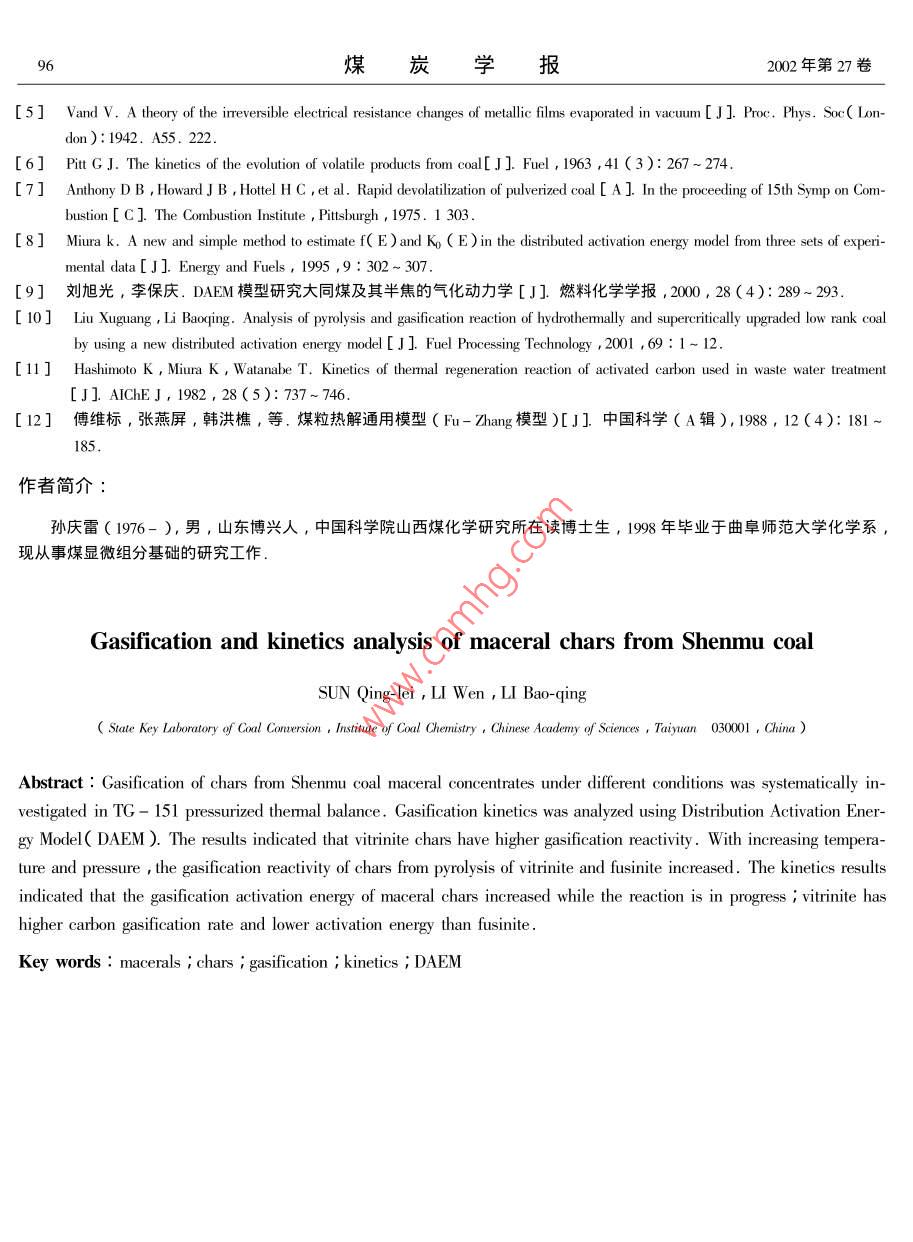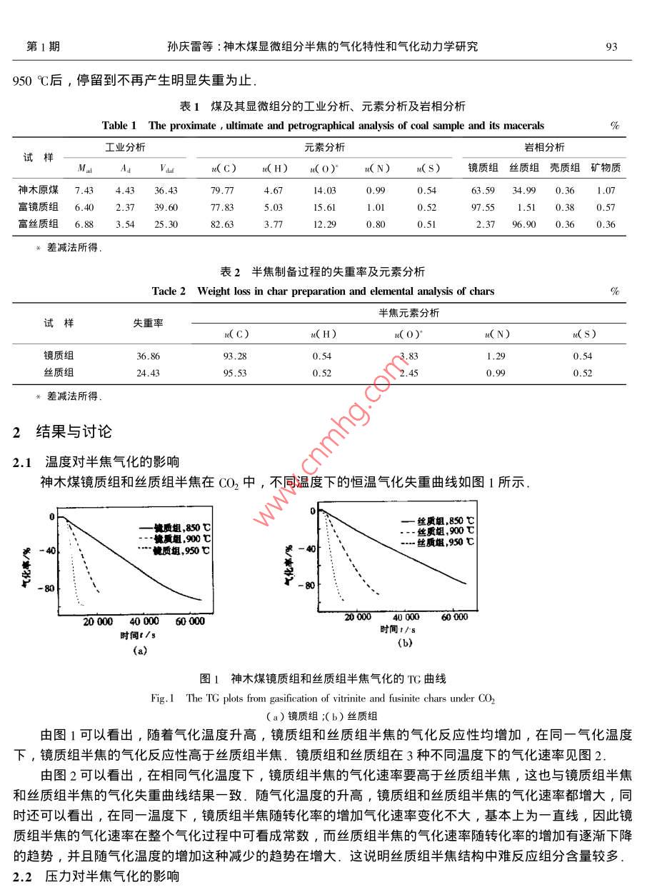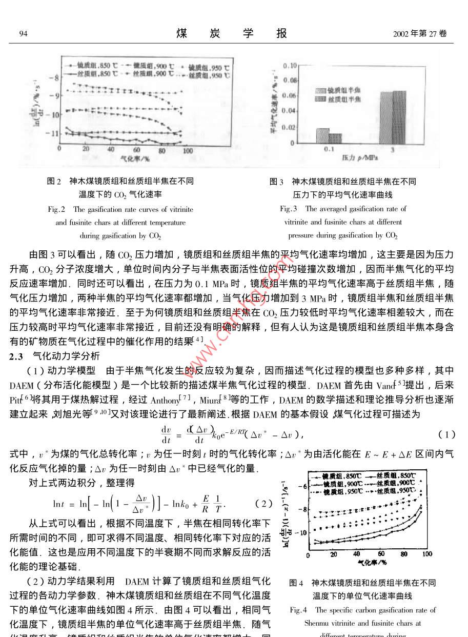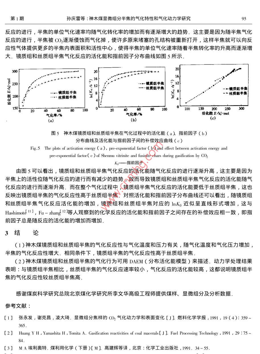 第27卷第1期煤炭報Vol.27 No.12002年2月JOURNAL OF CHINA COAL SOCIETYFeb.2002文章編號0253- 9993( 2002 )01 - 0092 - 05神木煤顯微組分半焦的氣化特性和氣化動力學(xué)研究孫慶雷,李文,李保慶(中國科學(xué)院山西煤炭化學(xué)研究所煤轉(zhuǎn)化國家重點實驗室,山西太原030001 )摘要:在高壓熱天平上考察了神木煤顯微組分半焦在不同溫度和壓力下的氣化行為,利用DAEM (分布活化能模型)研究了顯微組分半焦的氣化動力學(xué).結(jié)果表明:在相同條件下,鏡質(zhì)組半焦比絲質(zhì)組半焦有較高的氣化反應(yīng)性,隨氣化溫度和壓力升高,鏡質(zhì)組和絲質(zhì)組半焦的氣化反應(yīng)性都增加,利用DAEM(分布活化能模型)對鏡質(zhì)組和絲質(zhì)組半焦的氣化活化能的計算結(jié)果表明:顯微組分半焦氣化的活化能隨反應(yīng)的進行逐漸升高,鏡質(zhì)組半焦的氣化速率高于絲質(zhì)組半焦,氣化活化能較低.關(guān)鍵詞:顯微組分;半焦;氣化;動力學(xué);分布活化能模型中圖分類號: TQ541文獻標(biāo)識碼: A煤是由許多有機顯微組分和少量礦物質(zhì)組成的巖石.煤的巖相顯微組成是確定煤類型的重要特征.因此,在研究煤的氣化反應(yīng)性時,應(yīng)同時考慮到煤的巖相顯微組成才能得到較為符合實際的結(jié)果.而對于顯微組分氣化的考察主要是以考察顯微組分半焦的氣化反應(yīng)性為主.謝克昌1]等人對平朔煤顯微組分半焦的CO2氣化反應(yīng)的研究表明,鏡質(zhì)組半焦的初始反應(yīng)性,氣化速率最低,殼質(zhì)組最高,絲質(zhì)組居中.而Huang2]對顯微組分半焦的CO2氣化反應(yīng)性的研究則表明,鏡質(zhì)組半焦比絲質(zhì)組半焦有較高的反應(yīng)性.由于不同的研究者所用的煤種不同,研究的側(cè)重點各異,因此對顯微組分半焦的氣化反應(yīng)性的研究結(jié)果相差較大.因半焦氣化過程的反應(yīng)較為復(fù)雜,將其近似看成基本上符合簡單的一級動力學(xué)模型有時是不妥當(dāng)?shù)?為此, Johnsof 3]提出了一個在氣化過程中包括活性中間產(chǎn)物生成的氣化模型,他們認為,對氣化過程有重要影響的活性中間產(chǎn)物的生成反應(yīng)是活化能互不相同的一組無限平行反應(yīng).本文基于Johnson關(guān)于氣化模型的基本思想,利用氣化動力學(xué)研究的最新結(jié)果,即氣化過程中活化能呈某種連續(xù)分布,利用DAEM模型首次對神木煤顯微組分半焦的動力學(xué)進行了分析,并在此基礎(chǔ)上求出了神木煤顯微組分半焦氣化過程的動力學(xué)參數(shù).1實驗部分1.1煤樣及半 焦制備實驗所用神木煤及巖相樣品由煤炭科學(xué)研究總院北京煤化學(xué)研究所提供,其元素分析、工業(yè)分析及巖相組成分析見表1.半焦制備在Ar氣氛下進行,稱取大約0.5 g煤樣于固定床反應(yīng)器內(nèi),以10 C/min的升溫速率升到900C,停留30min以保證揮發(fā)分全部脫除,冷卻后即可得半焦樣品、鏡質(zhì)組和絲質(zhì)組的失重及半焦的元素分析結(jié)果見表2.1.2 熱重實驗熱重實驗是在美國AT1- CAHN生產(chǎn)的TG- 151型高壓熱天平上進行,氣化劑為CO2,流量為360 mL/min,煤半焦的粒度小于0.074 mm ,每次取樣量約30 mg,升溫速率為10 C/min ,升到終溫850 ~第1期孫慶雷等:神木煤顯微組分半焦的氣化特性和氣化動力學(xué)研究9950C后,停留到不再產(chǎn)生明顯失重為止.表1煤及其顯微組分的工業(yè)分析、元素分析及巖相分析Table 1 The proximate , ultimate and petrographical analysis of coal sample and its macerals工業(yè)分析元素分析巖相分析試樣M.Asu( C)u(H)u(O)"u( N)u( s)鏡質(zhì)組絲質(zhì)組殼質(zhì)組礦物質(zhì)神木原煤7.43 4.43 36 4379.770.990.5463.59 34.99 0.36 1.07富鏡質(zhì)組6.40 2.37 39 .6077.83 .5.0315.611.010.5297.551.51 0.38 0.57富絲質(zhì)組6.88 3.54 25 .3082.633.7712.290.800.512.3796.90 0.36 0. 36*差減法所得.表2半焦制備 過程的失重率及元素分析Tacle 2 Weight loss in char preparation and elemental analysis of chars%半焦元素分析失重率u(C)u(0)*u(N)u(S)鏡質(zhì)組36.8693.283.831.290.54 .絲質(zhì)組24 .4395.532.45t差減法所得.2結(jié)果與討論2.1溫度對半焦氣化的影響神木煤鏡質(zhì)組和絲質(zhì)組半焦在CO2中,不同溫度下的恒溫氣化失重曲線如圖1所示.一絲質(zhì)組,850 它一-鍵質(zhì)組,850 C---被質(zhì)組,900...絲質(zhì)組,950 C“--質(zhì)組,950 C30 t-82000040000 60 00020000 40 000”60000時間1/s(b)(a)圖1神木煤鏡質(zhì)組和絲質(zhì)組半焦氣化的TG曲線Fig.1 The TG plots from gasification of vitrinite and fusinite chars under CO2(a)鏡質(zhì)組;(b)絲質(zhì)組由圖1可以看出,隨著氣化溫度升高,鏡質(zhì)組和絲質(zhì)組半焦的氣化反應(yīng)性均增加,在同一氣化溫度下,鏡質(zhì)組半焦的氣化反應(yīng)性高于絲質(zhì)組半焦.鏡質(zhì)組和絲質(zhì)組在3種不同溫度下的氣化速率見圖2.由圖2可以看出,在相同氣化溫度下, 鏡質(zhì)組半焦的氣化速率要高于絲質(zhì)組半焦,這也與鏡質(zhì)組半焦和絲質(zhì)組半焦的氣化失重曲線結(jié)果一致. 隨氣化溫度的升高,鏡質(zhì)組和絲質(zhì)組半焦的氣化速率都增大,同時還可以看出,在同-溫度下,鏡質(zhì)組半焦隨轉(zhuǎn)化率的增加氣化速率變化不大,基本上為一直線,因此鏡質(zhì)組半焦的氣化速率在整個氣化過程中可看成常數(shù),而絲質(zhì)組半焦的氣化速率隨轉(zhuǎn)化率的增加有逐漸下降的趨勢,并且隨氣化溫度的增加這種減少的趨勢在增大.