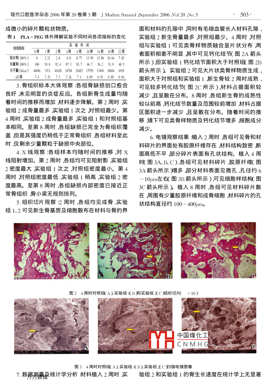 現(xiàn)代口腔醫(yī)學(xué)雜志2006年第20卷第5期J Modern Somatol ,September 2006 ,Vol 20 ,No. 5501.聚乳酸一聚乙二醇的制備 及骨修復(fù)實(shí)驗(yàn)研究孔航潘可風(fēng)吳志剛[摘要]目的研究聚乳酸-聚乙二醇(PLA-PEG)共聚物作為細(xì)胞因子骨形態(tài)發(fā)生蛋白(BMP)堿性成纖維細(xì)胞生長(zhǎng)因子( bFGF的載體修復(fù)下頜骨缺損的效果。方法制備多孔 PLA- PEG共聚物并對(duì)其進(jìn)行表征。將PLA- PEG/BMR(實(shí)驗(yàn)組1 ) PLA- PEG/BMP/bFGR實(shí)驗(yàn)組2和PLA- PEQ(對(duì)照組)分別植入27只雄性新西蘭白兔的下頜體部骨缺損處。術(shù)后2周、4周和8周對(duì)實(shí)驗(yàn)標(biāo)本的成骨狀況進(jìn)行大體、X線、組織學(xué)、掃描電子顯微鏡觀察及計(jì)算機(jī)圖像分析。結(jié)果實(shí)驗(yàn) 期間各組成骨活躍。2 周時(shí)實(shí)驗(yàn)組2成骨量最多實(shí)驗(yàn)組1其次對(duì)照組最少差異在統(tǒng)計(jì)學(xué)上有顯著性意義( P <0.05);4周時(shí)實(shí)驗(yàn)組2成骨量最多其余兩組成骨量差異不大( P>0.05 )8周時(shí)各組的成骨量的差異在統(tǒng)計(jì)學(xué)上無顯著性意義( P >0.05)結(jié)論新型的 PLA- PEG共聚物呈現(xiàn)良好的生物相容性和骨引導(dǎo)性是BMP和bFGF的良好載體。[關(guān)鍵詞]聚乳酸細(xì)胞因子下頜骨缺損The study of the copolymer of PLA and PEG on the repair of rabbit mandibular defect KONG Hang ,PAN Kefeng ,WU Zhigang. School of Material Science and Engineering , Tongji Unirersity , Shanghai 200092[ Abstract] Objective To evaluate the effect of the new PLA - PEG and the composite of PLA - PEG , bonemorphogenetic protein( BMP ) and basic fibroblast growth factor( bFGF ) on the regeneration of the rabbit mandibulardefects. Methods The porous PLA- PEG was prepared by ring - opening polymerization and solvent - casting/ particle. leaching. PLA - PEG( control group), PLA - PEG/BMP ( experimental group A ) and PLA - PEG/BMP/bFGF( experimental group B ) were respectively implanted into 27 rabbit mandibular defects. Two , four and eight weeks afteroperation, the rabbits were sacrificed and the specimens examined by naked eyes , X - ray ,optical microscope ,computerized image analysis and SEM. Results At the 2d week the regenerated bone in the experimental group B wassignificantly more than that in the experimental group A , trailed by control group. At the 4"h week the new bone in theexperimental groupB was more in size , no statistically significant difference of the new bone between the other twogroups. At the 8th week there was no statistically significant difference among the three groups with regard to the boneregeneration. Conclusion This new PLA - PEG possesses sound biocompatibility and osteoconductivity , which will havemore positive effect on bone regeneration when combined with BMP. And bFGF can synergistically enhance the boneregeneration with PLA - PEG and BMP. This new biomaterial is safe and reliable in bone regeneration. .[Key words] Polylactic acidCytokineMandibular defect中圖分類號(hào):R782.2文獻(xiàn)標(biāo)識(shí)碼:A迄今為止人們已經(jīng)對(duì)多種骨組織缺損修復(fù)與材料和方法重建材料進(jìn)行了大量的研究1-61。其中聚乳酸( PLA )材料成為最活躍的研究領(lǐng)域。1.實(shí)驗(yàn)材料及設(shè)備:丙交酯(D,L- LAX同濟(jì)本研究在PLA中引入聚乙二醇( PEG)并將這大學(xué)材料學(xué)院自制);PEG(中國醫(yī)藥集團(tuán)上?;瘜W(xué).種新型的PLA- PEG材料分別與骨形態(tài)發(fā)生蛋白試劑公司化學(xué)純);骨形態(tài)發(fā)生蛋白(BMP)100mg,( BMP和堿性成纖維細(xì)胞生長(zhǎng)因孔( bFGF )相復(fù)合,粉劑中國煤化工!供);堿性成纖維細(xì)胞觀察其對(duì)兔下頜骨缺損修復(fù)的作用。生長(zhǎng)MHCN M H G液雙組份(北京雙鷺?biāo)帢I(yè)生產(chǎn))動(dòng)物手術(shù)器械;X線牙片機(jī)光學(xué)顯微鏡;高清晰度彩色病理圖文計(jì)算機(jī)分析系統(tǒng)Motic上海市科委重大項(xiàng)目基金資助課題(編號(hào)05D]14006 )作者單位200092上海同濟(jì)大學(xué)材料科學(xué)與工程學(xué)院(孔航、Images Advanced 3. 0(上海醫(yī)科大學(xué)病理科提供)昊志風(fēng))同瀝發(fā)銷數(shù)擒醫(yī)學(xué)院潘可風(fēng)為通訊作者)2.多孔PLA-PEG的制備:采用兩步法制備,502.現(xiàn)代口腔醫(yī)學(xué)雜志2006年第20卷第5期J Modern Somatol Setember 2006 ,NVol 20 ,No.5即先由乳酸縮聚制得丙交酯(見反應(yīng)方程式1 ),再?zèng)r完整取出下頜骨觀察下頜骨標(biāo)本上材料植入?yún)^(qū)用丙交酯與聚乙二醇聚合制得PLA- PEG共聚物骨組織愈合情況。將下頜骨從頦正中聯(lián)合處分離斷(見反應(yīng)方程式2)其中LA與PEG的聚合比例為開進(jìn)行X線攝片觀察。10:1 PEG的數(shù)均分子量為6000。(見反應(yīng)方程式7.脫鈣骨組織標(biāo)本HE染色:將下頜體的骨缺1、2 )然后利用溶劑澆鑄-顆粒濾瀝技術(shù)制備三維多損區(qū)對(duì)照組和實(shí)驗(yàn)組的植入材料部位的周緣緣外孔支架78。用打孔機(jī)制備成直徑為5mm、高為1mm處鋸下,并從中間矢狀剖開顯露骨愈合界面,3mm圓柱形多孔支架材料鈷60照射滅菌。10%福爾馬林固定,脫鈣,石蠟包埋,切片,HE染色光鏡觀察。OHn CHsCHCOOHCatalyst,HIC8.標(biāo)本的超微結(jié)構(gòu)觀察:標(biāo)本從中間切開顯露-H2OCH:骨愈合界面2%戊二醛中固定掃描電鏡觀察。9.計(jì)算機(jī)圖像分析:每個(gè)脫鈣HE染色切片上反應(yīng)方程式1乳酸縮合制備丙交酯距正常骨壁0.5mm處隨機(jī)取-圓形視野區(qū)域通過圖像