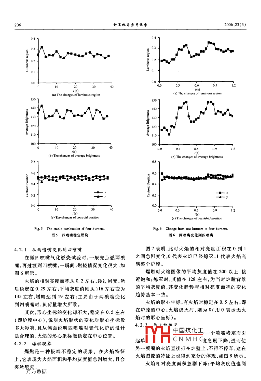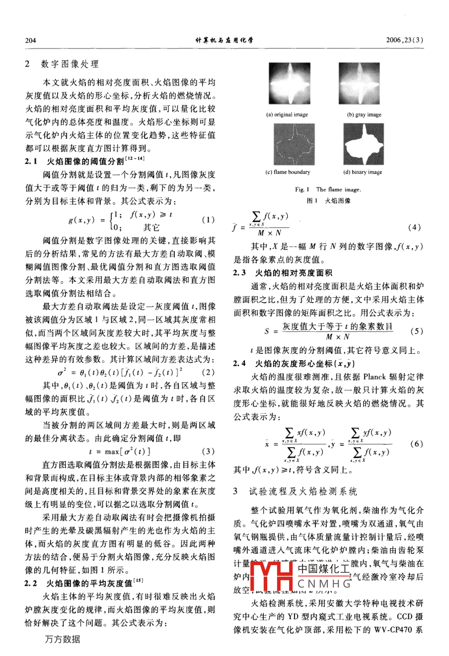 第23卷第3期計(jì)算機(jī)與應(yīng)用化學(xué)Vol. 23, No. 32006年3月28日Computers and Applied ChemistryMarch, 2006用數(shù)字圖像分析氣化爐內(nèi)燃燒狀態(tài)的試驗(yàn)研究,顏?zhàn)坑?,梁欽鋒,牛苗任,于廣鎖,于遵宏(華東理工大學(xué)潔凈煤技術(shù)研究所,上海, 200237)摘要:基于數(shù)字圖像處理技術(shù),研究氣流床氣化爐內(nèi)多噴嘴對(duì)撞氣化火焰幾何特征,分析氣化穩(wěn)定燃燒和不穩(wěn)定燃燒兩種狀態(tài)。運(yùn)用火焰的相對(duì)亮度面積、形心坐標(biāo)和火焰圖像的平均灰度值等3個(gè)方面的變化趨勢(shì),說(shuō)明氣化燃燒狀況,從分析結(jié)果中可以得到以下結(jié)論:當(dāng)3個(gè)方面的變化趨勢(shì)都很平穩(wěn)時(shí),說(shuō)明燃燒狀態(tài)較穩(wěn)定;當(dāng)前兩個(gè)變化幅度較大時(shí),說(shuō)明氣化燃燒狀態(tài)不穩(wěn)定。研究結(jié)果為預(yù)測(cè)氣化爐內(nèi)氣化燃燒趨勢(shì),提供了理論參考。關(guān)鍵詞:數(shù)字圖像處理;火焰檢測(cè);氣流床氣化爐;燃燒狀態(tài)中圈分類號(hào): TQ 546.2文獻(xiàn)標(biāo)識(shí)碼: A文章編號(hào): 10014160( 2006 )03-203-208The experimental study of combustion status in the entrained-flow gasifier bydigital image processingYAN ZhuoYong, LIANG QinFeng, NIU MiaoRen, YU GuangSuo and YU ZunHong( Institute of Clean Coal Technology, East China University of Science and Technology, Shanghai, 200237, China)Abstract: Based on the digital image processing technology the flame characteristics in entrained flow gasifier is researched and the sta-ble and instable flame status is analyzed respectively. The Charge Coupled Device is installed on the top of entrained flow gasifier andcan shoot the whole flame. The flame images can indicate the combustion status clearly. W hen the changes of luminous region are lessthan 0.1 and the changes of average brightness are less than 15, the combustion status is stable. On the contrary ,when the changes ofluminous region and average brightness are large -scale,the combustion status is instable. No matter what the combustion status is sta-ble or instable , the changes of luminous region are consistent with the changes of average brightness ,and the changes of centroid are a-round 0.5 at all times, except that single flame or all flames are extinguished. These research results provide diagnostic means for com-bustion status in the entrained flow gasifier.Key words: digital image processing, flame monitoring, entrained flow gasifier, combustion statusYan ZY, Liang QF, Niu MR, Yu GS and Yu ZH. The experimental study of combustion status in the entrained-flow gasifier by digital image processing. Computers and Applied Chemistry, 2006, 23(3) :203-208.燃、突然熄滅等不穩(wěn)定的情況,使?fàn)t內(nèi)溫度場(chǎng)不均勻,煤的氣化技術(shù)是煤炭潔凈、高效和綜合利用的發(fā)生偏移,且靠近火焰中心的爐壁溫度過(guò)高而易損關(guān)鍵技術(shù)、龍頭技術(shù)。尤其是高壓、大容量氣流床的壞,進(jìn)而影響氣化爐使用的壽命和效率。因此,研究氣化技術(shù),具有良好的經(jīng)濟(jì)和社會(huì)效益,更是當(dāng)前的氣化爐內(nèi)的氣化燃燒狀況對(duì)工業(yè)生產(chǎn)具有指導(dǎo)意義。由于CCD(chargecoupleddevice)攝像機(jī)耐灼發(fā)展趨勢(shì)。最清潔的煤利用技術(shù),不僅減少空氣污傷,工作穩(wěn)定可靠,圖像高清晰等優(yōu)點(diǎn),還可與數(shù)字染,且能生產(chǎn)出許多有價(jià)值的副產(chǎn)品,如高純度硫、圖像處理相結(jié)合,國(guó)內(nèi)外很多研究機(jī)構(gòu)都作了大量CO2和無(wú)毒爐渣。隨著環(huán)境標(biāo)準(zhǔn)的日趨嚴(yán)格,它的研究,特別著重火焰的幾何特征和煤粉鍋爐完全燃優(yōu)勢(shì)將越來(lái)越突出1-21。在國(guó)家“863”項(xiàng)目的支持燒的溫度場(chǎng)重建方面13-"。而對(duì)氣化爐中的氣化下,華東理工大學(xué)等共同開發(fā)四噴嘴對(duì)置式水煤漿燃燒火焰的研究還極少,本文著重研究多噴嘴對(duì)置氣化技術(shù),在煤的氣化領(lǐng)域填補(bǔ)國(guó)內(nèi)空白,并建成商式氣化怕內(nèi)對(duì)墻與化嫩伐山松特征。業(yè)示范裝置,且運(yùn)行良好。中國(guó)煤化工但是,氣流床氣化爐內(nèi)氣化過(guò)程中,可能產(chǎn)生爆THCNMHG收稿日期: 205-08-20; 修回日期: 2005-11-26基金資助:國(guó)家高技術(shù)研究發(fā)展計(jì)劃(2003AA521020); 國(guó)家重點(diǎn)基礎(chǔ)研究發(fā)展計(jì)劃(2004CB217703); 上海市啟明星計(jì)劃(03QF14013)作者簡(jiǎn)介:顏?zhàn)坑?1983-), 男,江西人,碩士生,化學(xué)工藝專業(yè),導(dǎo)師:于廣鎖(聯(lián)系人) .2006 ,23(3)什算機(jī)與應(yīng)用化學(xué)2042數(shù)字圖像處理本文就火焰的相對(duì)亮度面積、火焰圖像的平均灰度值以及火焰的形心坐標(biāo),分析火焰的燃燒情況?;鹧娴南鄬?duì)亮度面積和平均灰度值,可以量化比較(a) original image(b) gray image氣化爐內(nèi)的總體亮度和溫度?;鹧嫘涡淖鴺?biāo)則可顯示氣化爐內(nèi)火焰主體的位置變化趨勢(shì),這些特征值都可以根據(jù)厭度直方圖計(jì)算得到。2.1火焰圉 像的閾值分割'"-14)(c) flame boundary(d) binary image閾值分割就是設(shè)置- -個(gè)分割閾值1,凡圖像灰度值大于或等于閾值i的歸為一類,剩下的為另一類,F(xiàn)ig 1 The flame image.圖1火焰圖像分別為目標(biāo)主體和背景。其公式表示為:[; f(x,y)≥t(1)S(*.y)g(x,y) =其它M xN閾值分割是數(shù)字圖像處理的關(guān)鍵,直接影響其