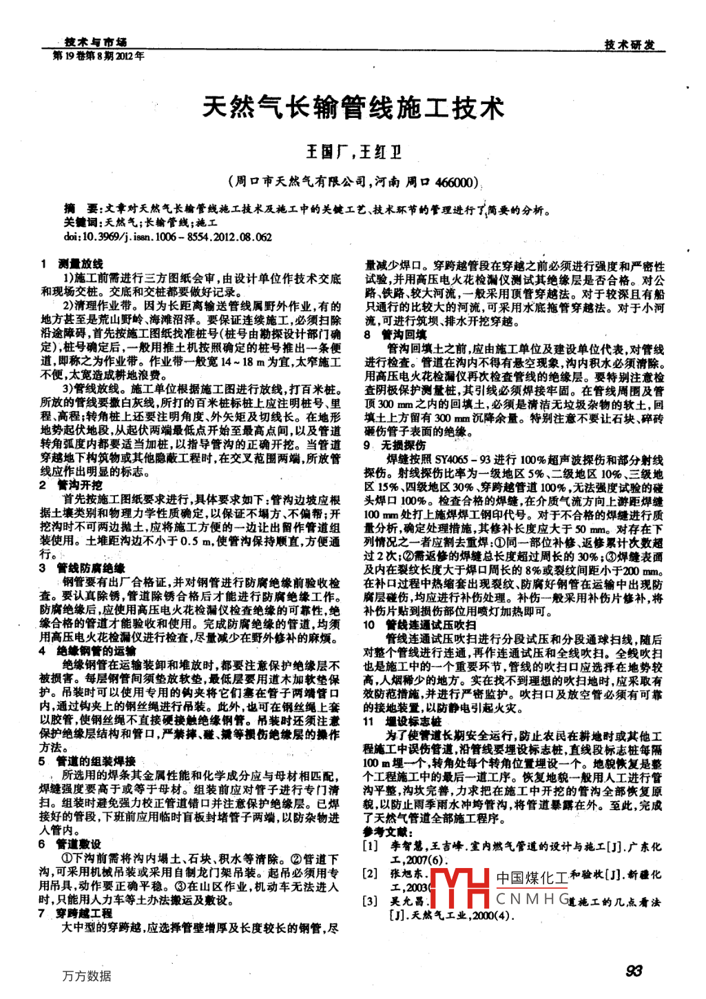 與市場(chǎng)第19卷第8期202年技術(shù)研發(fā)天然氣長(zhǎng)輸管線施工技術(shù)王國(guó)廠,王紅衛(wèi)(周口市天然氣有限公司,河南周口46000摘要:文章對(duì)天然氣長(zhǎng)輸管線施工技術(shù)及施工中的關(guān)鍵工藝、技術(shù)環(huán)節(jié)的管理進(jìn)行了簡(jiǎn)要的分析關(guān)鍵詞:天然氣;長(zhǎng)輸管線;施工doi:10.3969/j.isn.1006-8554.2012.08.0621測(cè)量放線量減少焊口。穿跨越管段在穿越之前必須進(jìn)行強(qiáng)度和嚴(yán)密性1)施工前需進(jìn)行三方圖紙會(huì)審,由設(shè)計(jì)單位作技術(shù)交底試驗(yàn)并用高壓電火花檢漏儀測(cè)試其絕緣層是否合格。對(duì)公和現(xiàn)場(chǎng)交樁。交底和交樁都要做好記錄路鐵路較大河流,一般采用頂管穿越法。對(duì)于較深且有船2)清理作業(yè)帶。因?yàn)殚L(zhǎng)距離輸送管線屬野外作業(yè),有的只通行的比較大的河流,可采用水底拖管穿越法。對(duì)于小河地方甚至是荒山野嶺、海灘沼澤。要保證連續(xù)施工,必須掃除流可進(jìn)行筑壩排水開挖穿越。沿途障礙,首先按施工圖紙找準(zhǔn)樁號(hào)(樁號(hào)由勒探設(shè)計(jì)部門確8曾溝回填定),樁號(hào)確定后,一般用推土機(jī)按照確定的樁號(hào)推出一條便管溝回填土之前應(yīng)由施工單位及建設(shè)單位代表對(duì)管線道,即稱之為作業(yè)帶。作業(yè)帶一般寬14~18m為宜太窄施工進(jìn)行檢查。管道在溝內(nèi)不得有懸空現(xiàn)象,溝內(nèi)積水必須清除不便,太寬造成耕地浪費(fèi)用高壓電火花檢漏儀再次檢查管線的絕緣層。要特別注意檢3)管線放線。施工單位根據(jù)施工圖進(jìn)行放線,打百米樁查陰極保護(hù)測(cè)量樁,其引線必須焊接牢固。在管線周圍及管所放的管線要撒白灰線,所打的百米樁標(biāo)樁上應(yīng)注明樁號(hào)、里頂300mm之內(nèi)的回填土,必須是清潔無垃圾雜物的軟土,回程、高程;轉(zhuǎn)角樁上還要注明角度、外矢矩及切線長(zhǎng)。在地形填土上方留有300mm沉降余量。特別注意不要讓石塊、碎磚地勢(shì)起伏地段從起伏兩端最低點(diǎn)開始至最高點(diǎn)間,以及管道砸傷管子表面的絕緣。轉(zhuǎn)角弧度內(nèi)都要適當(dāng)加樁以指導(dǎo)管溝的正確開挖。當(dāng)管道9無損探傷穿越地下構(gòu)筑物或其他隱蔽工程時(shí)在交叉范圍兩端所放管焊縫按照SY4065-9進(jìn)行100%超聲波探傷和部分射線線應(yīng)作出明顯的標(biāo)志。探傷。射線探傷比率為一級(jí)地區(qū)5%、二級(jí)地區(qū)10%、三級(jí)地2管溝開挖區(qū)15%、四級(jí)地區(qū)30%、穿跨越管道100%,無法強(qiáng)度試驗(yàn)的碰首先按施工圖紙要求進(jìn)行,具體要求如下:管溝邊坡應(yīng)根頭焊口100%。檢查合格的焊縫,在介質(zhì)氣流方向上游距焊縫據(jù)土壤類別和物理力學(xué)性質(zhì)確定以保證不塌方不偏幫;開100m處打上施焊焊工鋼印代號(hào)。對(duì)于不合格的焊進(jìn)行質(zhì)挖溝時(shí)不可兩邊拋土應(yīng)將施工方便的一邊讓出圖作管道組量分析確定處理措施,其修補(bǔ)長(zhǎng)度應(yīng)大于50mm。對(duì)存在下裝使用。土堆距溝邊不小于05m,使管溝保持順直,方便通列情況之一者應(yīng)割去重焊:①同一部位補(bǔ)修返修累計(jì)次數(shù)超過2次;②需返修的焊縫總長(zhǎng)度超過周長(zhǎng)的30%;③焊縫表畫3管線防腐絕緣及內(nèi)在裂紋長(zhǎng)度大于焊口周長(zhǎng)的8%或裂紋間距小于200m鋼管要有出廠合格證,并對(duì)鋼管進(jìn)行防腐絕緣前驗(yàn)收檢在補(bǔ)口過程中熱縮套出現(xiàn)裂紋、防腐好鋼管在運(yùn)輸中出現(xiàn)防查。要認(rèn)真除銹管道除銹合格后才能進(jìn)行防腐絕緣工作。腐層碰傷均應(yīng)進(jìn)行補(bǔ)傷處理。補(bǔ)傷一般采用補(bǔ)傷片修補(bǔ),將防腐絕綠后,應(yīng)使用高壓電火花檢漏儀檢查絕緣的可靠性絕補(bǔ)傷片貼到損傷部位用噴燈加熱即可緣合格的管道才能驗(yàn)收和使用。完成防腐絕緣的管道,均須10曾線連通試壓吹掃用高壓電火花檢漏儀進(jìn)行檢查,盡量減少在野外修補(bǔ)的麻煩。管線連通試壓吹掃進(jìn)行分段試壓和分段通球掃線,隨后4絕繚鋼管的運(yùn)輸對(duì)整個(gè)管線進(jìn)行連通,再作連通試壓和全線吹掃。全線吹掃絕緣鋼管在運(yùn)輸裝卸和堆放時(shí)都要注意保護(hù)絕緣層不也是施工中的一個(gè)重要環(huán)節(jié)管線的吹掃口應(yīng)選擇在地勢(shì)較被損害。每層鋼管間須墊放軟墊最低層要用道木加軟墊保高,人煙稀少的地方。實(shí)在找不到理想的吹掃地時(shí),應(yīng)采取有護(hù)。吊裝時(shí)可以使用專用的鉤夾將它們?nèi)诠茏觾啥斯芸谛Х婪洞胧?并進(jìn)行嚴(yán)密監(jiān)護(hù)。吹掃口及放空管必須有可靠?jī)?nèi)通過鉤夾上的鋼絲繩進(jìn)行吊裝。此外,也可在鋼絲繩上套的接地裝置,以防靜電引起火災(zāi)。以膠管使鋼絲繩不直接硬接觸絕緣鋼管。吊裝時(shí)還須注意11埋設(shè)標(biāo)志樁保護(hù)絕緣層結(jié)構(gòu)和管口嚴(yán)禁掉碰撬等損傷絕緣層的操作為了使暫道長(zhǎng)期安全運(yùn)行,防止農(nóng)民在耕地時(shí)或其他工方法。程施工中誤傷管道沿管線要埋設(shè)標(biāo)志樁,直線段標(biāo)志樁每隔5管道的組裝爆接100m埋一個(gè),轉(zhuǎn)角處每個(gè)轉(zhuǎn)角位置埋設(shè)一