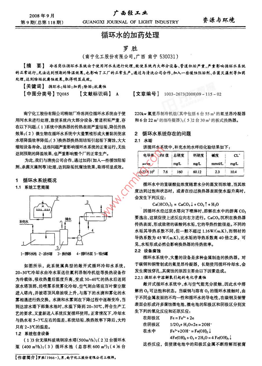 2008年9月廣西輕工業(yè)第9期(總第118期GUANGXI JOURNAL OF LIGHT INDUSTRY資源與環(huán)境循環(huán)水的加藥處理羅勝(南寧化工股份有限公司,廣西南寧53031)摘要】冷凍崗位循環(huán)水系統(tǒng)由于使用河水未進行處理致使系統(tǒng)內(nèi)大部分設(shè)備、管道積垢嚴(yán)重,嚴(yán)重彩響循環(huán)水系統(tǒng)的正常運行,無法達(dá)到預(yù)期的降溫效果,也彩響了工廠的正常生產(chǎn)。通過與清洗公司合作,加入一些緩蝕阻垢劑、殺菌滅藻劑等加藥處理,達(dá)到除垢抗腐蝕效果,取得明顯成效?!娟P(guān)鍵詞】獷環(huán)水;結(jié)垢;加藥;除垢;抗腐蝕【中圖分類號】TQ085【文獻標(biāo)識碼】A【文章編號】100-2673(200809-115-02南寧化工股份有限公司精細(xì)廠冷凍崗位循環(huán)水系統(tǒng)由于使220kw氟里昂制冷機組(其中包括6臺55m2的氟里昂冷凝器用河水未進行處理致使系統(tǒng)內(nèi)大部分設(shè)備、管道積垢嚴(yán)重存和6臺22m2的油冷凝器);(5)2臺30m2的板式換熱器。在以下問題:(1)系統(tǒng)中換熱器的傳熱表面嚴(yán)重結(jié)垢降低傳熱效果;(2)微生物在循環(huán)水系統(tǒng)中大量繁殖形成大量黏泥使涼2循環(huán)水系統(tǒng)存在的問題水塔降溫效率降低;(3)換熱器換熱面結(jié)垢引起垢下腐蝕,大大21水垢縮短設(shè)備壽命。這些問題嚴(yán)重影響循環(huán)水系統(tǒng)的正常運行,無法該循環(huán)水系統(tǒng)中,補充水的水樣經(jīng)化驗結(jié)果如下:達(dá)到預(yù)期的降溫效果,也嚴(yán)重影響整個廠的正常生產(chǎn)。電導(dǎo)率PH值總硬度鈣硬度為此我們與清洗公司合作,通過加藥(加入一些緩蝕阻垢劑、殺菌滅藻劑等)處理,達(dá)到除垢抗腐蝕效果,取得明顯成效。mg/L mouL mg/L027×103|76160i60.122.31041循環(huán)水系統(tǒng)概況11系統(tǒng)工藝簡圖循環(huán)水中的重碳酸鹽濃度隨著水分的蒸發(fā)而濃縮,當(dāng)其濃度達(dá)到過飽和狀態(tài)時,或者在經(jīng)過換熱器表面使水溫升高時,會發(fā)生下列反應(yīng):Ca(HCO3)2=CaCO3↓+CO2↑+H2O因循環(huán)水經(jīng)過涼水塔向下噴淋時溶解在水中的游離CO2要逸出,這就促使上述反應(yīng)向右方進行。CaCO3沉積在換熱器傳熱表面,形成致密的碳酸鈣水垢,它的導(dǎo)熱性能很差。不同的水垢其導(dǎo)熱系數(shù)不同但一般不超過116W/(mK),而鋼材的導(dǎo)熱系數(shù)為45W(mK),比水垢的導(dǎo)熱系數(shù)高40倍之多。可見,水垢形成必然會影響換熱器的傳熱效率。帶林池2游塔3換特4帶秋5吸罐22設(shè)備腐蝕循環(huán)水系統(tǒng)中大量的設(shè)備是多種金屬制造的換熱器。對如圖所示,此系統(tǒng)屬典型的敞開式循環(huán)冷卻水系統(tǒng),于碳鋼和銅管制成的氟里昂冷凝器,長期使用循環(huán)冷卻水會20-30℃冷卻水由冷水泵送往氟利昂制冷機組等換熱設(shè)備作發(fā)生腐蝕穿孔其腐蝕的原因主要由以下因素造成為冷載體,吸收熱量后溫度升高,變成30-40℃的熱水后送到221環(huán)水中落解氧引起的電化學(xué)腐涼水塔頂部,經(jīng)噴霧系統(tǒng)霧化冷卻,空氣則由塔底百葉窗空隙敞開式循環(huán)水系統(tǒng)中,水與空氣能充分接觸,因此水中溶進入塔內(nèi)并被塔頂風(fēng)扇抽吸上升,與落下的水滴和霧化的水解的02可達(dá)飽和狀態(tài)。當(dāng)碳鋼與溶有02的循環(huán)水接觸時,由霧相遇進行熱交換,水滴和水霧則在下降過程中逐漸變冷,當(dāng)于不同金屬表面的不均一性和循環(huán)水的導(dǎo)電性,在碳鋼及銅管到達(dá)涼水塔下部集水池時,水溫下降到2030℃,符合生產(chǎn)工表面會形成許多腐蝕微電池微電池的陽極區(qū)和陰極區(qū)分別發(fā)藝的要求又重新送入系統(tǒng)反復(fù)循環(huán)使用。正常情況下冷卻水生下列的氧化反應(yīng)和還原反應(yīng)與熱水有5-7℃左右的溫差,系統(tǒng)結(jié)垢換熱效率下降后,大約在陽極區(qū)Fe=Fe2+2只有2-3℃的溫差。在陰極區(qū)1/202+H2O+2e=20H12系統(tǒng)包含設(shè)備在水中Fe2+20H=Fe(OH2↓1)3臺無填料玻璃鋼涼水塔(500mh);(2)2臺循環(huán)水4Fe(OH+0,+2H, 0=4 FeOH,!泵(400m3h);(3)循環(huán)水池(總?cè)莘e600m3);(4)6臺這些反應(yīng),促使微電池中的陽極區(qū)金屬不斷溶解而被腐【作者簡介】羅勝(1966-),男,南寧化工股份有限公司工程師。蝕。這是循環(huán)水系統(tǒng)鋼制設(shè)備及管道內(nèi)表面以及換熱器管板引4實施步驟起腐蝕的原因之一。4.1初期基礎(chǔ)投藥222有害離子引起的腐蝕(1)先投加殺菌滅藻劑LX301為保有水量的200ppm循環(huán)水在濃縮過程中除重碳酸鹽濃度增加外,其他的鹽(2)48小時后投加剝離劑LX127,150pm類如氯化物、硫酸鹽等的濃度也會增加。當(dāng)CL、SO2離子(3)48小時后投入緩蝕阻垢劑LX181,60pm一次度增加時,會加速碳鋼的腐蝕。CL、SO42會使金屬上保護膜的42正常運行投藥保護性能降低,尤其是CL離子它半徑小穿透性強容易穿1)為防止細(xì)菌產(chǎn)生耐藥性故需每二周分別交叉投加過膜層置換氧原子形成氯化物加速陽極過程的進行,使腐蝕LxX301、LX401,各為100ppm加速。氯離子是引起換熱器銅管點蝕的原因之一。(2)按補充水量投加緩蝕阻垢劑LX181,20ppm/次。223微生物引起的腐蝕微生物的滋生也會使金屬發(fā)生腐蝕。這是由于微生物排出5效果及經(jīng)濟效益分析的黏液與無機垢和泥砂等雜物形成的沉積物附著在金屬表51投藥后達(dá)到的效果成