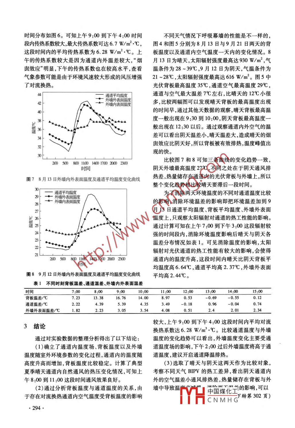 第33卷,總第192期《節(jié)能技術(shù)》Vol 33 Sum. No. 1922015年7月,第4期ENERGY CONSERVATION TECHNOLOGYJul.2015,No.4BIPV熱通道實驗研究與分析陳磊,高軍(同濟大學(xué)機械與能源工程學(xué)院,上海201804)摘要:為了研究光伏熱通道的傳熱特性,對光伏建筑一體化建筑(BPV)進行了實驗研究。測試包括了通道內(nèi)空氣溫度、速度、太陽輻射強度以及環(huán)境溫度等。通過研究通道內(nèi)溫度場、光伏背板溫度以及外墻溫度隨室外環(huán)境參教的變化,分析了熱通道的傳熱特性,結(jié)果分析為通道的動態(tài)啟閉提供了實驗數(shù)據(jù)的攴持。對熱壓的計算表明上午的通風(fēng)效果較好,換熱系數(shù)較大。比較陰天與晴天的熱工性能,看出陰天通道通風(fēng)效果差,熱量不能及時排除,并發(fā)現(xiàn)太陽輻射對幕墻性能有較大影響。關(guān)鍵詞:光伏建筑一體化;熱通道;熱工性能;實驗;溫度場;自然通風(fēng)中圖分類號:TM615文獻標(biāo)識碼:A文章編號:1002-6339(2015)04-0291-04Experimental Research and Analysis of Heat Channel in BuildingIntegrated Photovoltaic( BIPV)cheN Lei, gao JunSchool of Mechanical Engineering, Tongji University, Shanghai 201804, China)odynamic parameter of BIPV channel was carried out. Air temperature, velocity in channel, solar radiation and ambient temperature were tested. Through study on temperature field of air in heat channel, PVbackplane and exterior wall, heat transfer process in heat channel were analyzed. It would provide experimental data support for determining the time to close heat channel. Calculation of hot-press indicatedthat natural ventilation in morming was more intense and heat-transfer coefficient was bigger. The com-parison of thermal performance between sunny day and cloudy day indicated that natural ventilation incloudy day was not very well, so the heat could not be removed in time. It was concluded that solar radiation was important for performance of heat channelKey words: building integrated photovoltaic; heat channel; thermal performance; experiment; temperaturefield: natural ventilation現(xiàn)階段全球資源日益緊張,人們更多地把眼光放到了太陽能的利用上。太陽能光伏建筑一體化(BIPV)是應(yīng)用太陽能發(fā)電的一種新概念,在建筑圍收稿日期2014-0923修訂稿日期2015-02-12護結(jié)構(gòu)外表面上鋪設(shè)光伏陣列提供電力。這樣既能基金項目:上海市科委國際合作項目(10`東新區(qū)利用太陽能發(fā)電又可以減少墻體的得熱從而減少空科技發(fā)展基金創(chuàng)新資金(PK2012-C13)作者簡介陳磊(190-),男,碩士研究生研究方向為廚房調(diào)負荷。喊YH中國煤化工CNMHG偉、楊紅興和陳海從不同角度研究了幕墻對空調(diào)負荷的影響,發(fā)現(xiàn)由于墻體得熱造成空調(diào)負荷的減少可達到20%2結(jié)果及分析以上-3。段征強的研究表明幕墻通風(fēng)對能量效率通道內(nèi)沿高度方向上空氣溫度是不同的,圖1有較大的影響“。李玲燕對呼吸式幕墻夾層溫度為通道內(nèi)三個不同高度測點溫度分布情況,可以看的影響因素進行了實驗研究,研究了通風(fēng)口開啟與出通道溫度在中午12:00最高,最高溫度可達關(guān)閉時、夏季空調(diào)開啟與關(guān)閉、有無遮陽板等不同工45℃,12:00之后由于東向太陽輻射減弱,所以通道況下夾層溫度的變化情況,并比較了過渡季與夏季,溫度開始下降。三條曲線之間變化趨勢一樣,且隨晴天與陰天的溫度變化情況⑤。W.J.Stec通過模著高度增加而升高,最高點與最低點溫差在上午擬研究了太陽輻射強度對呼吸式玻璃幕墻溫室效應(yīng)1200以前基本維持在4℃左右,下午溫差有所減少的影響°。 Elisabeth gratia研究了通風(fēng)窗的開啟與大概2℃,分析原因可能為上午輻射較強通道內(nèi)的關(guān)閉對幕墻能耗的影響。何蕓蕓等人對呼吸式流動較快,導(dǎo)致空氣與光伏背板的換熱較劇烈。觀幕墻的性能及節(jié)能性進行了相關(guān)的實驗研究9-。察可知通道溫度在下午3:00以前都高于環(huán)境溫度??梢钥闯錾鲜鲅芯坎]有從橫向上對呼吸式幕墻的傳熱過程進行研究,所以本文主要通過實驗研4究BIPⅤ熱通道的傳熱過程和熱工特性。由于各地區(qū)光照資源以及氣溫等氣象條件的差異,光伏建筑40一體化在不同地區(qū)的熱工性能不盡相同。本文針對湖南省株洲市的一棟建筑進行了BIPV流通通道熱34工性能的實驗研究,確立了流通通道內(nèi)空氣、光伏背5m處通道溫度板、外墻隨環(huán)境參數(shù)變化的溫度分布;通過溫度場相10m處通道溫度16m處通道溫度互關(guān)系分析了通道內(nèi)的熱工過程;比較了晴天與陰環(huán)境溫度天熱工性能的差異。20050080011001400170020002001試驗介紹圖18月13日通道內(nèi)不同高度溫度該建筑是位于湖南省株洲市的一座倒班樓,試隨環(huán)境溫度變化曲線驗主要內(nèi)容是測試典型BPV光伏圍護結(jié)構(gòu)系統(tǒng)溫度分布,空氣流速等熱工性能等因素。獲取包含光伏組件表面溫度、熱通道內(nèi)流體流速和溫度、太陽輻射強度、室外大氣溫度和風(fēng)速、內(nèi)外墻體表面溫度以及典型房間的室內(nèi)溫度具有建筑光伏一體化特性的熱工性能參數(shù)。1太陽輻射的測試采用輻射傳感器,位于光伏外墻朝東方向上。室外大氣溫度測試選用pt100溫度傳感器測試室外大氣溫度,測點遠離建筑圍護結(jié)構(gòu)30070011:0015:0019:0023:00外表面和熱源1.5m,離地面高度1.5m。通道動態(tài)時間風(fēng)速測試使用高精
